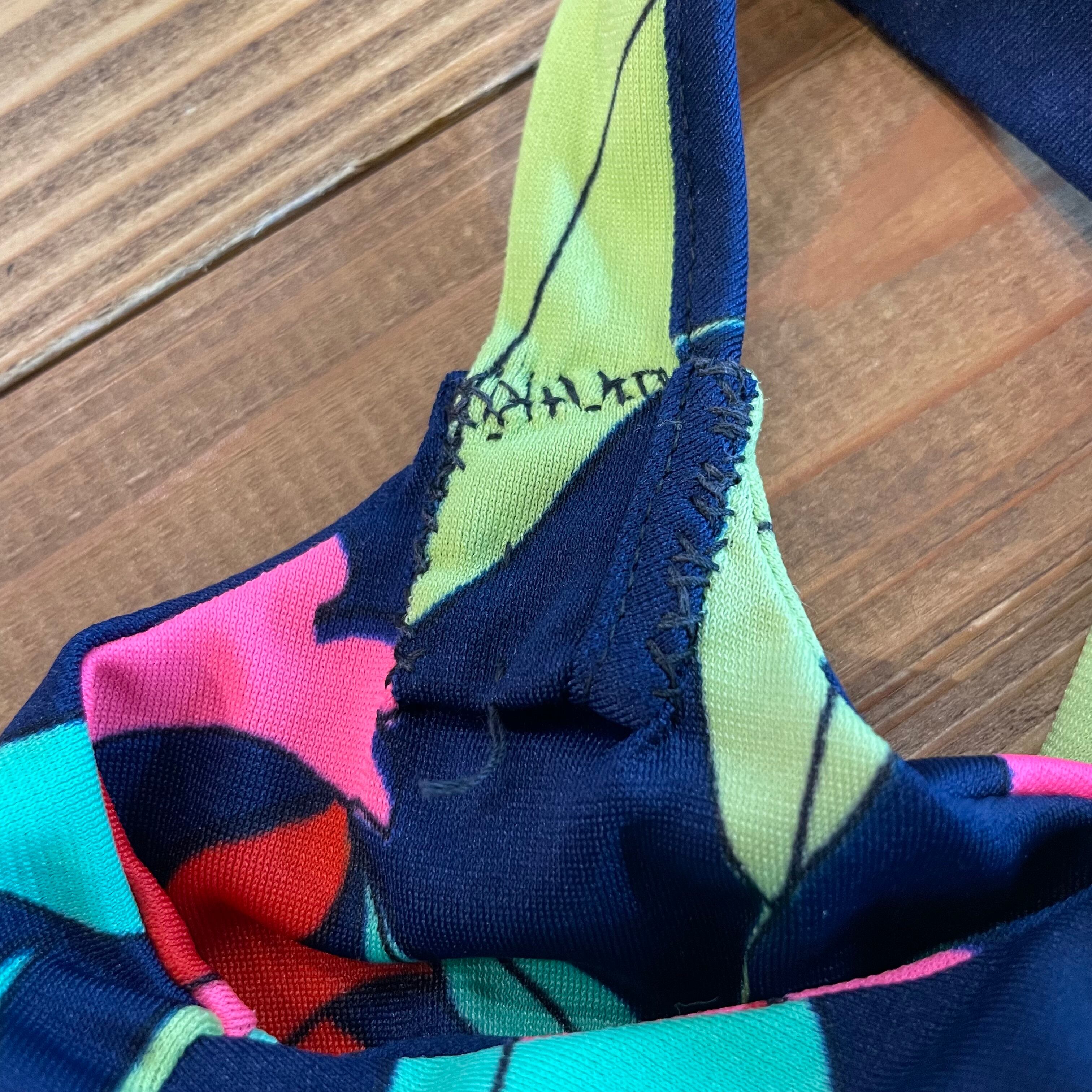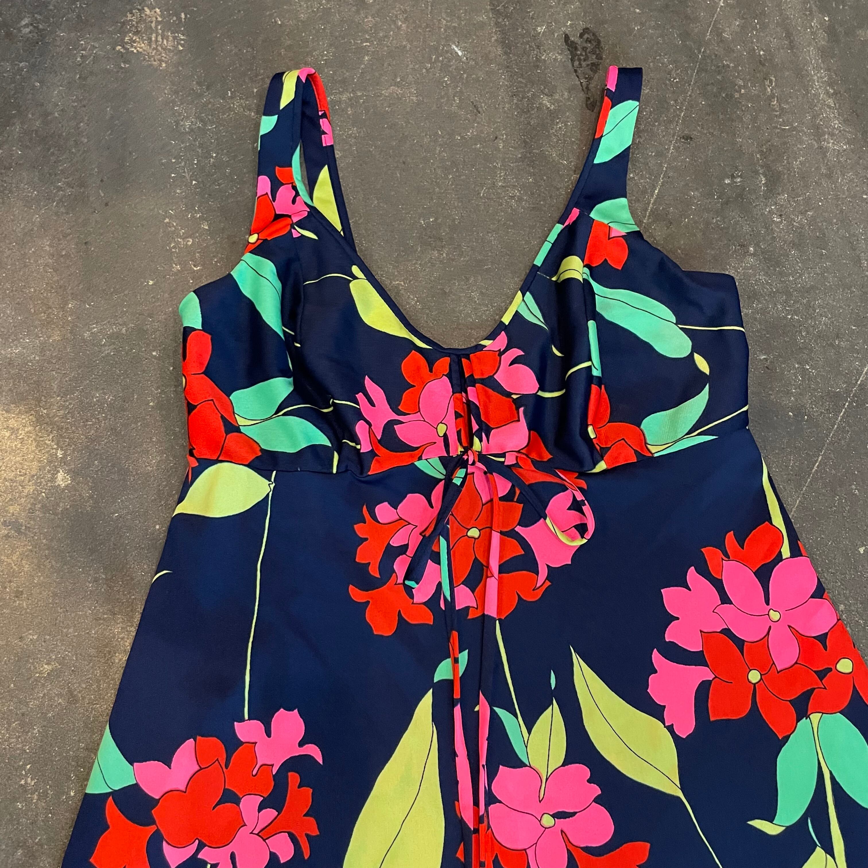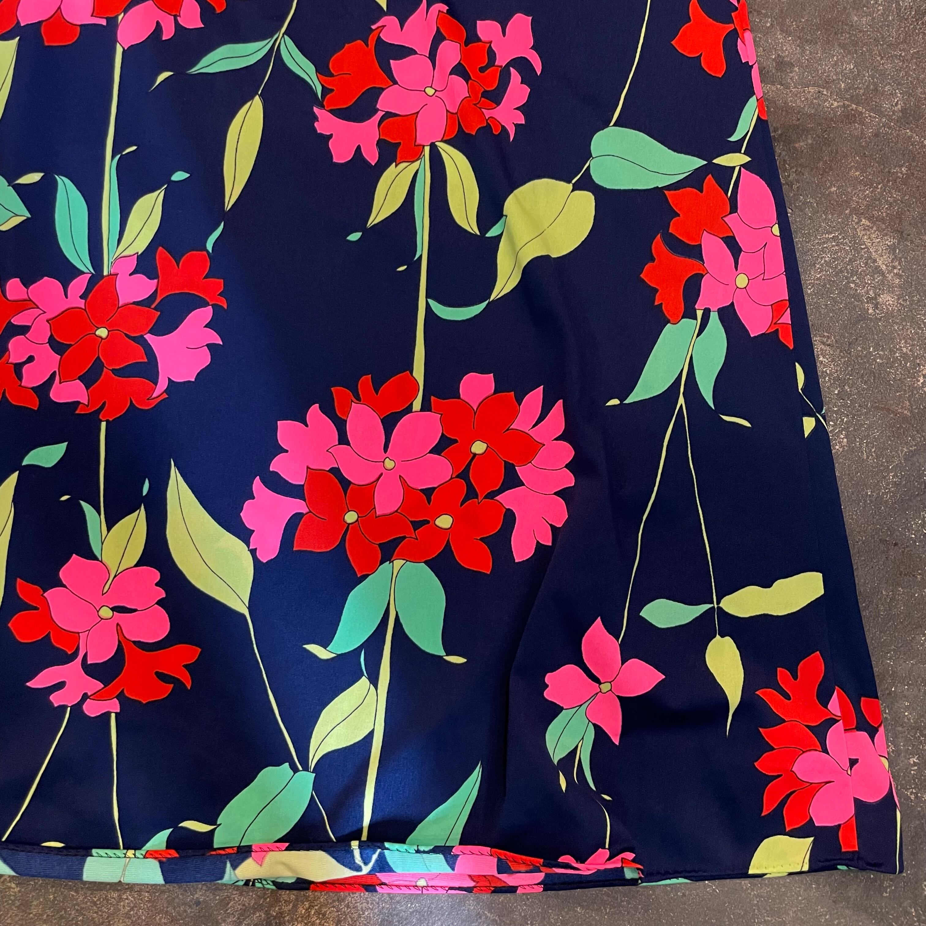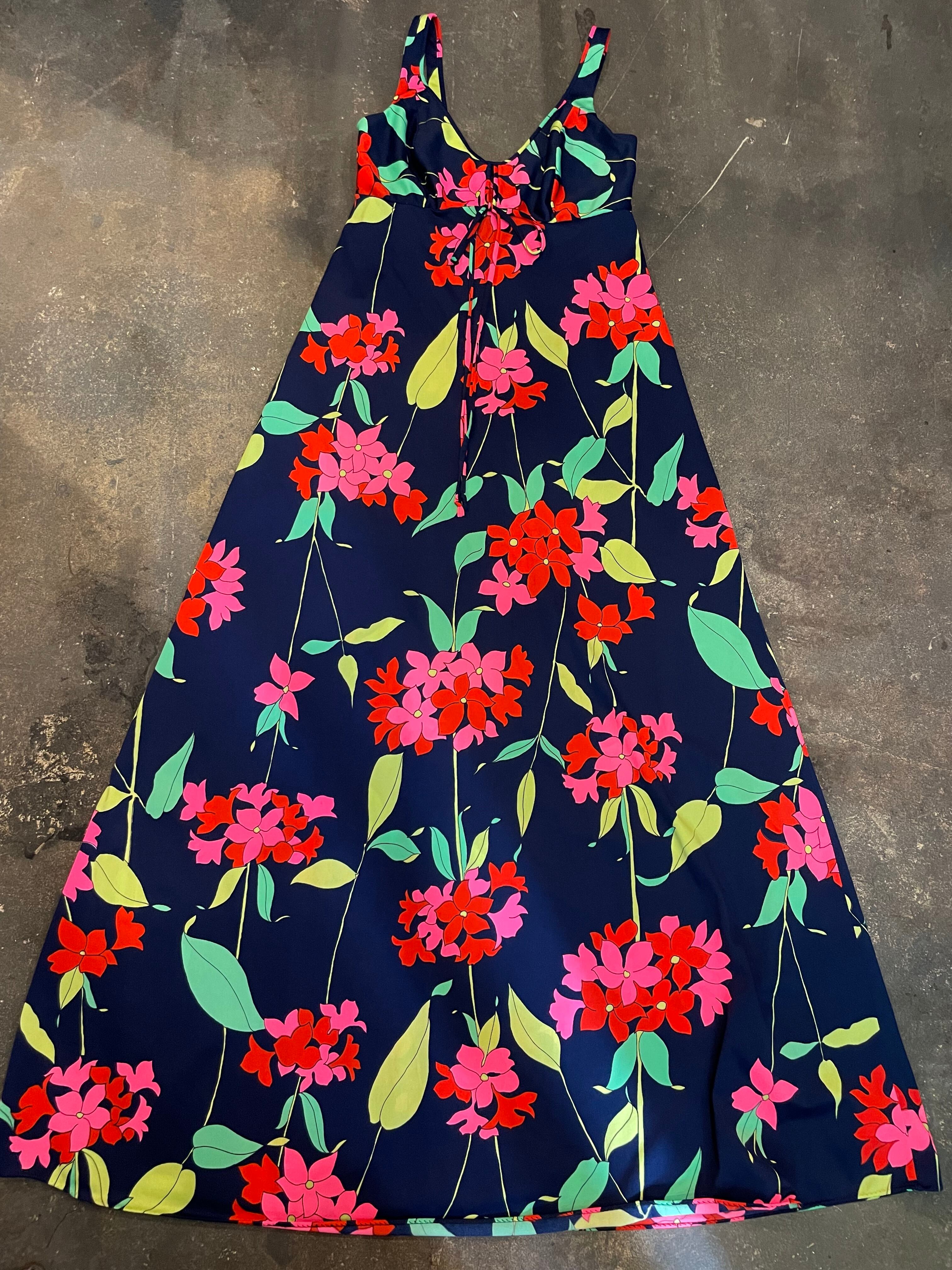 ネイビー地に赤とピンクの花柄がかわいいワンピースです。