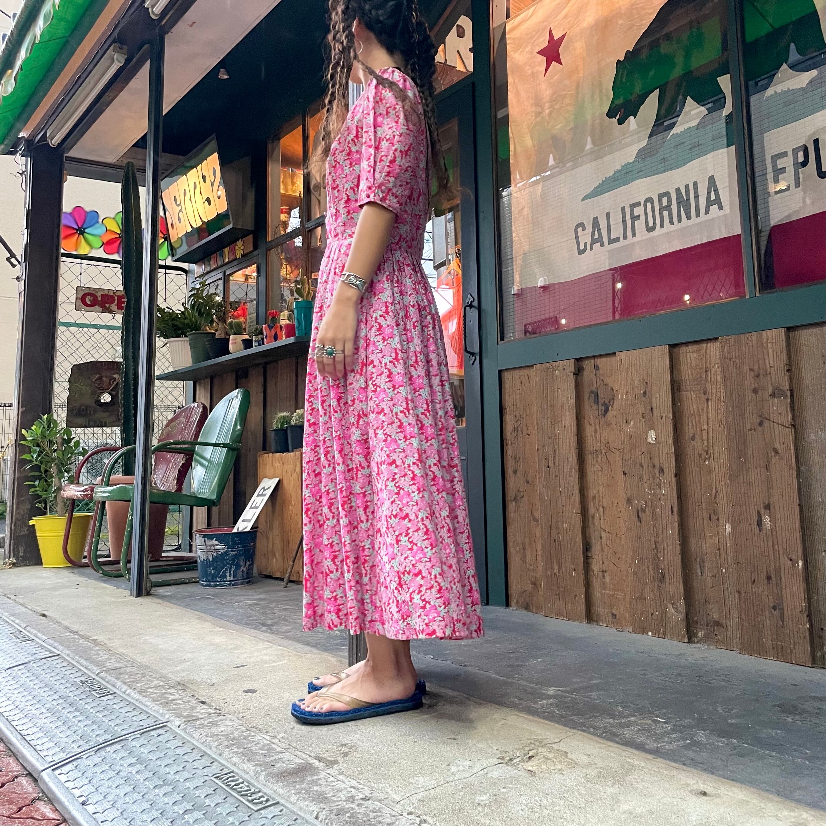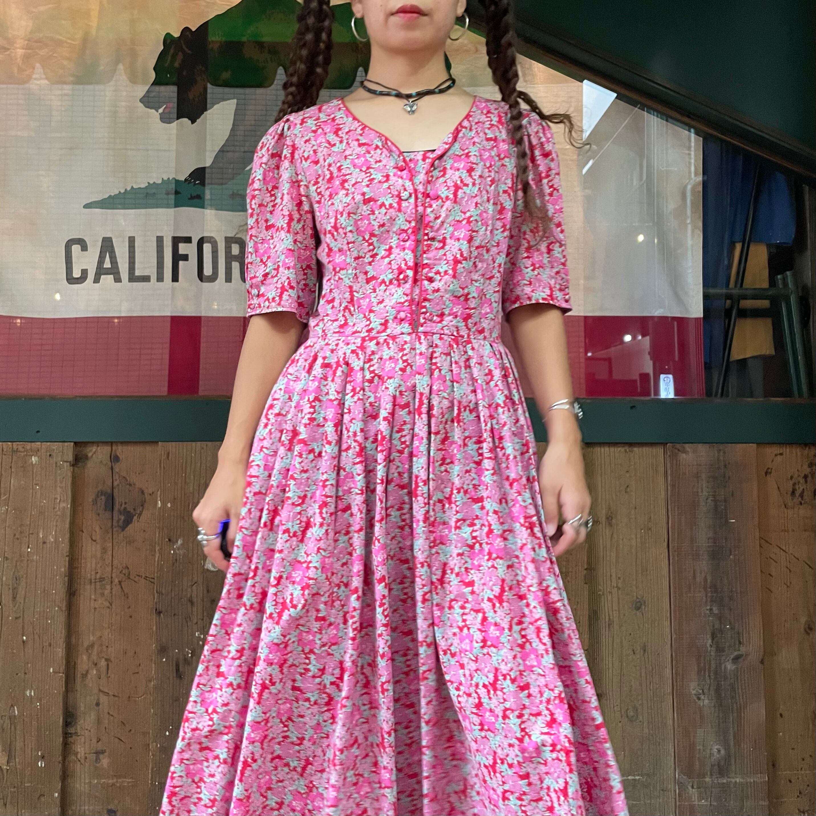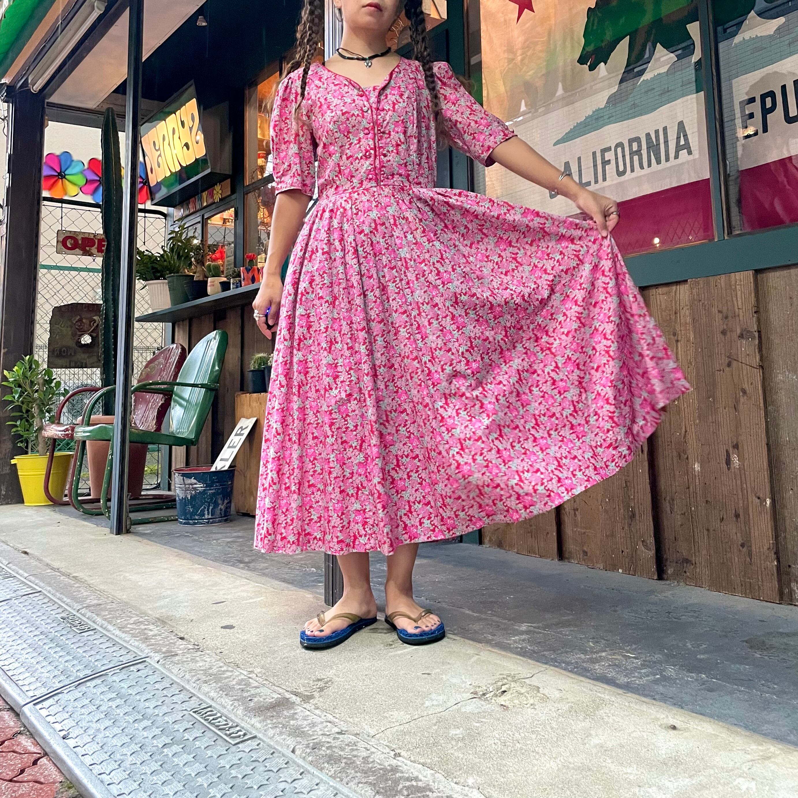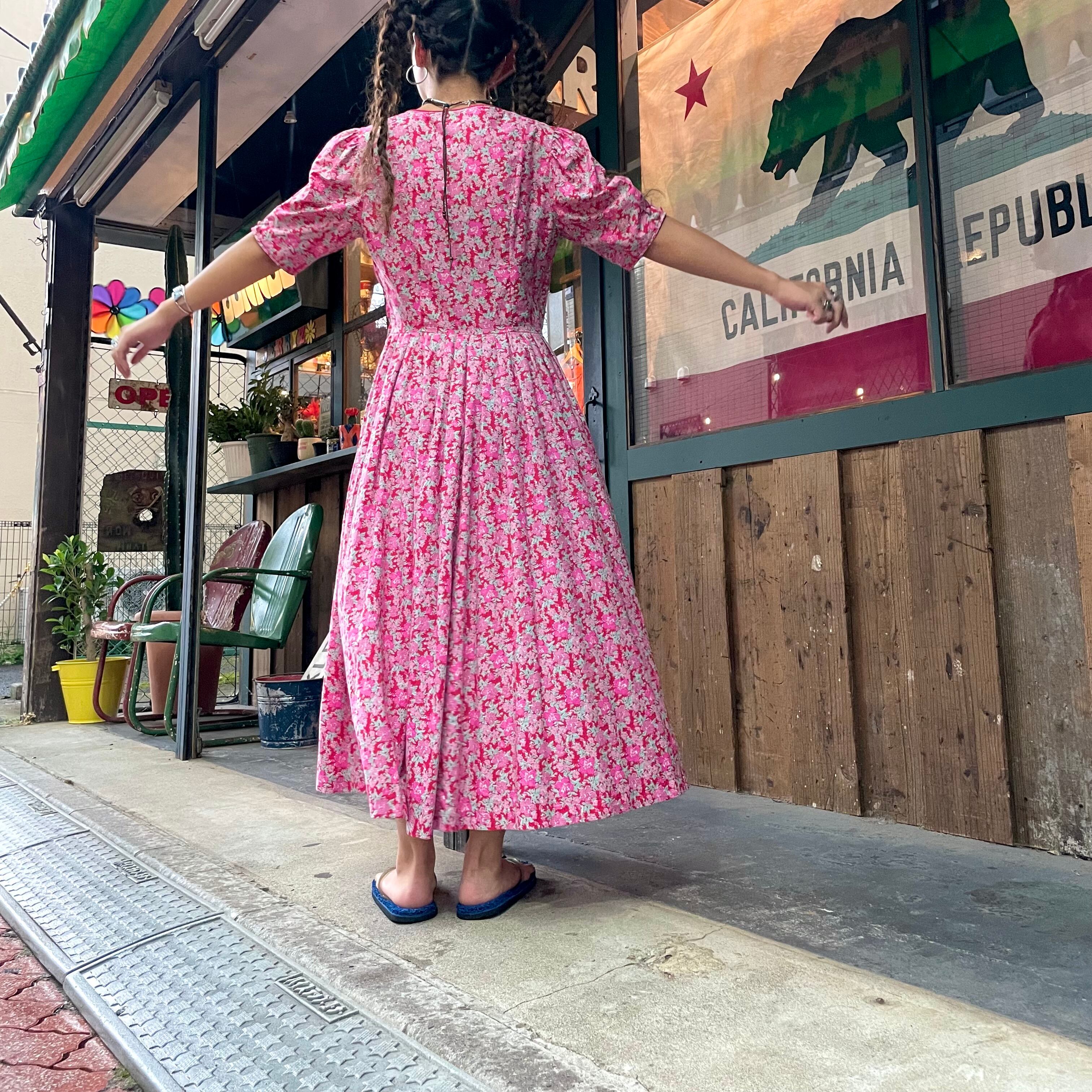 赤ベースにピンクの花柄というなんともかわいらしい色味のワンピースです。