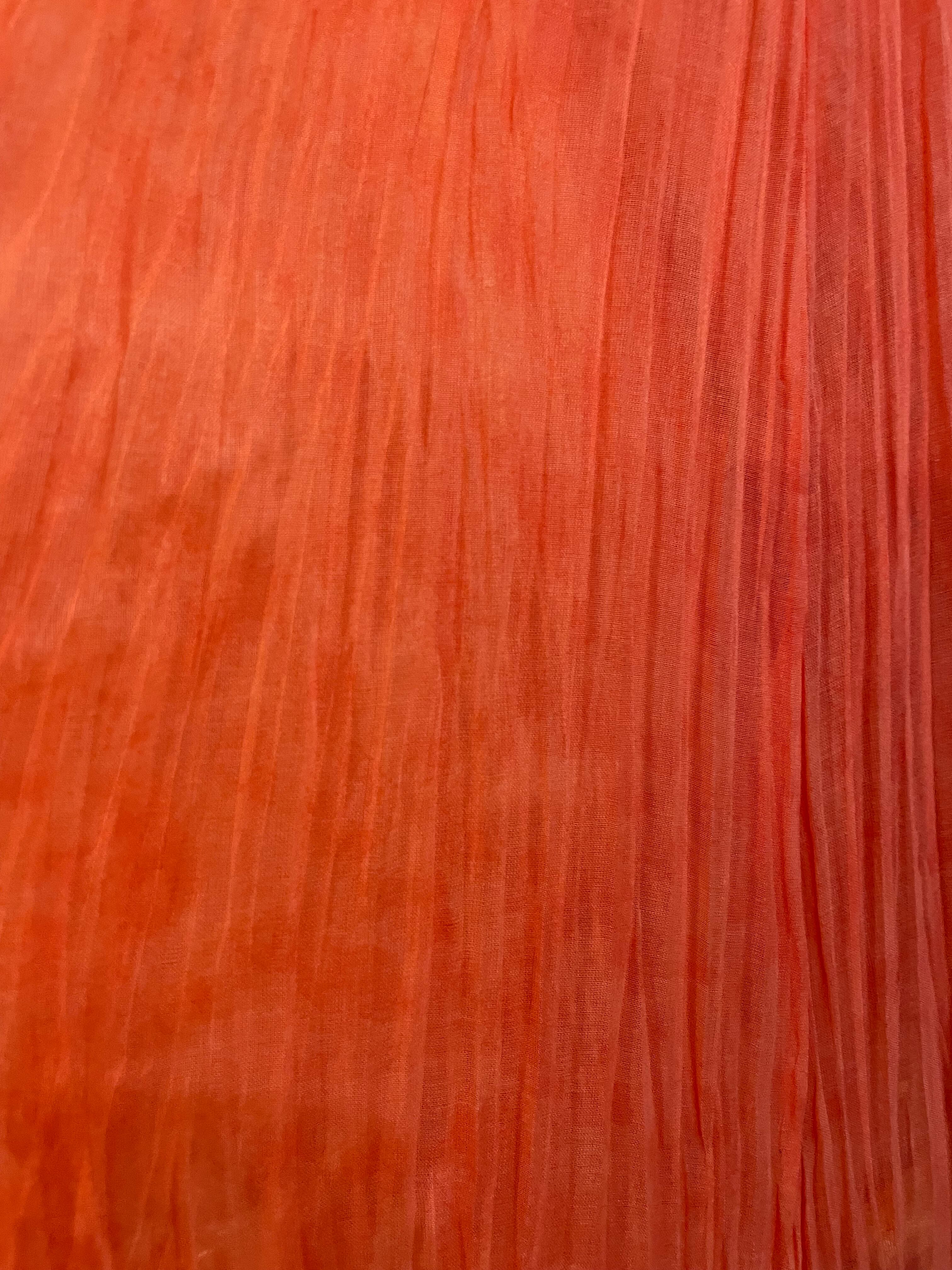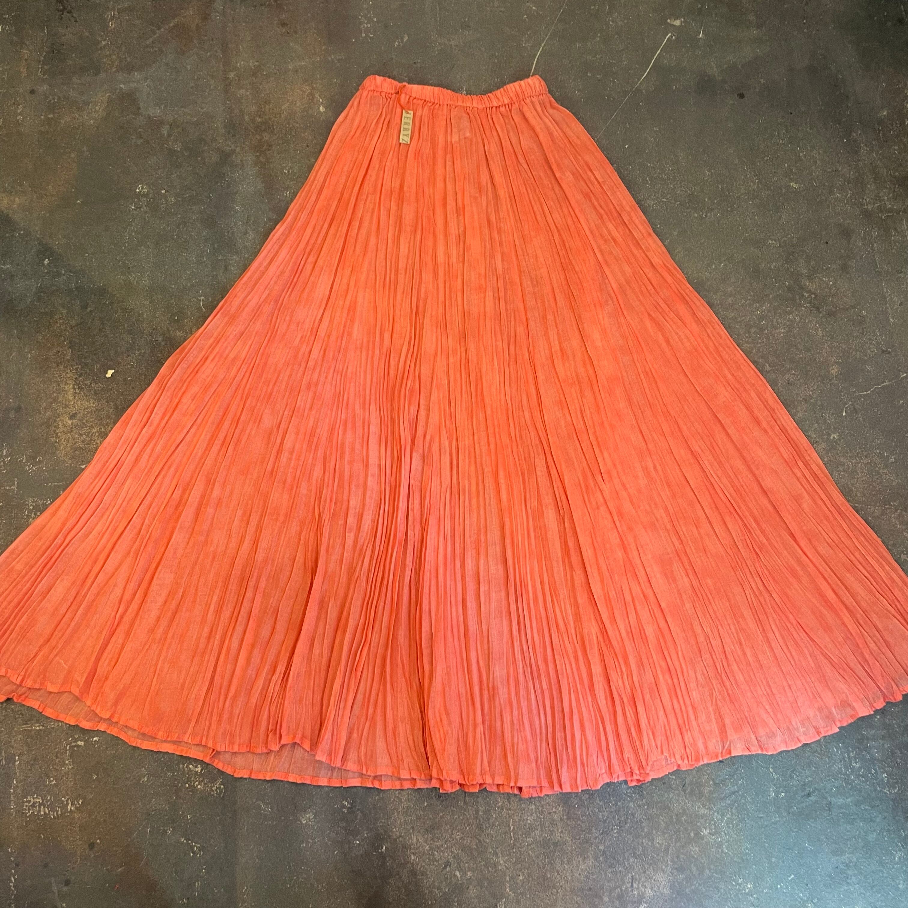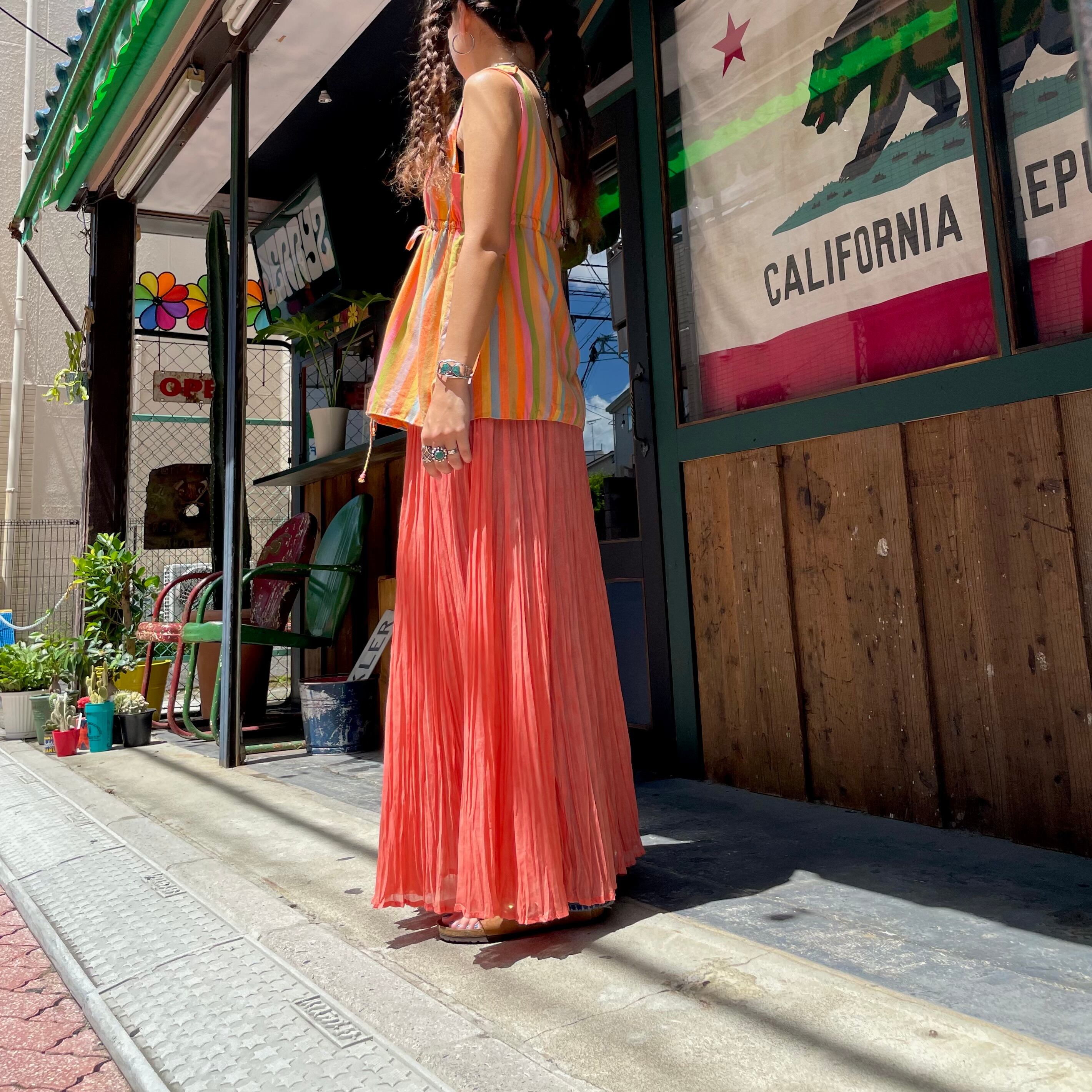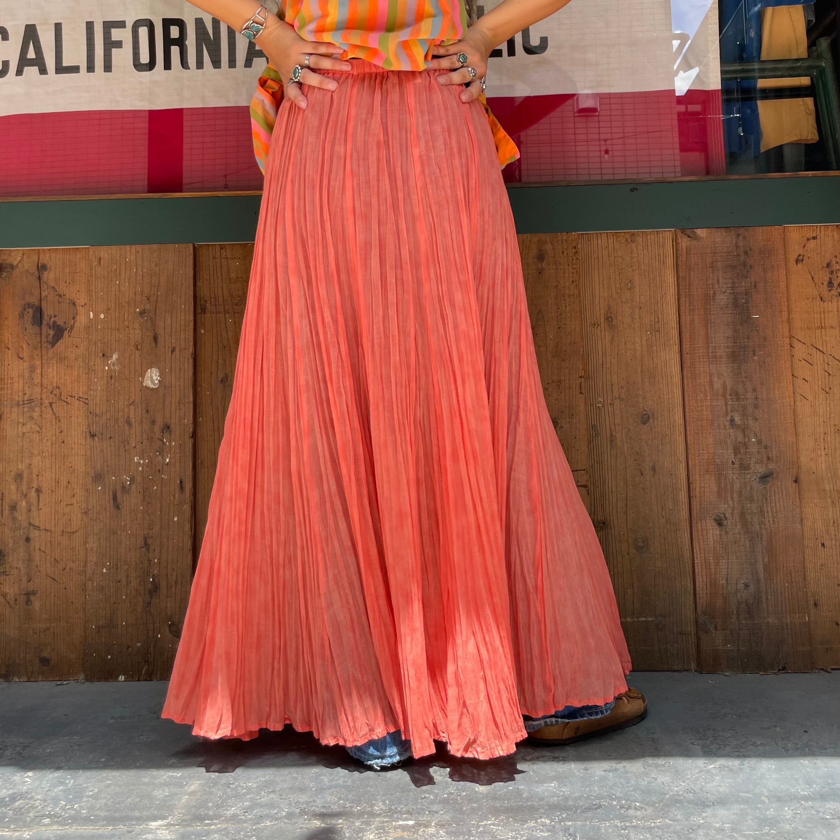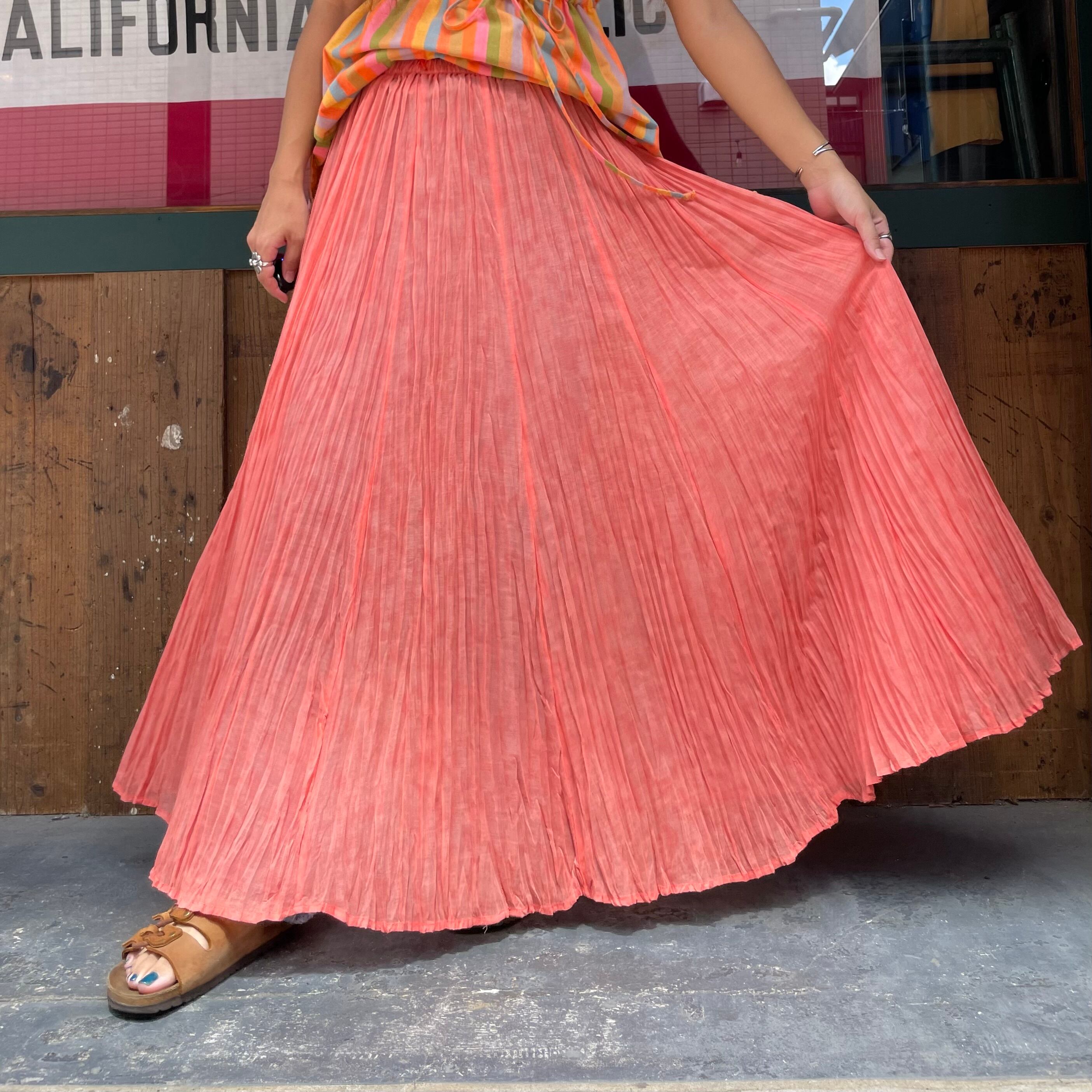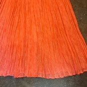 サンゴのようなきれいなコーラルピンクの色味も、すけすけシースルーな素材感も、ランダムなアコーディオンプリーツのようなシワも、きれいに広がるシルエットも、全部が素敵なロングスカートです。