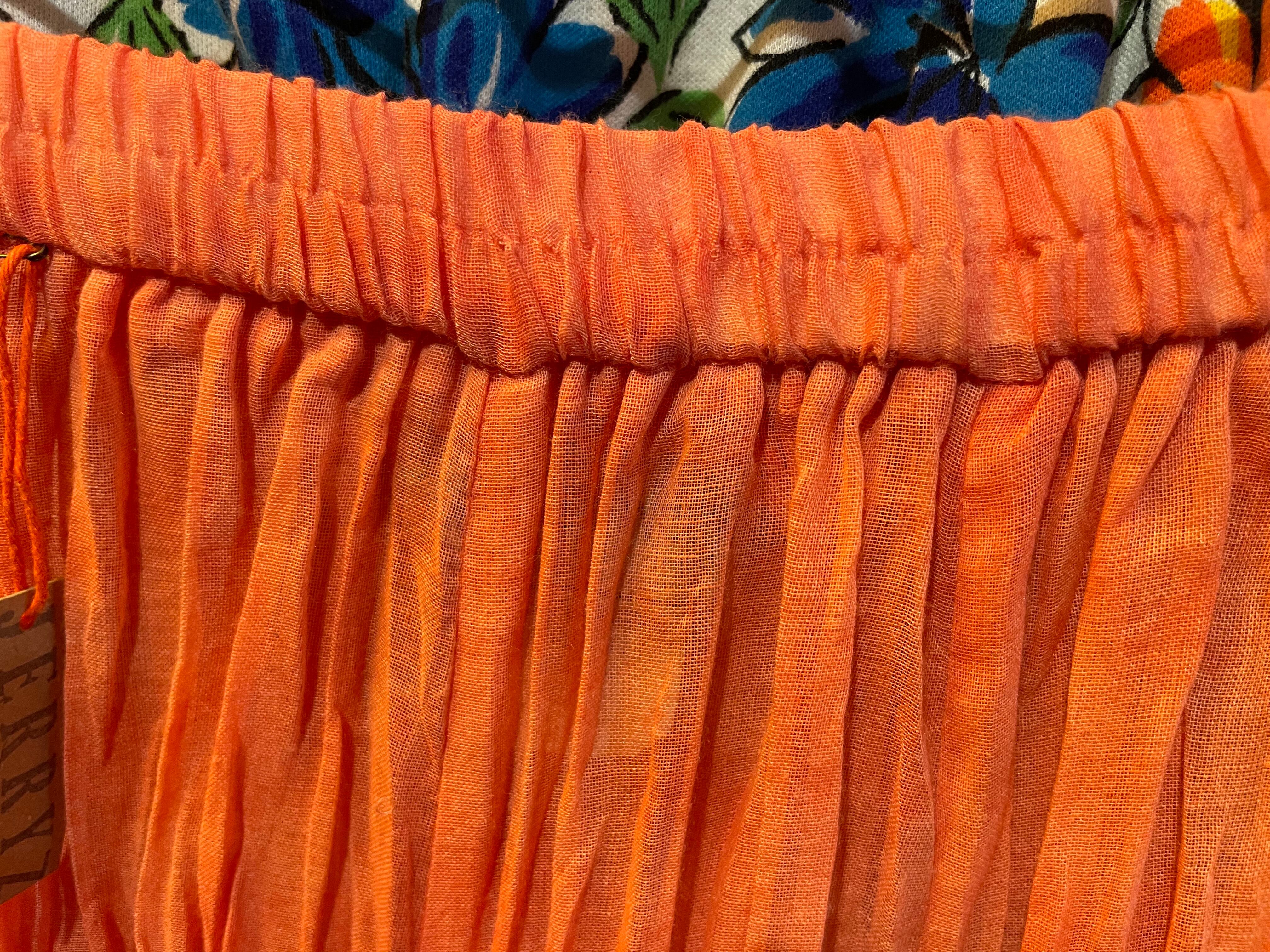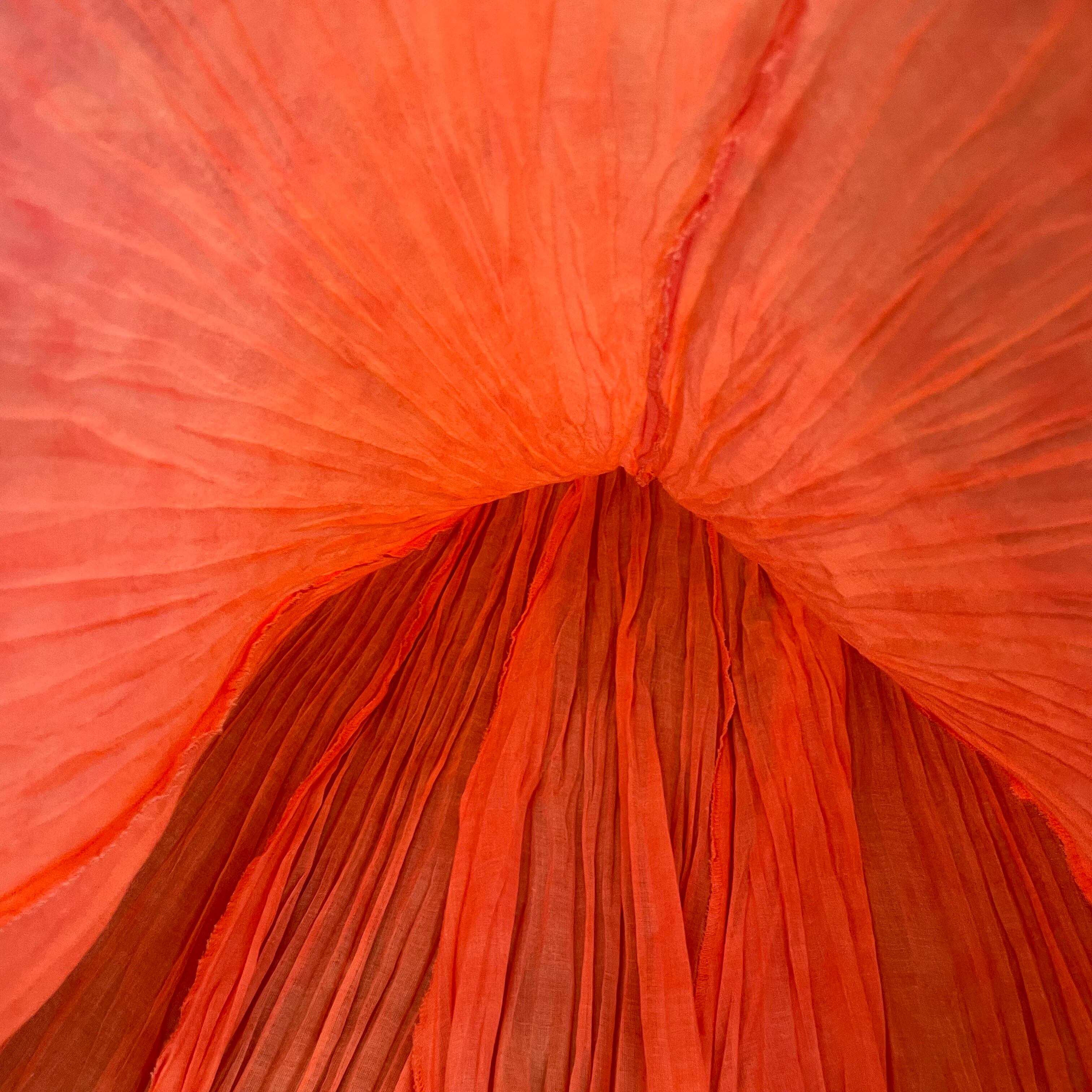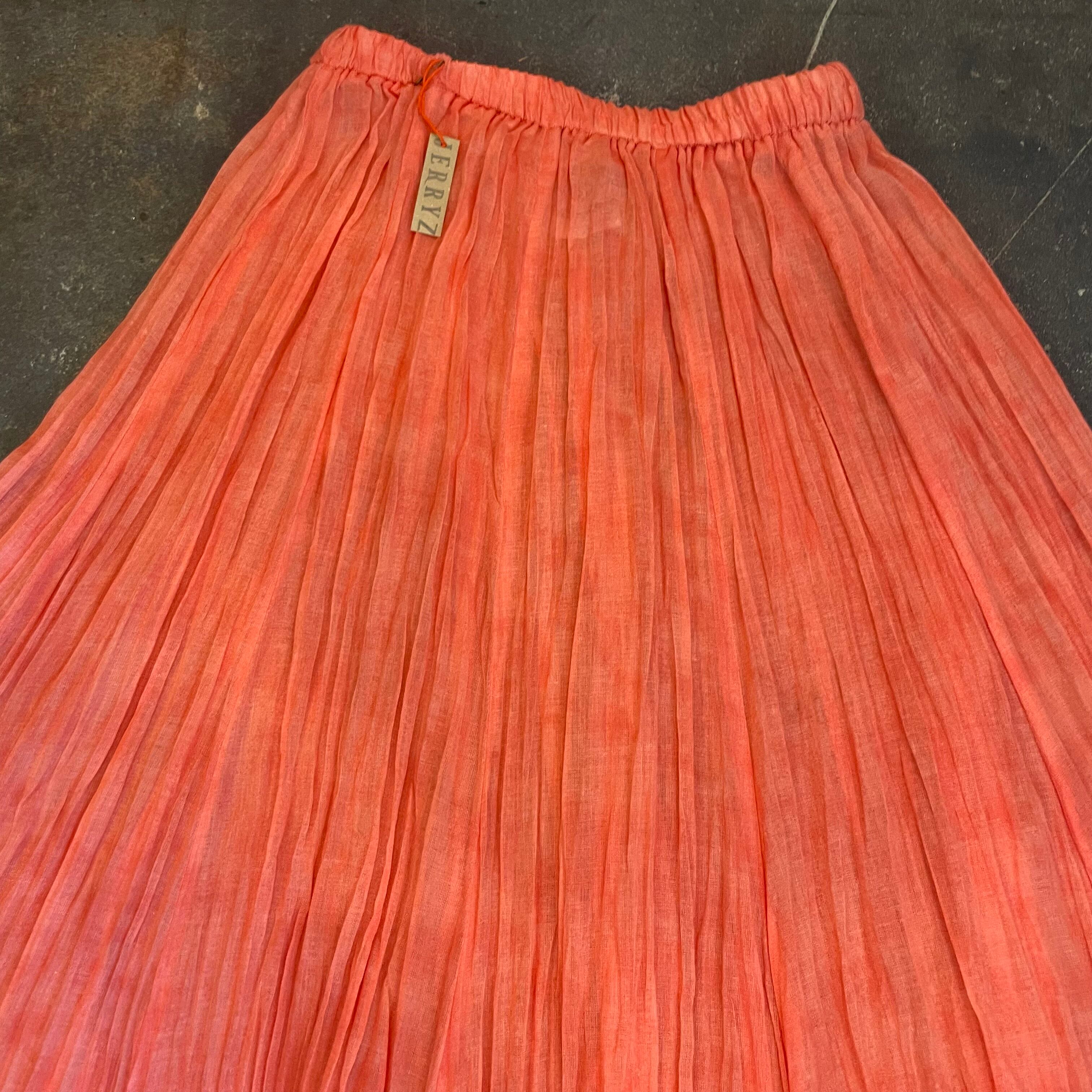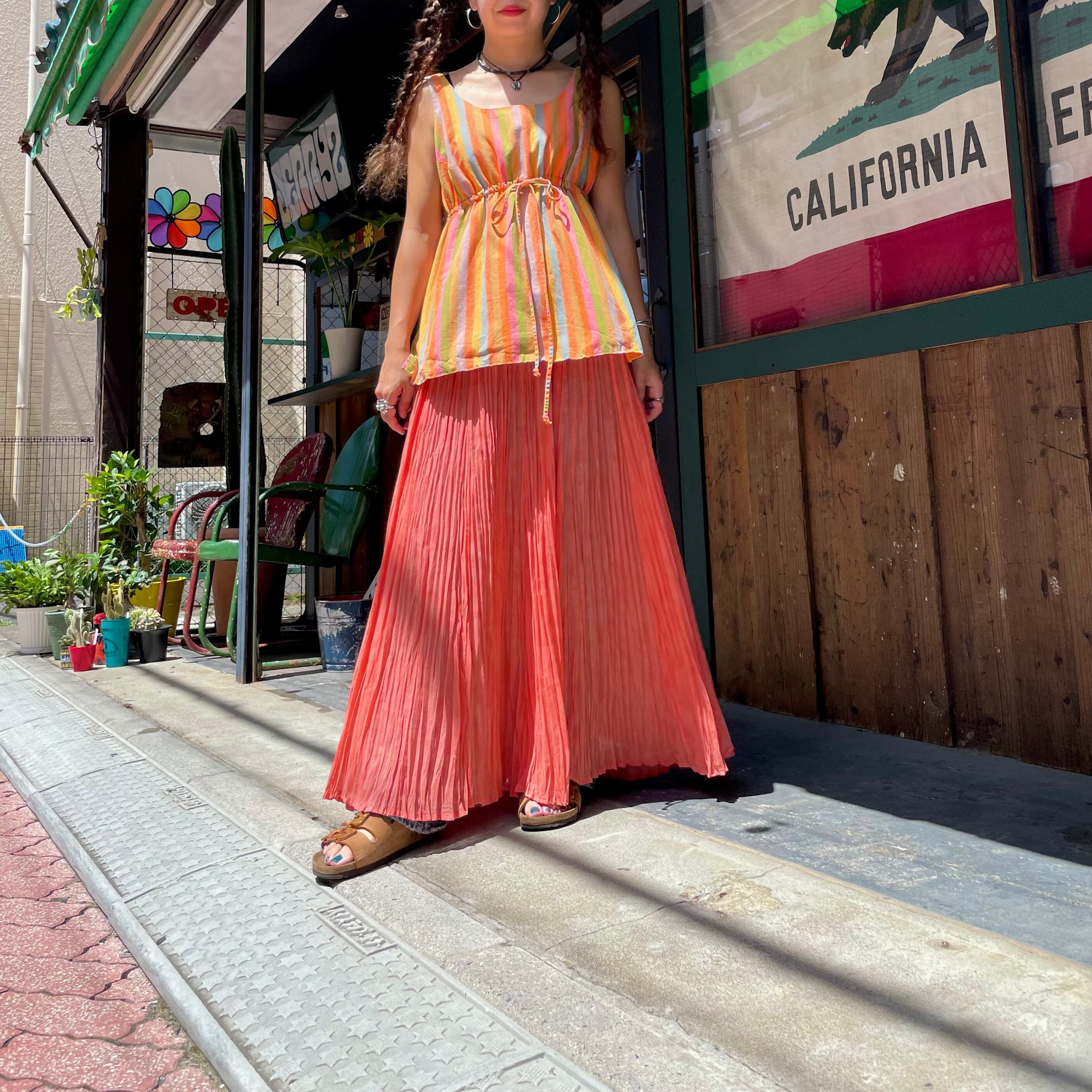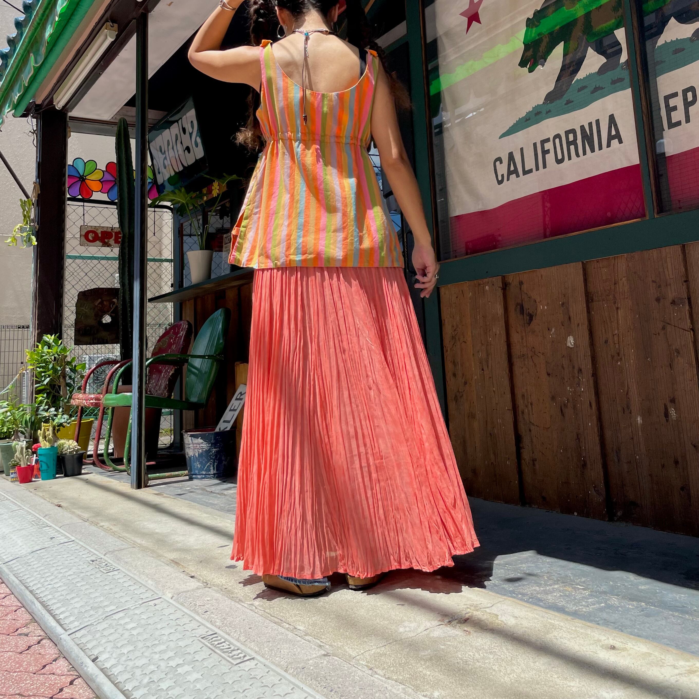 サンゴのようなきれいなコーラルピンクの色味も、すけすけシースルーな素材感も、ランダムなアコーディオンプリーツのようなシワも、きれいに広がるシルエットも、全部が素敵なロングスカートです。