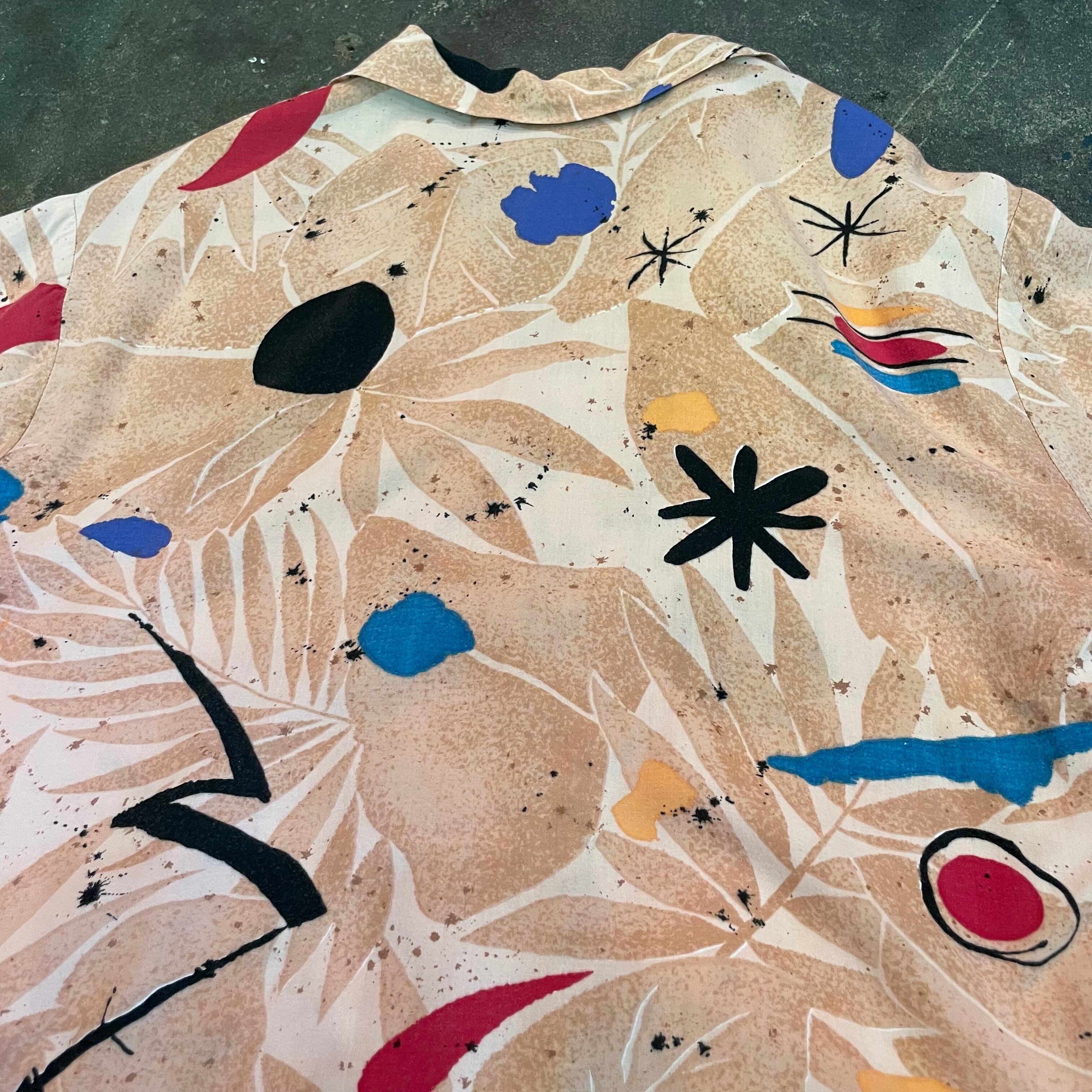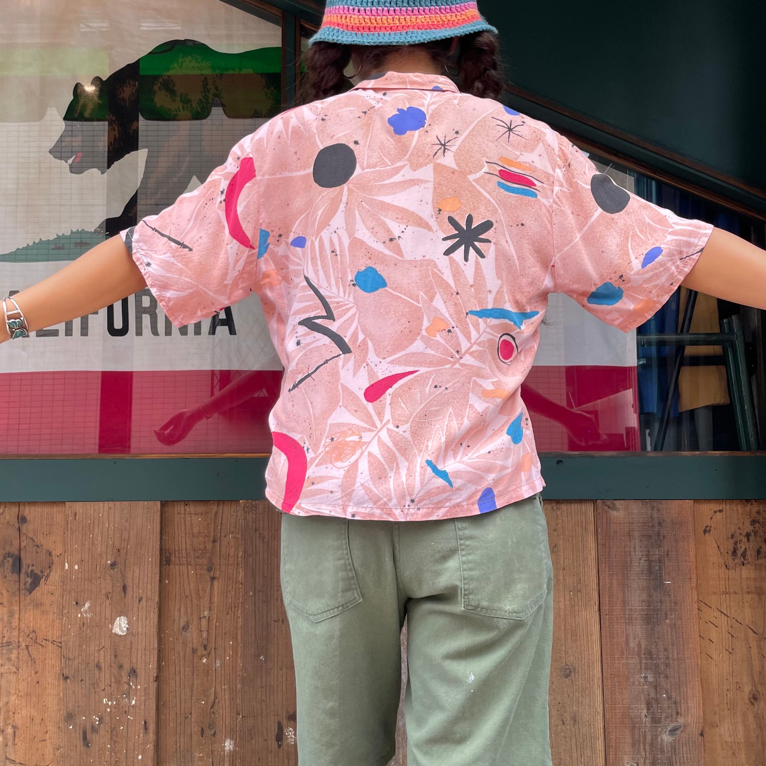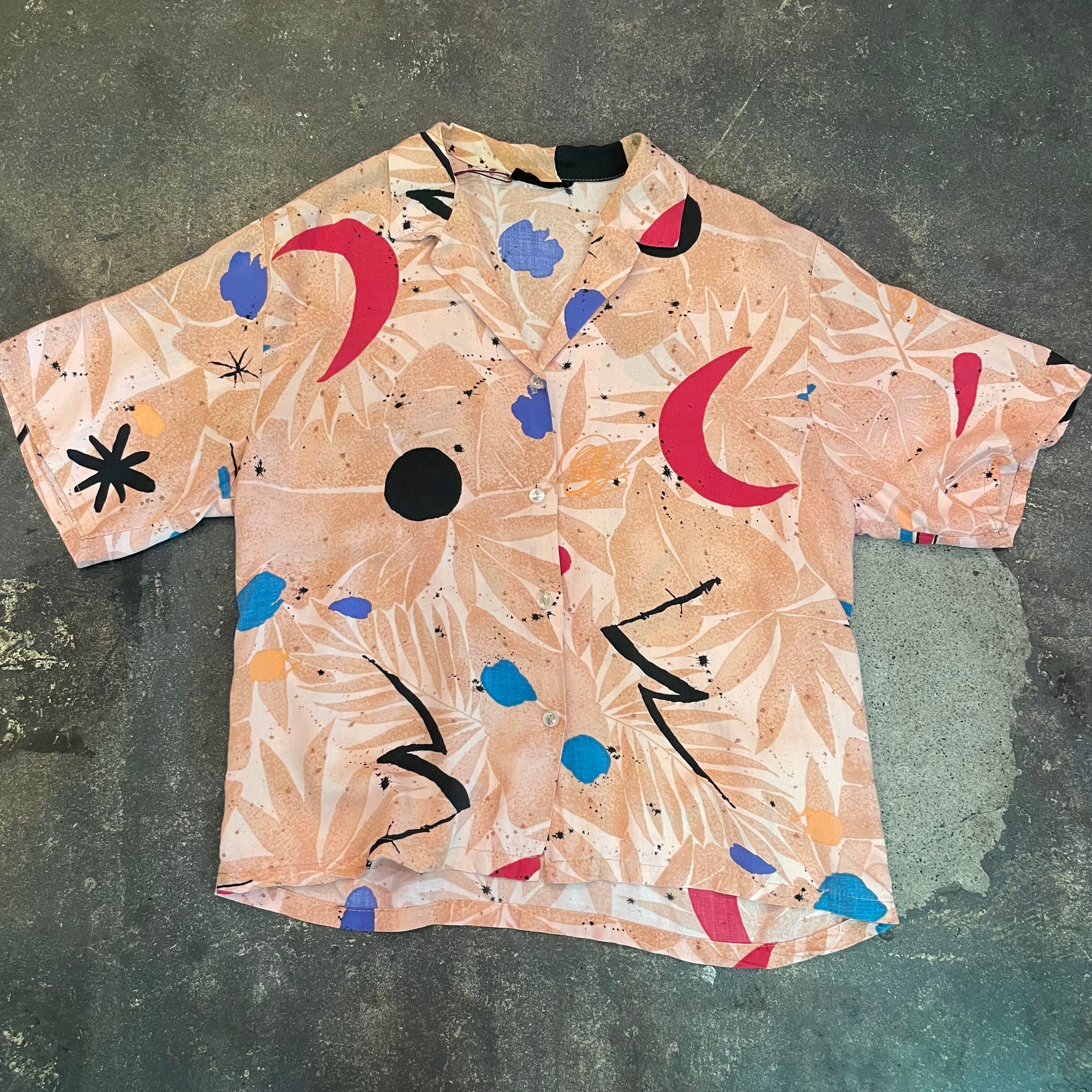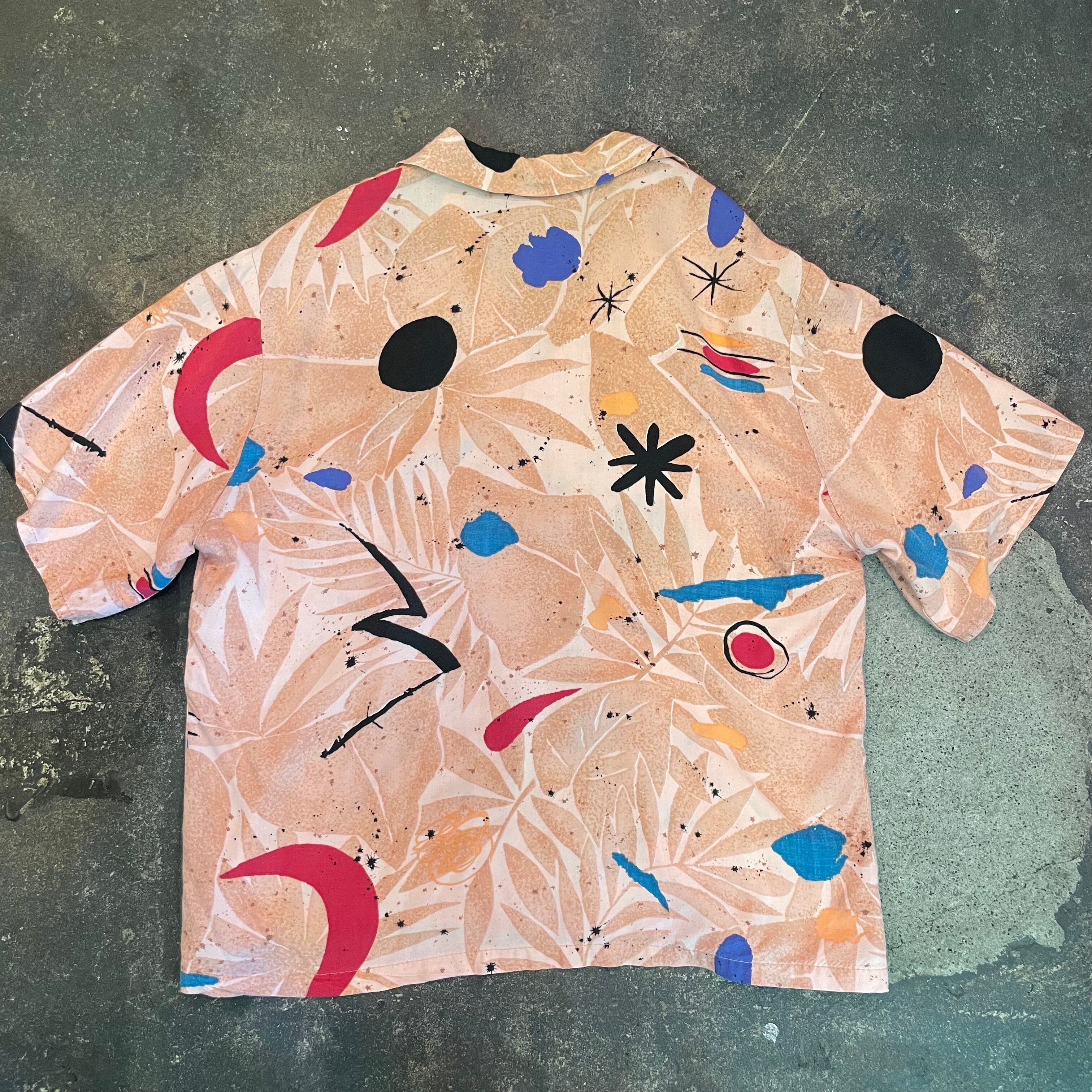 南国っぽい葉っぱの柄の上に落書きをしたような不思議な模様がかわいい半袖シャツです。