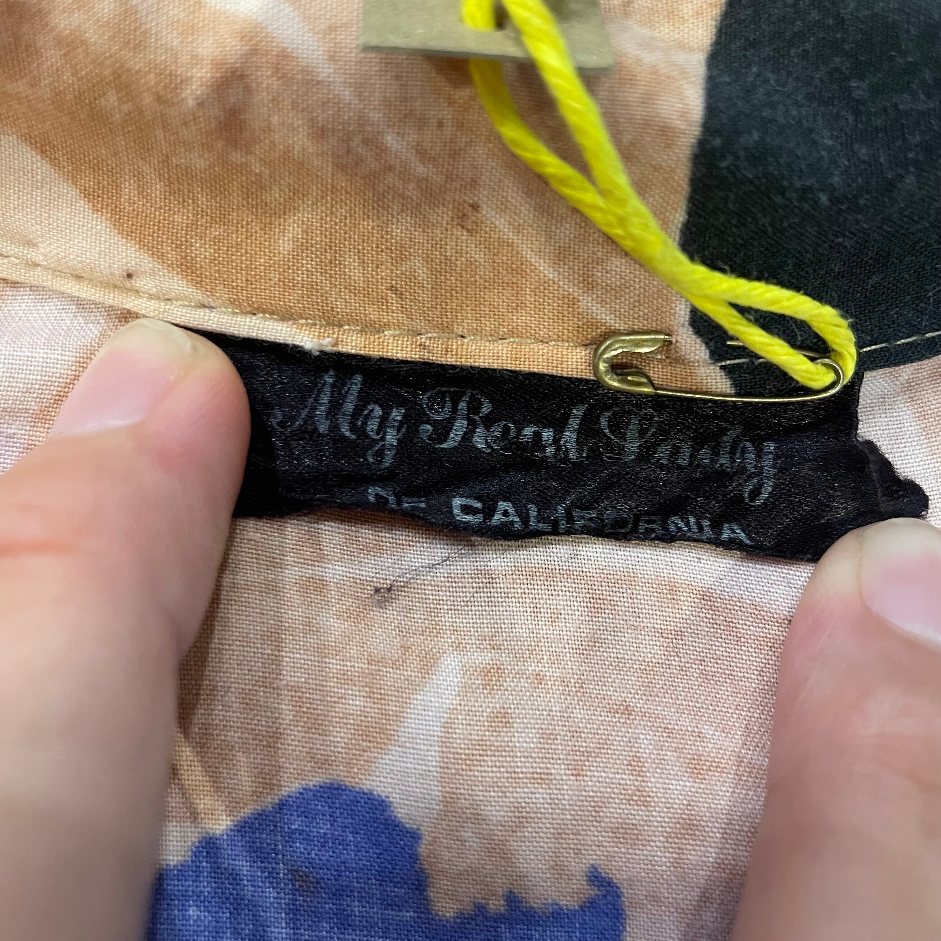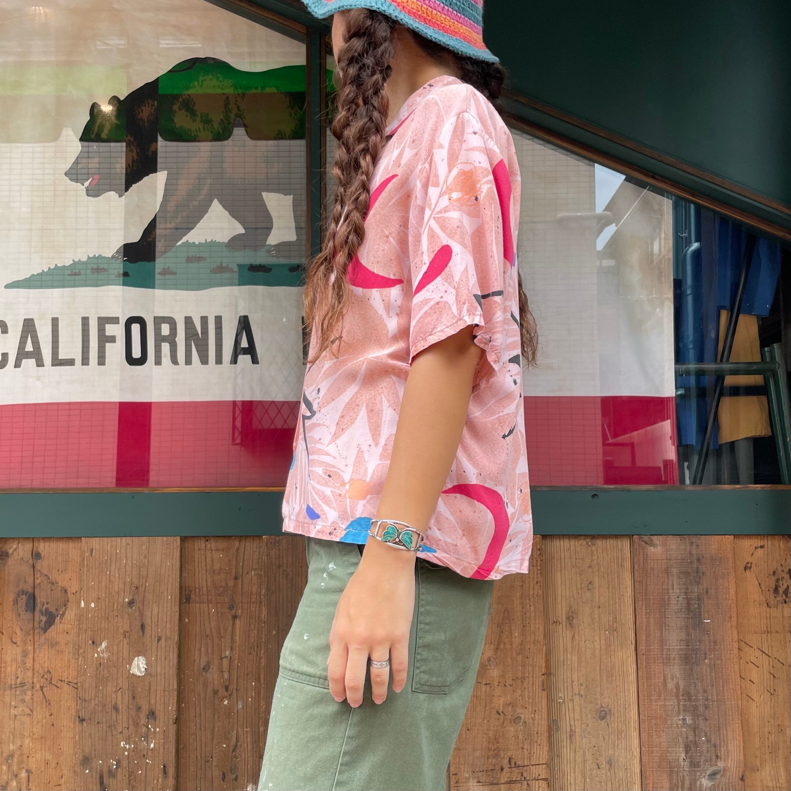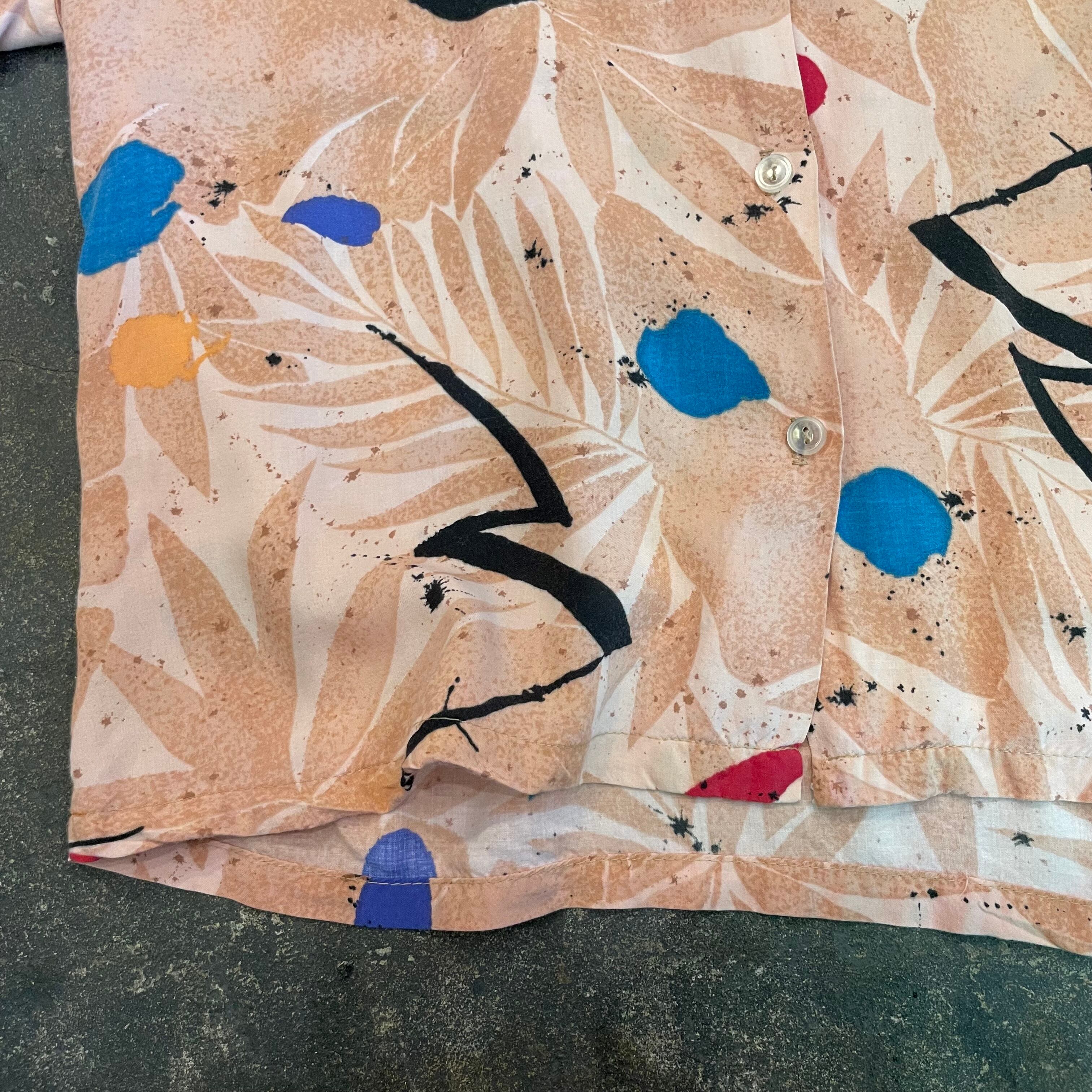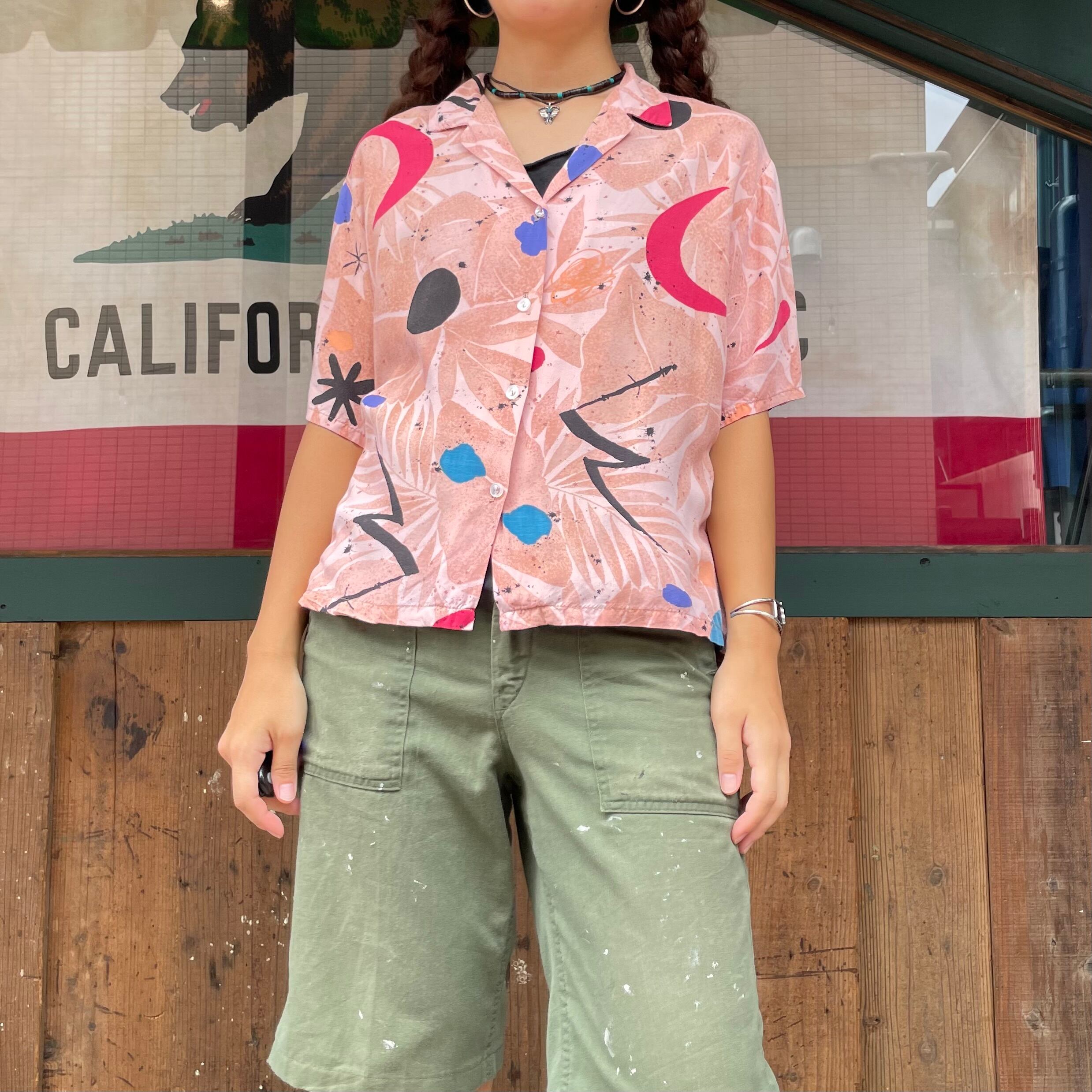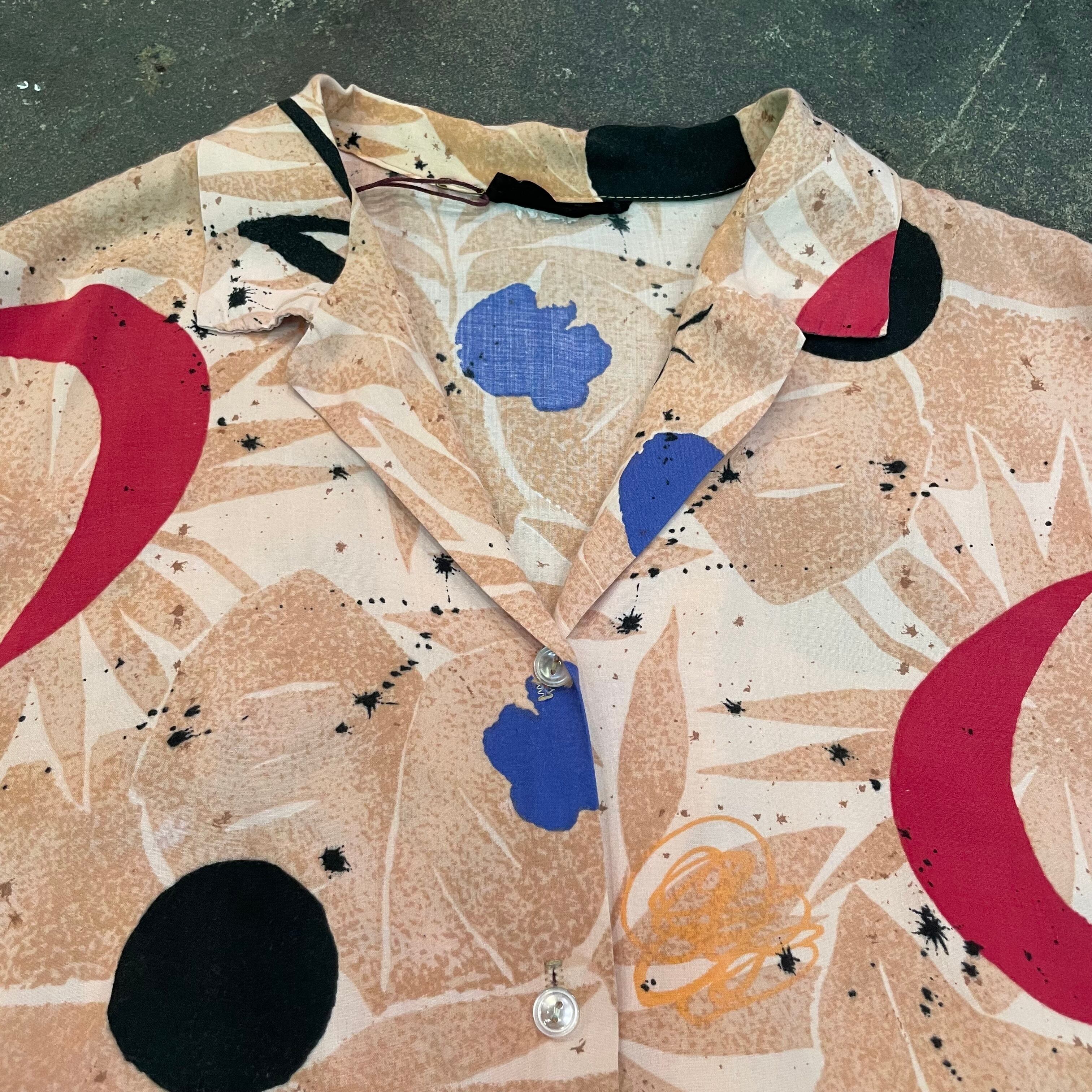 南国っぽい葉っぱの柄の上に落書きをしたような不思議な模様がかわいい半袖シャツです。