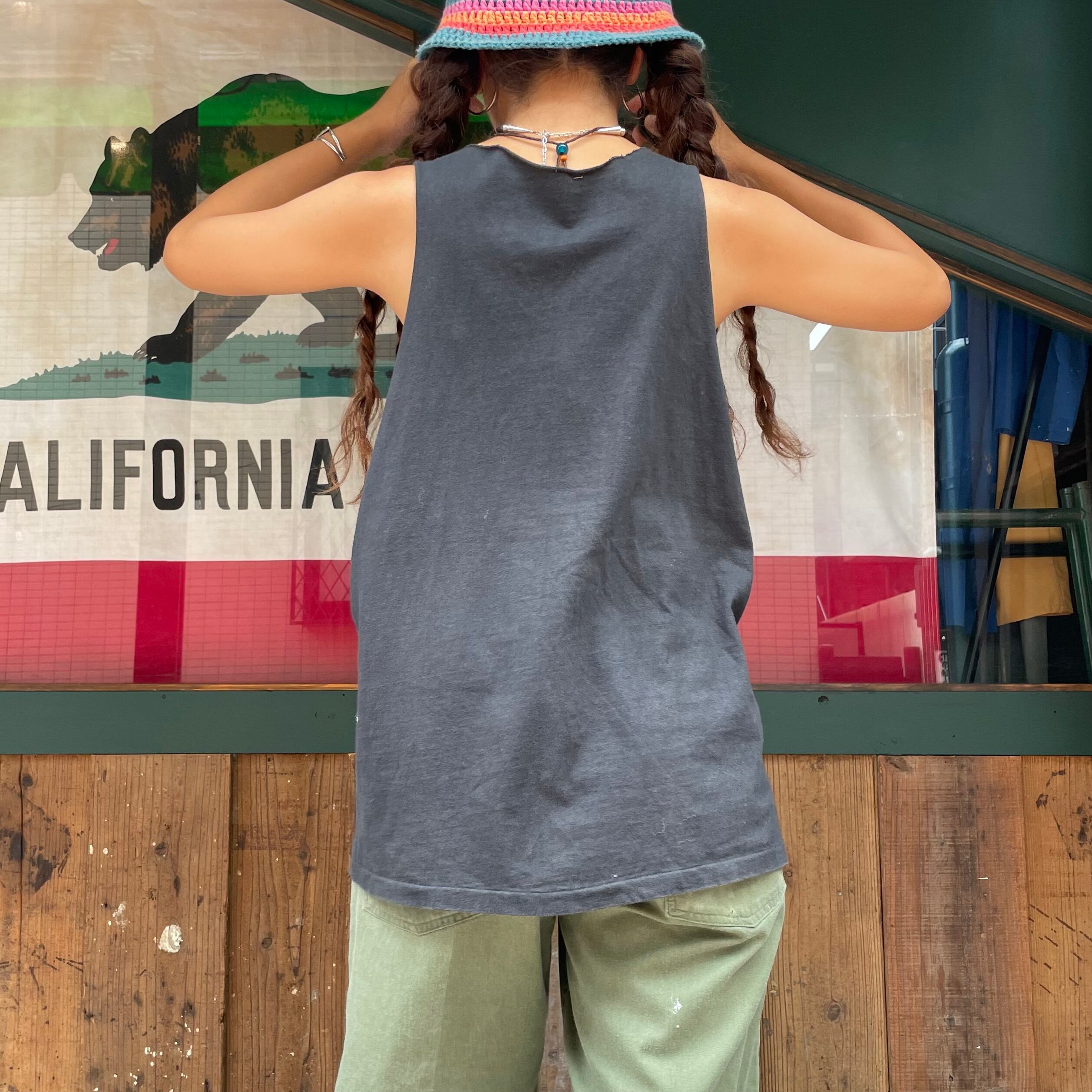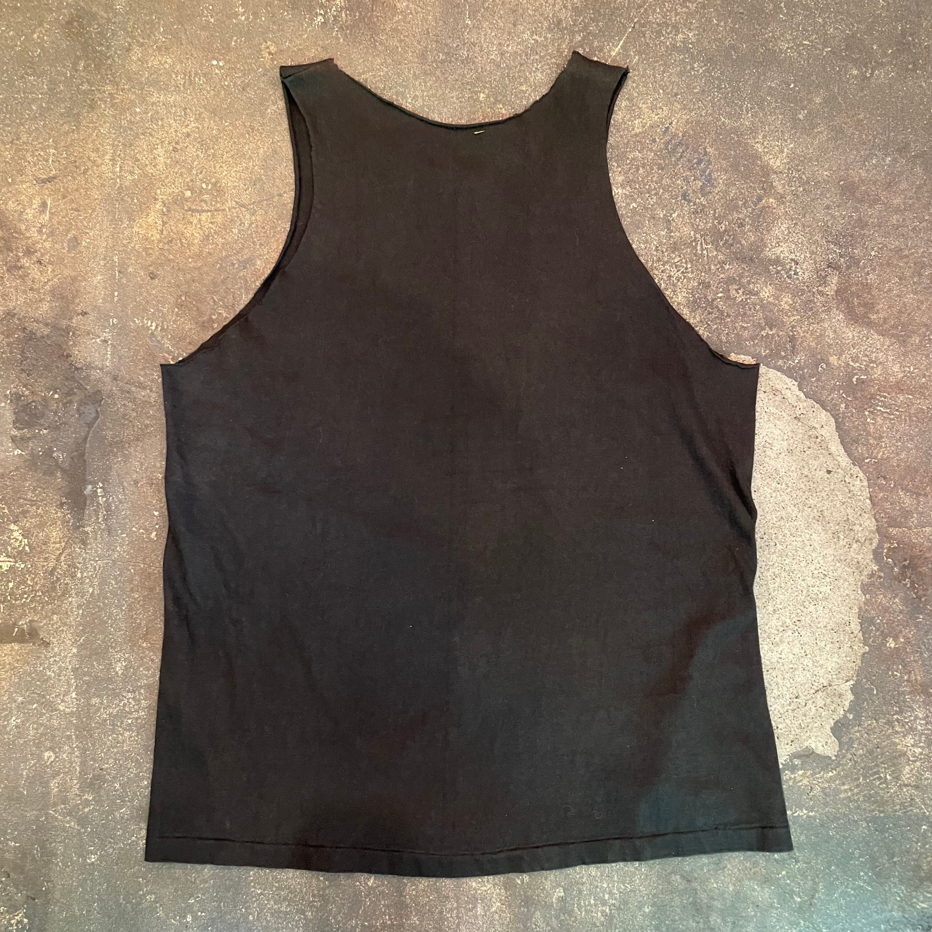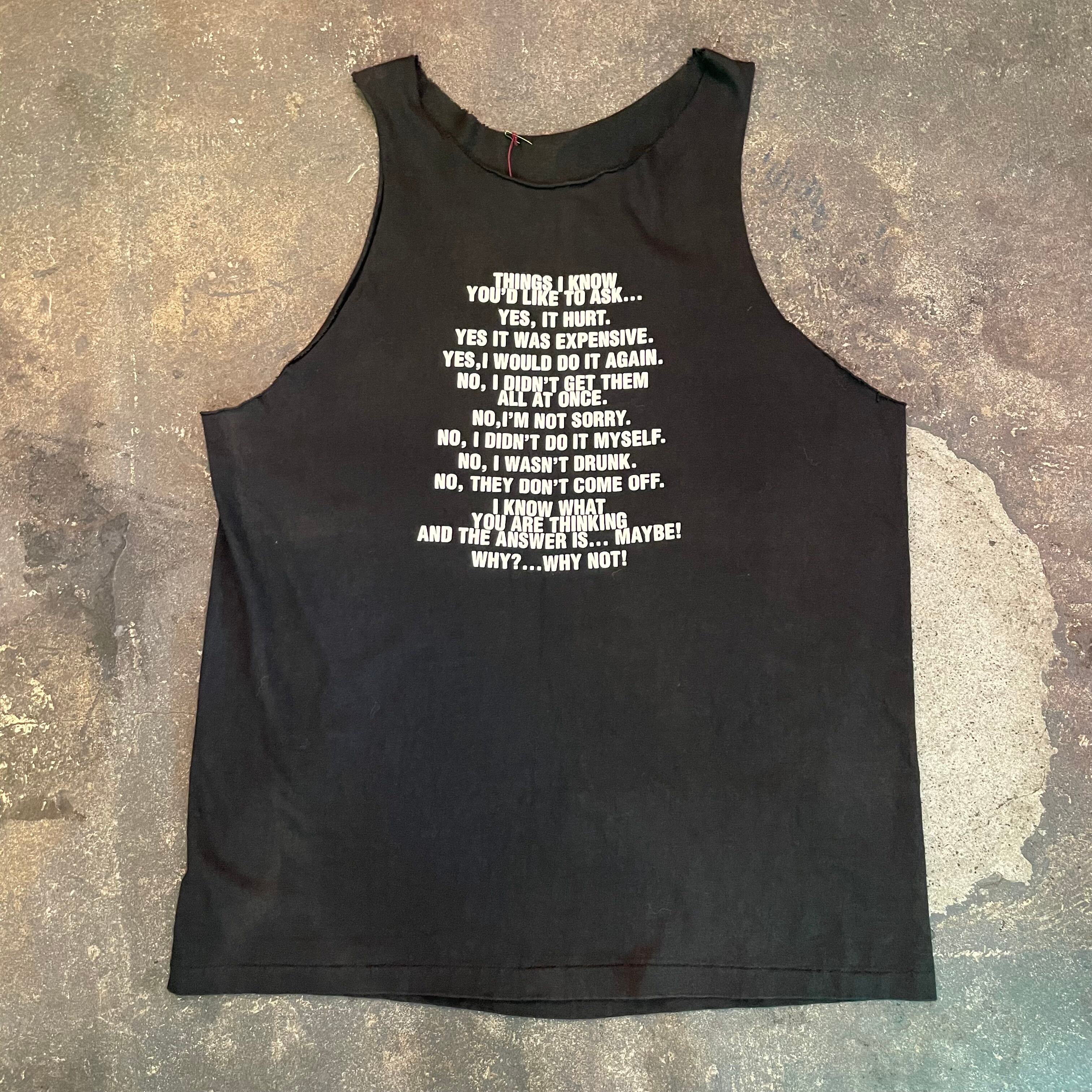 黒地に白の文字の羅列のみのシンプルなデザインがかっこいいタンクトップです。もともとTシャツだったものを誰かが襟ぐりや袖をカットしたと思われます。