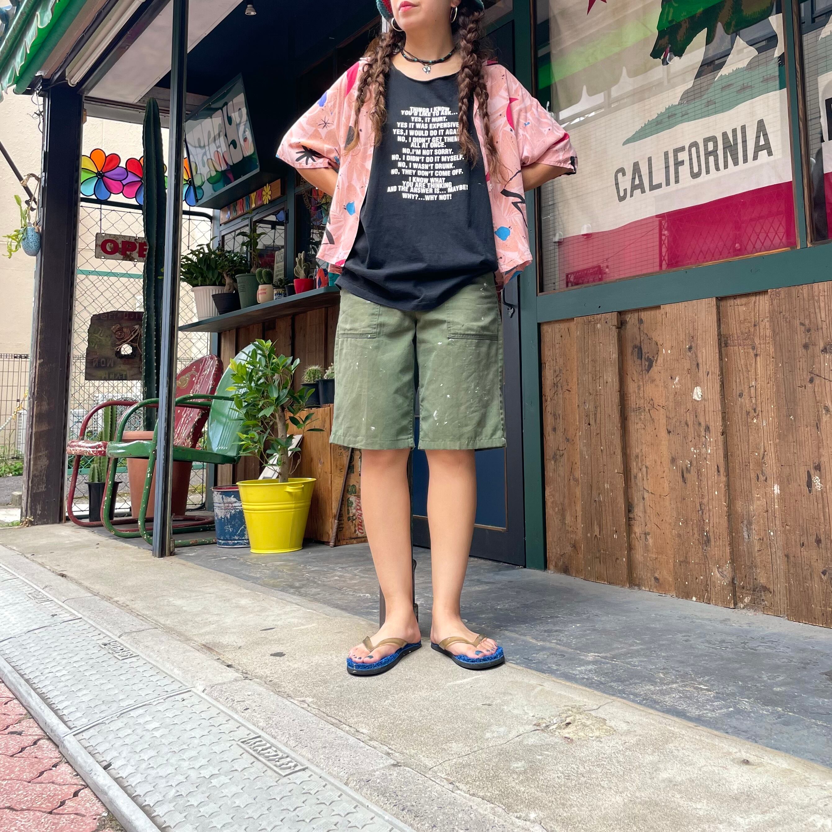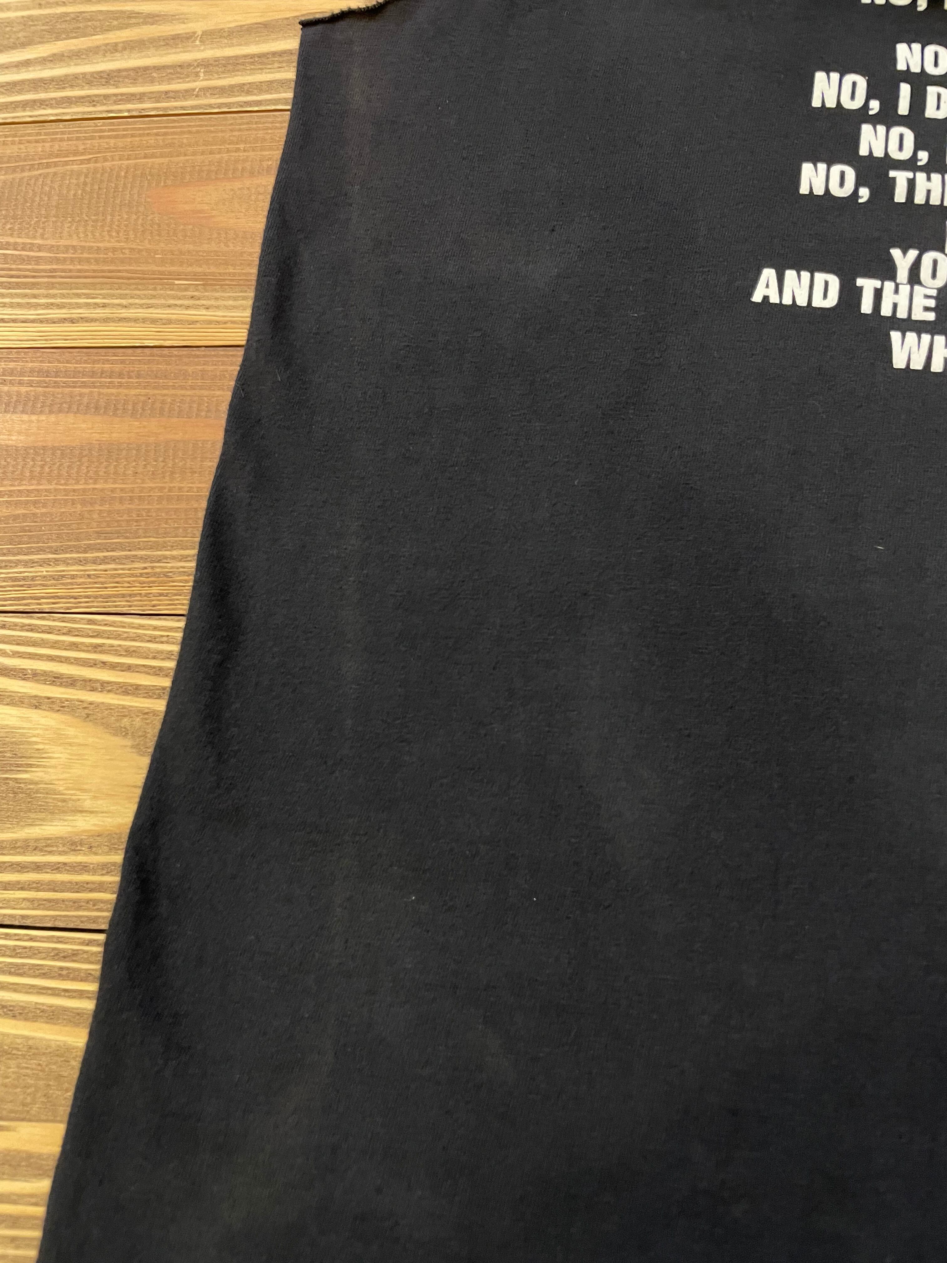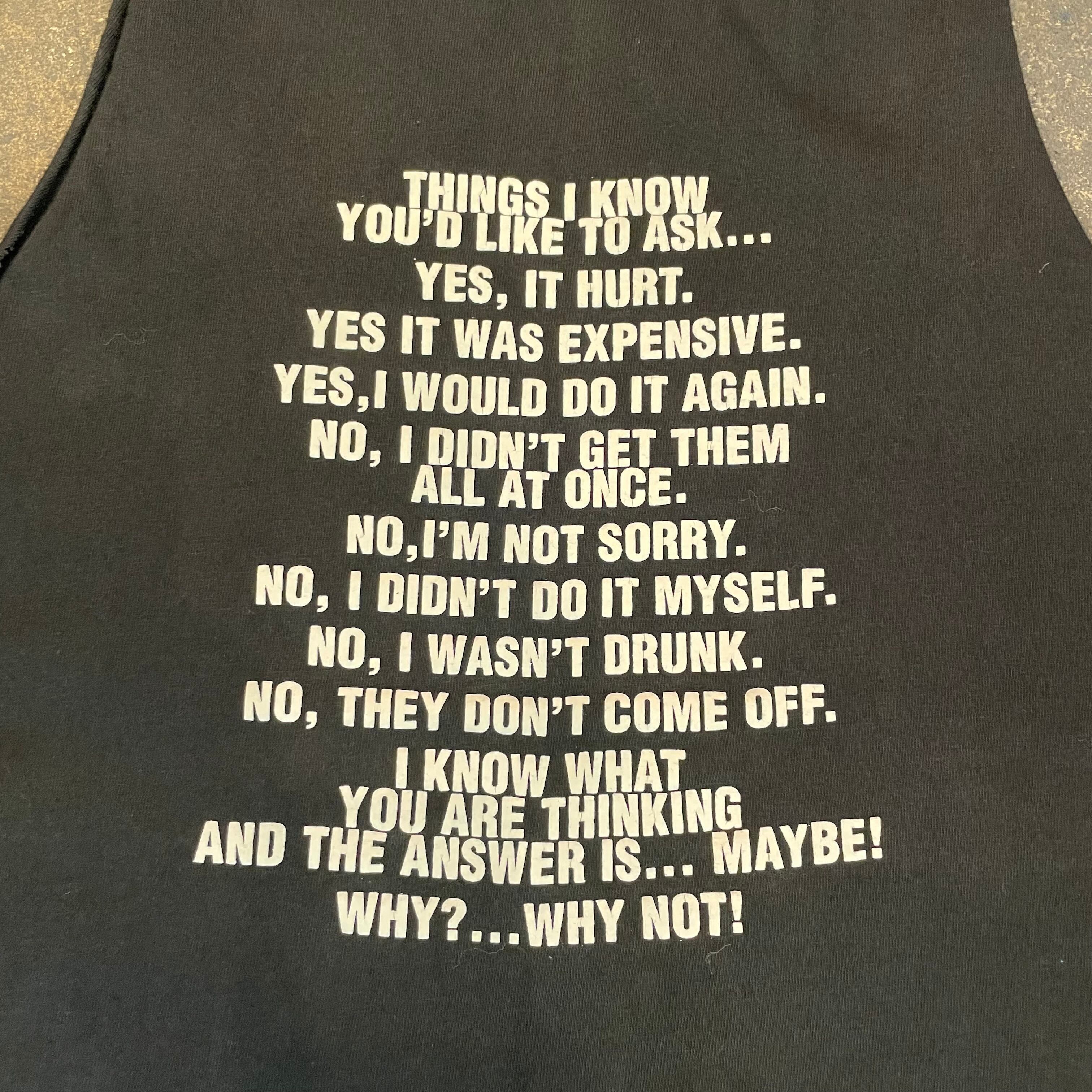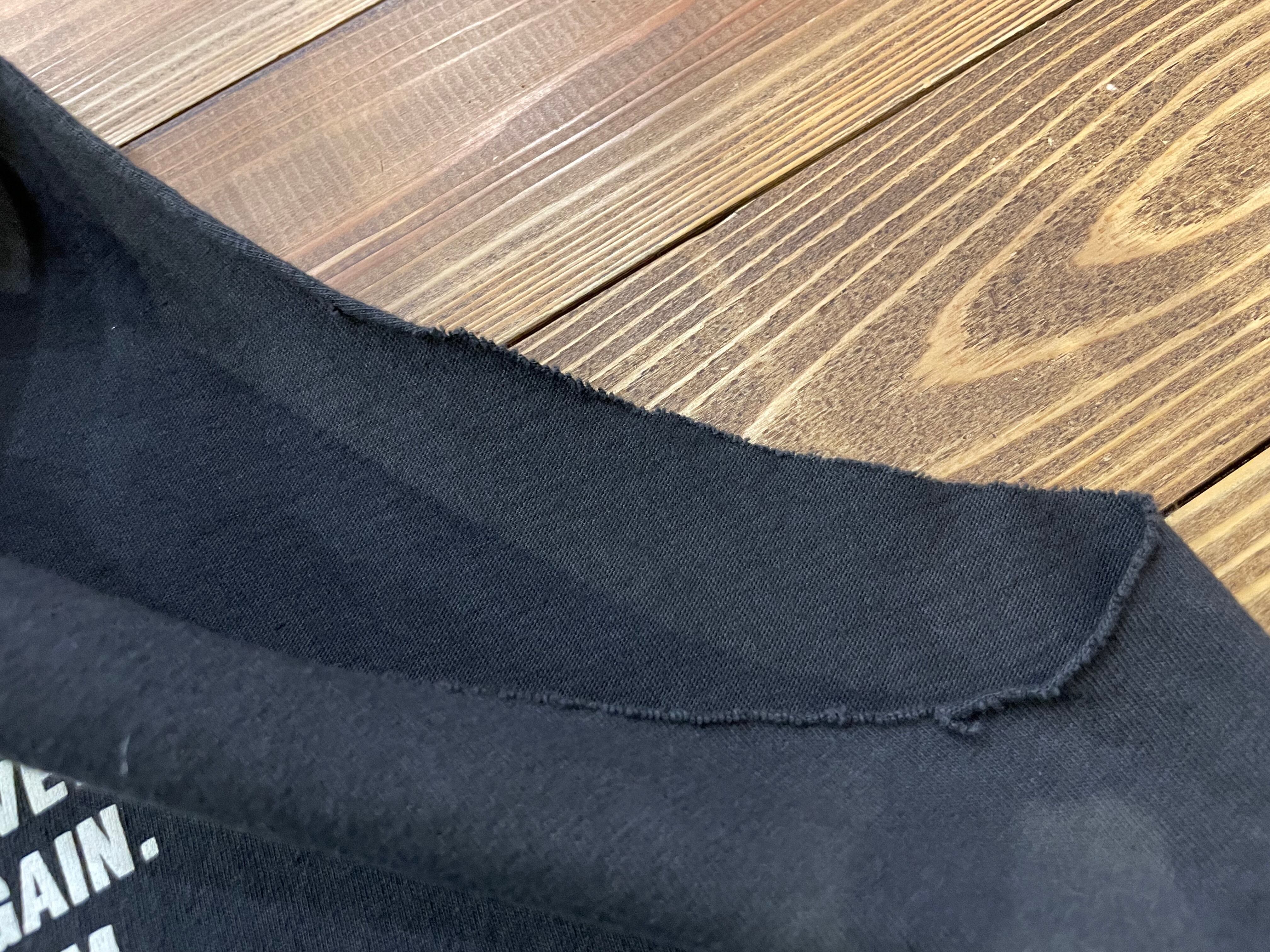 黒地に白の文字の羅列のみのシンプルなデザインがかっこいいタンクトップです。もともとTシャツだったものを誰かが襟ぐりや袖をカットしたと思われます。