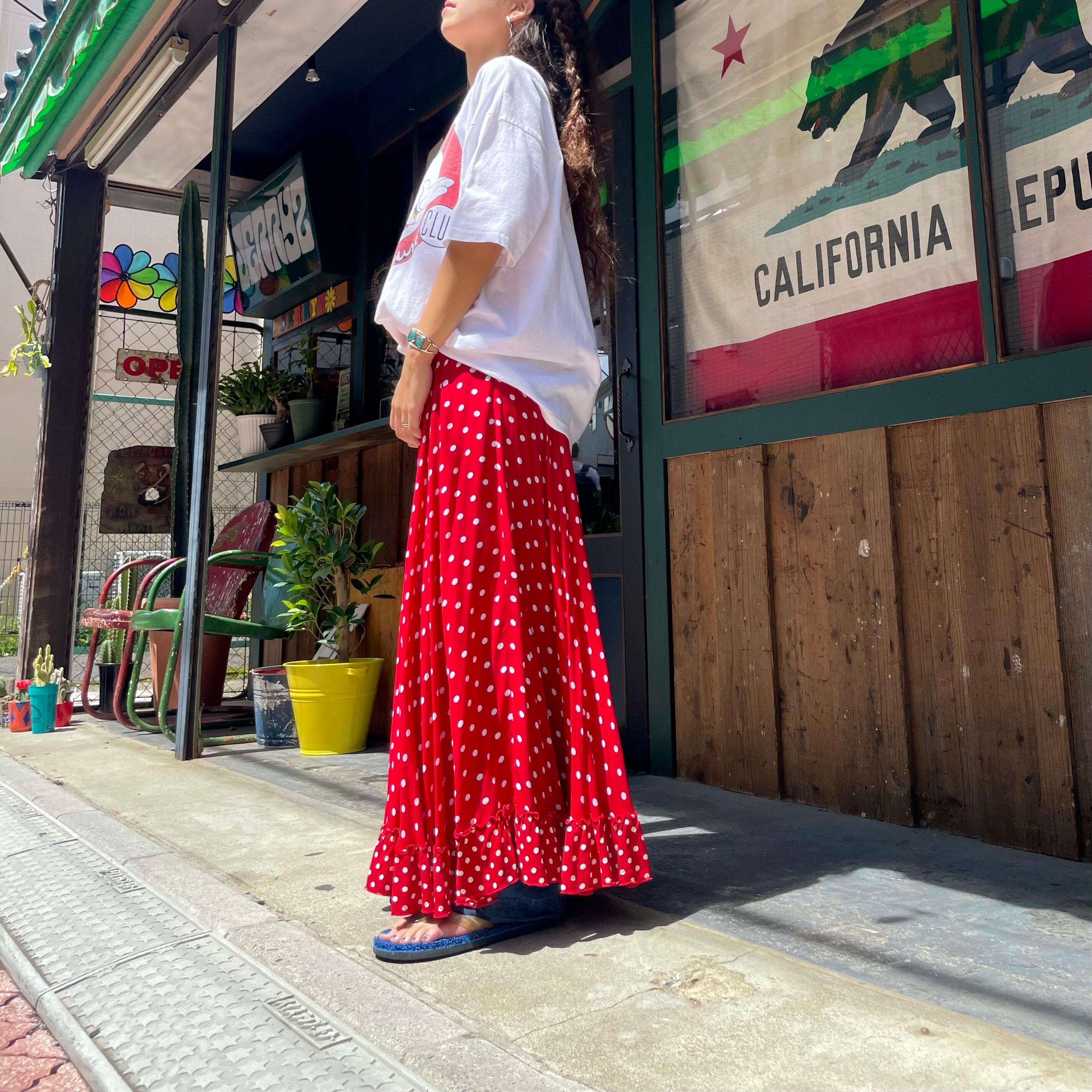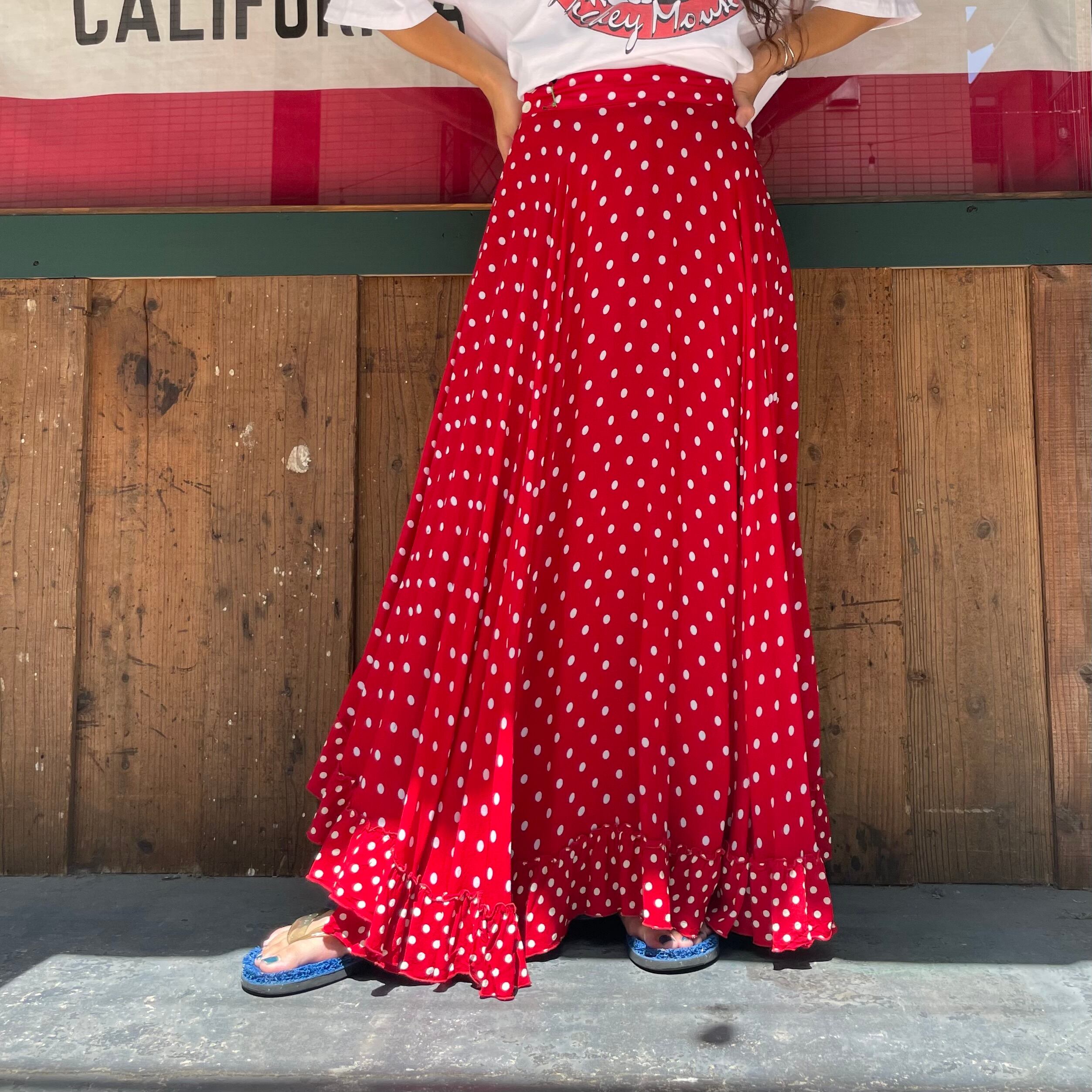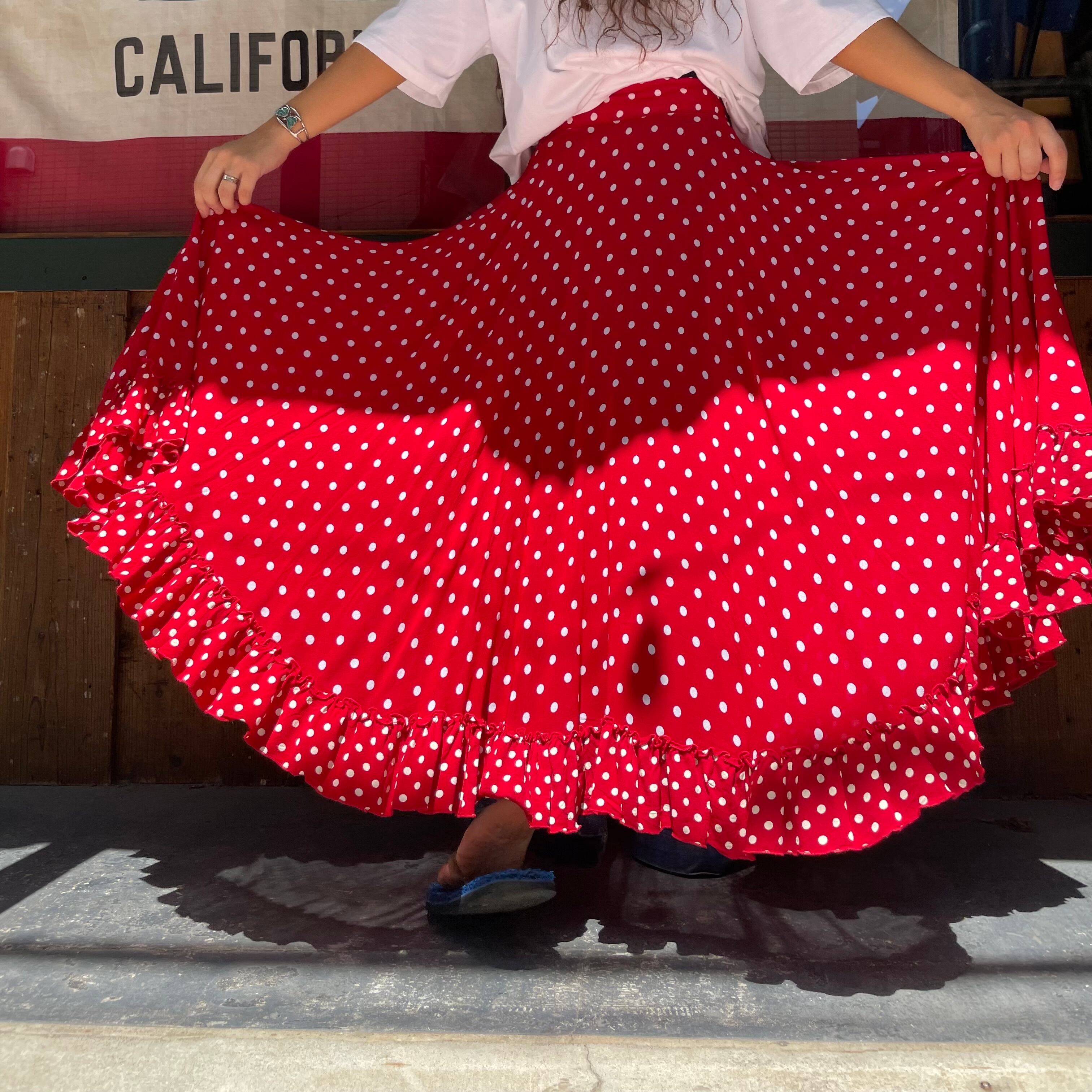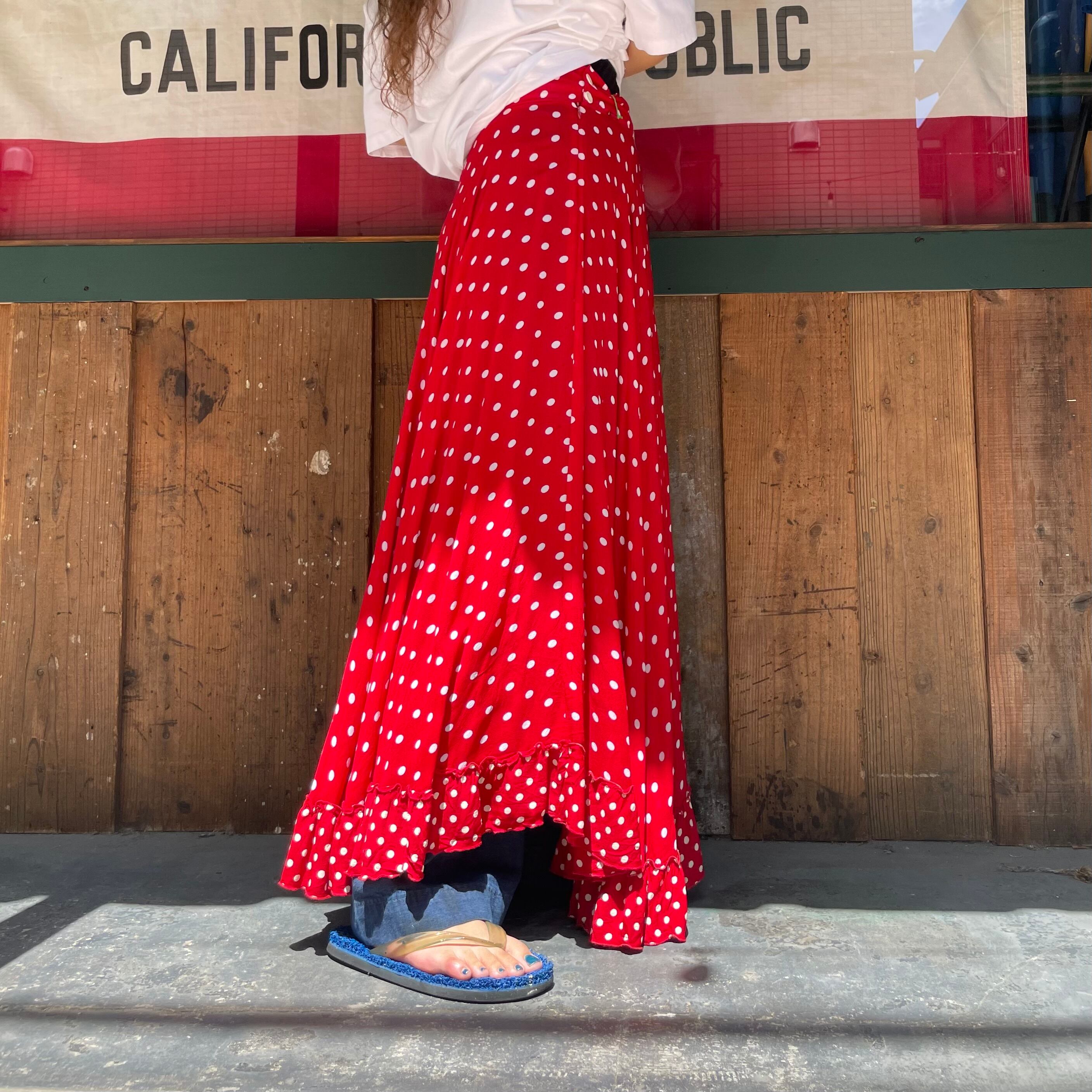 赤白ドットのシースルー素材がかわいいスカートです。たっぷり布を使用していてひらひらと揺れる雰囲気がとても素敵で、回ったり踊ったりしたくなるようなシルエットです。