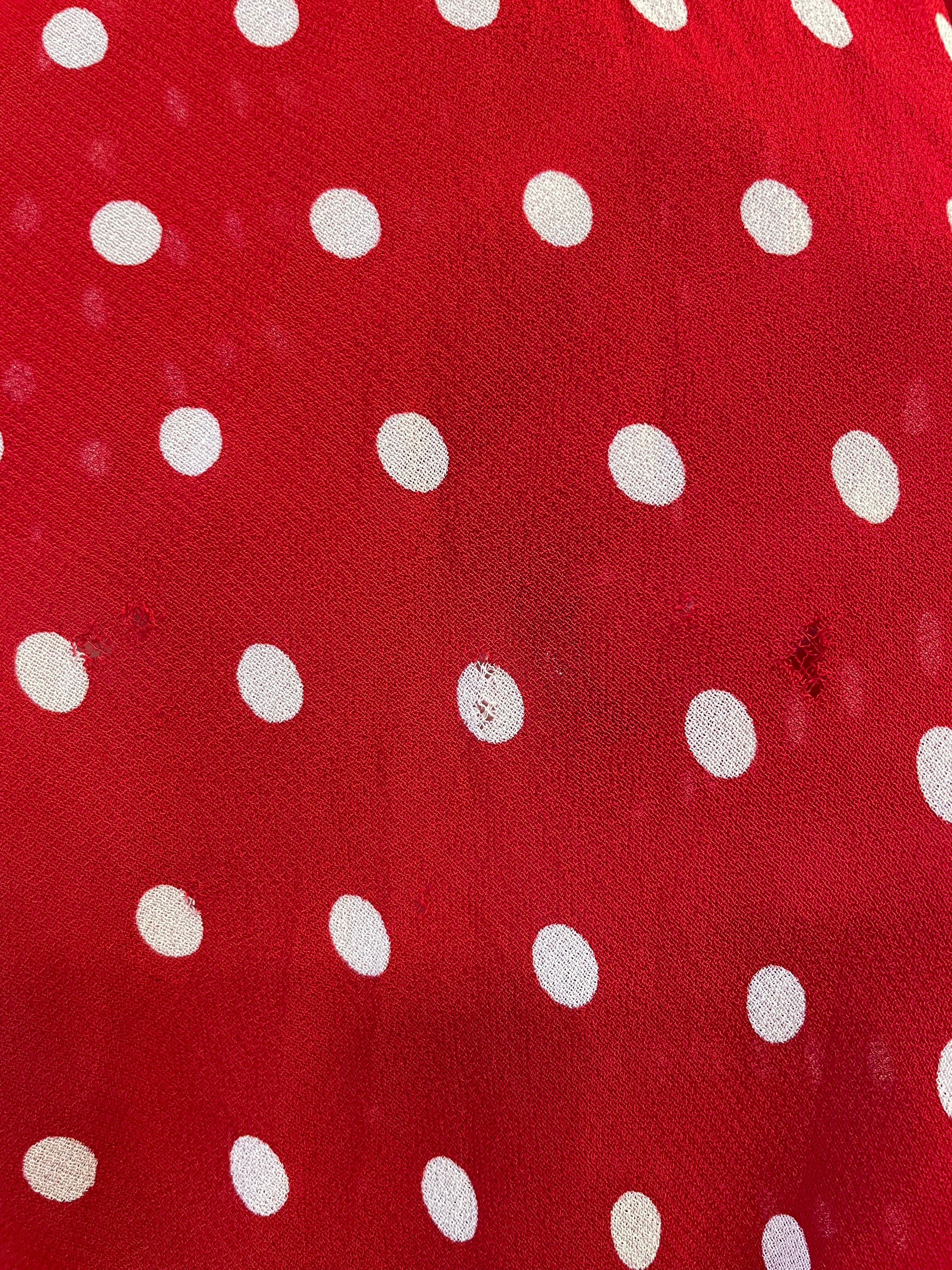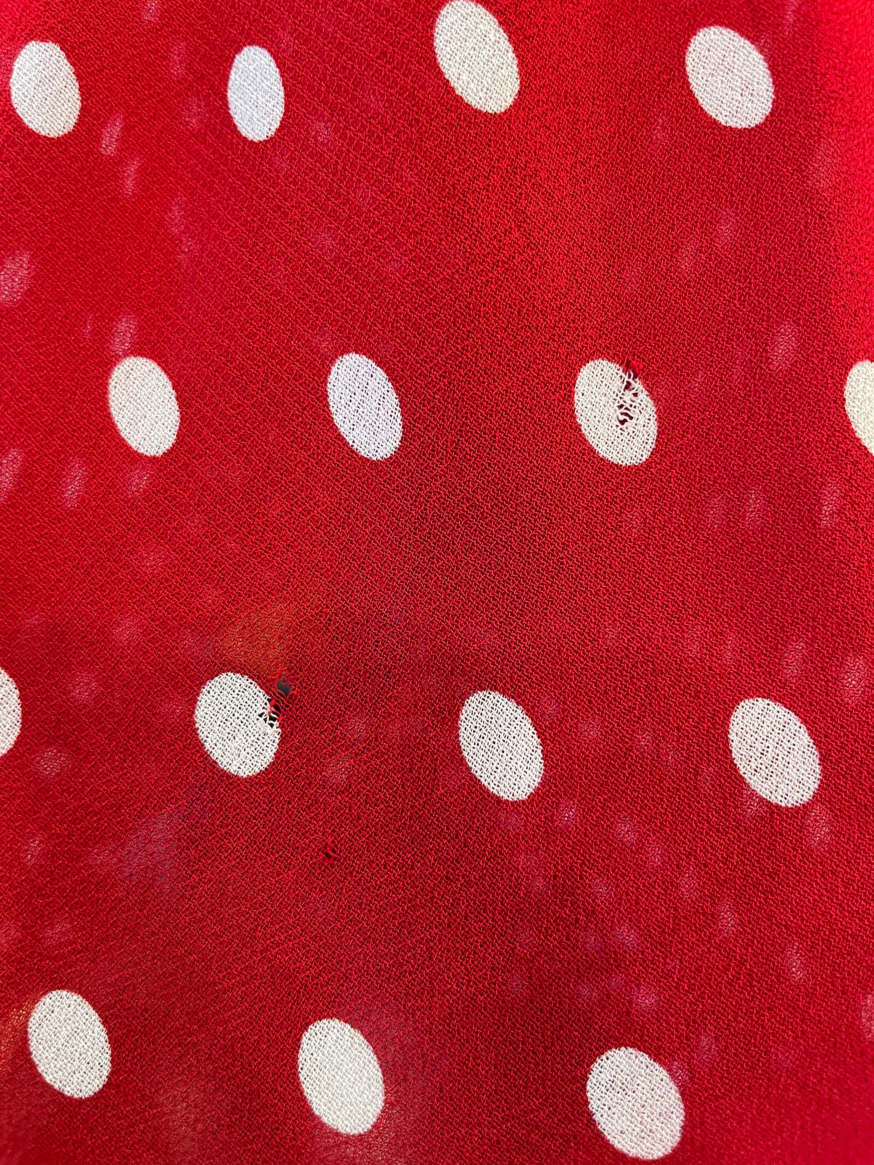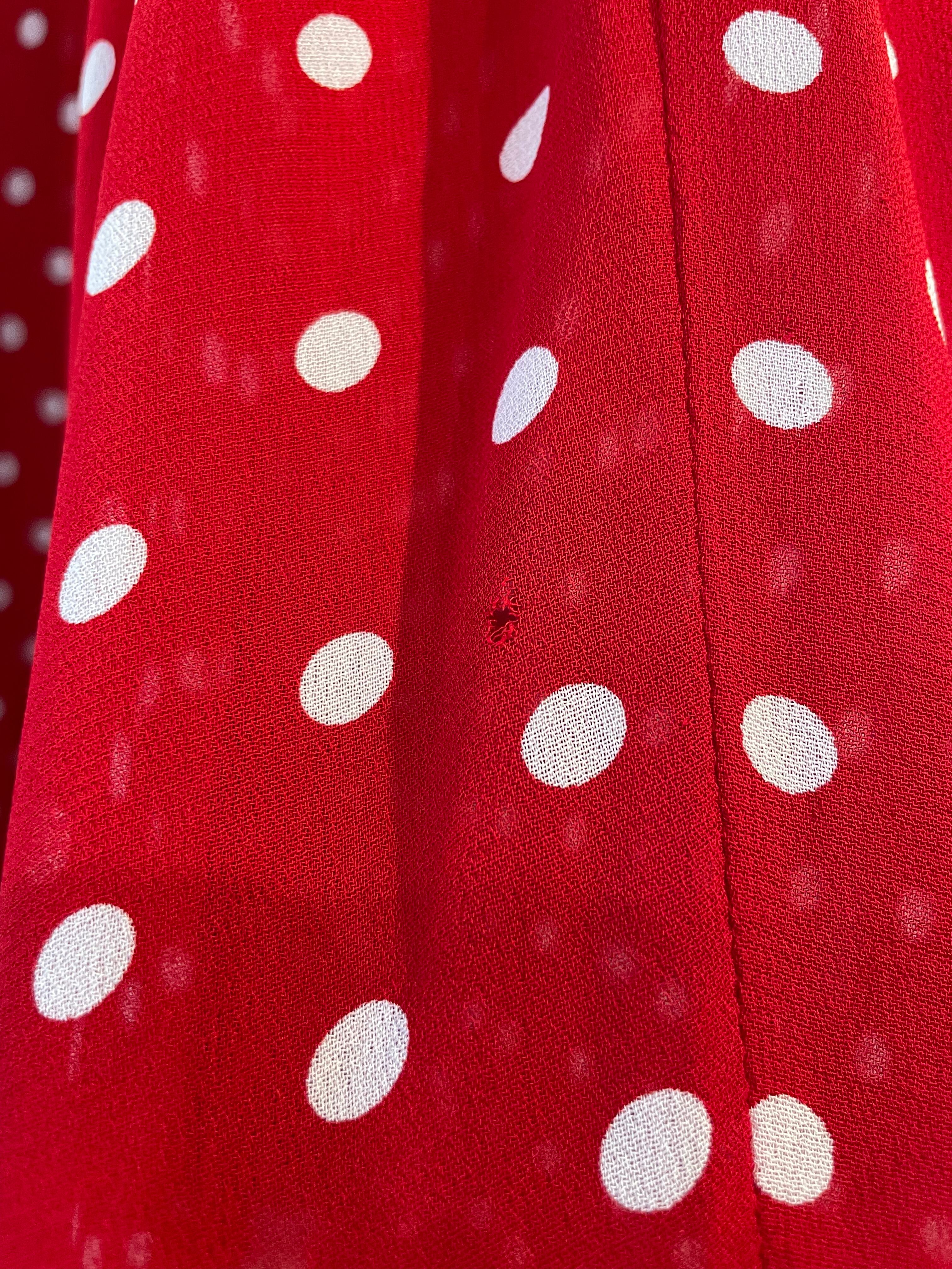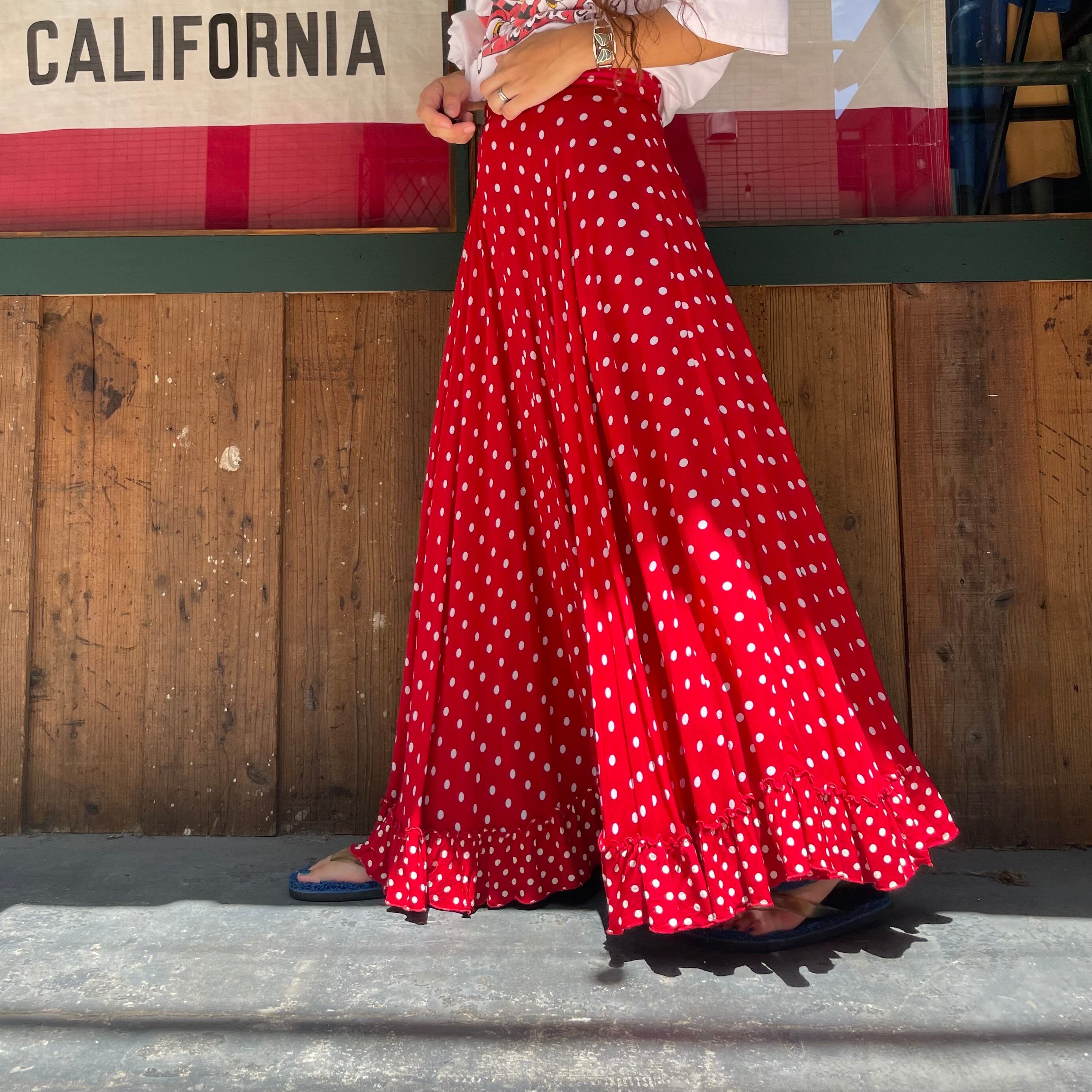 赤白ドットのシースルー素材がかわいいスカートです。たっぷり布を使用していてひらひらと揺れる雰囲気がとても素敵で、回ったり踊ったりしたくなるようなシルエットです。