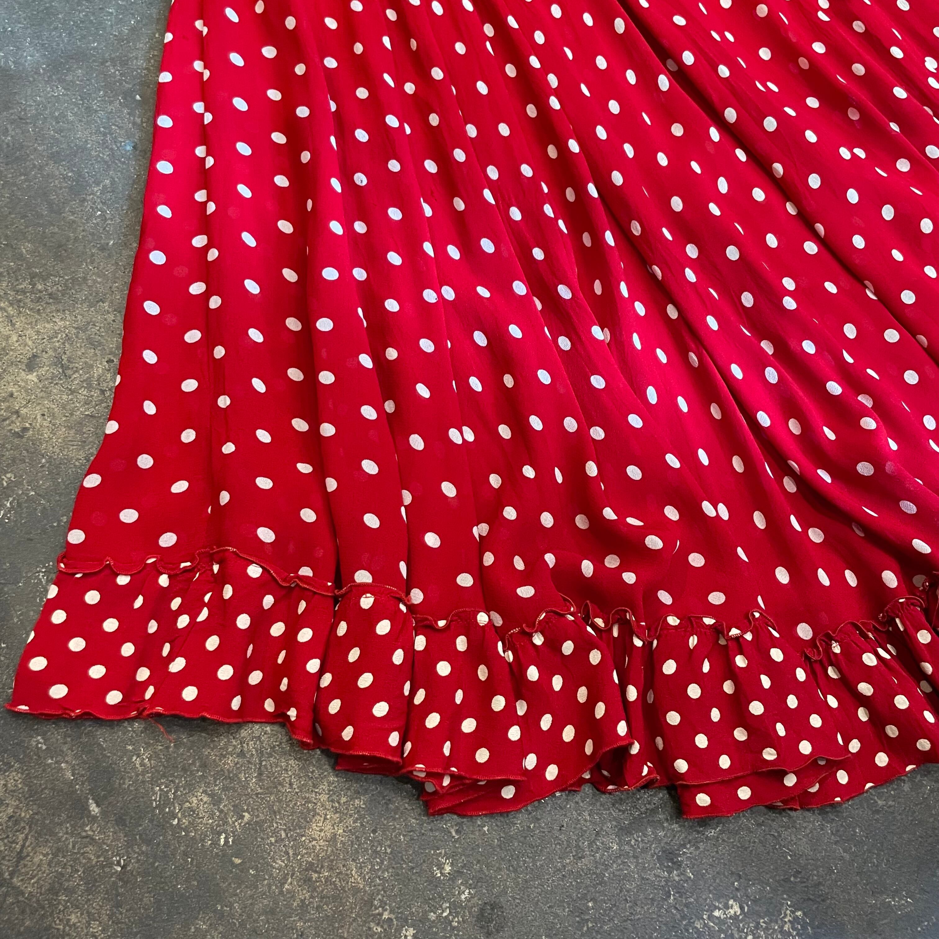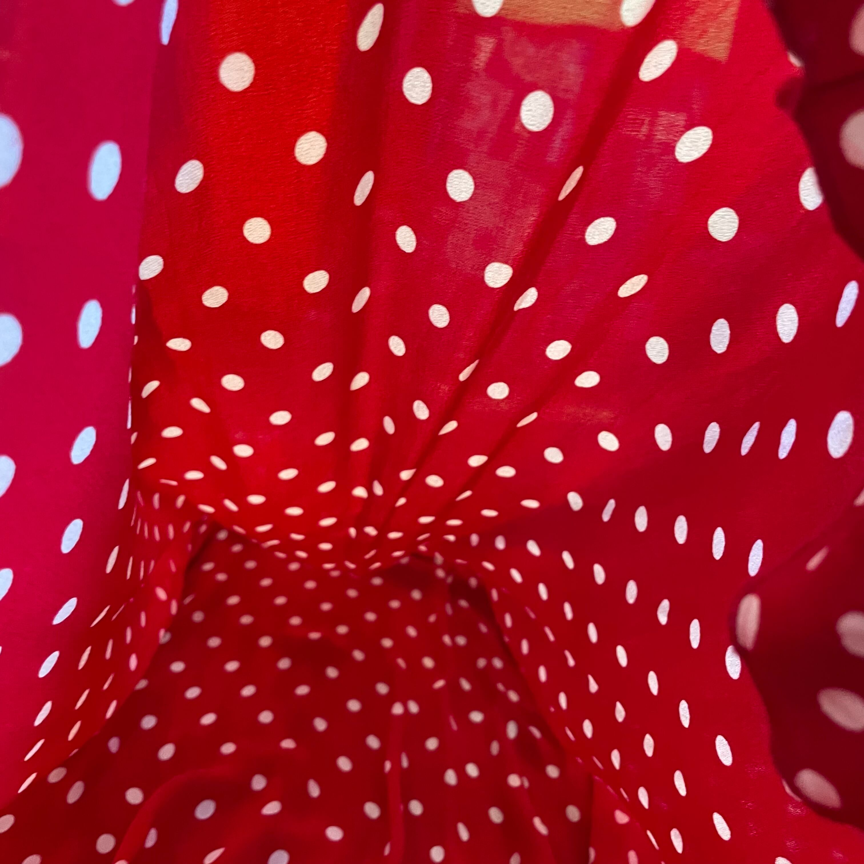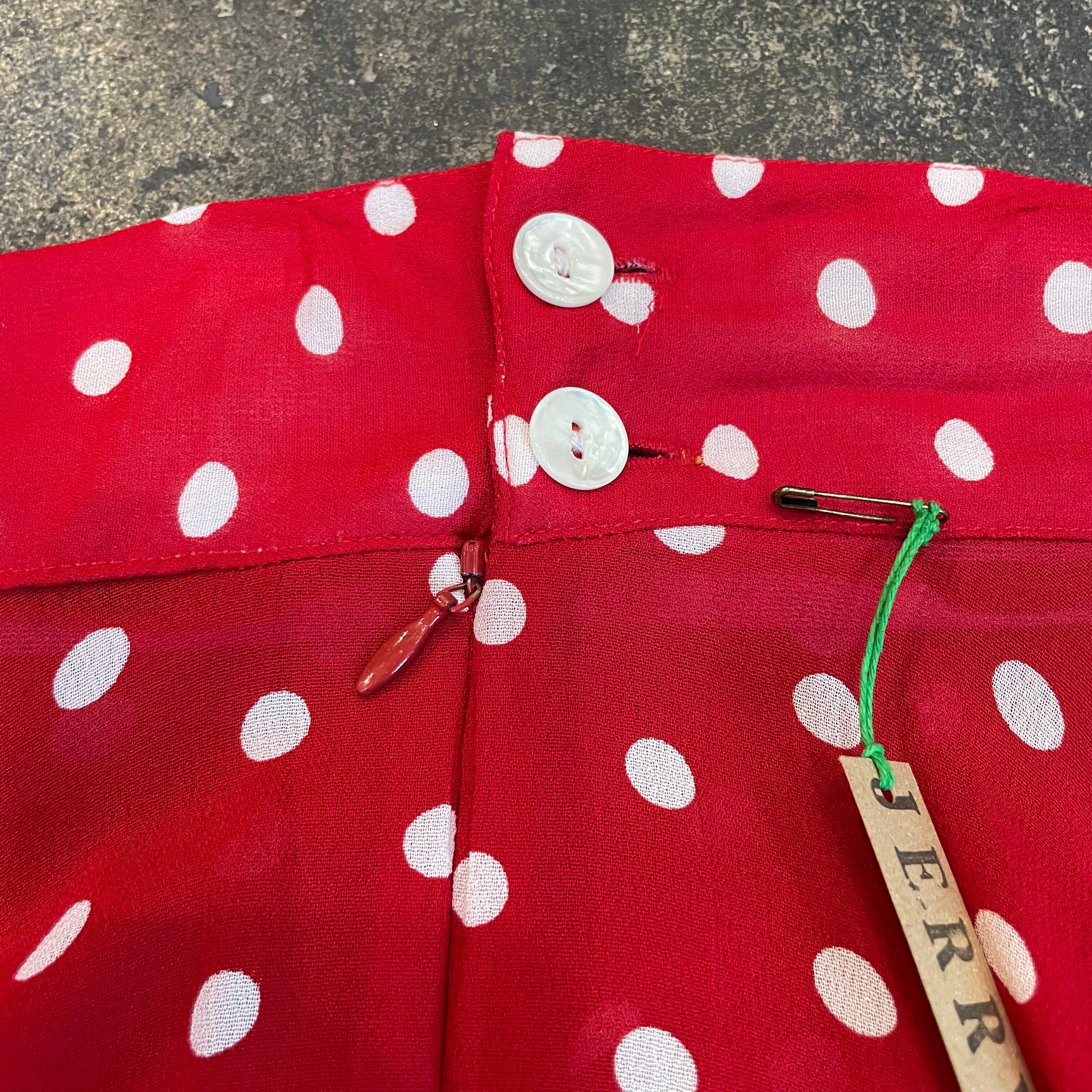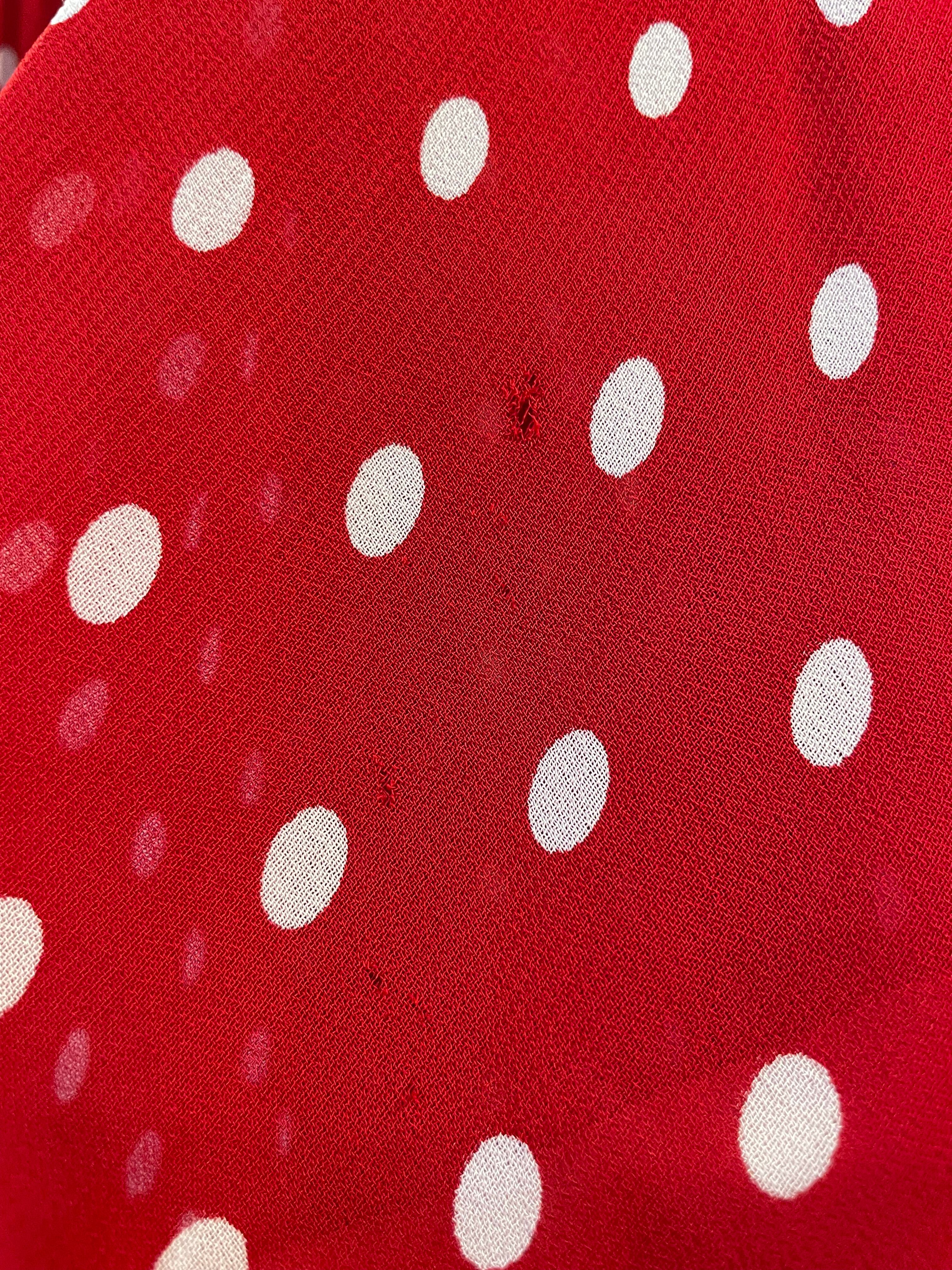 赤白ドットのシースルー素材がかわいいスカートです。たっぷり布を使用していてひらひらと揺れる雰囲気がとても素敵で、回ったり踊ったりしたくなるようなシルエットです。
