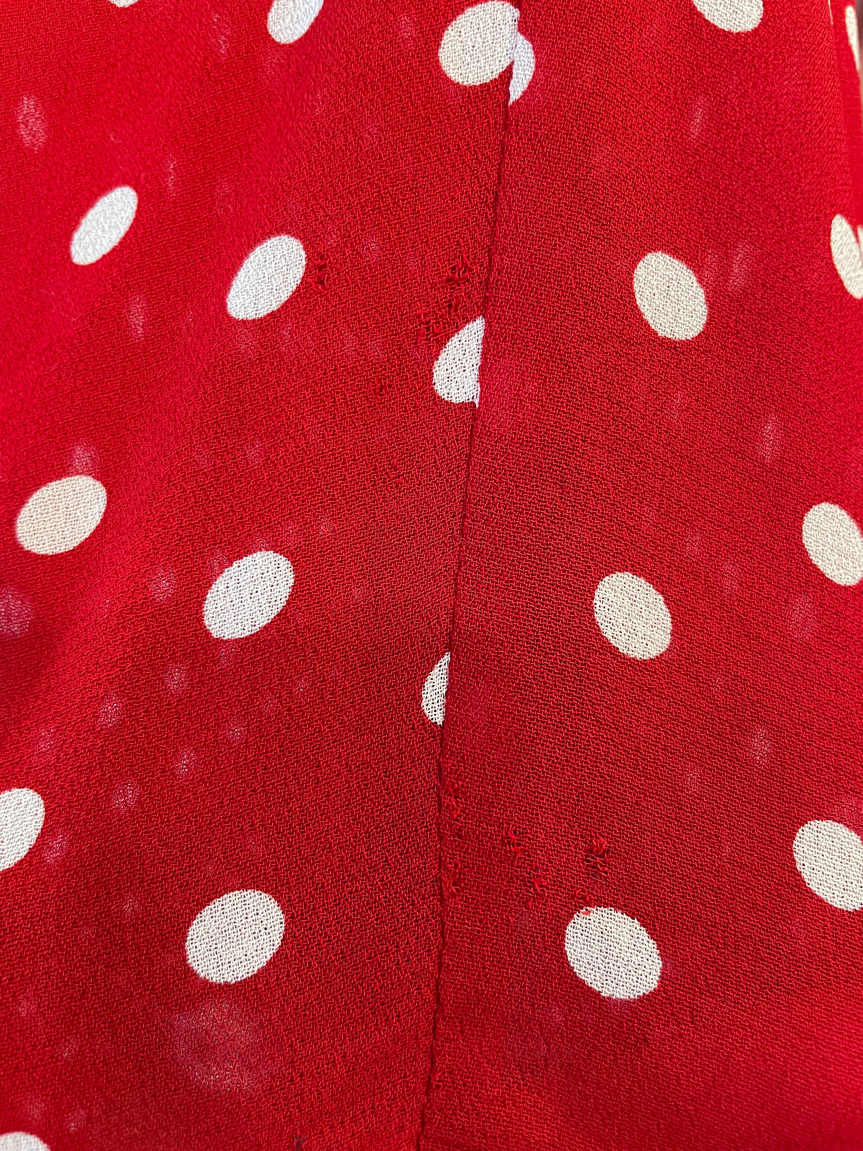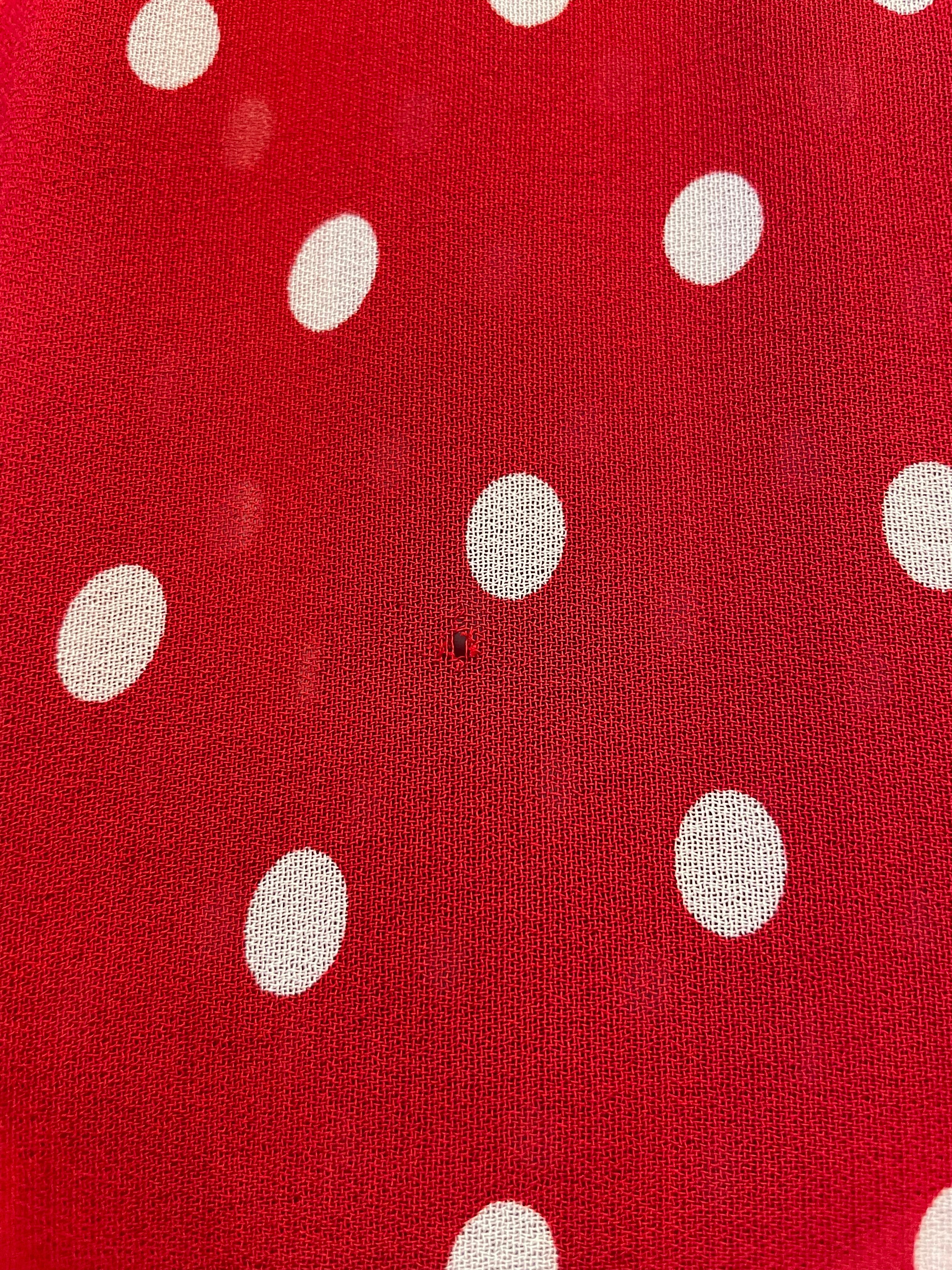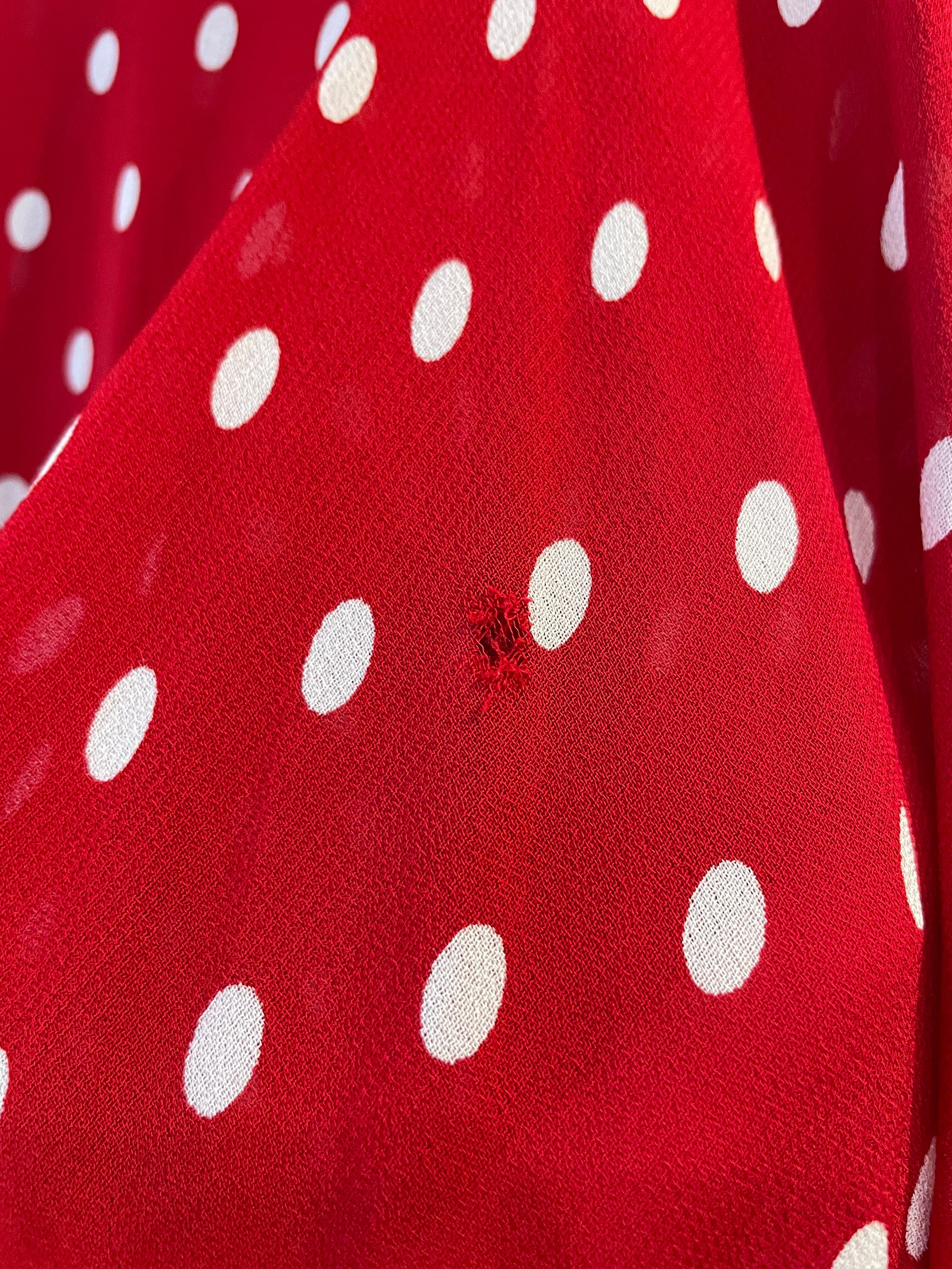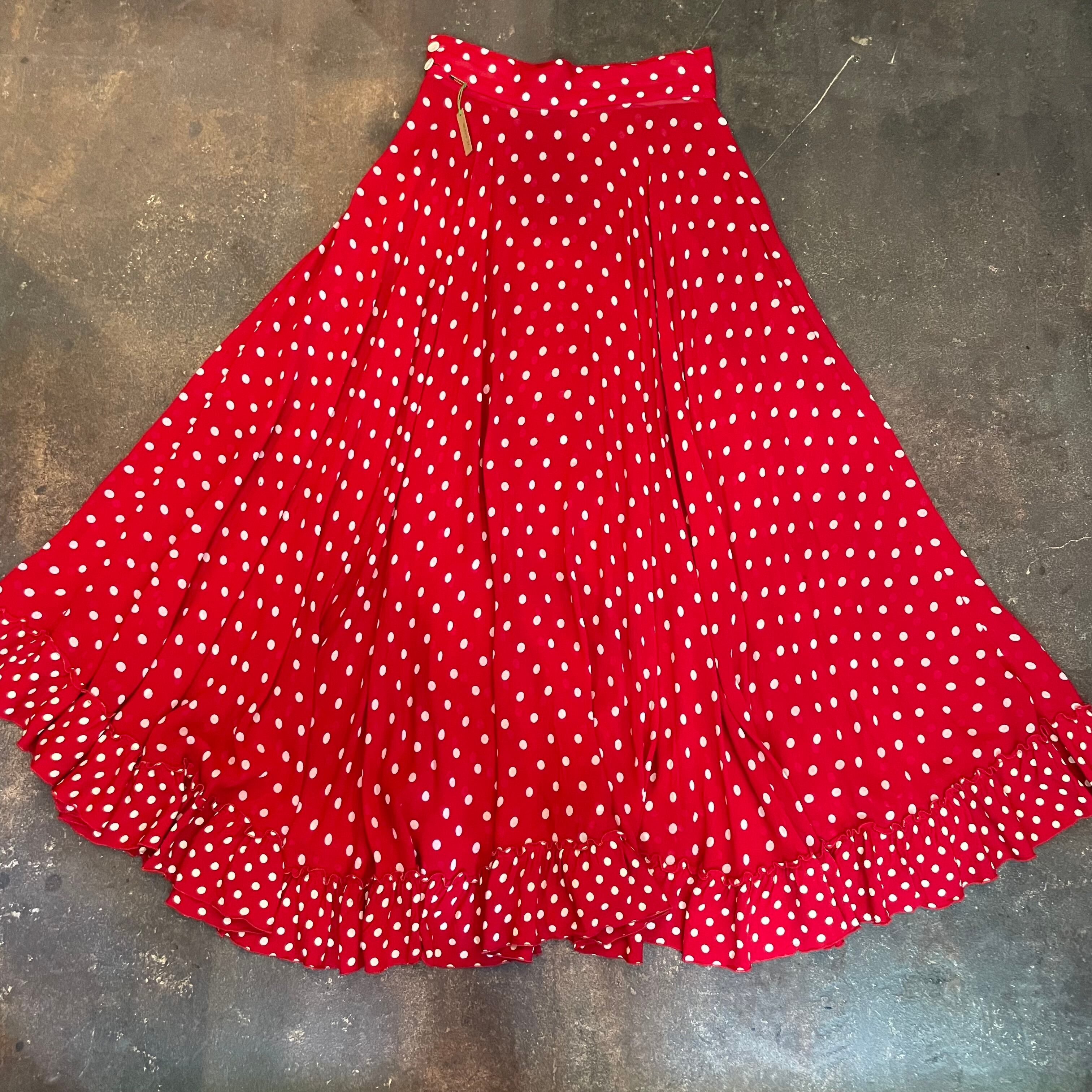 赤白ドットのシースルー素材がかわいいスカートです。たっぷり布を使用していてひらひらと揺れる雰囲気がとても素敵で、回ったり踊ったりしたくなるようなシルエットです。