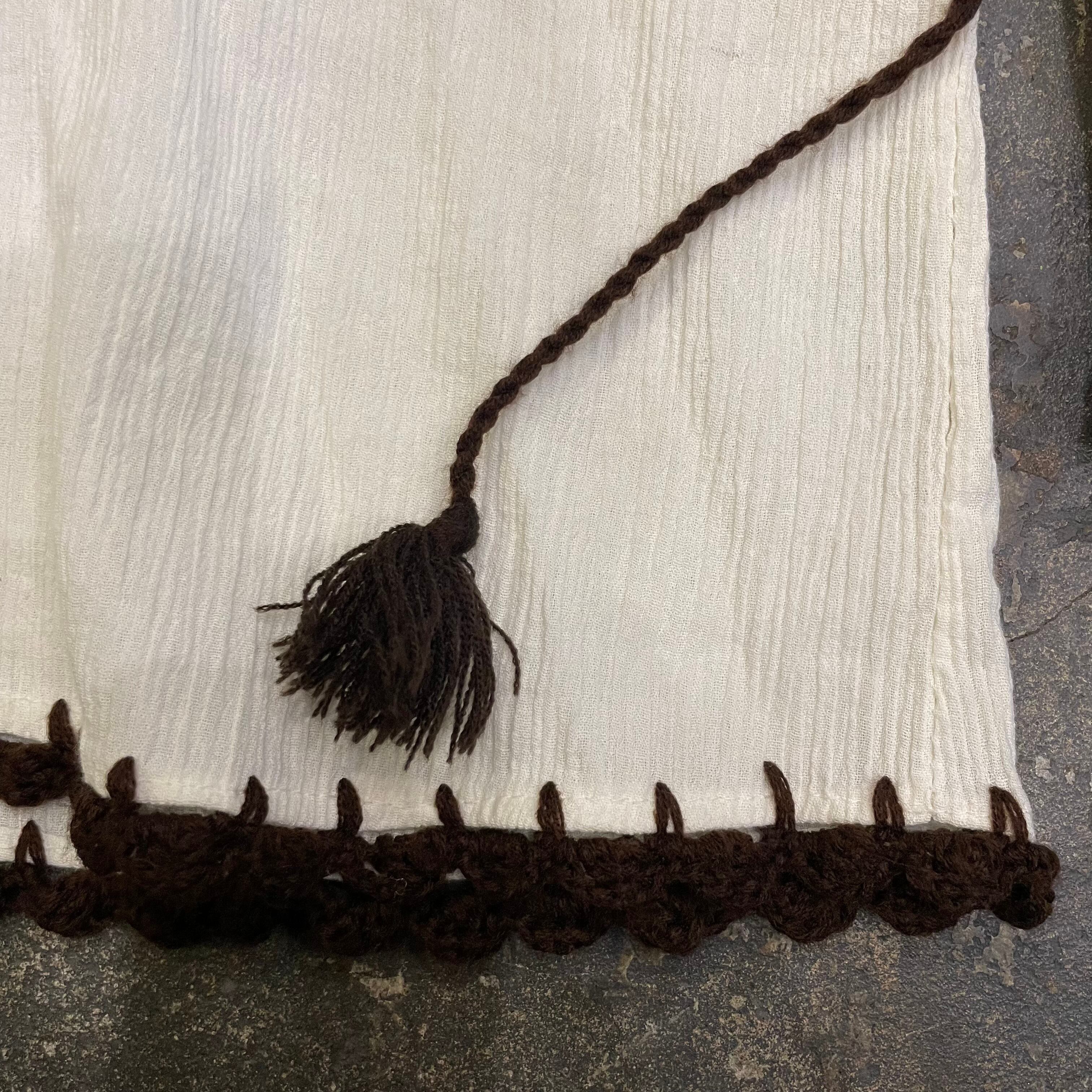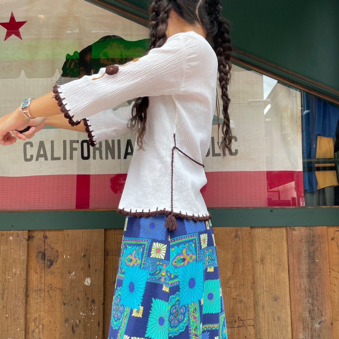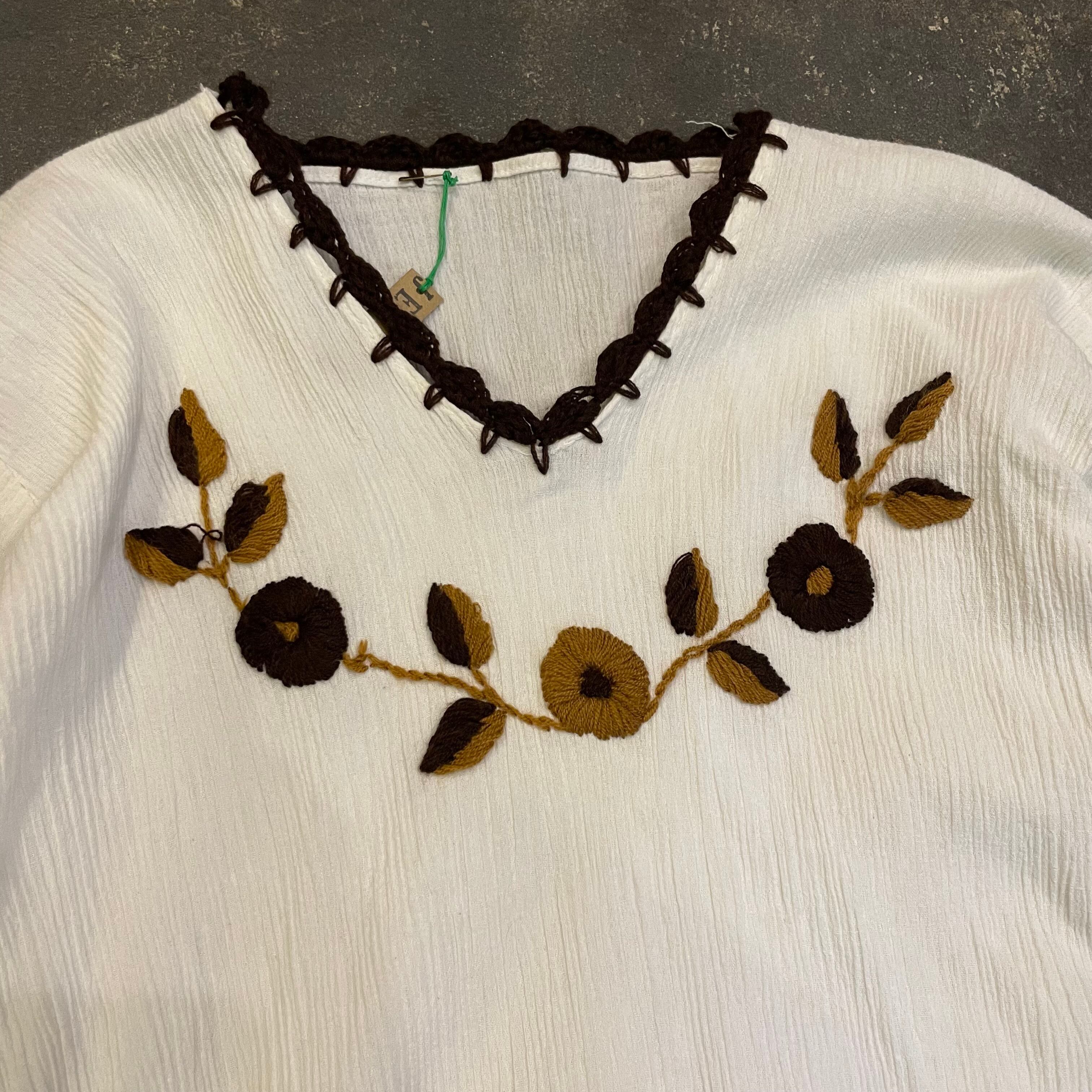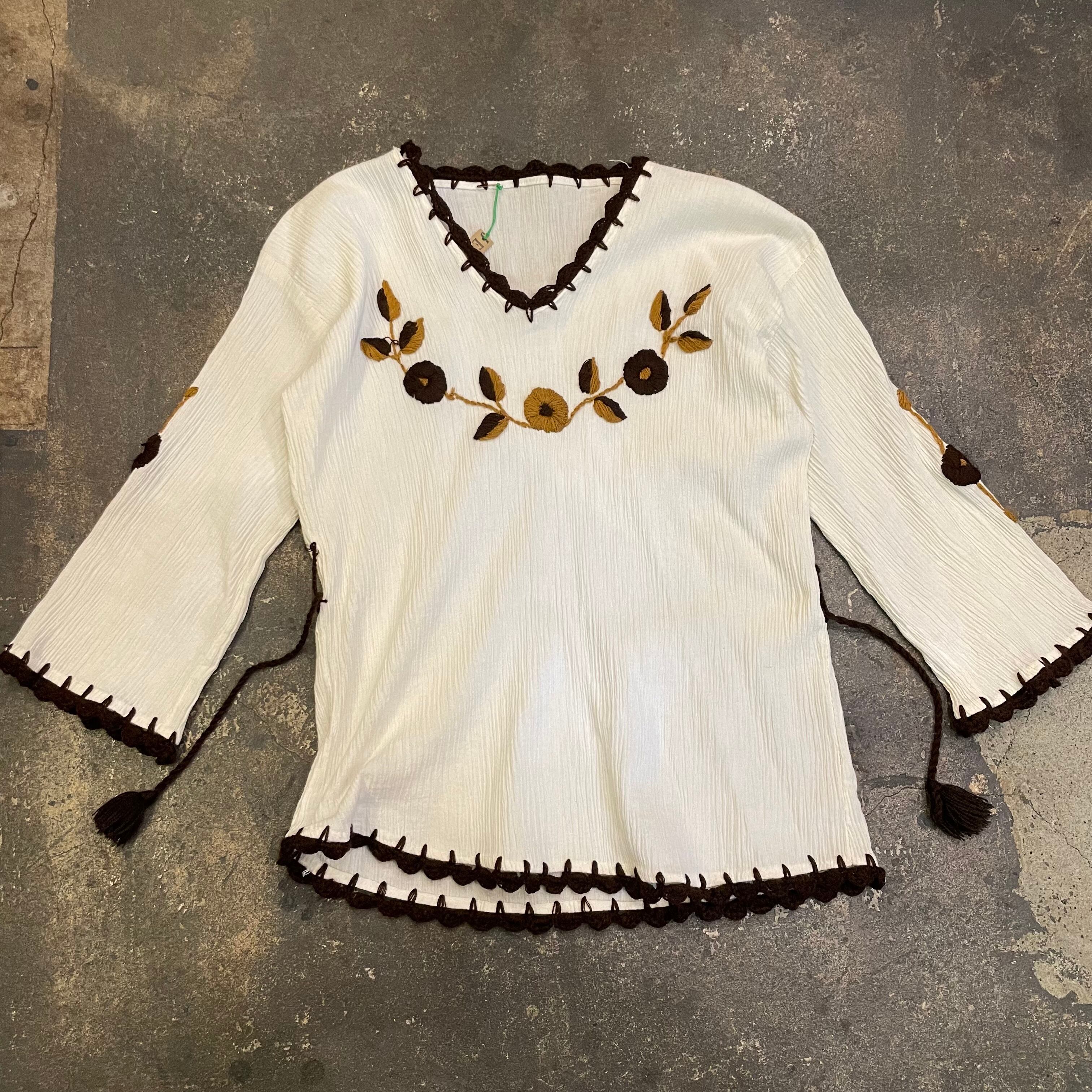 生成りに茶色のお花の手刺繍やクロシェのスカラップがついていてヒッピーな雰囲気があってかわいいトップスです。