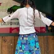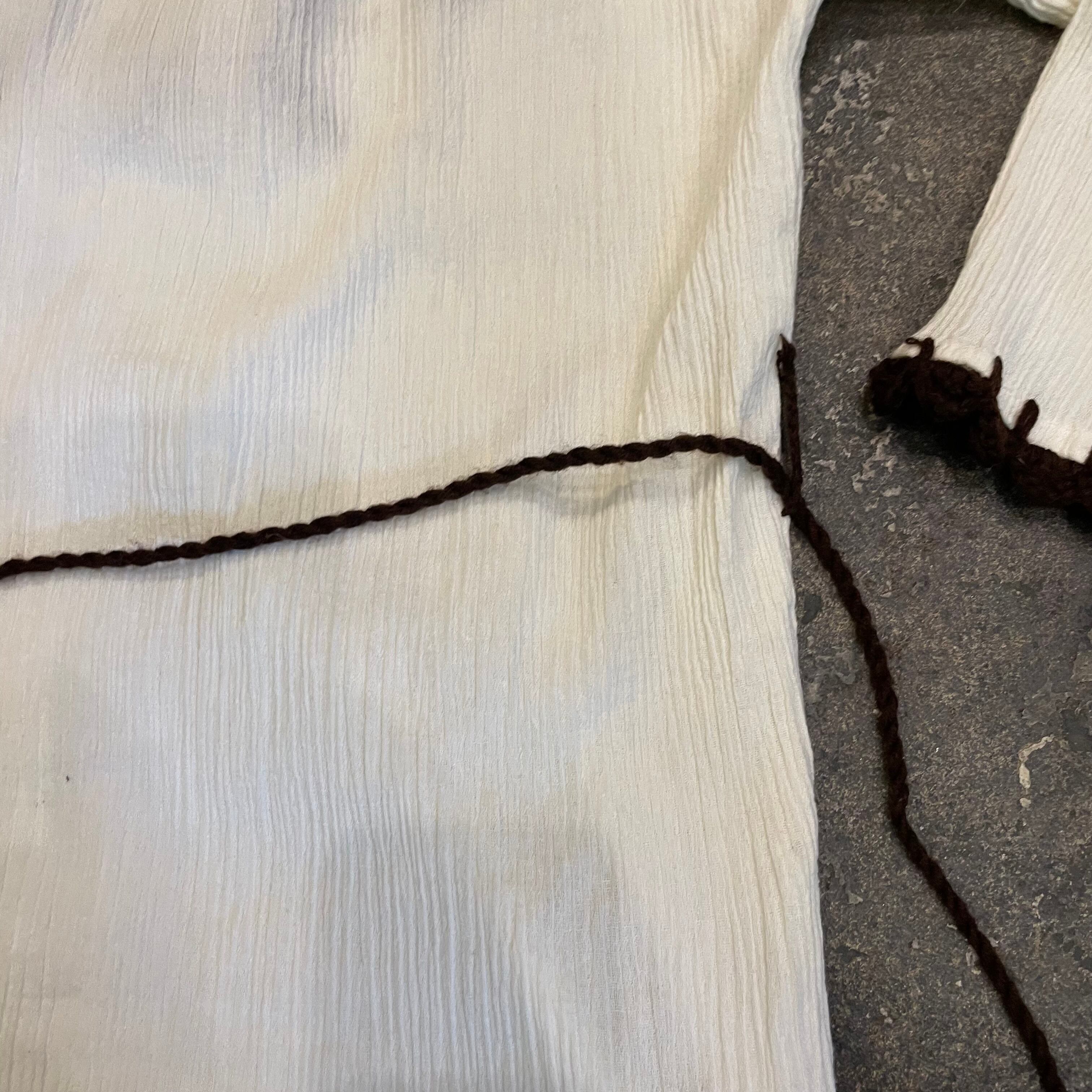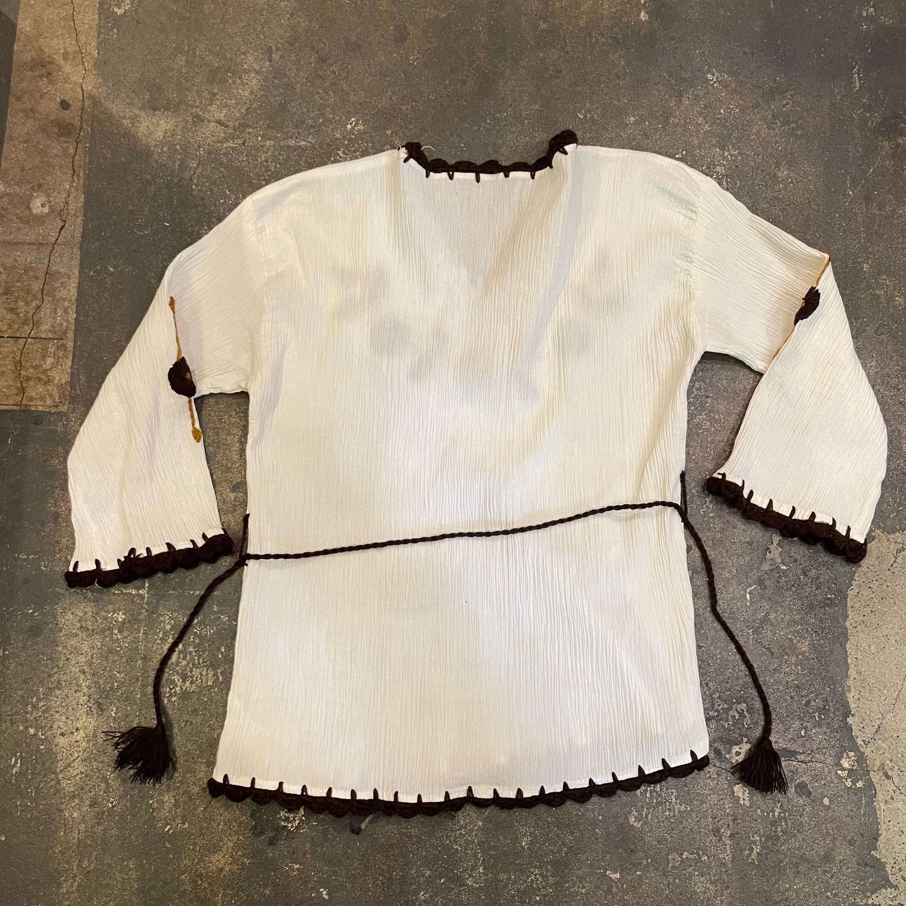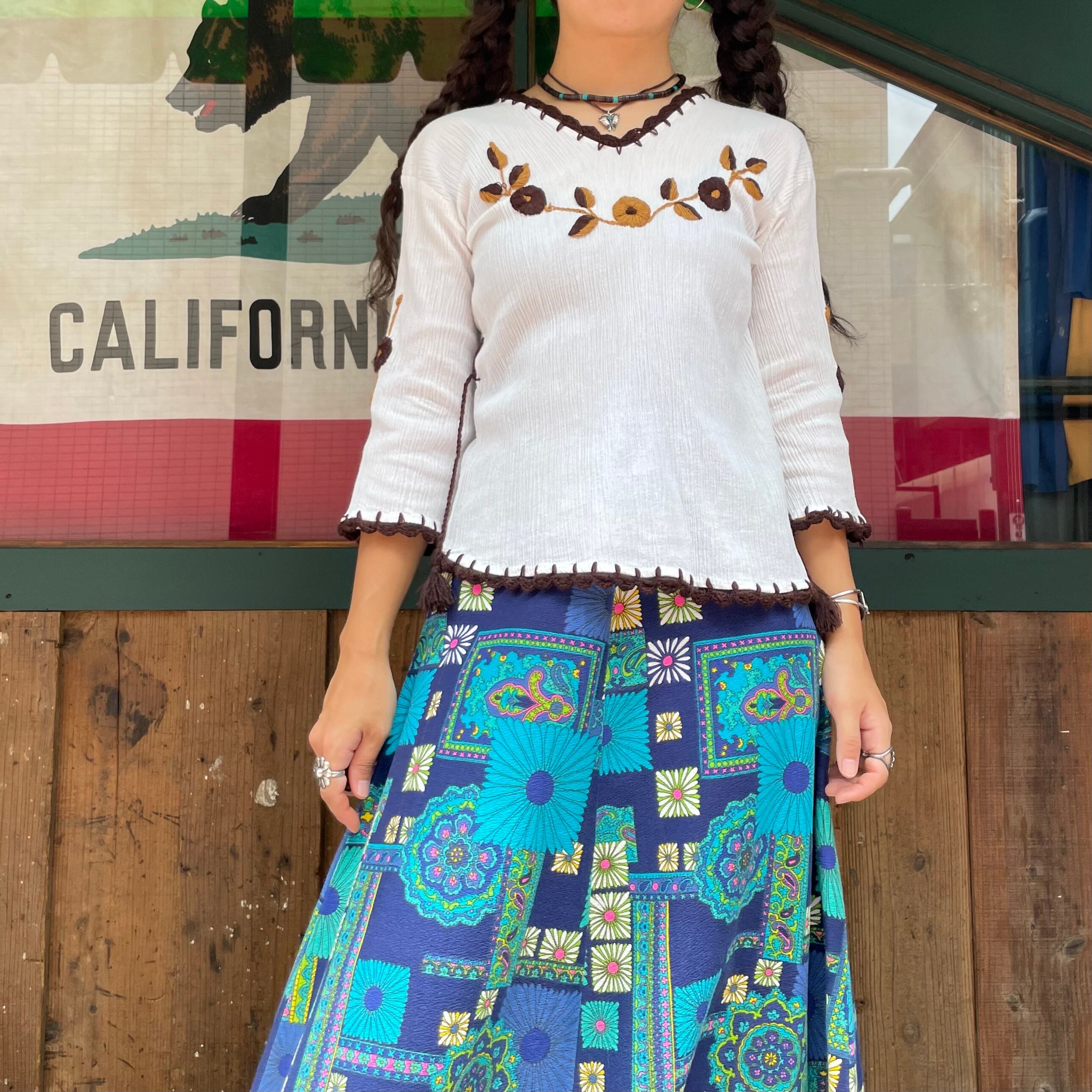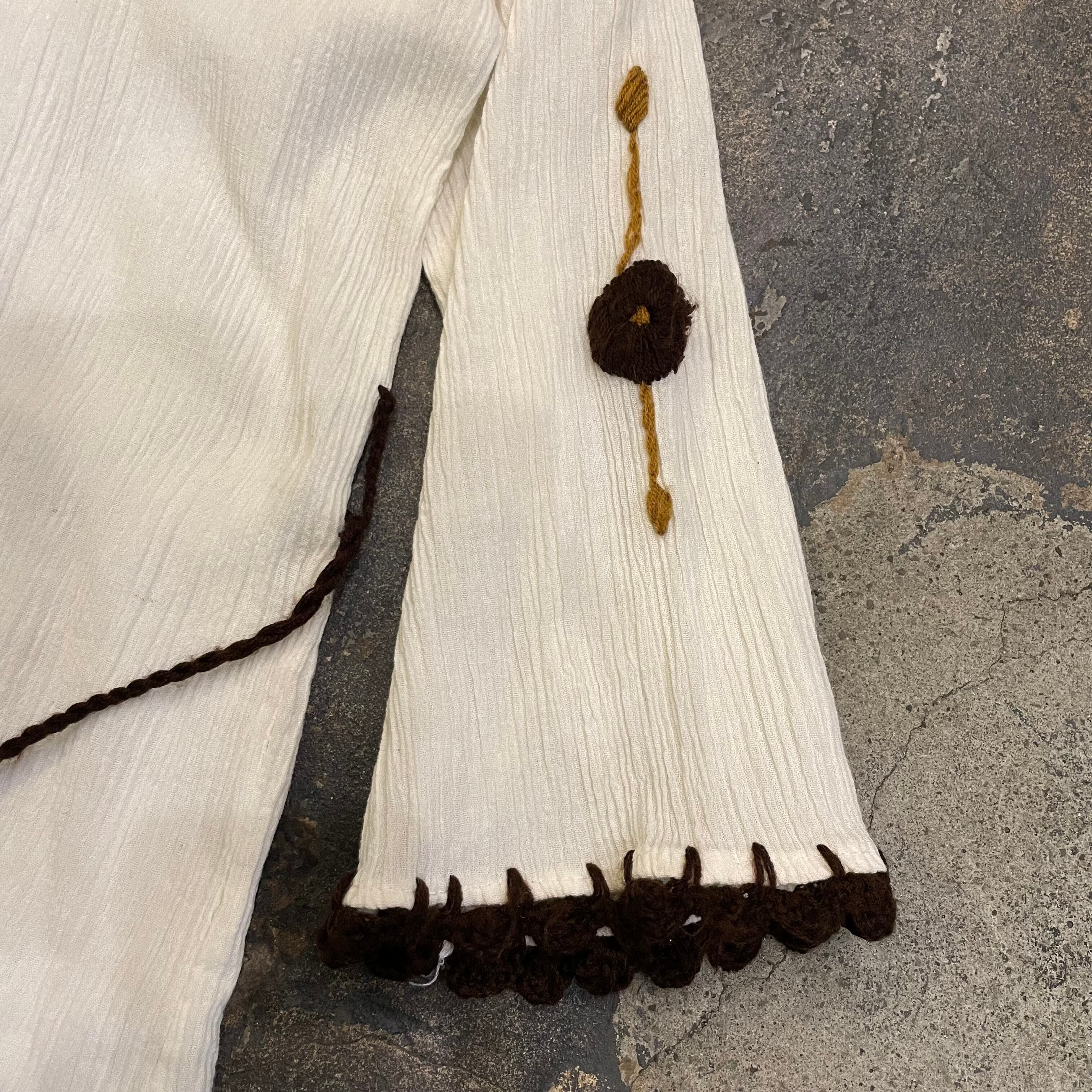 生成りに茶色のお花の手刺繍やクロシェのスカラップがついていてヒッピーな雰囲気があってかわいいトップスです。