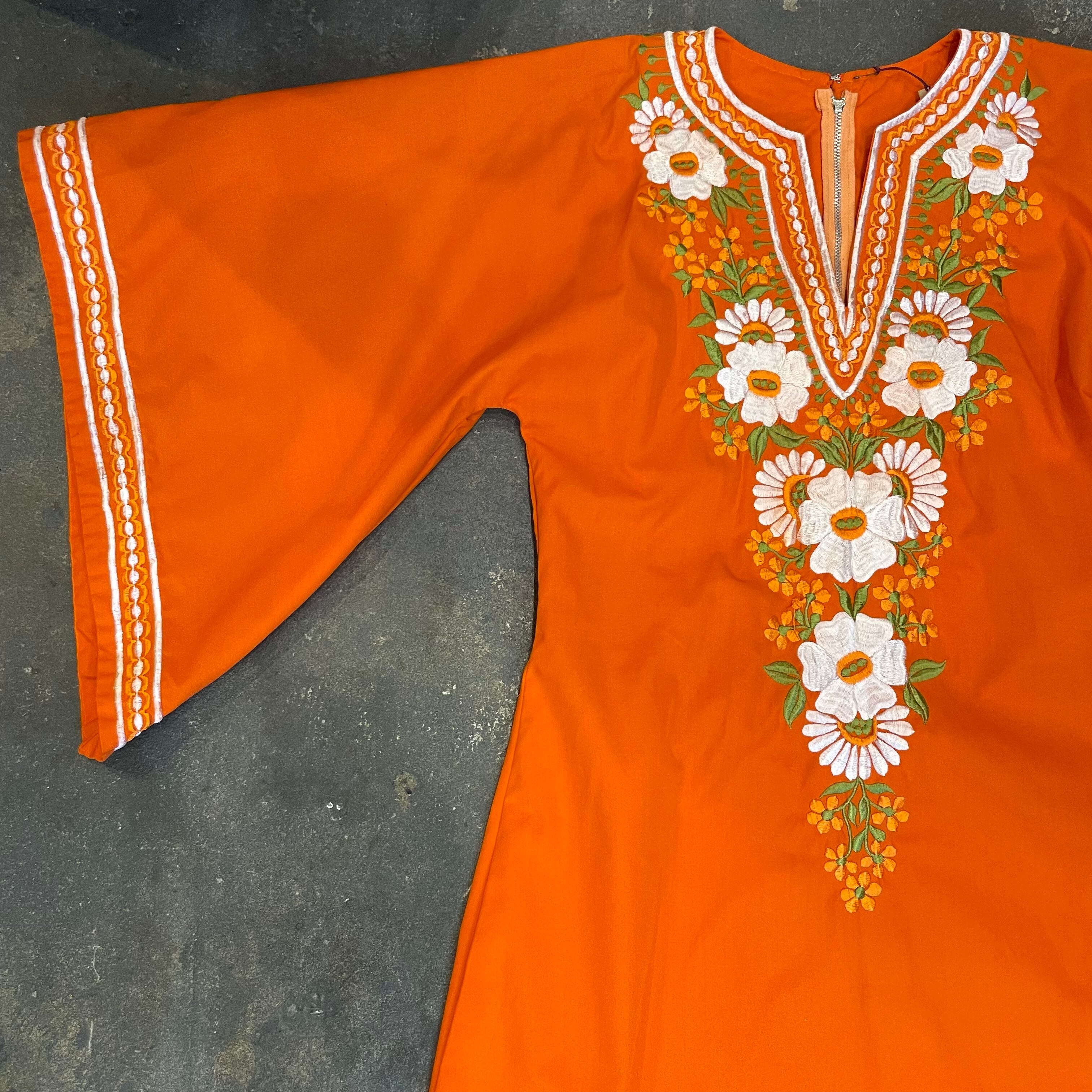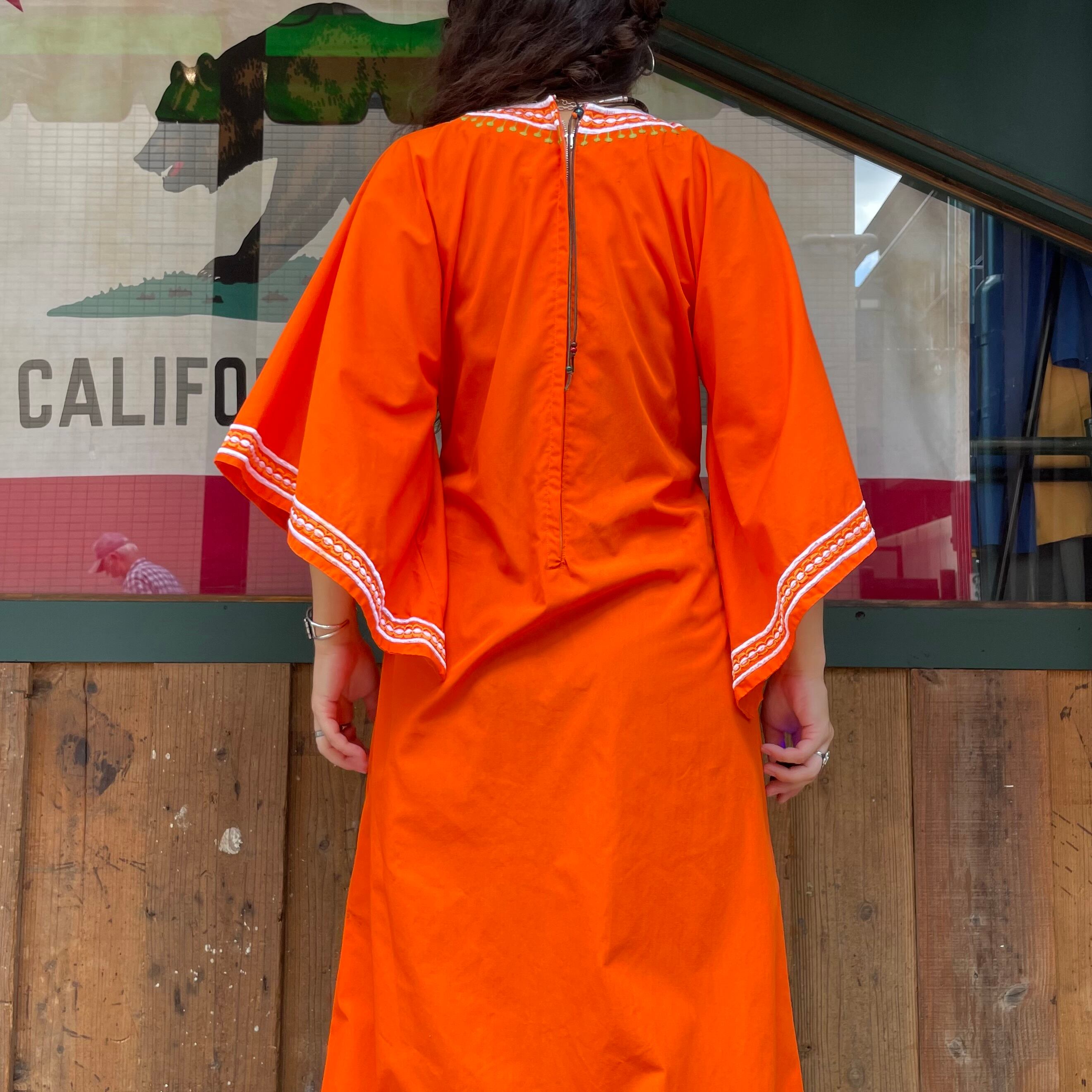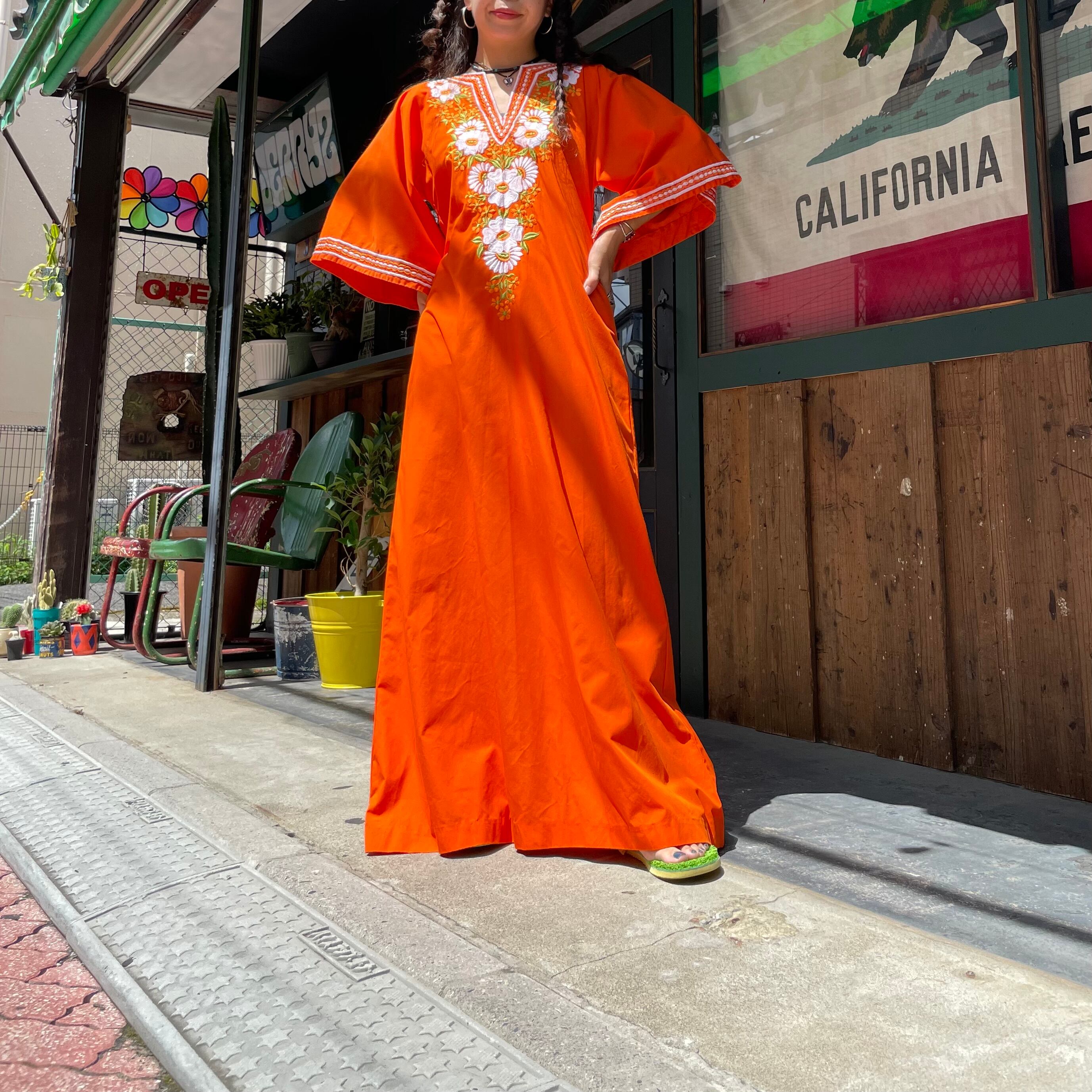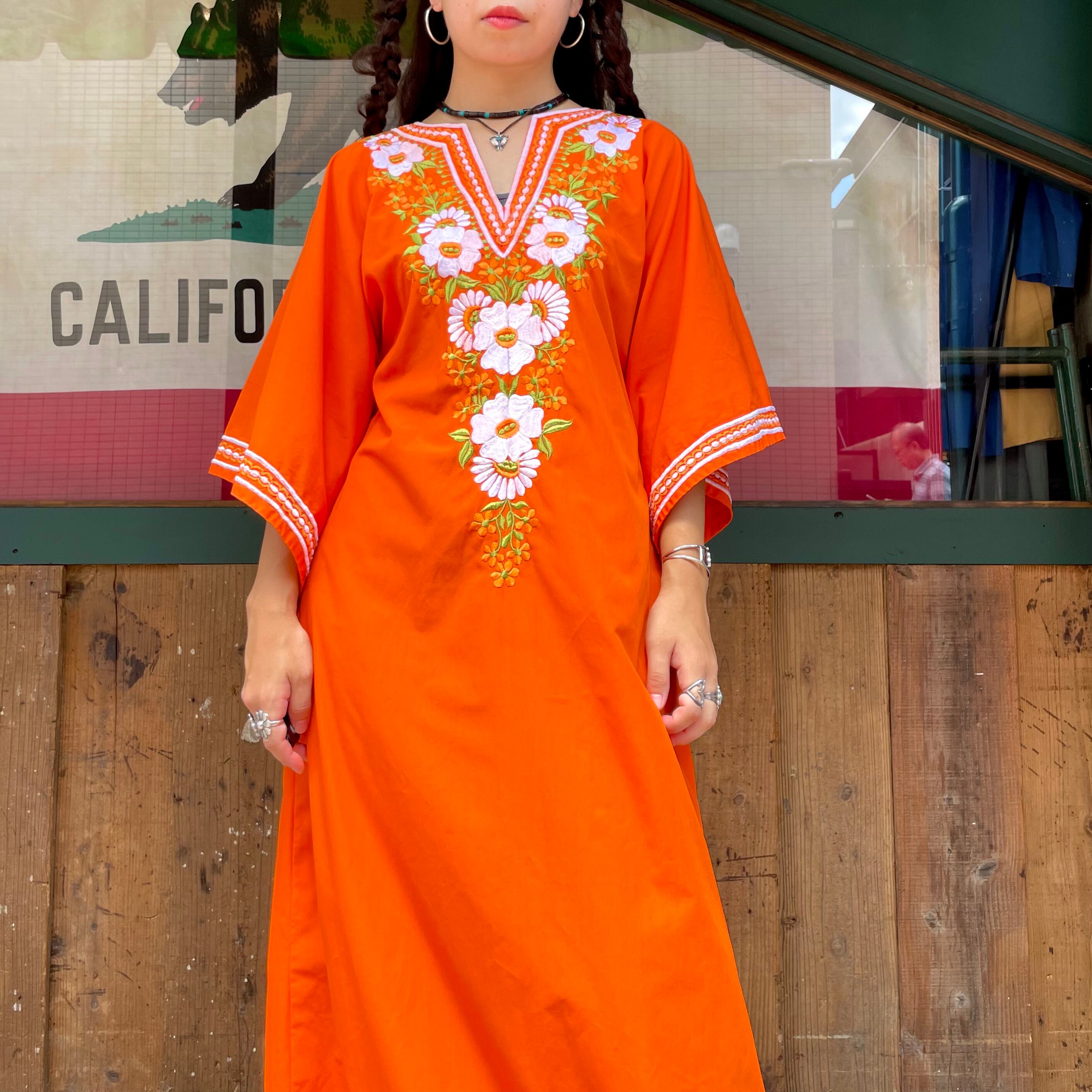 鮮やかなオレンジ色に白いお花の刺繍がとても素敵なワンピースです。
