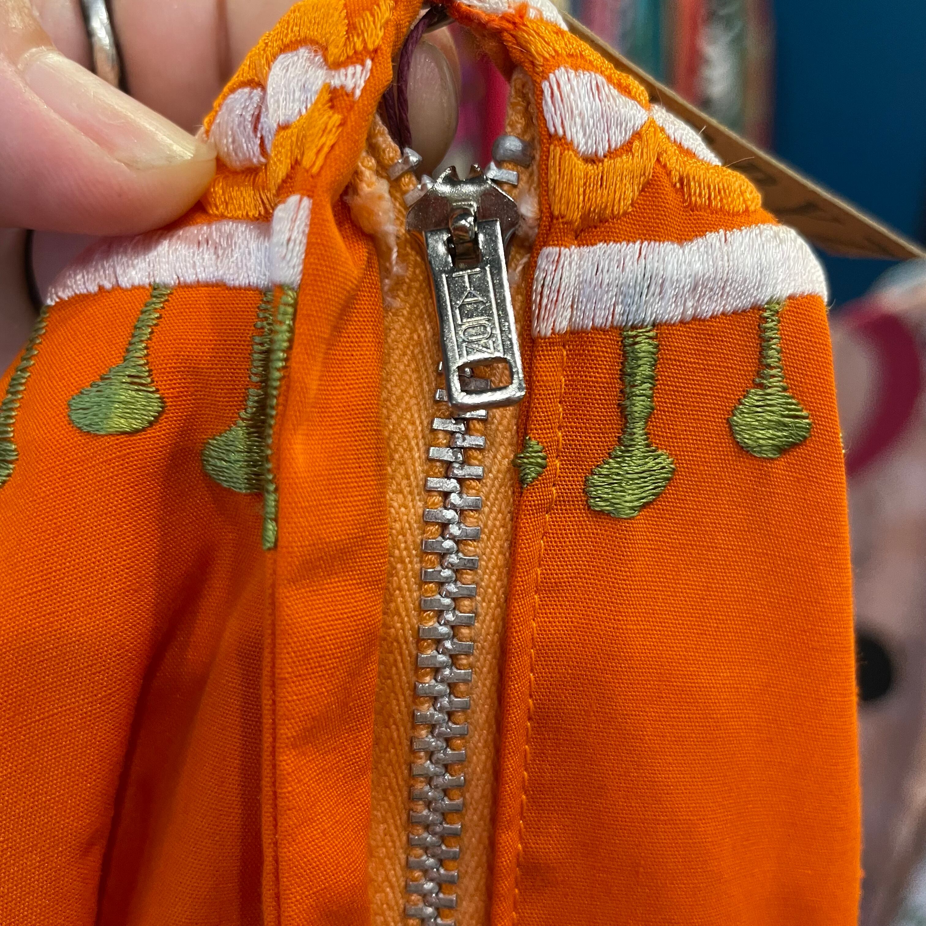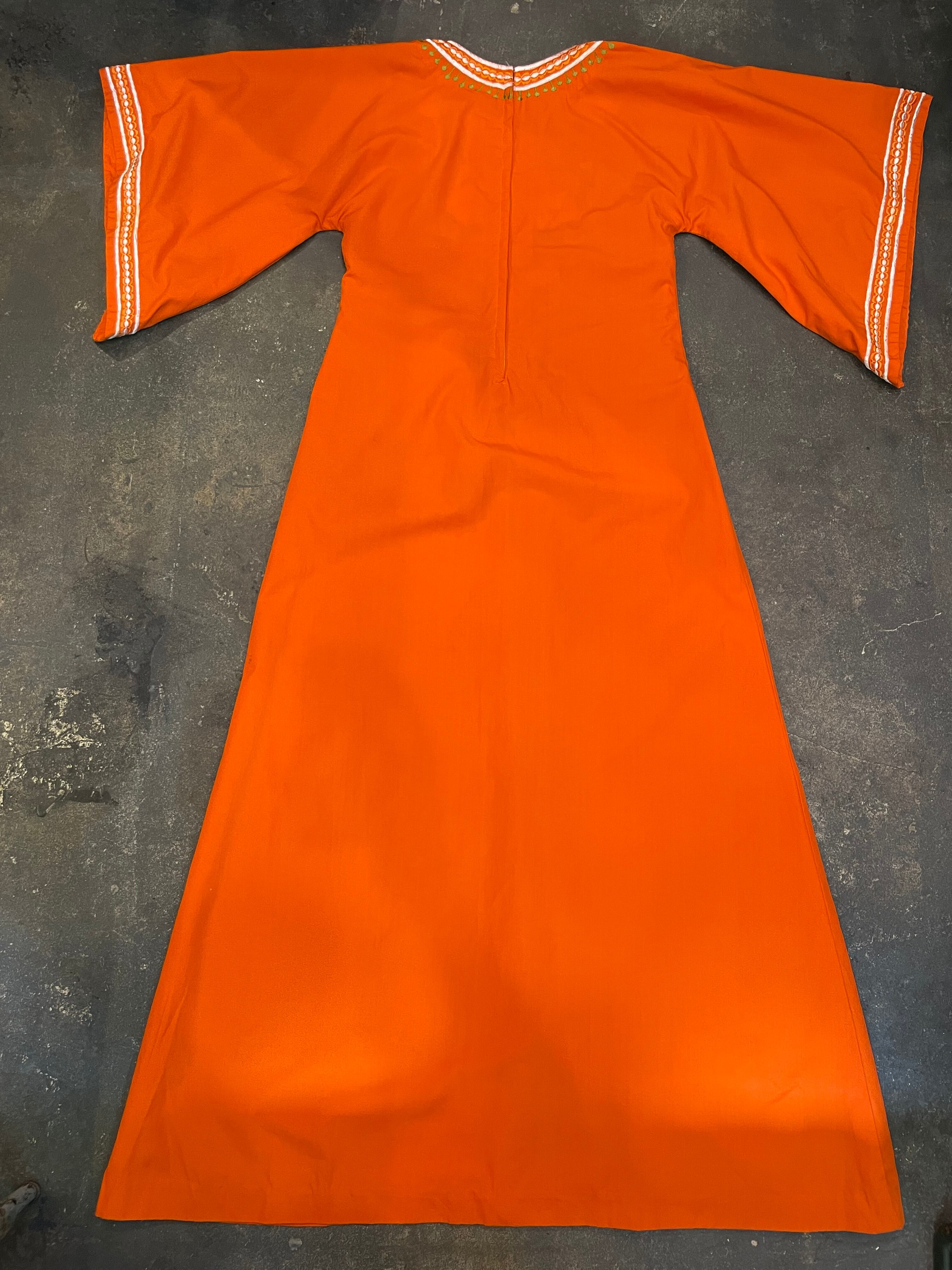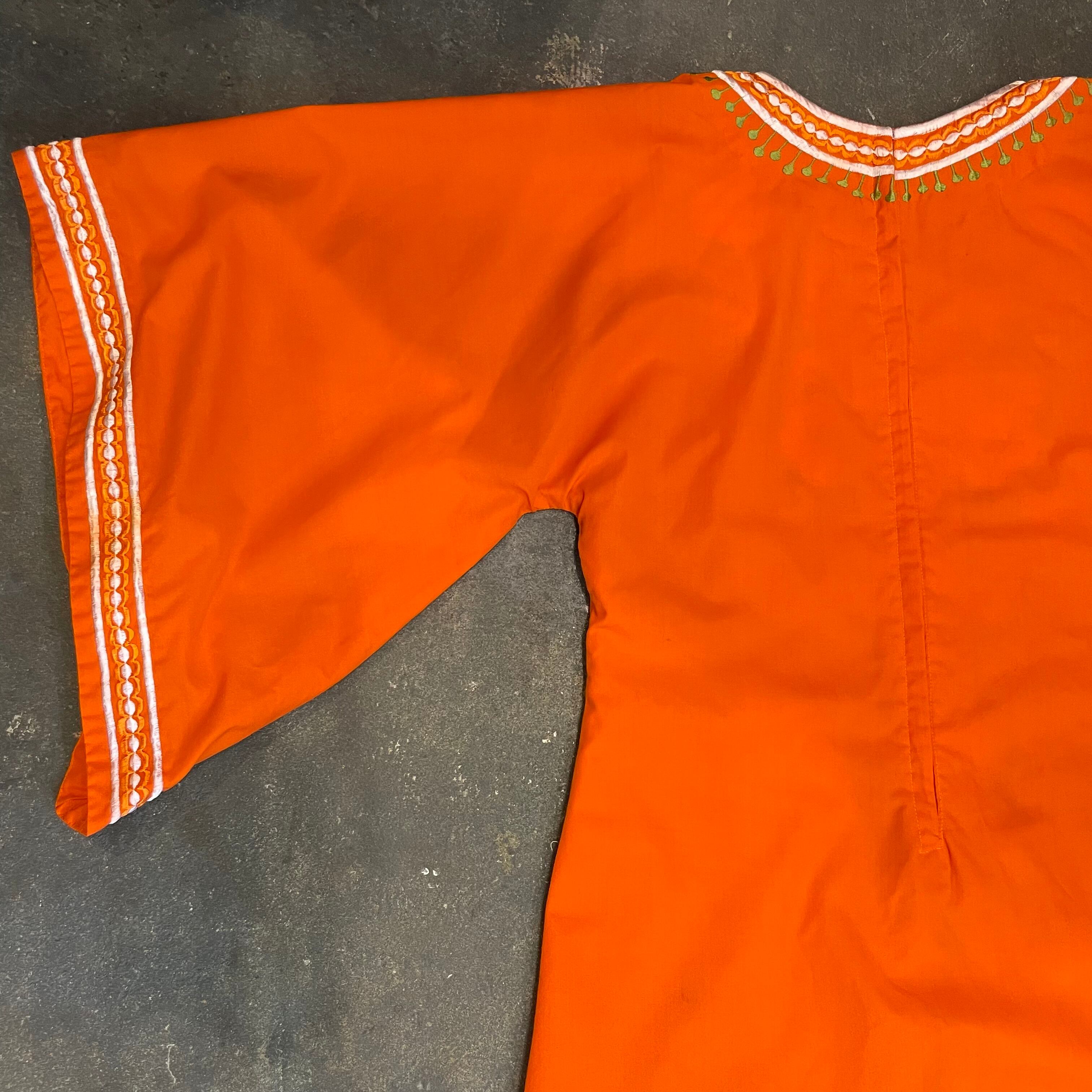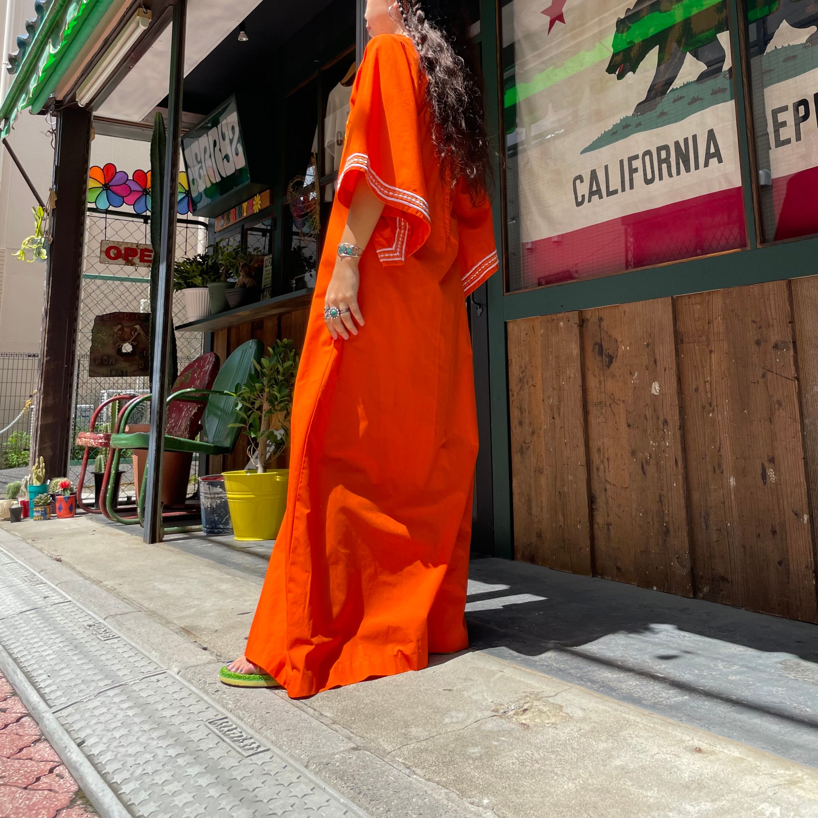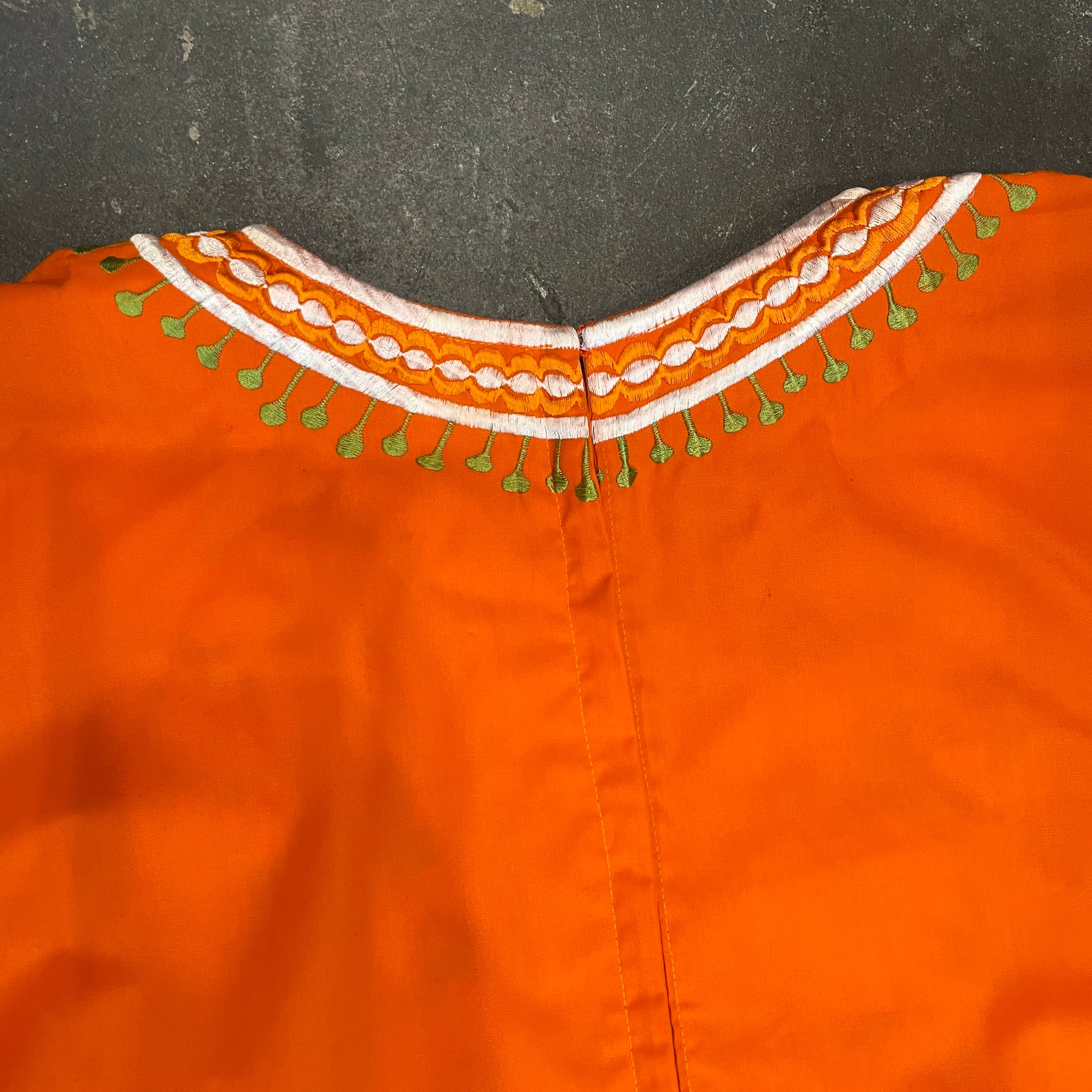 鮮やかなオレンジ色に白いお花の刺繍がとても素敵なワンピースです。