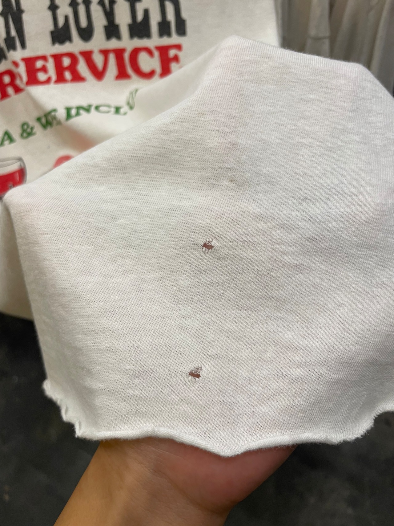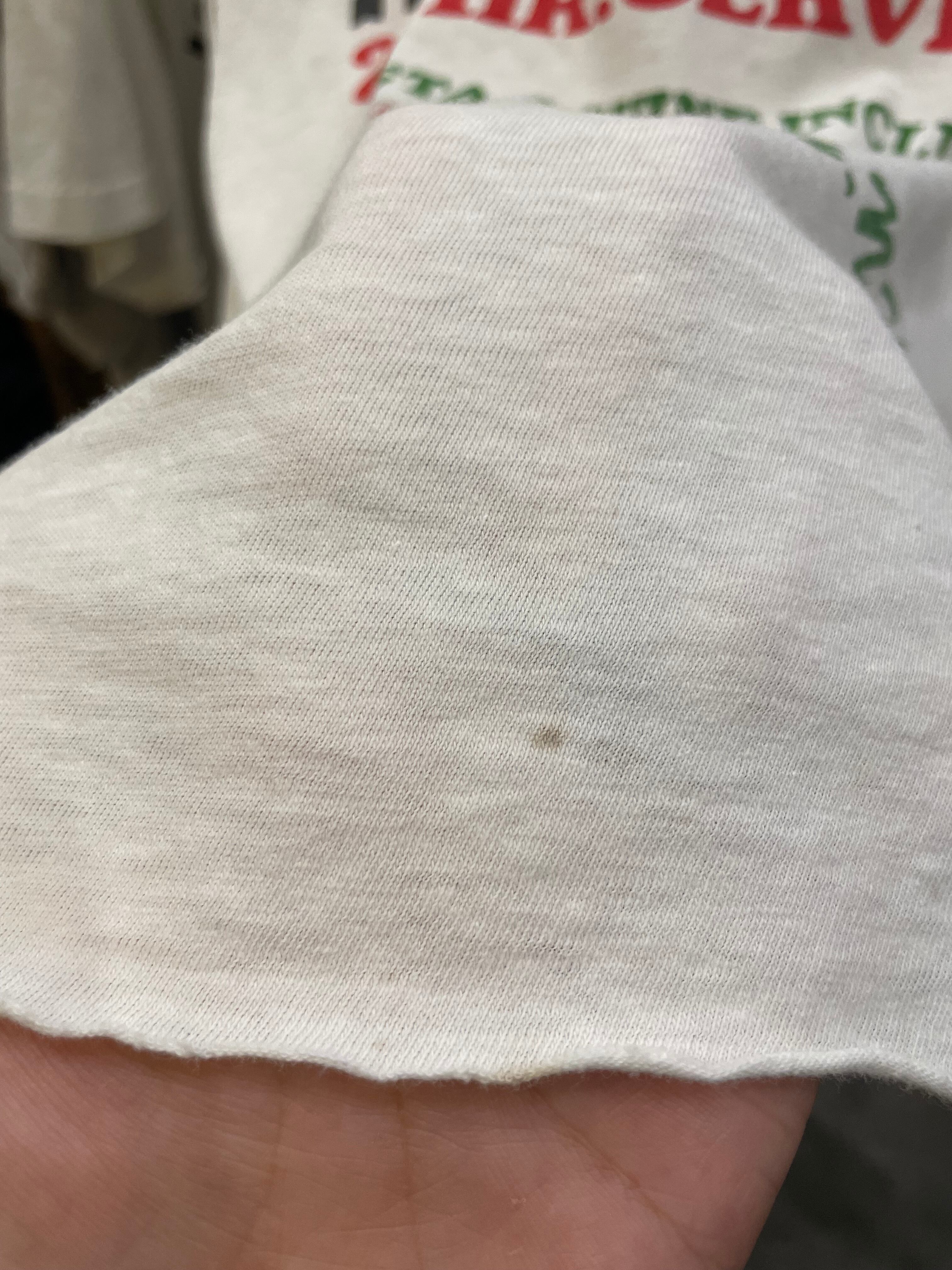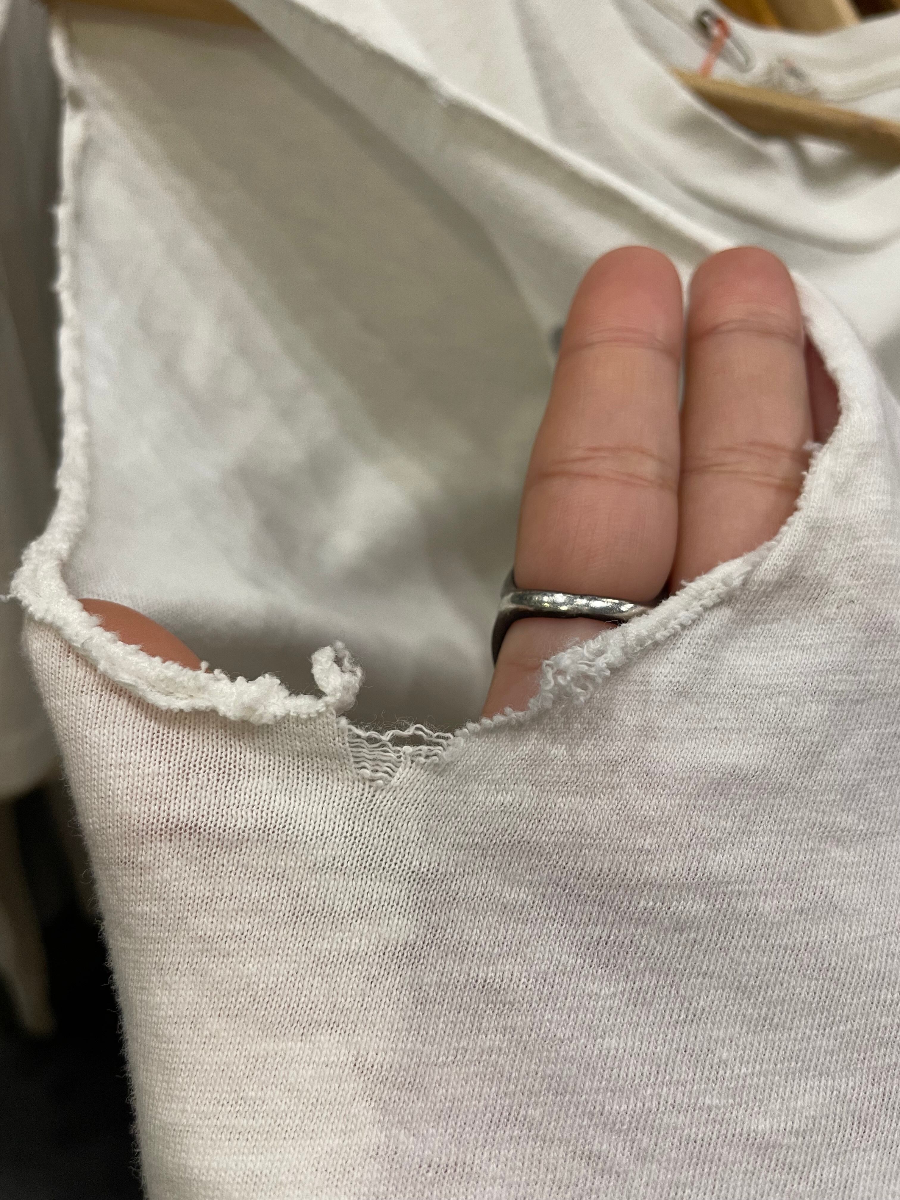 シミやキズ、裾は切りっぱなし、そでぐりはロックミシンがかかっていますが取れたり破れたりしています。