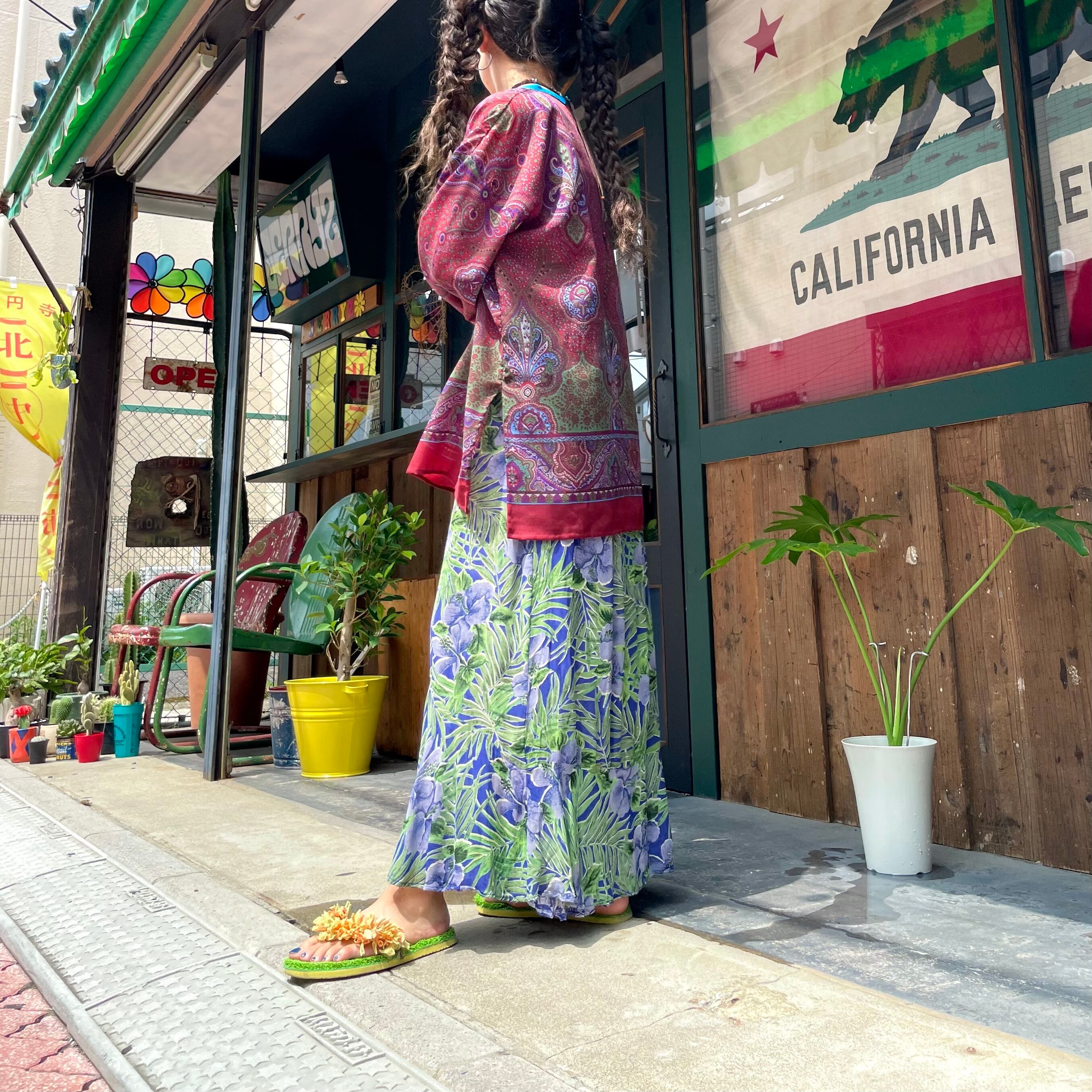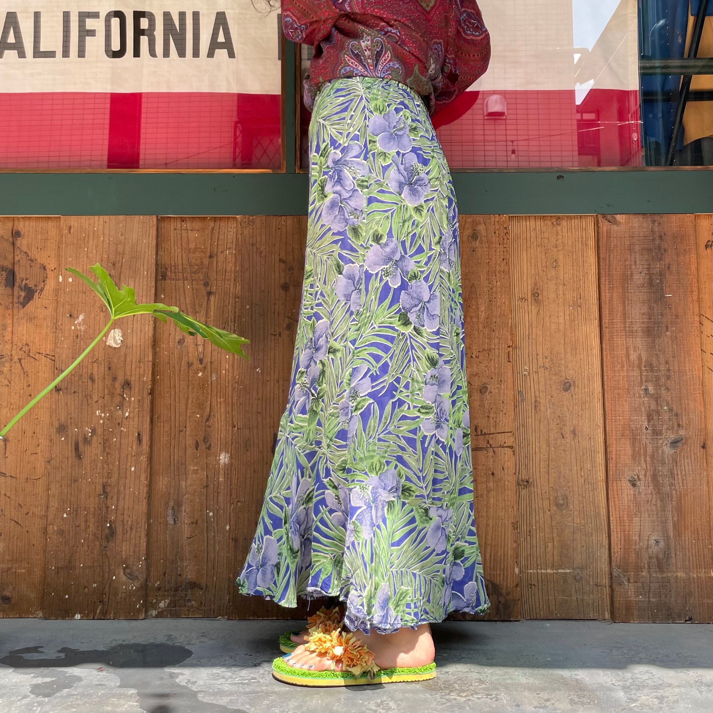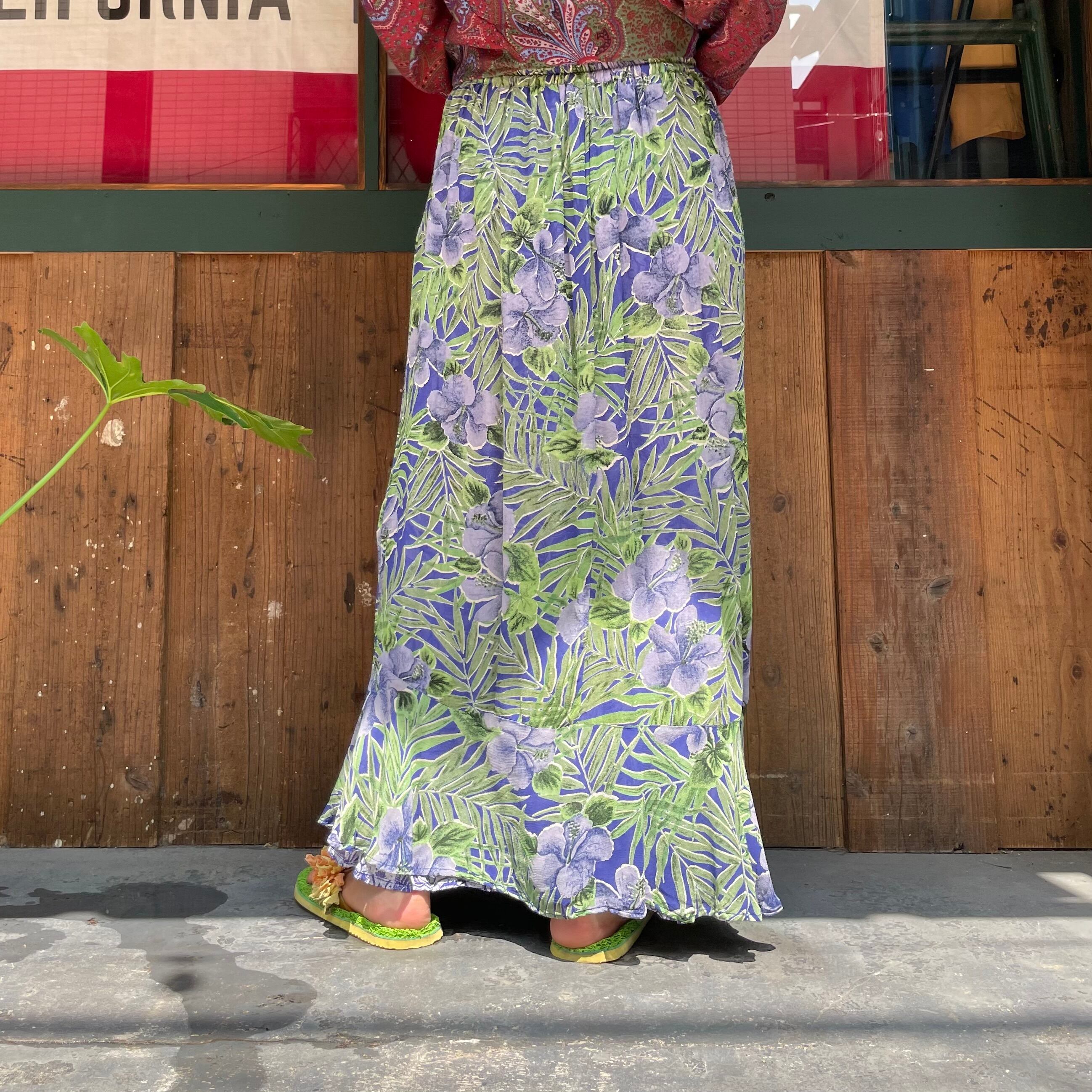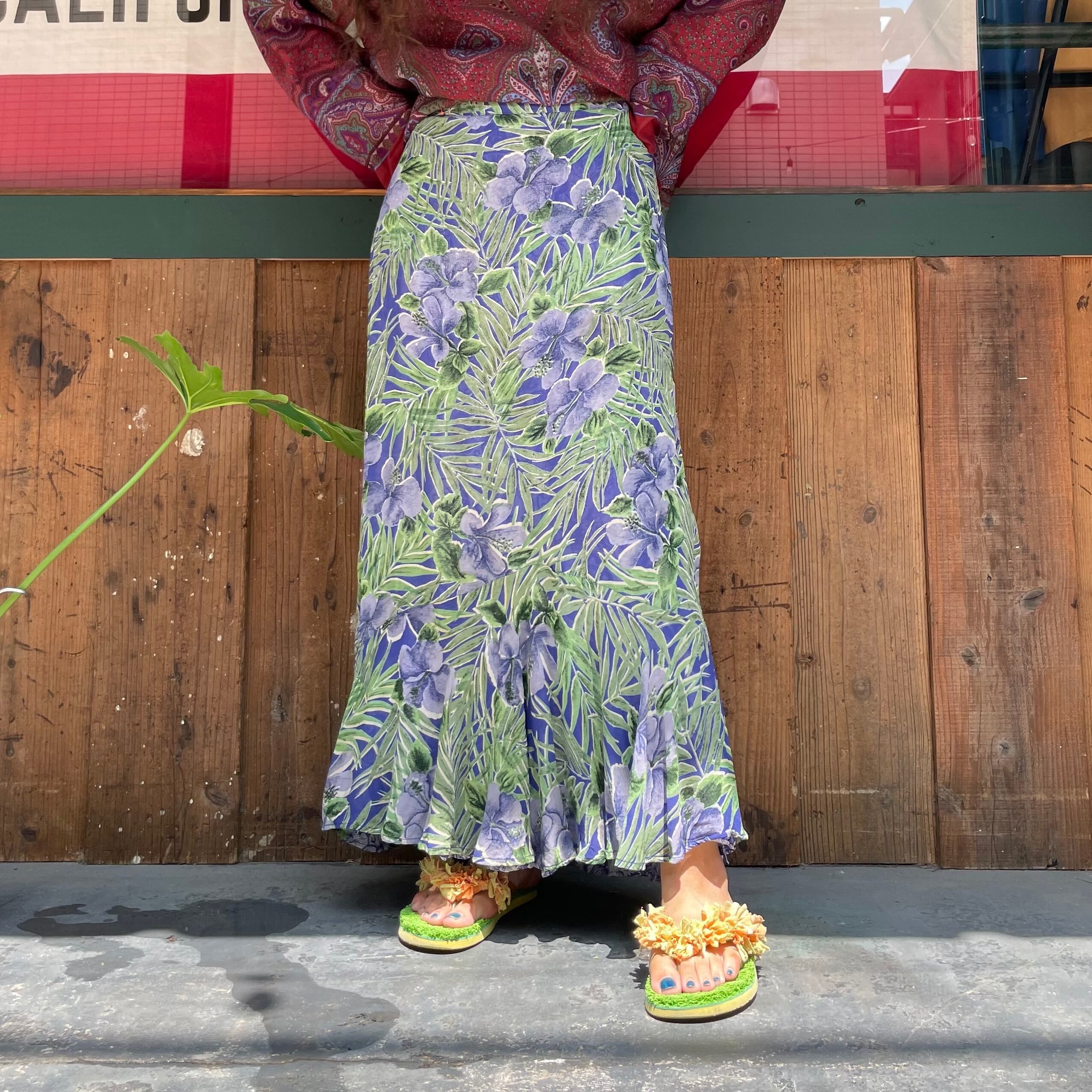 ハイビスカスっぽい雰囲気のお花と南国っぽい植物の柄がかわいいスカートです。