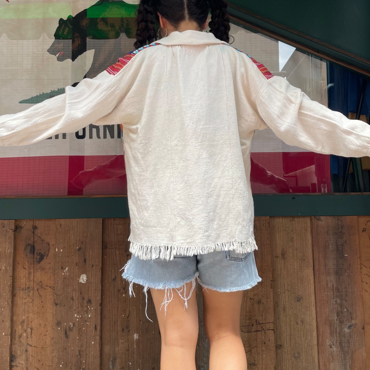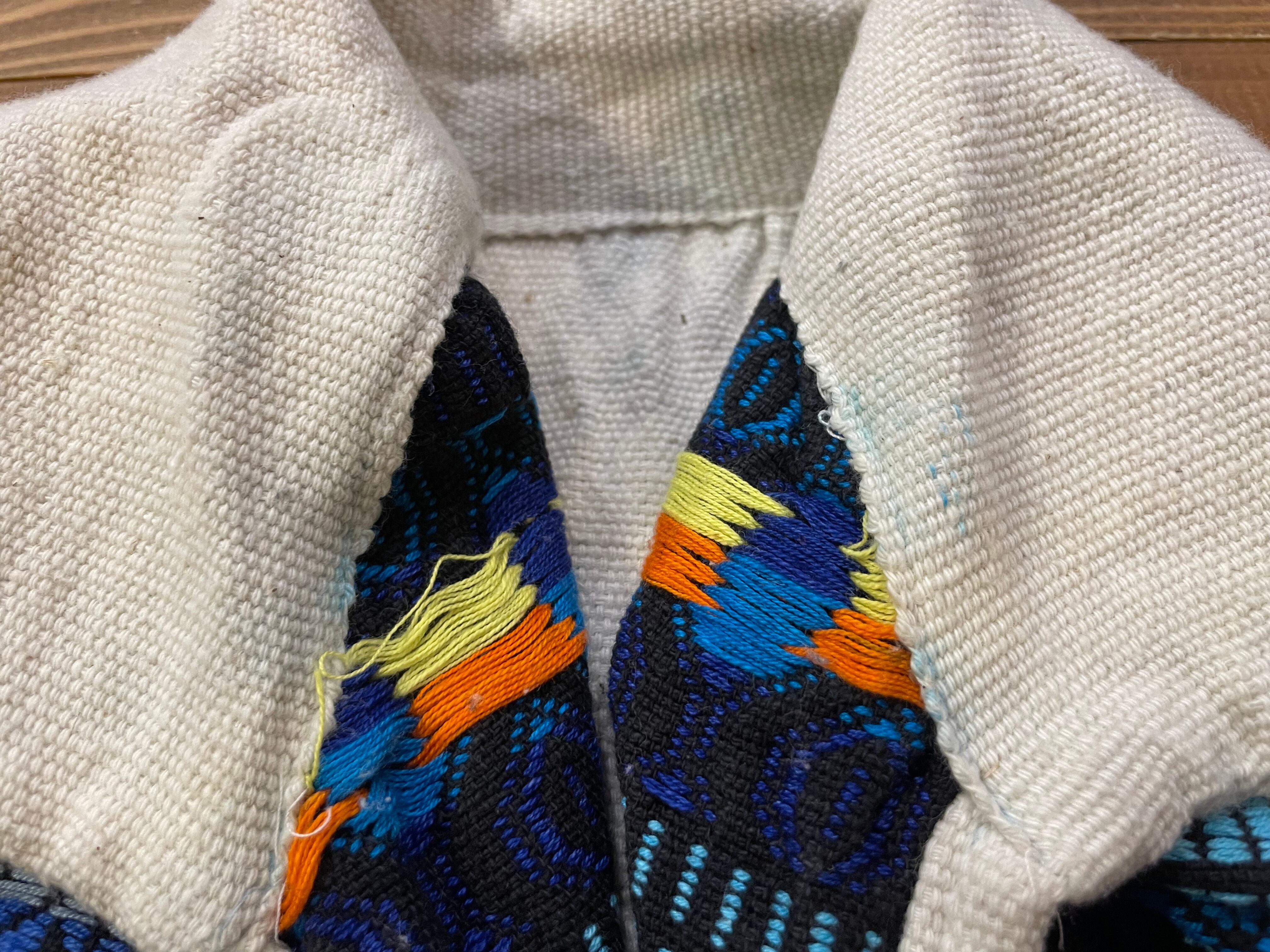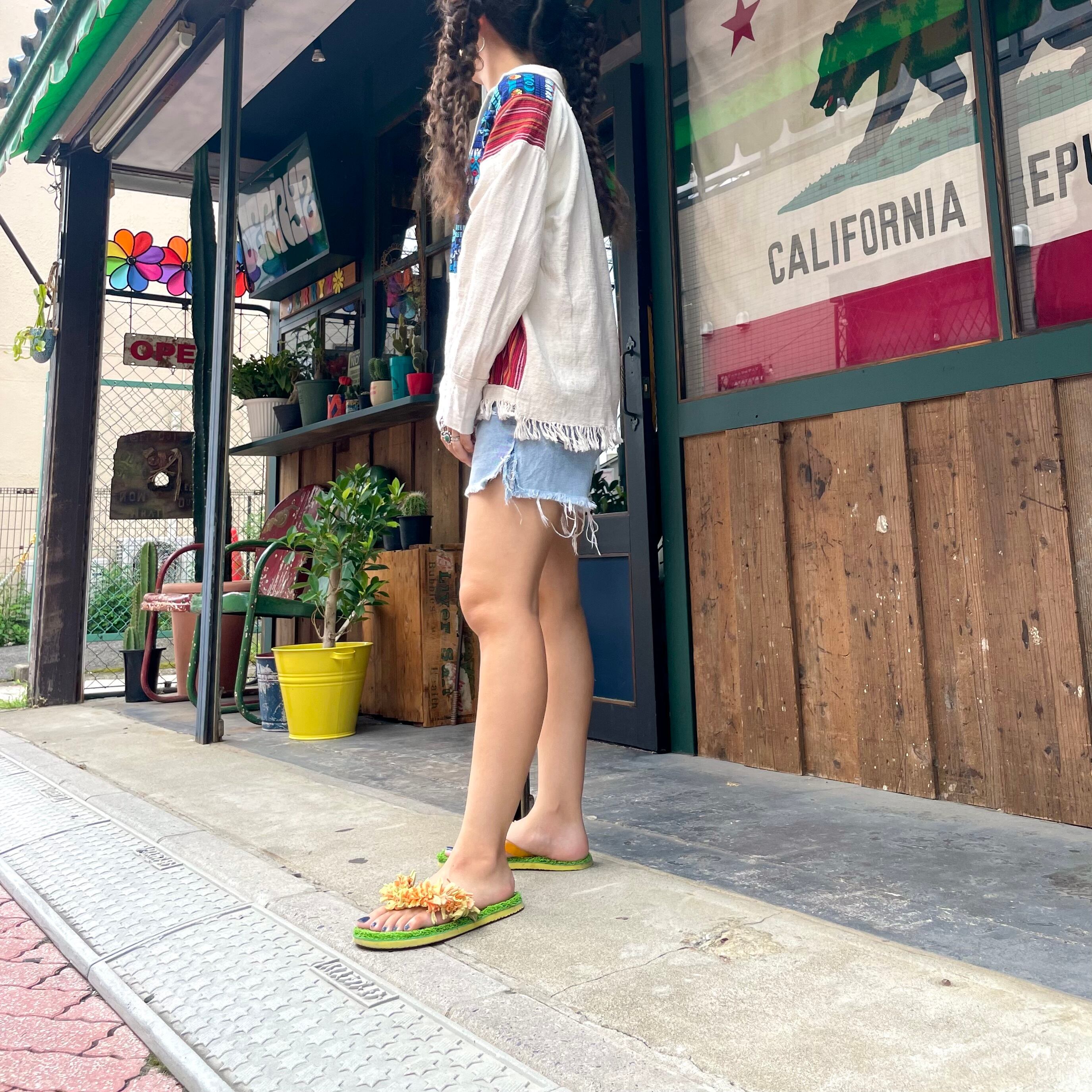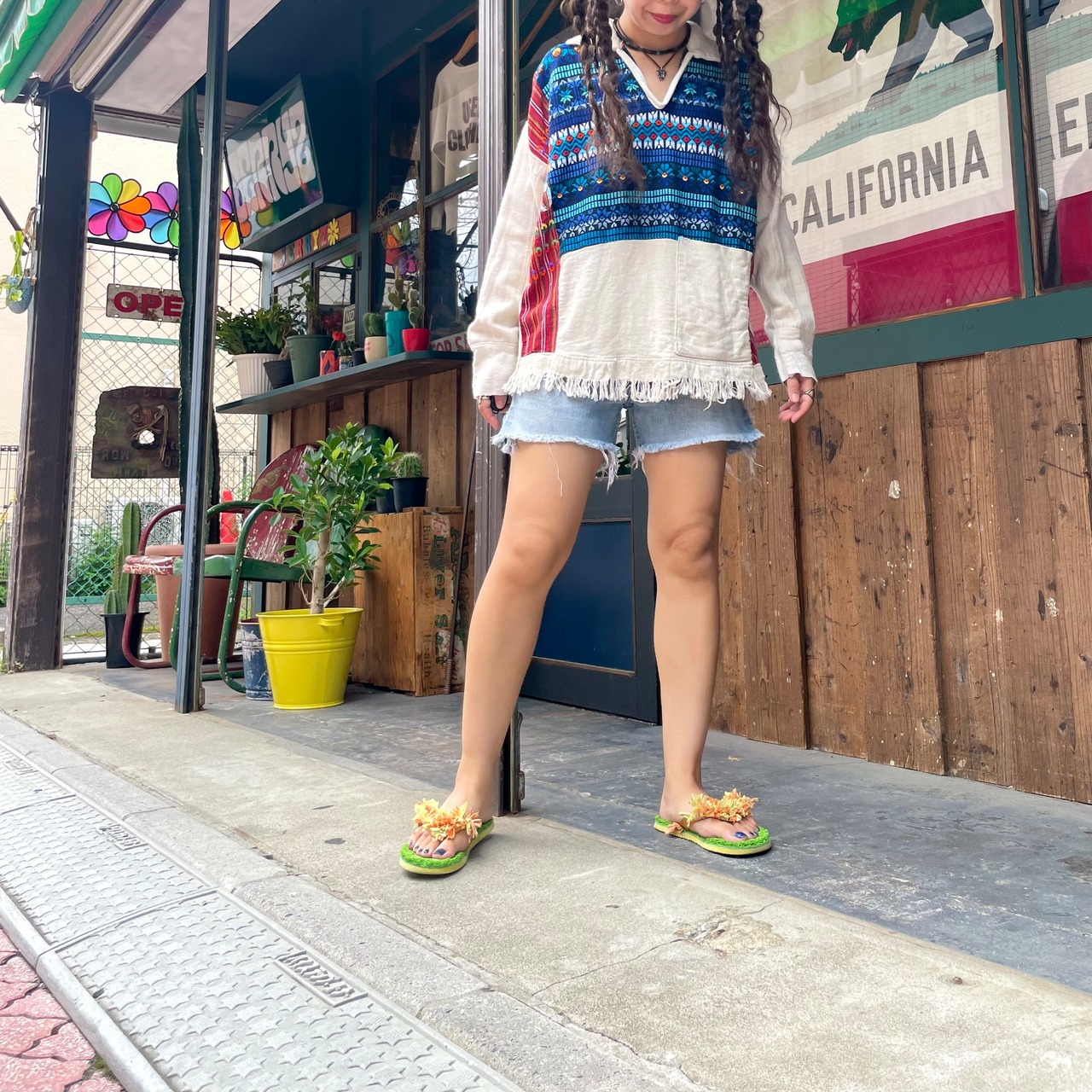 素材はメキシカンパーカーよりは薄手で柔らかく、裾のフリンジや開襟な感じも気の抜けたラフな雰囲気が魅力的です。