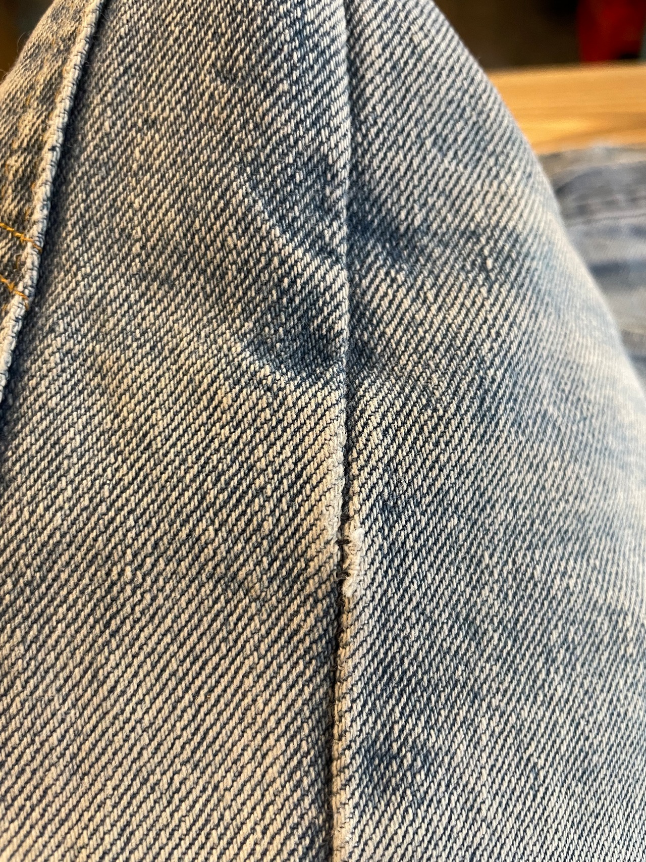 長すぎず、短すぎずな丈感にカットされた切りっぱなし感が良いですし、サイドもスリットのようにカットしてあり、雰囲気のある色落ちで良い感じの一本です。