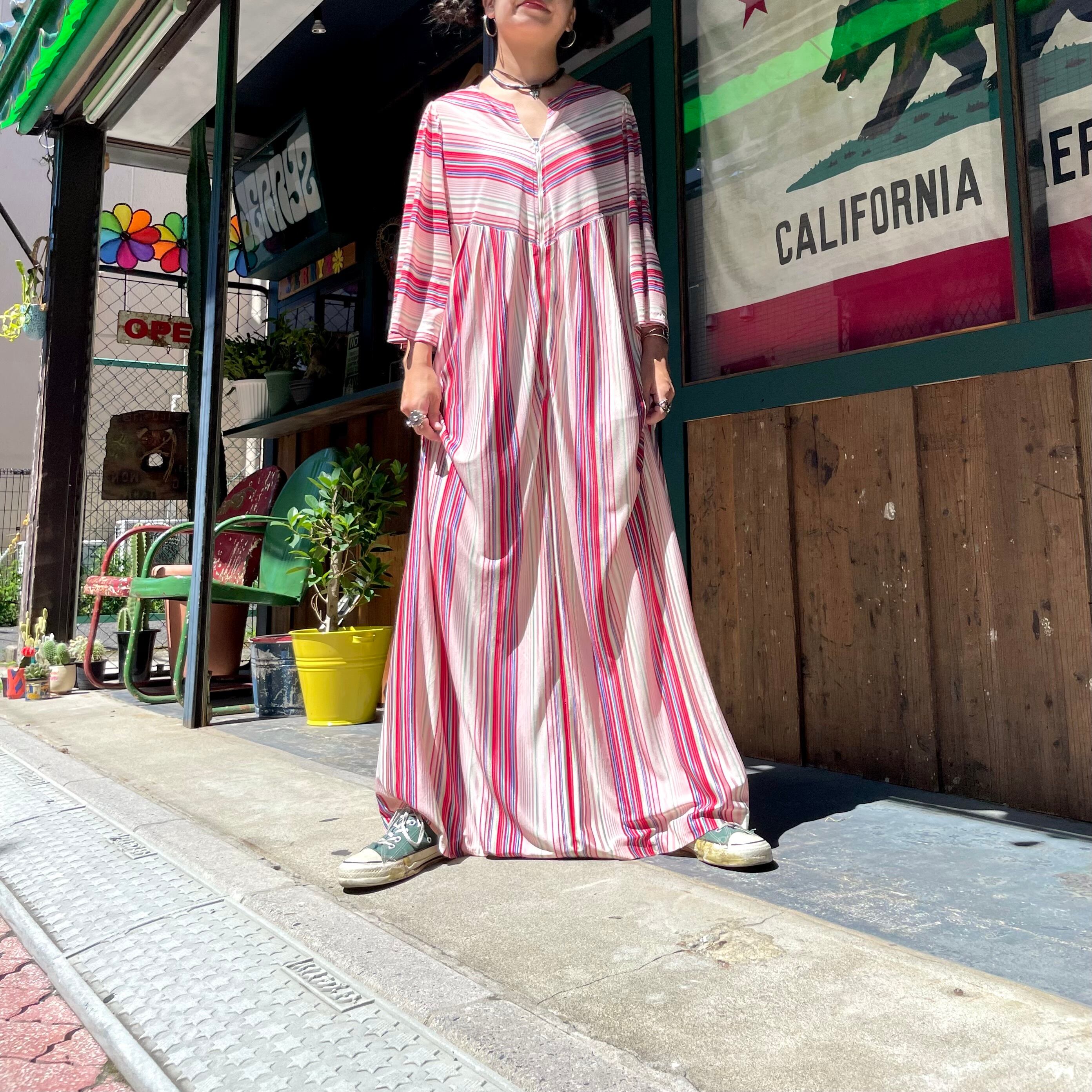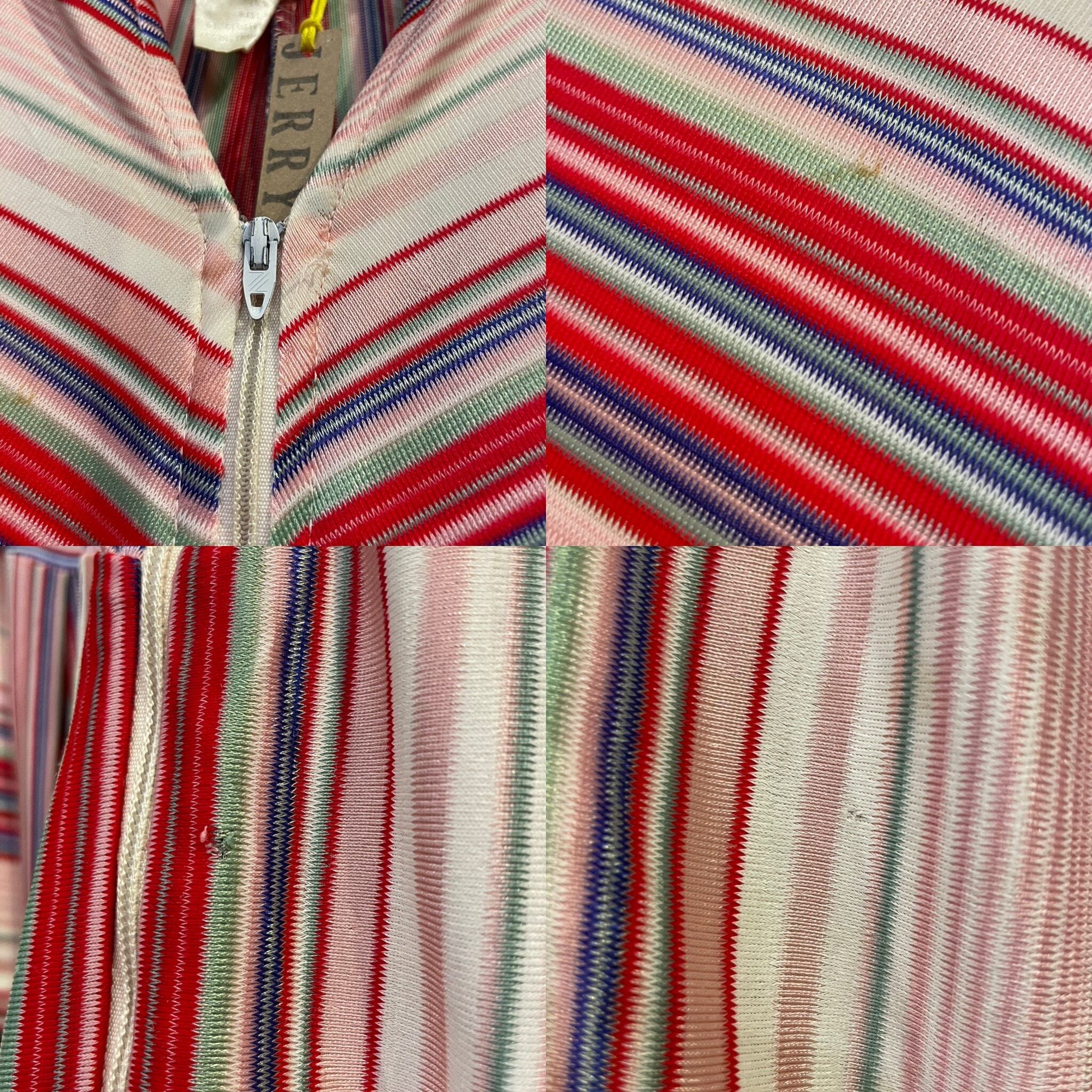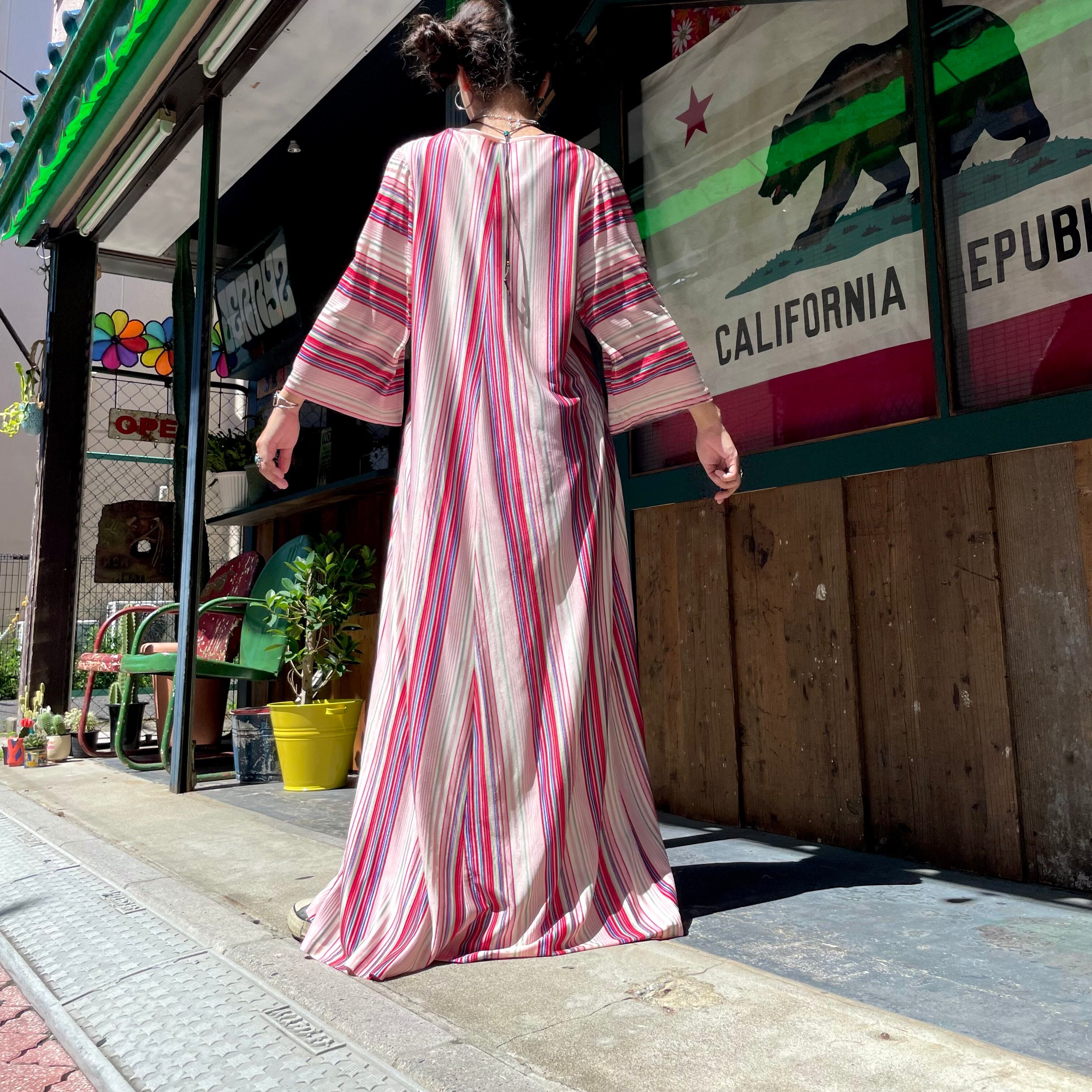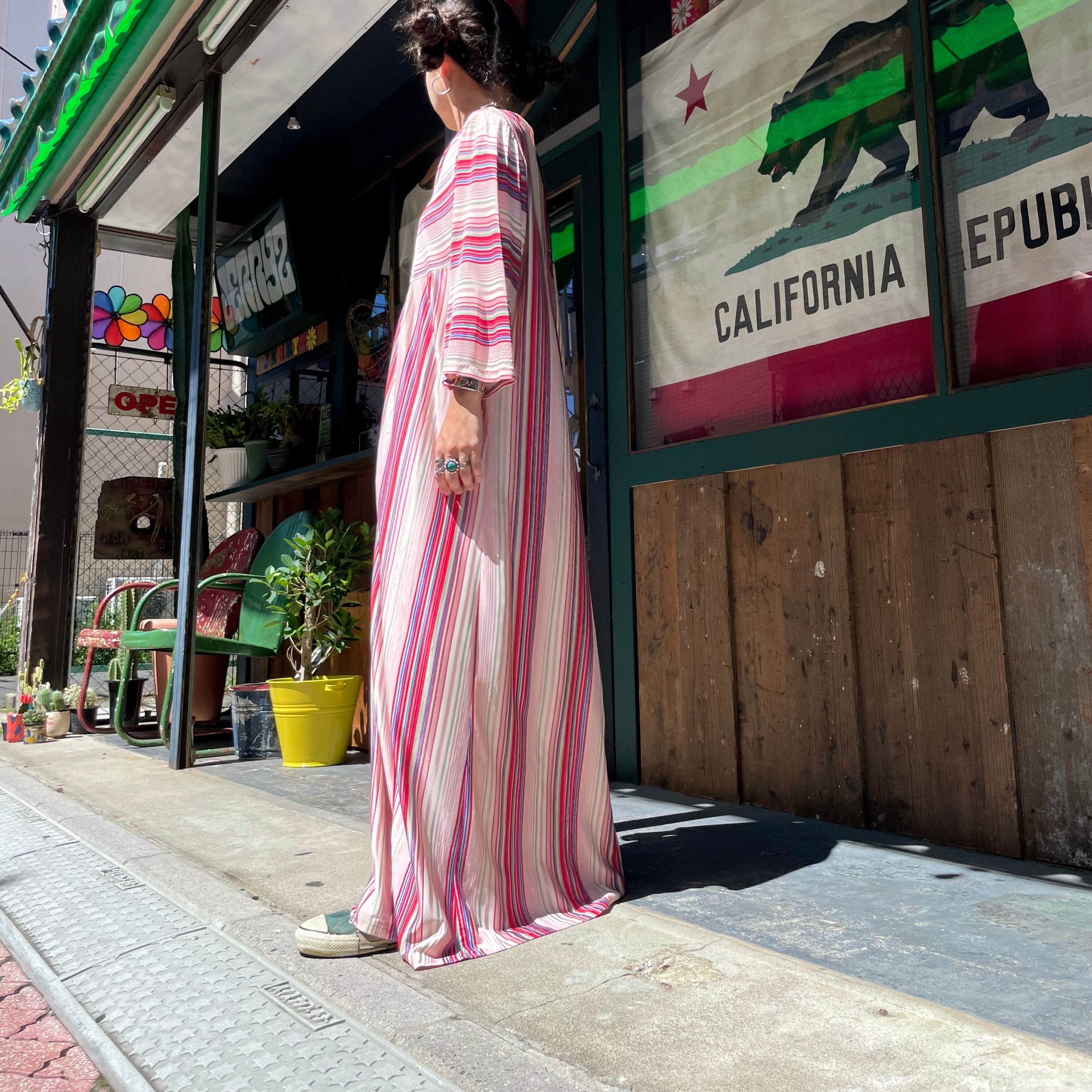 ヘビーピンクに赤などのストライプがかわいい70年代のワンピースです。