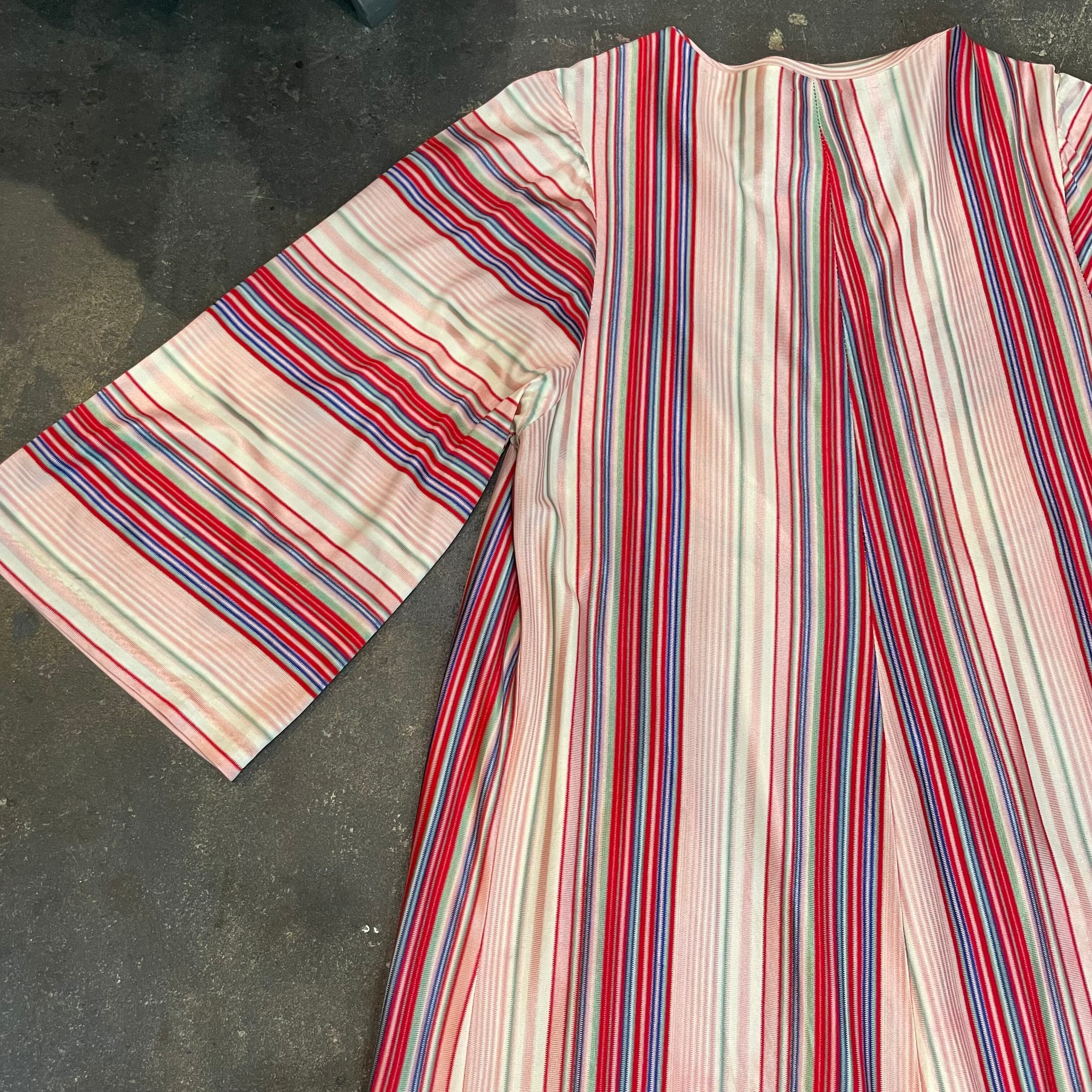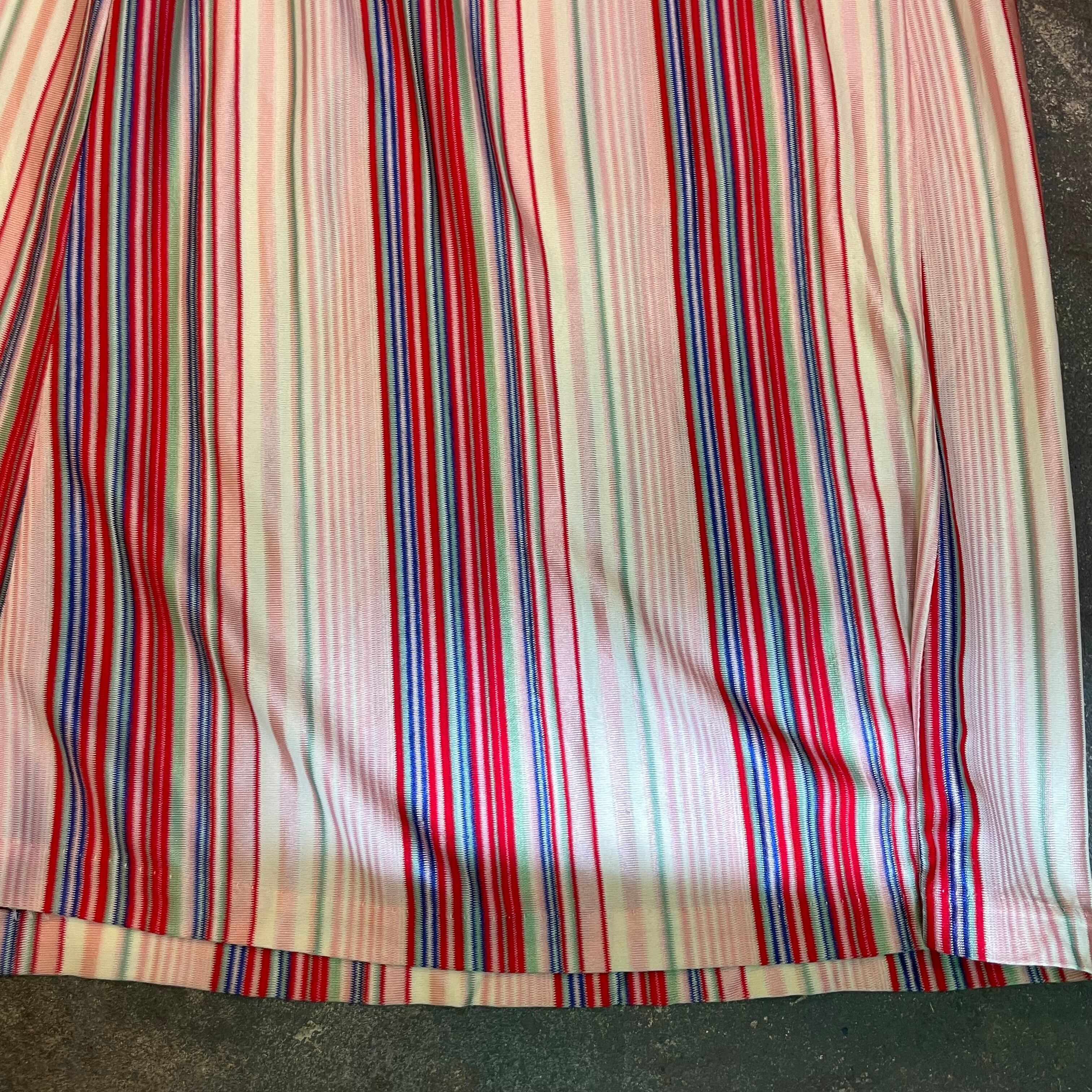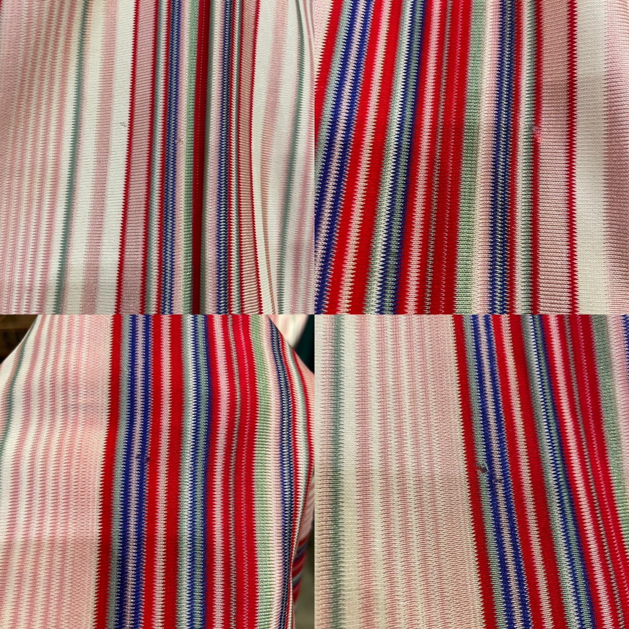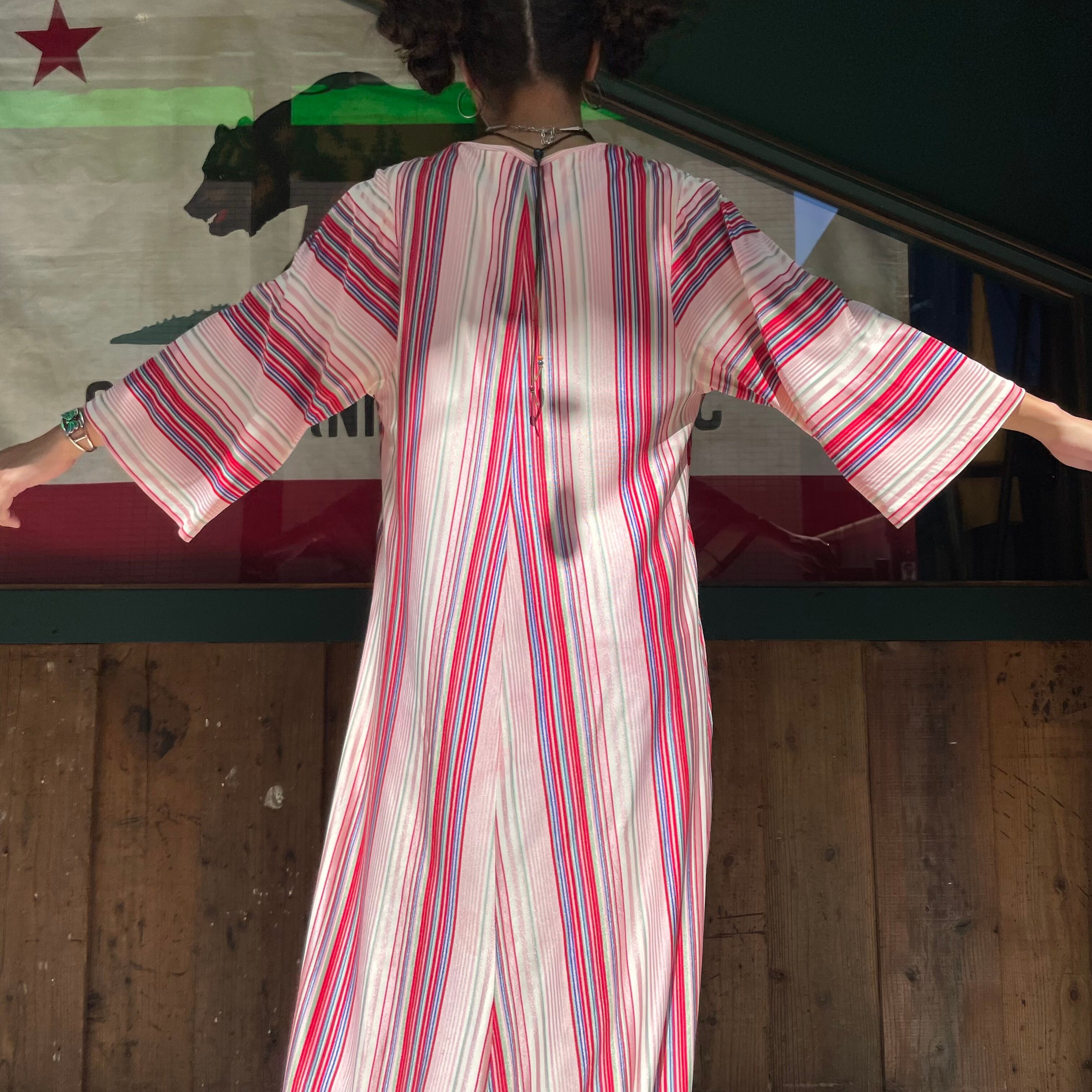 ヘビーピンクに赤などのストライプがかわいい70年代のワンピースです。
