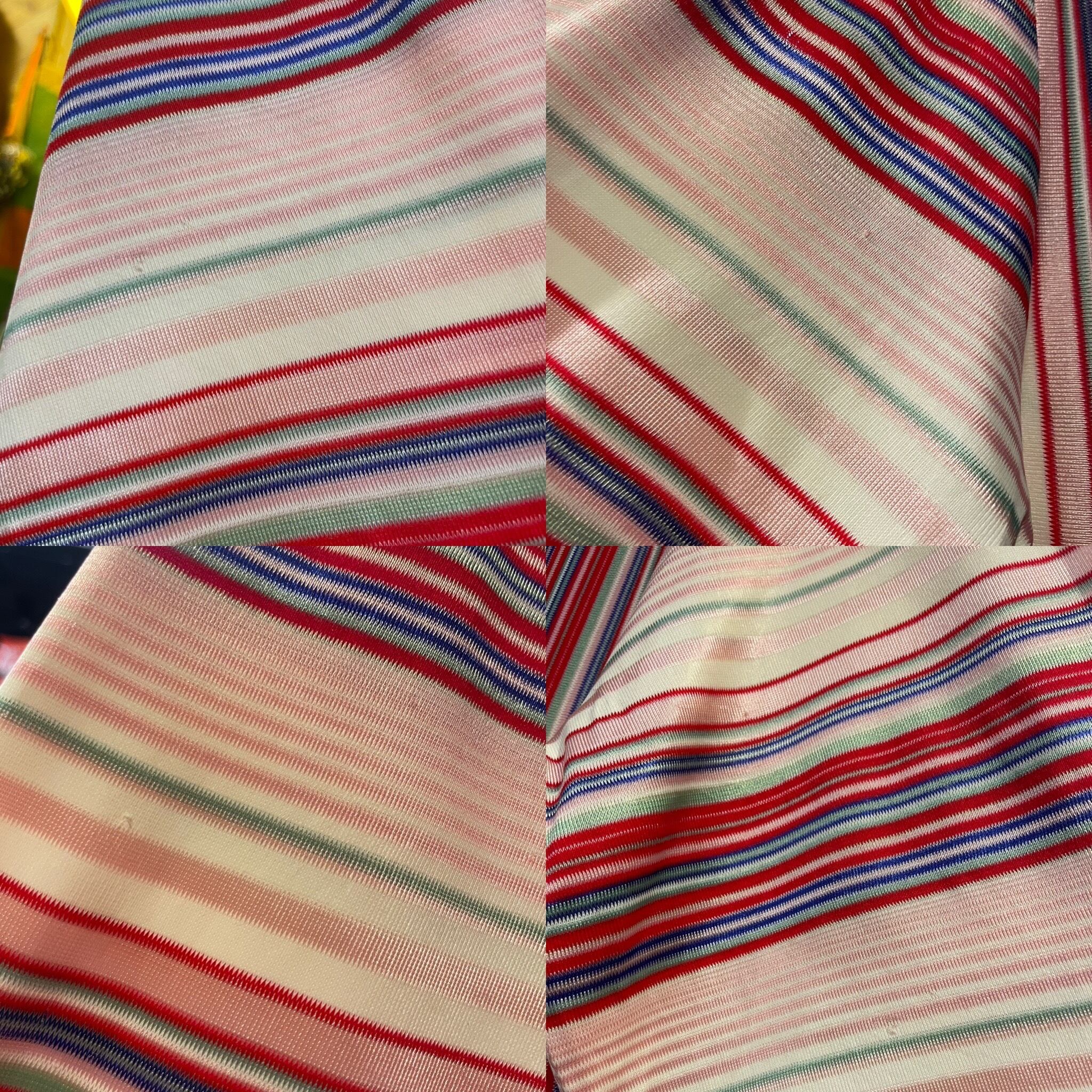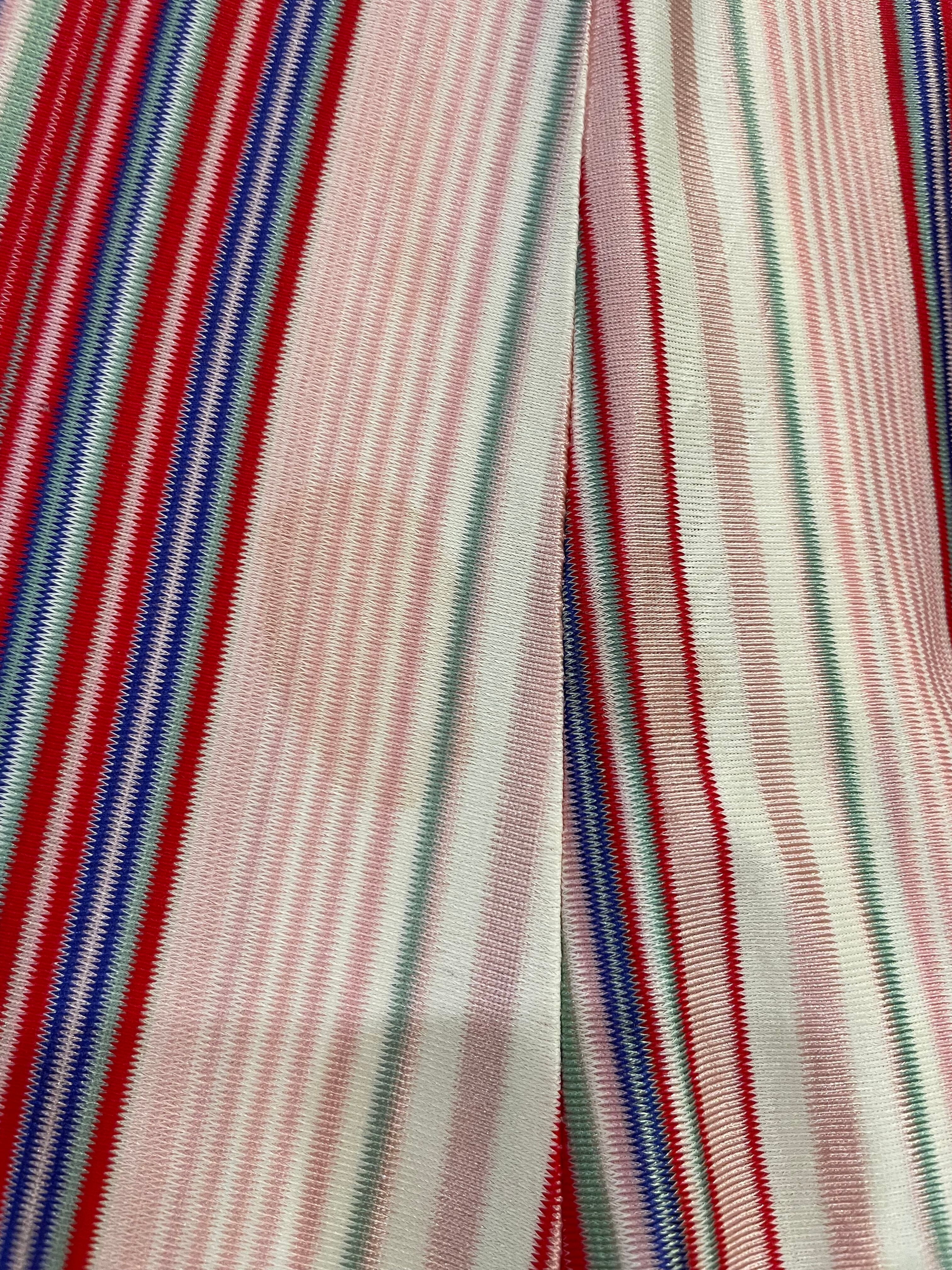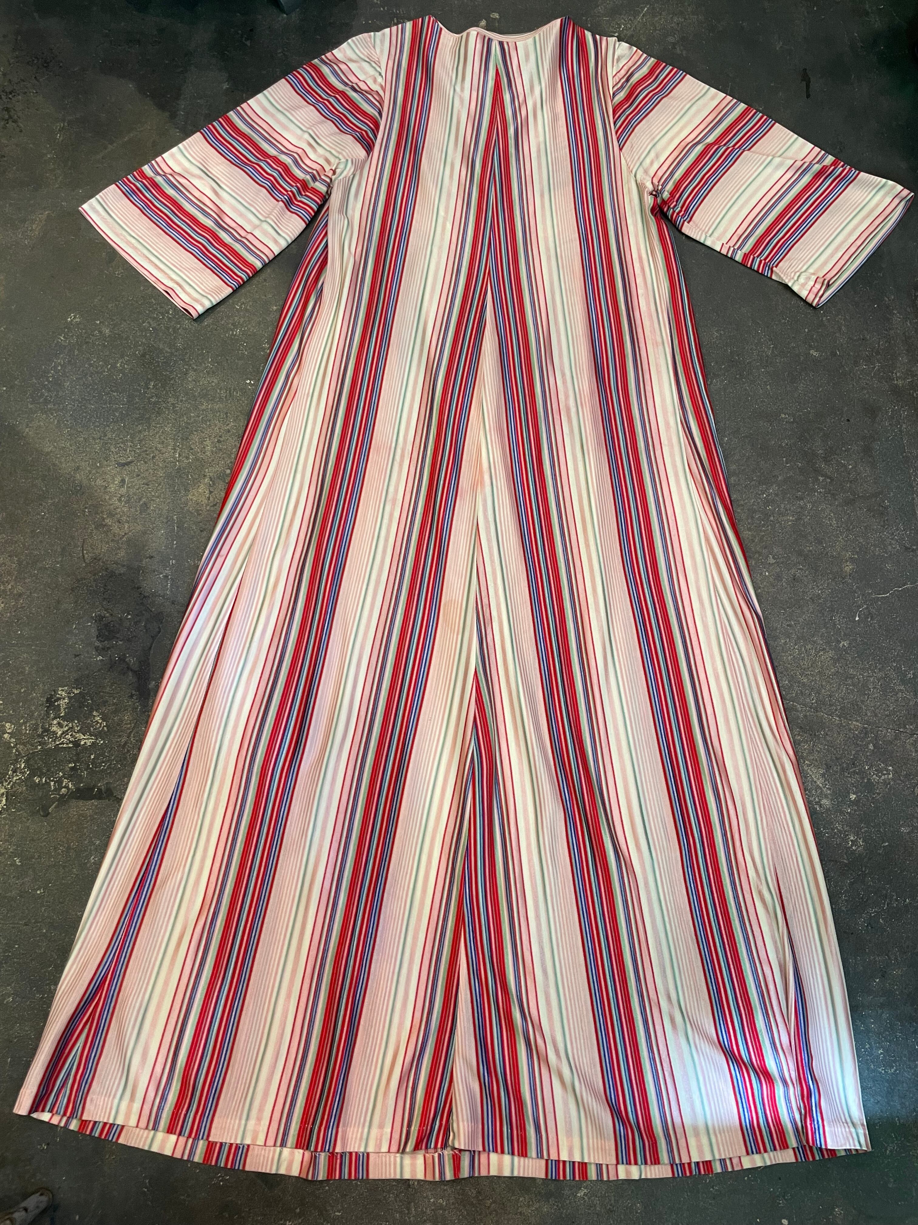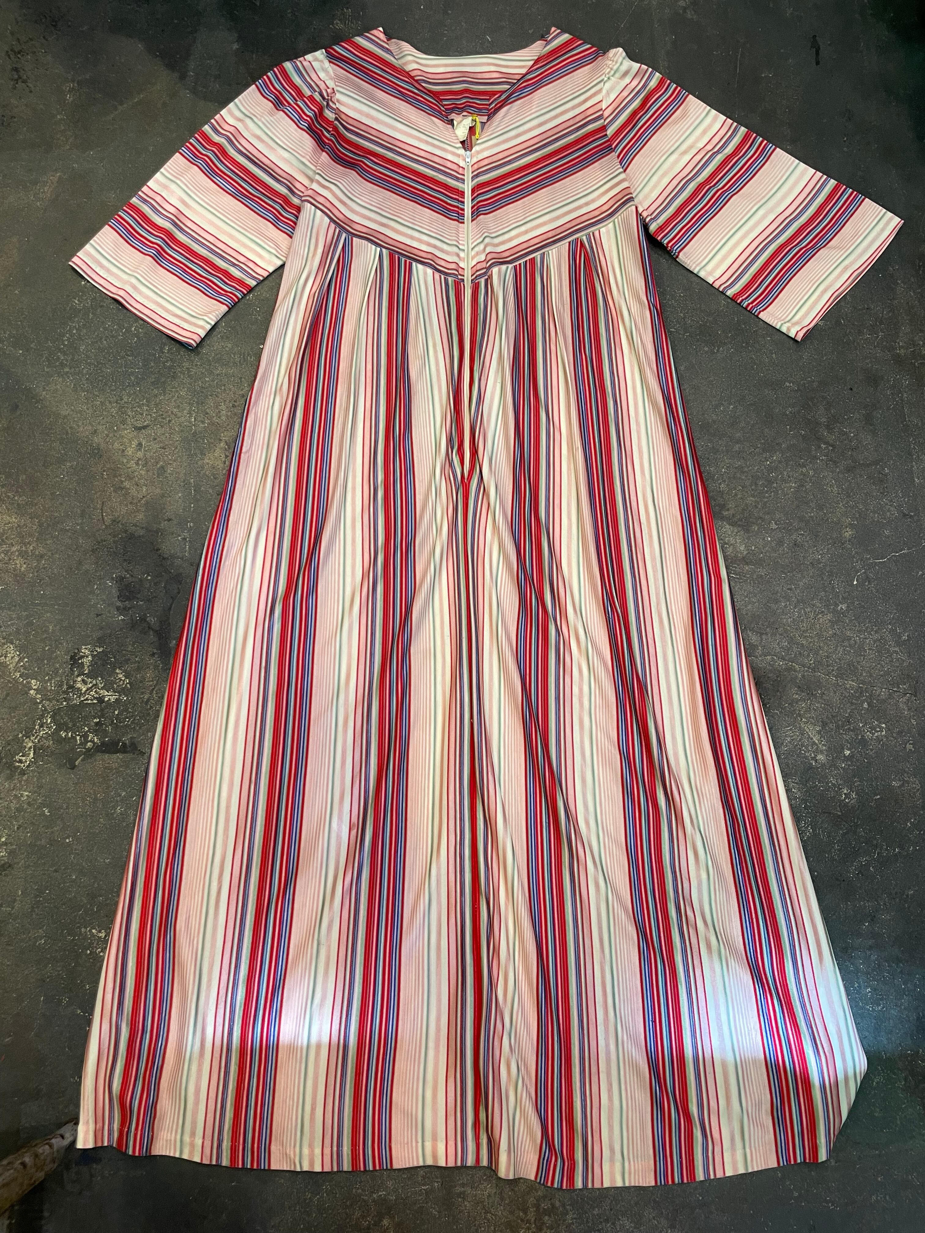 ヘビーピンクに赤などのストライプがかわいい70年代のワンピースです。