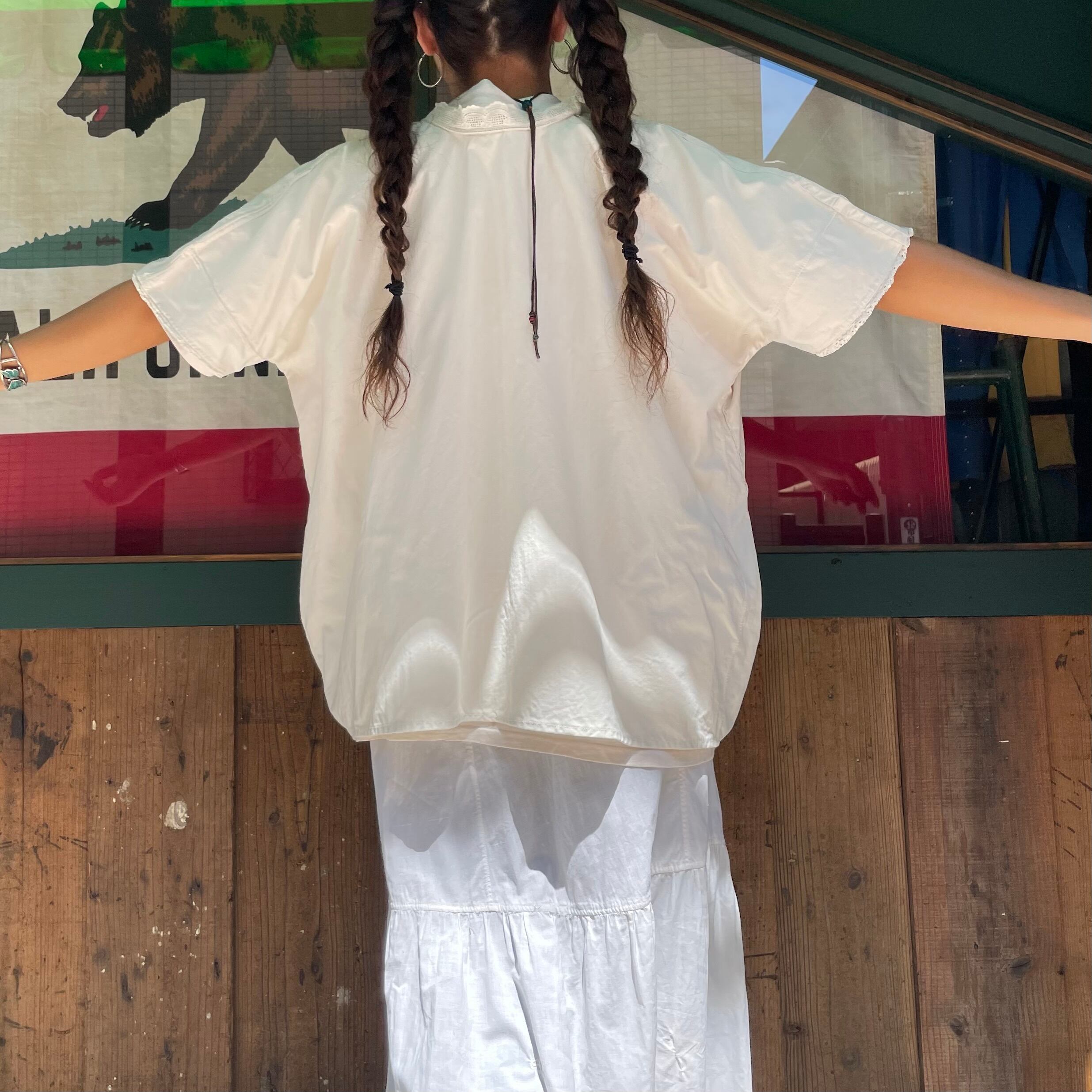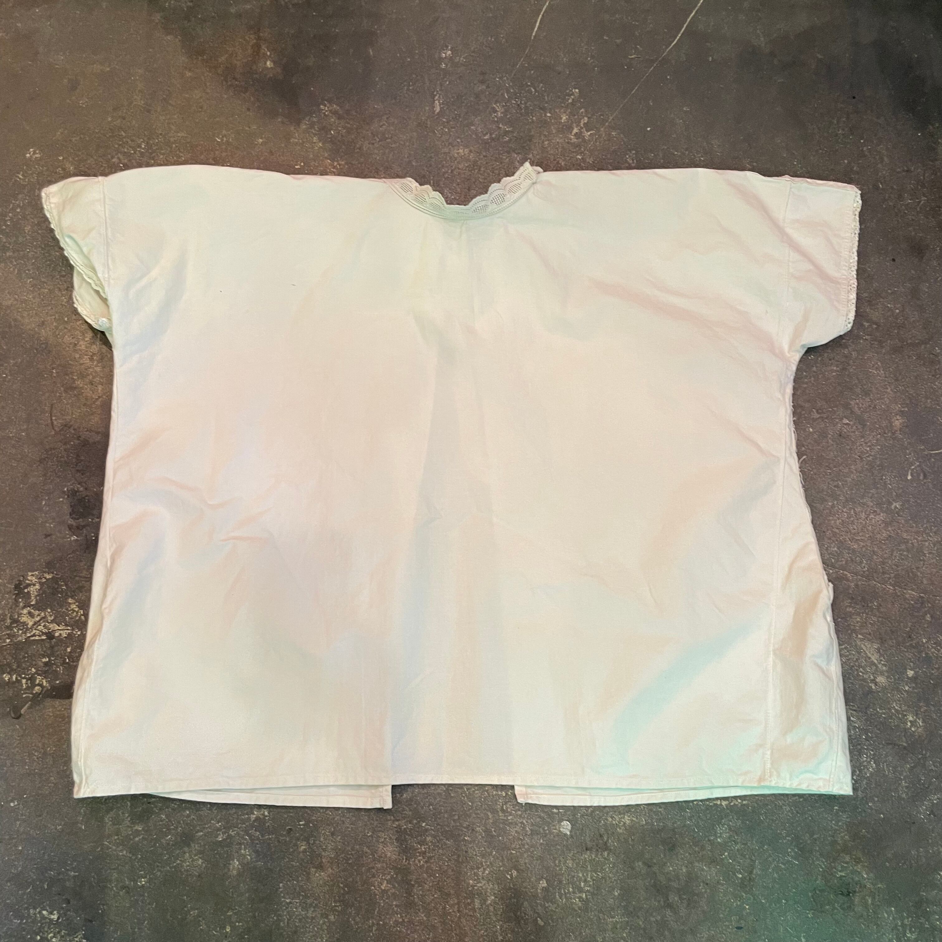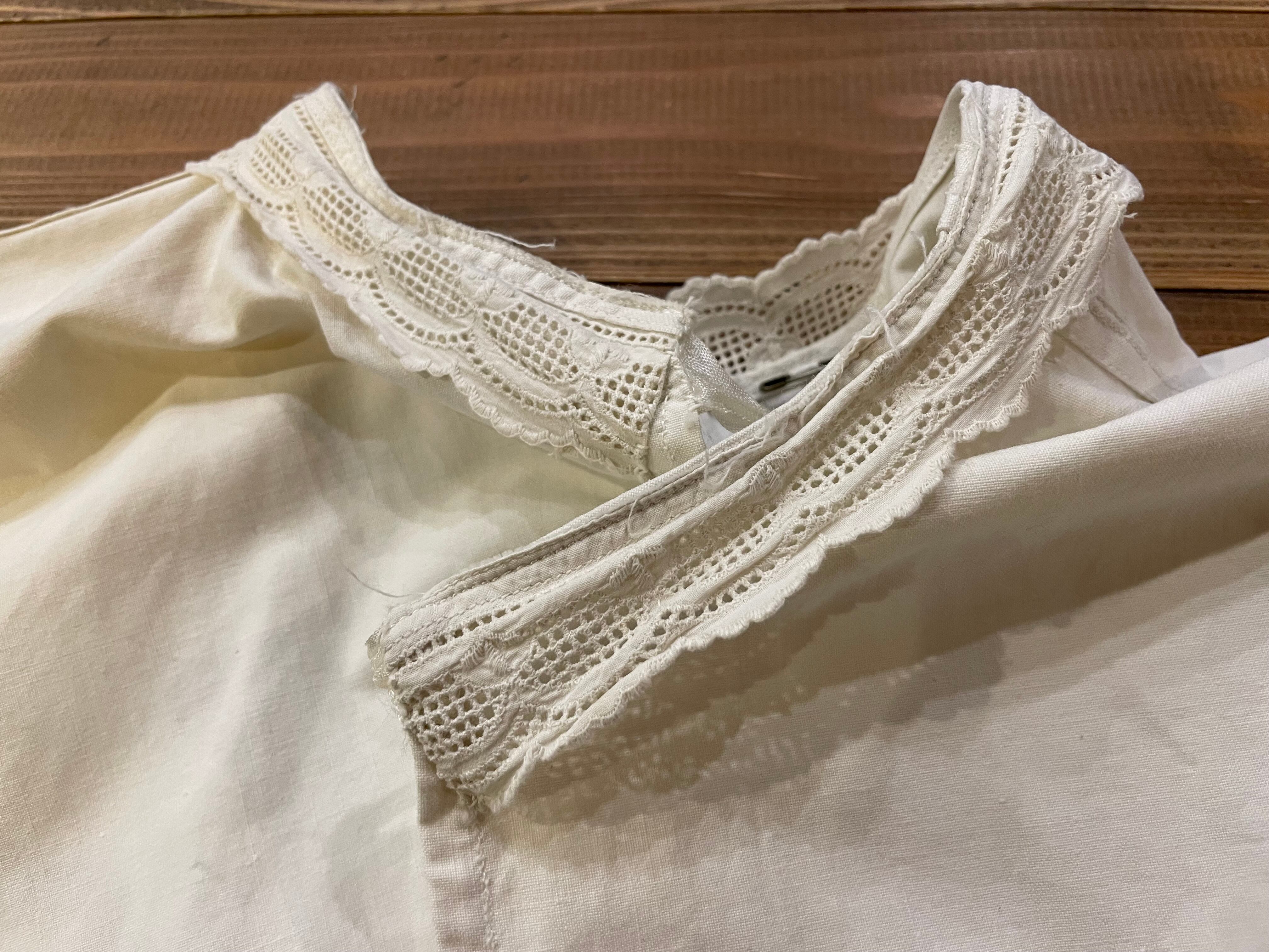 背中に黄色い点々としたシミ、黒いシミ、袖や脇のリメイク感、襟のレースの収まらなさ等、ダメージのある商品ですのハンドメイドや古着にご理解のある方のご購入をお願い致します。