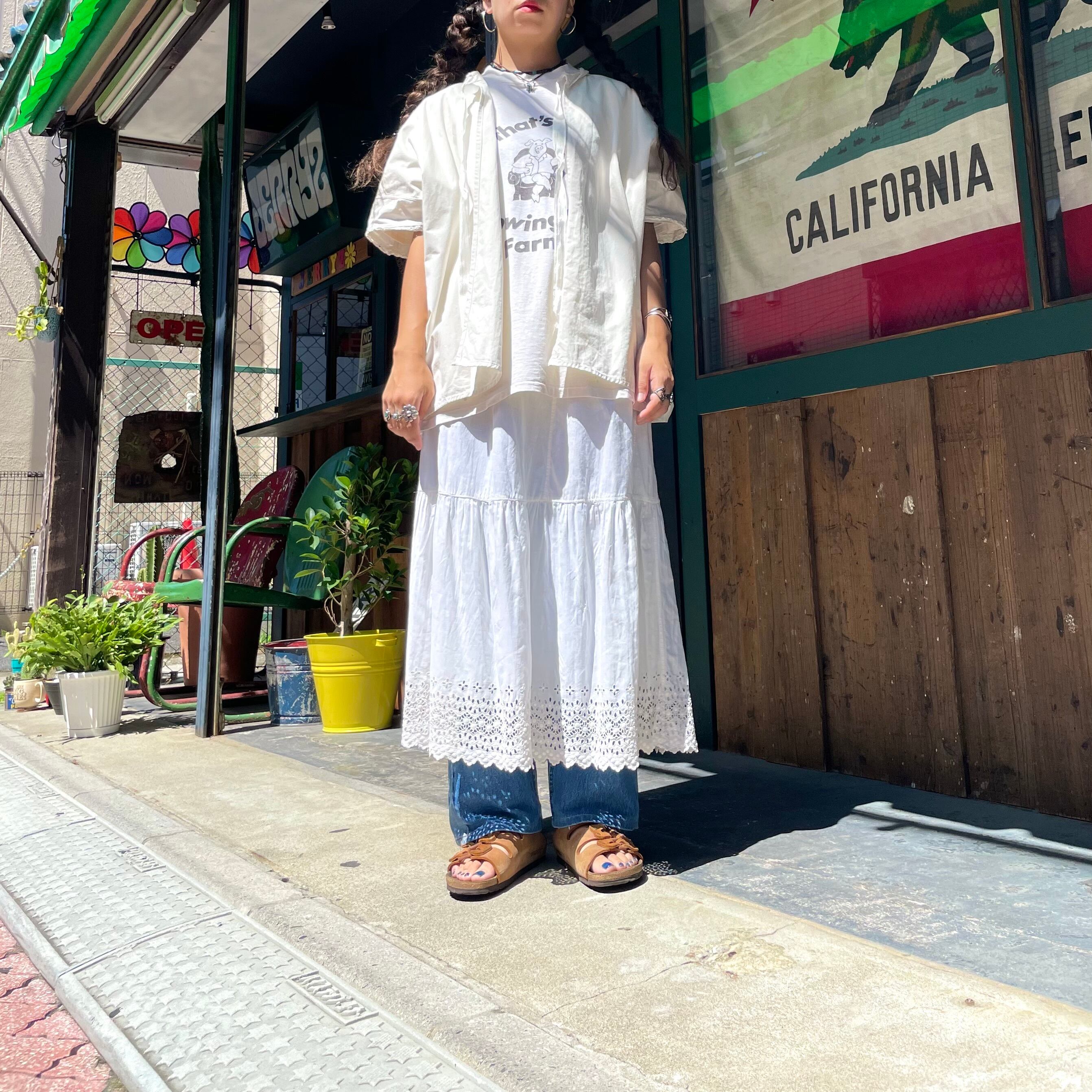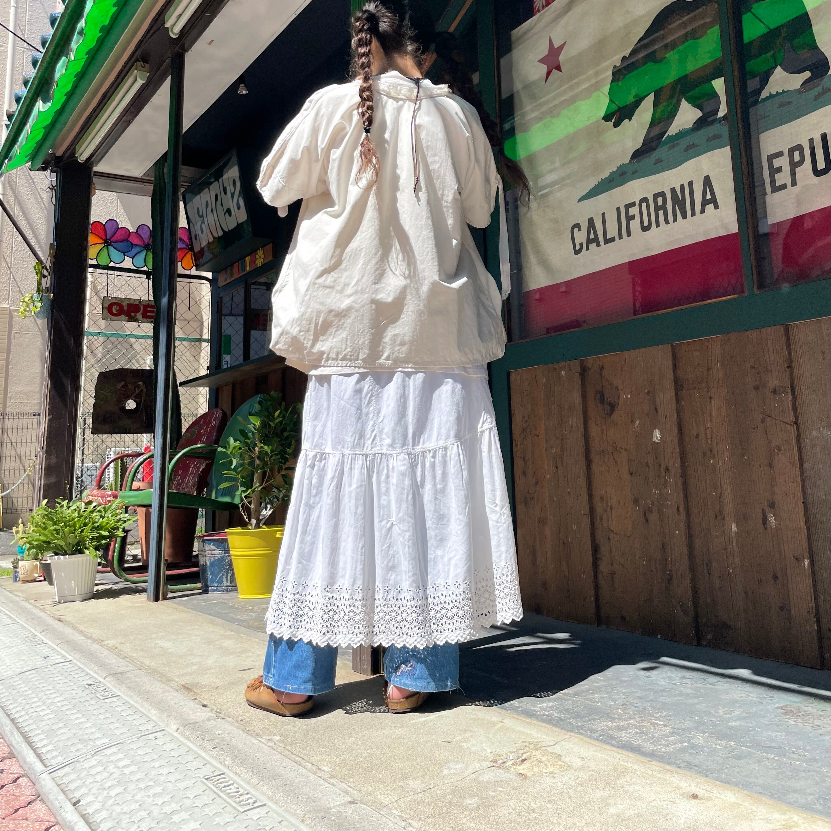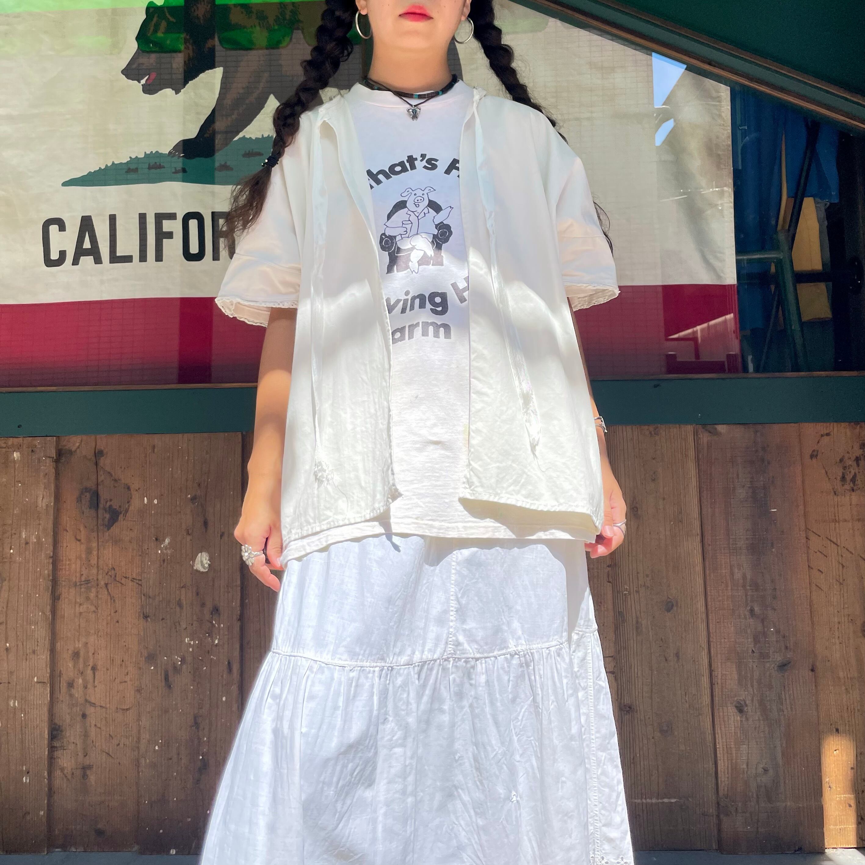 両脇の雑な縫い目や袖や襟ぐりの感じも不思議で面白いですし、ハンドメイドなのかリメイクなのかわかりませんが、こだわりが感じられます。