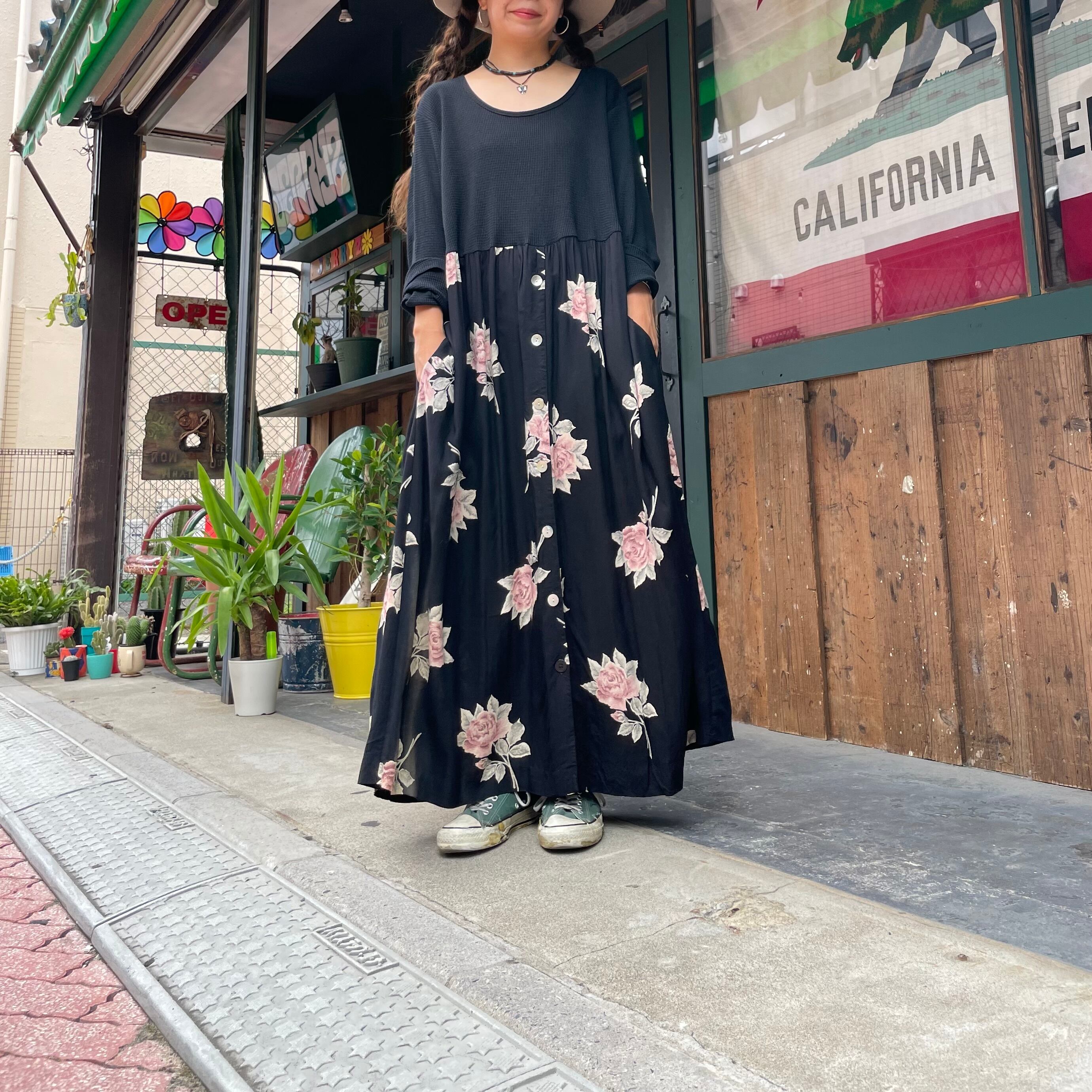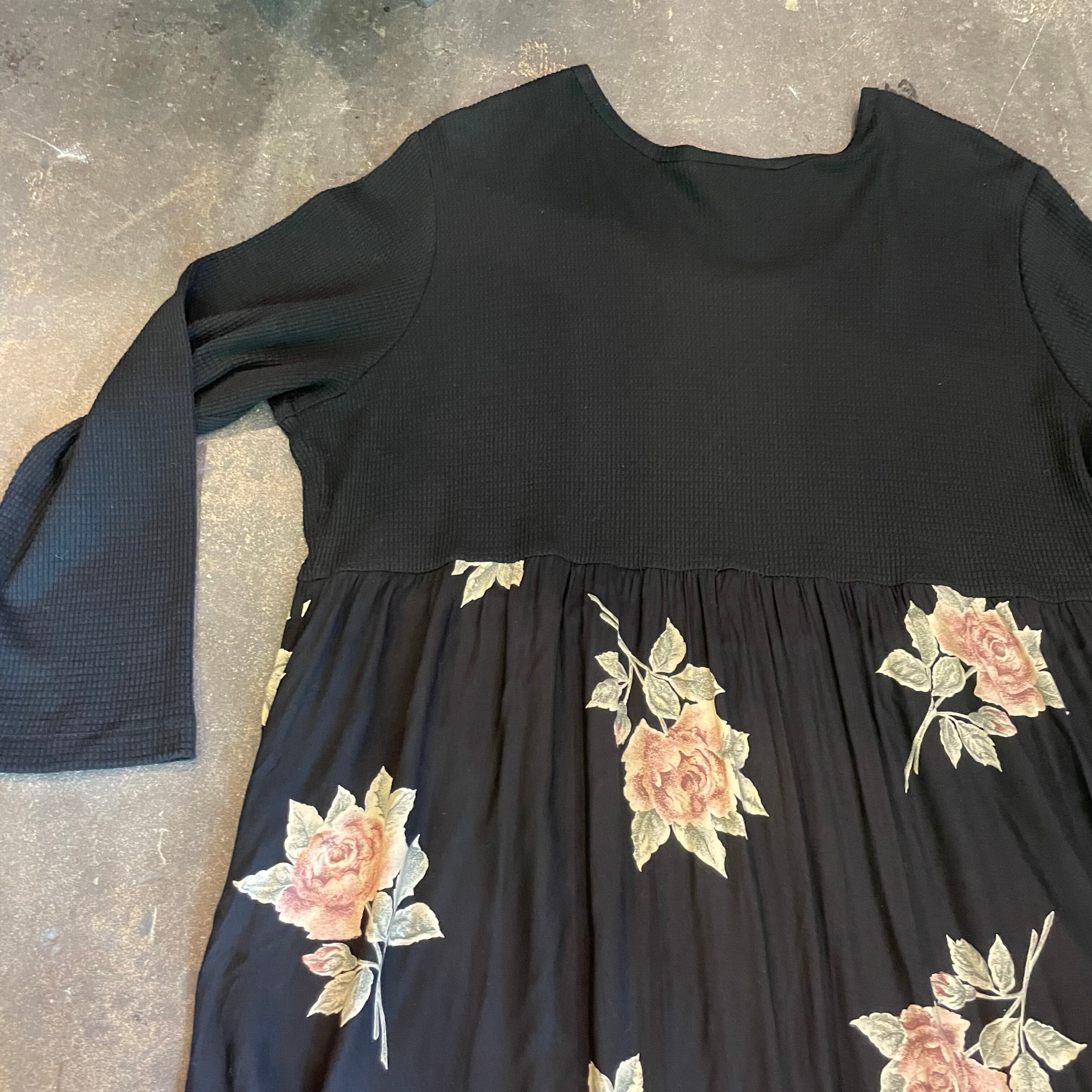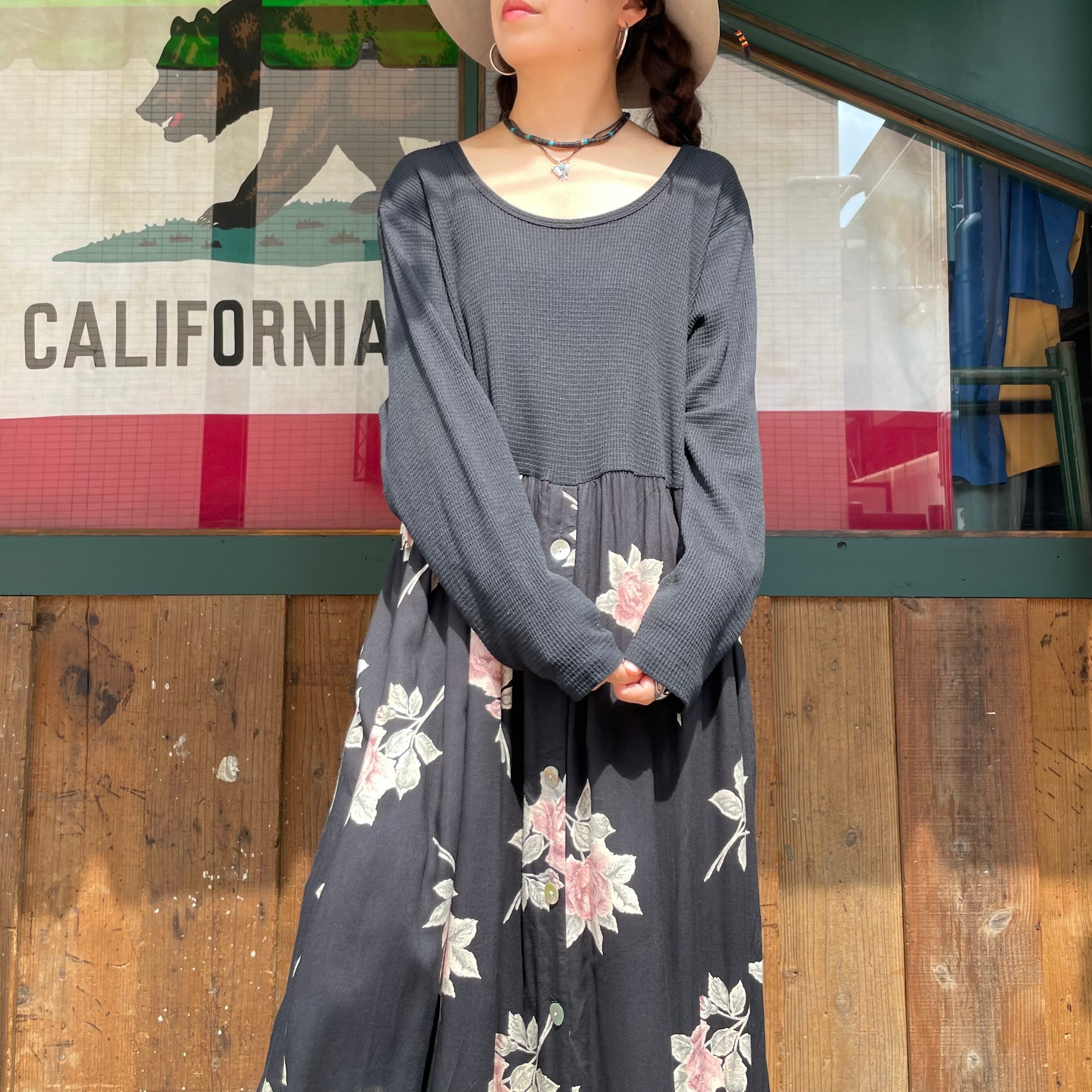 黒のサーマル素材とシックなバラ柄がかわいいワンピースです。