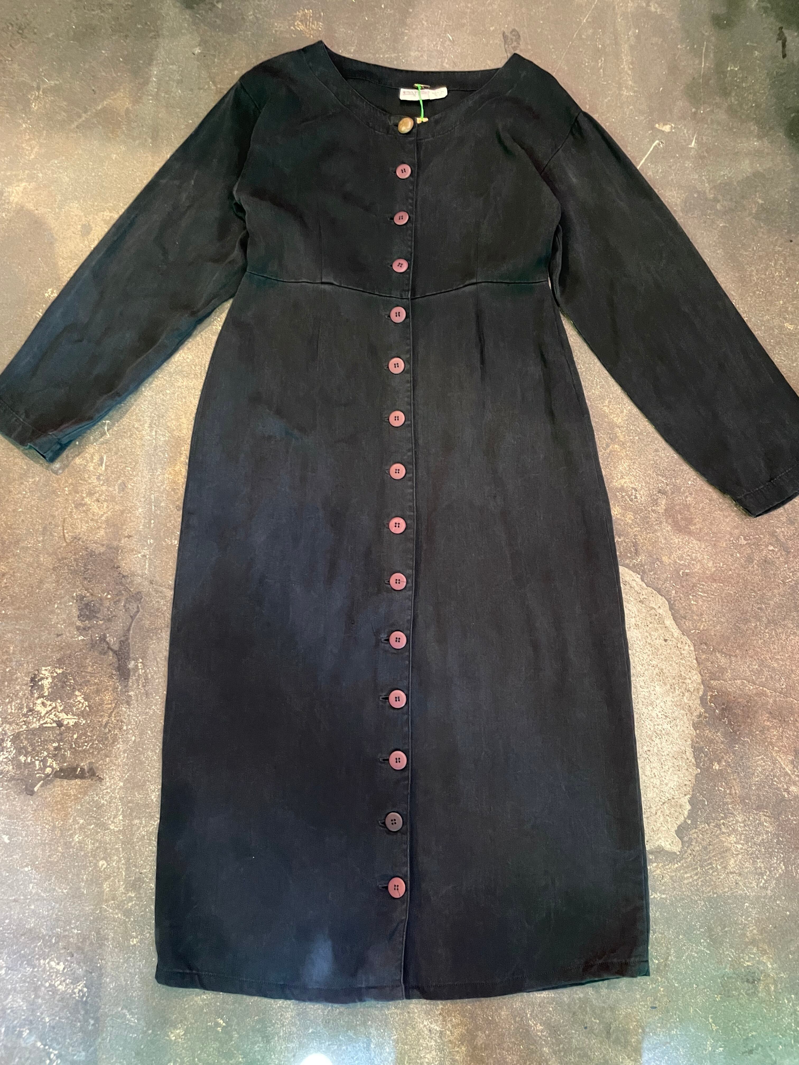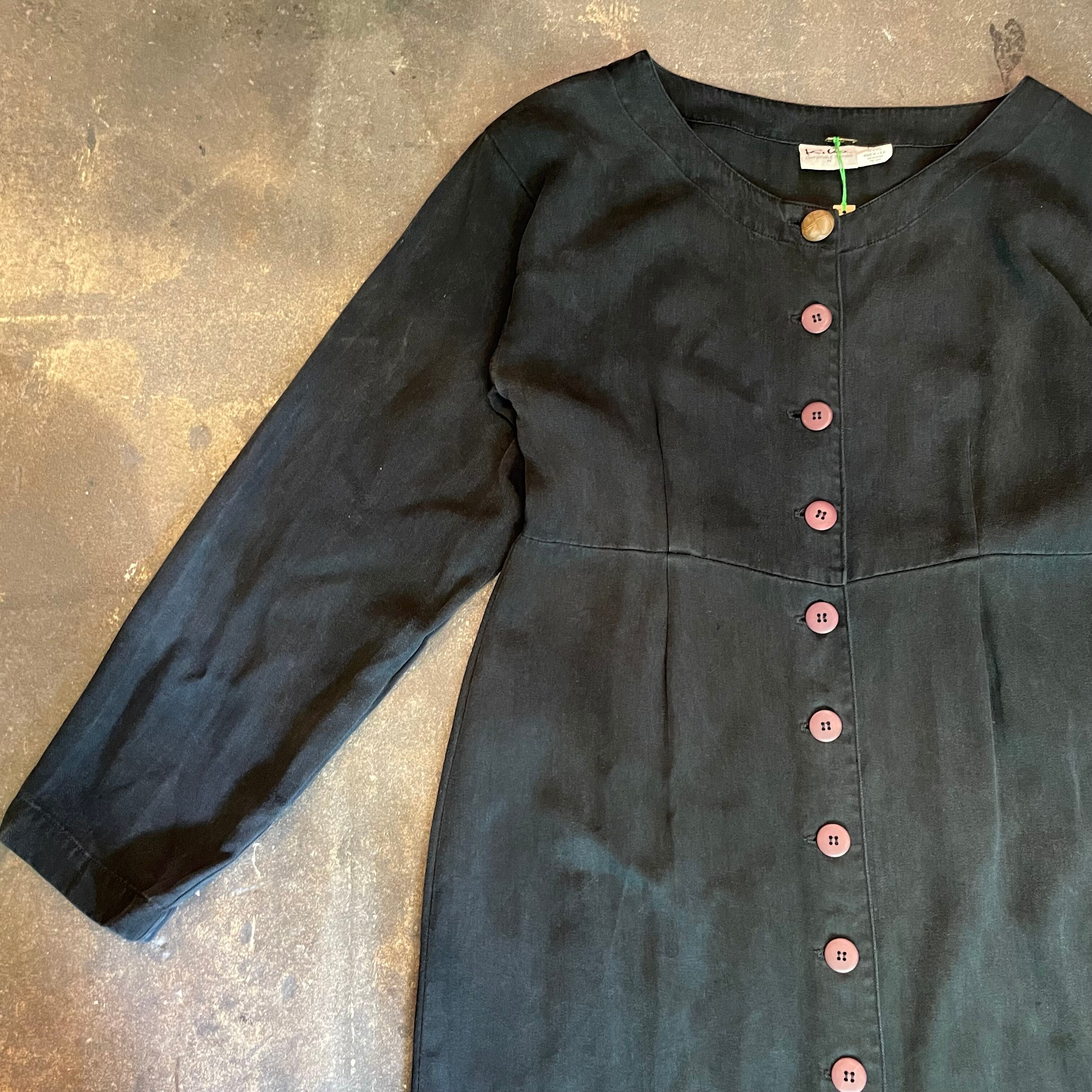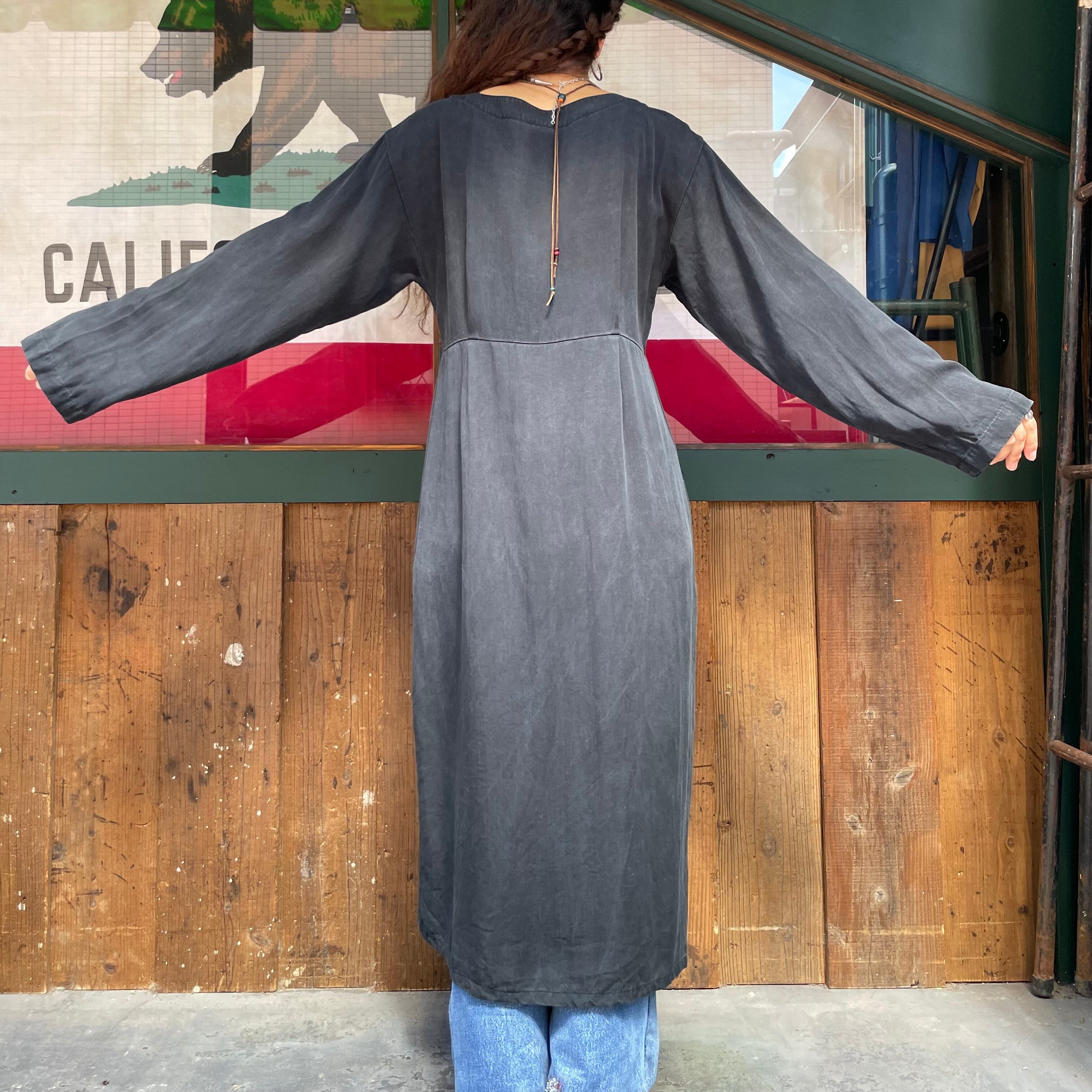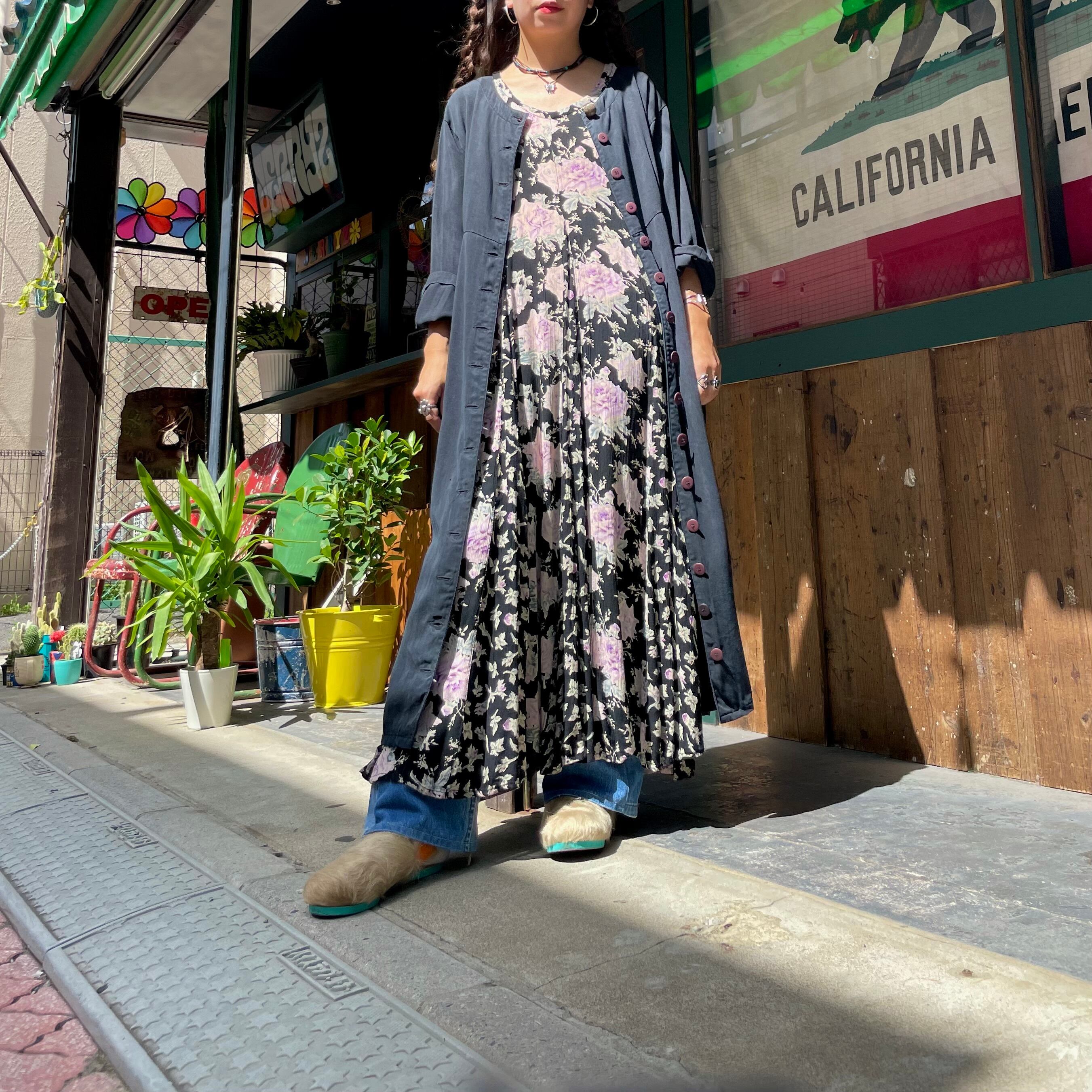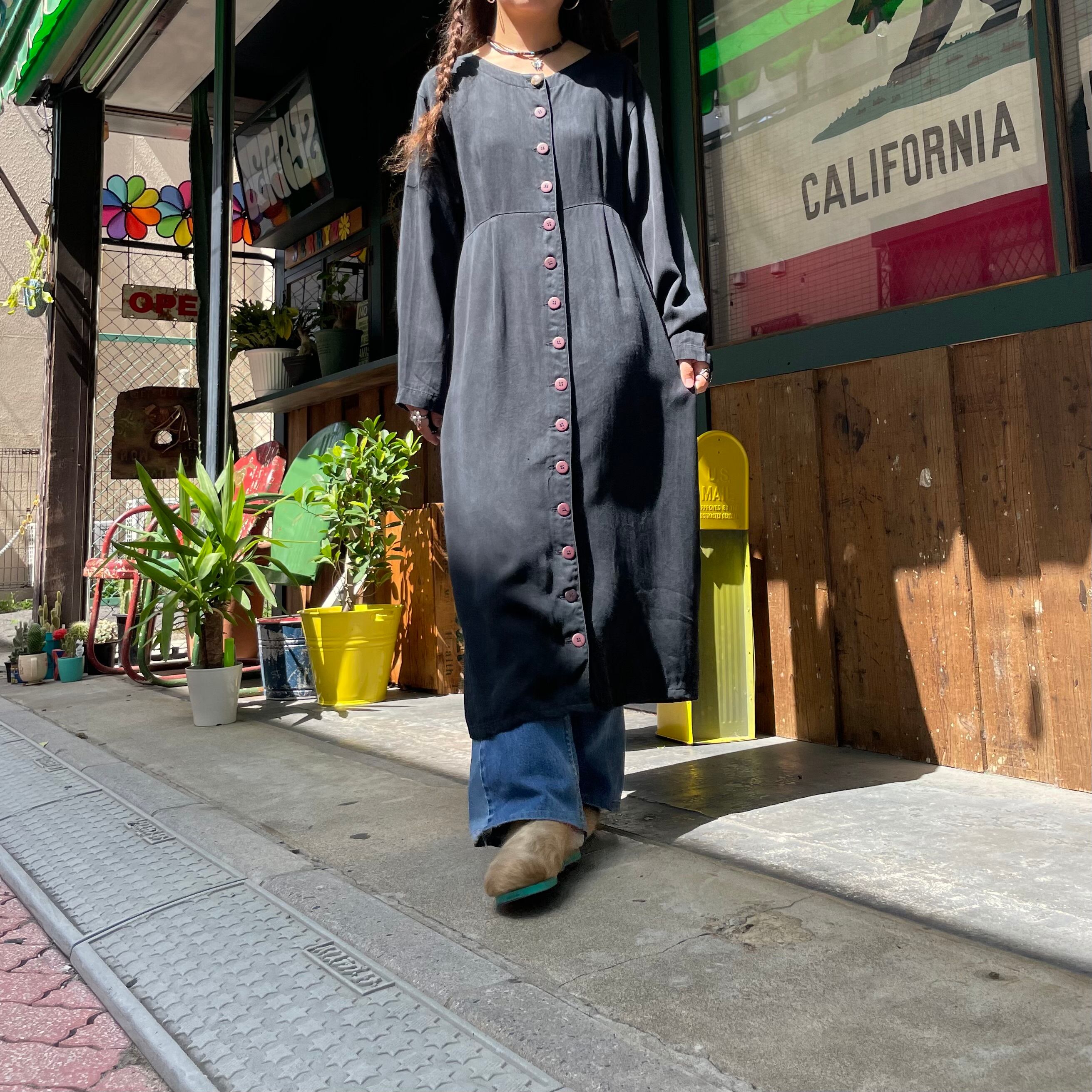 ワンピースとして着る際はスッキリしたシルエットでちょっとお堅い雰囲気がありますが、前を開けてガウンのように着るとカジュアルに着やすい一枚です。