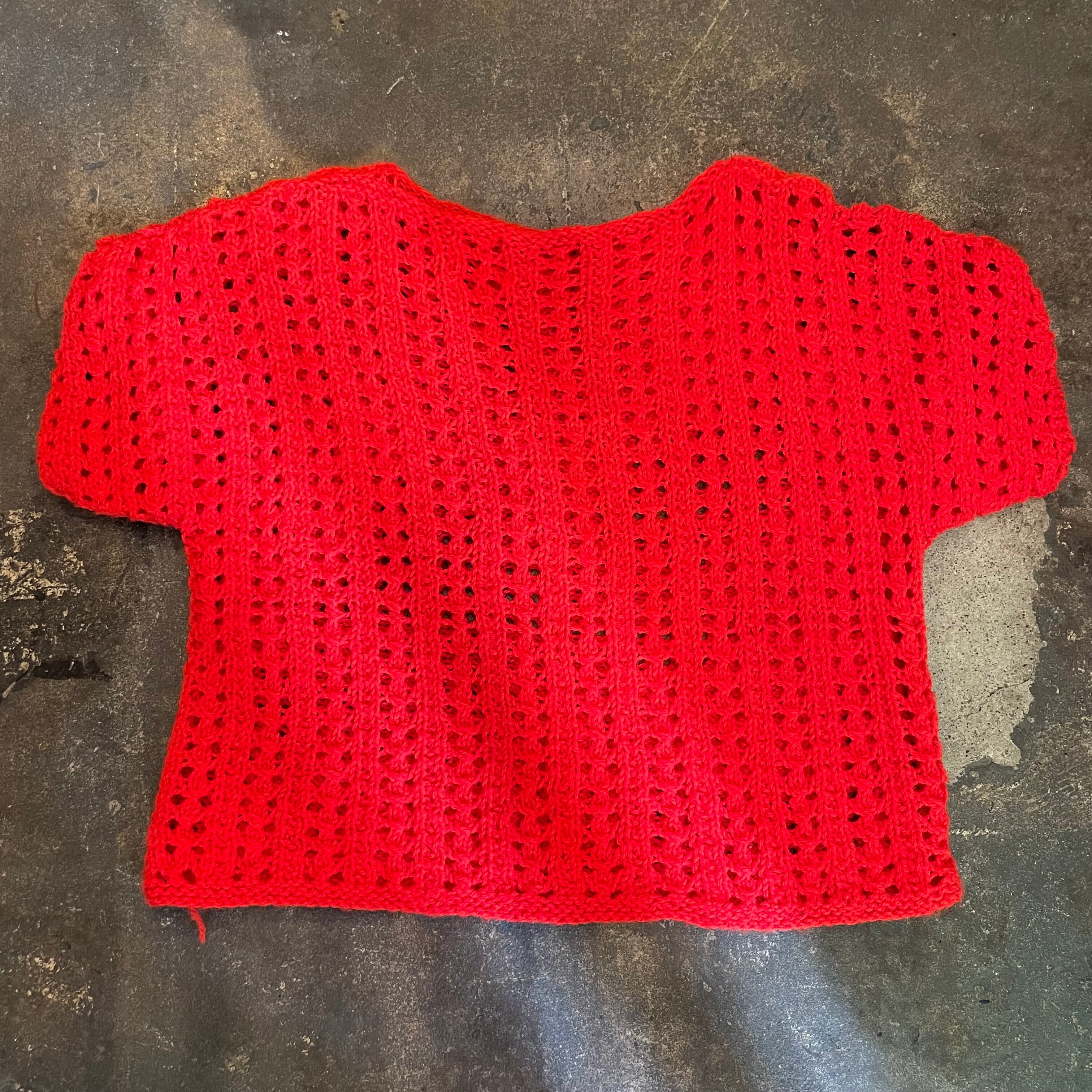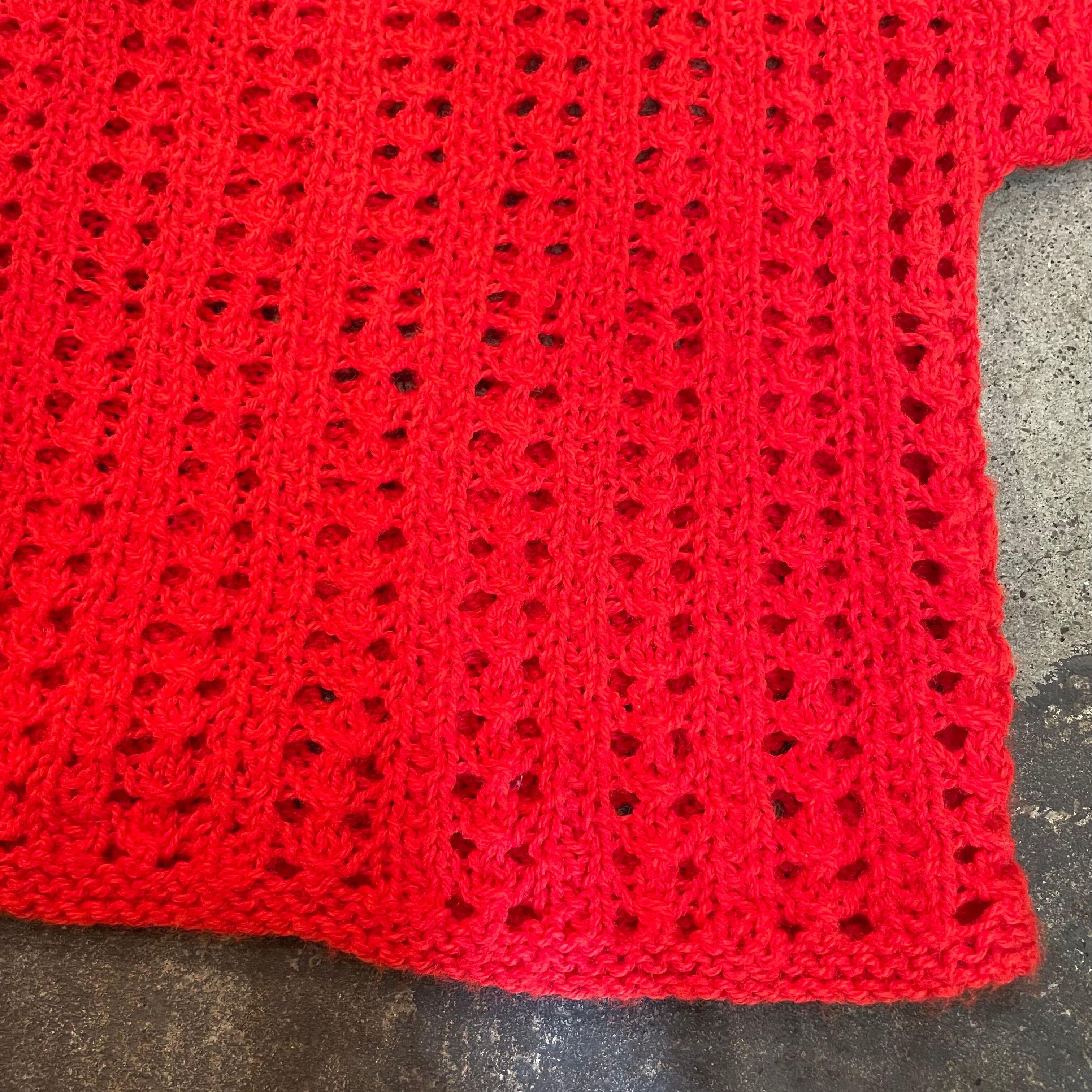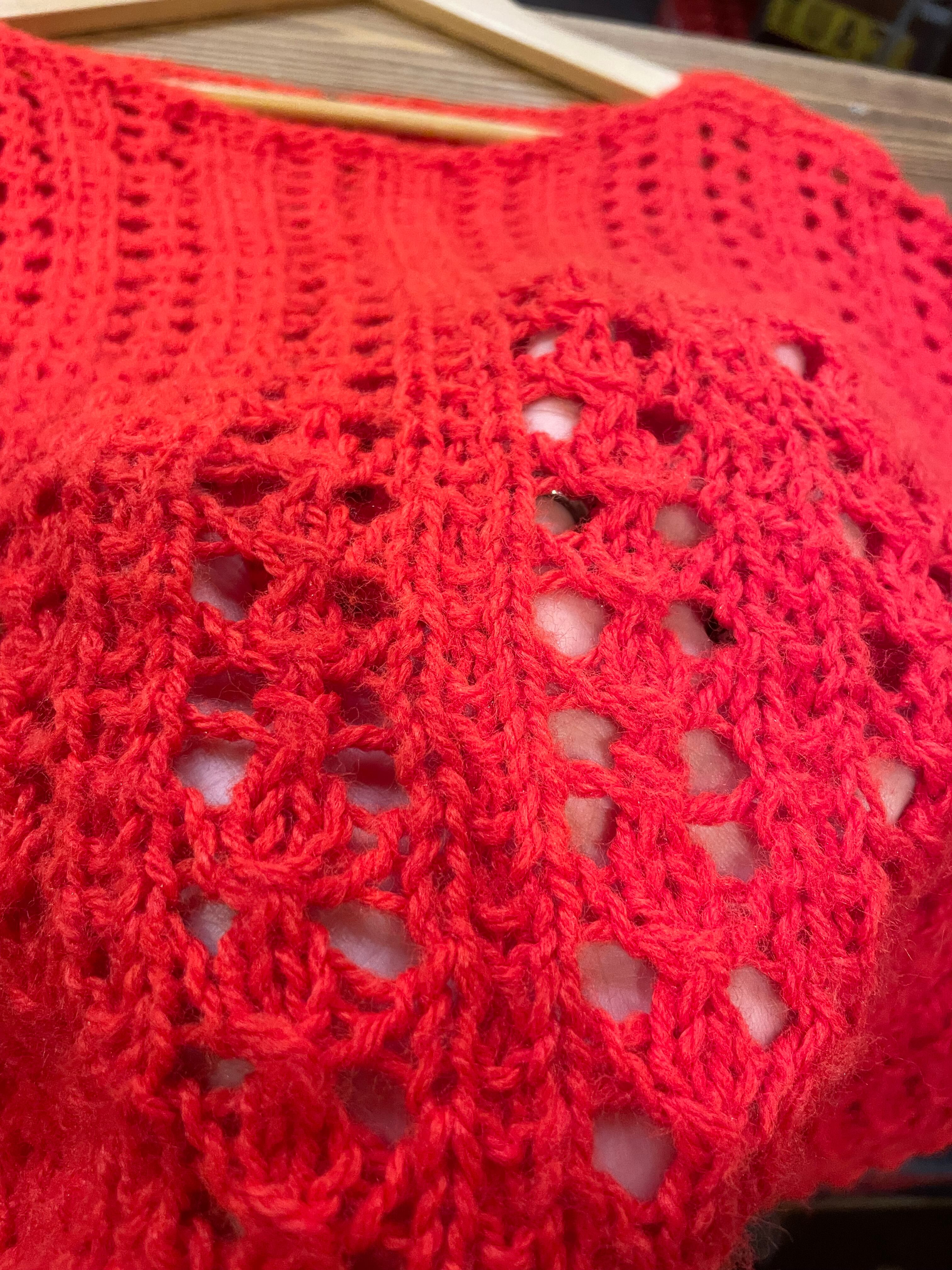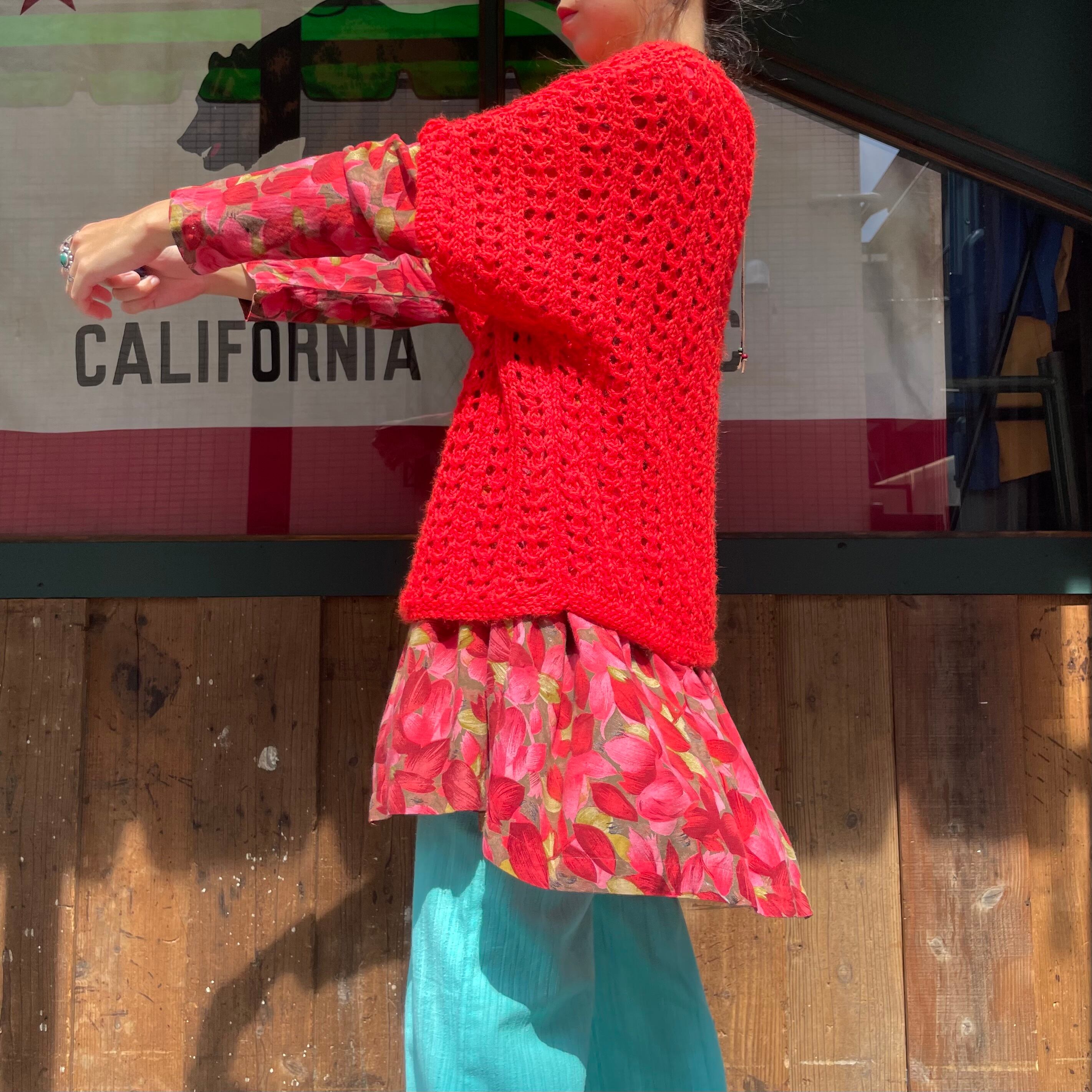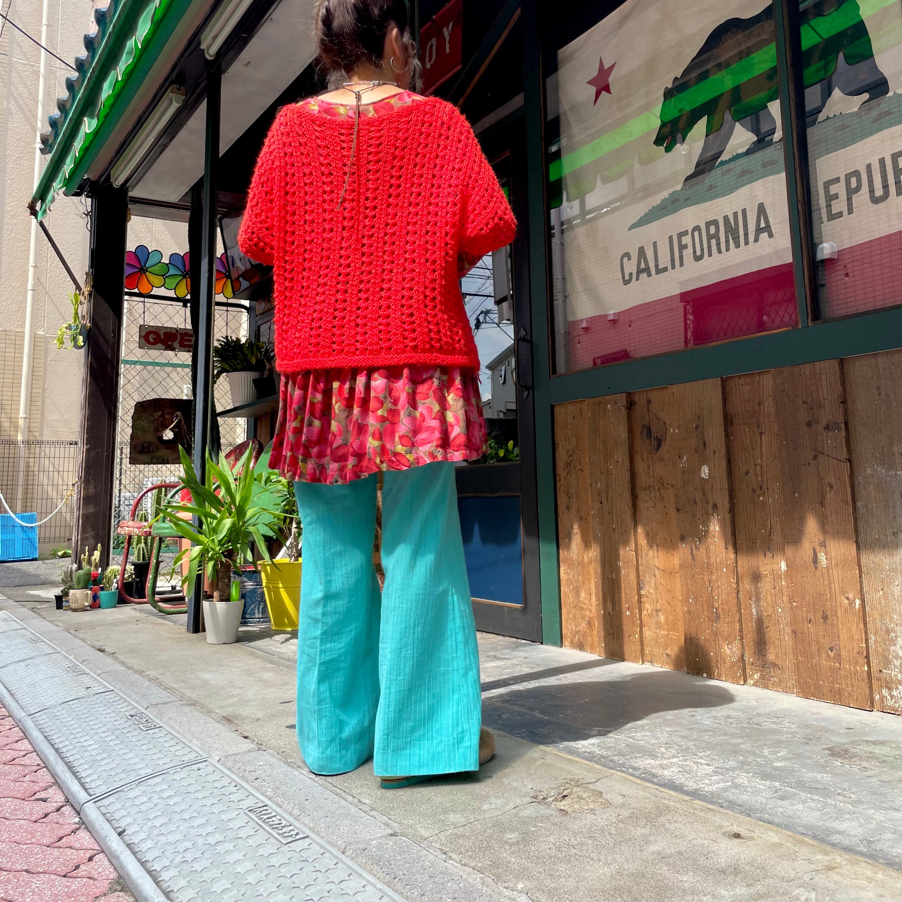 赤とオレンジの間のような元気な色がかわいい半袖のセーターです。