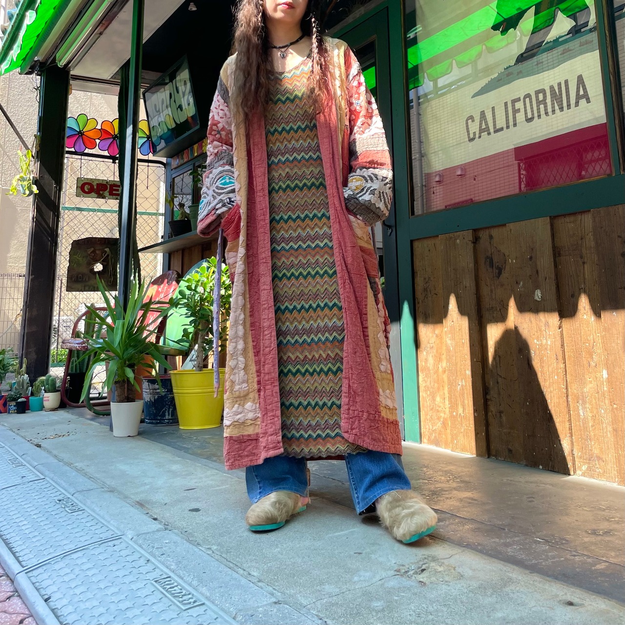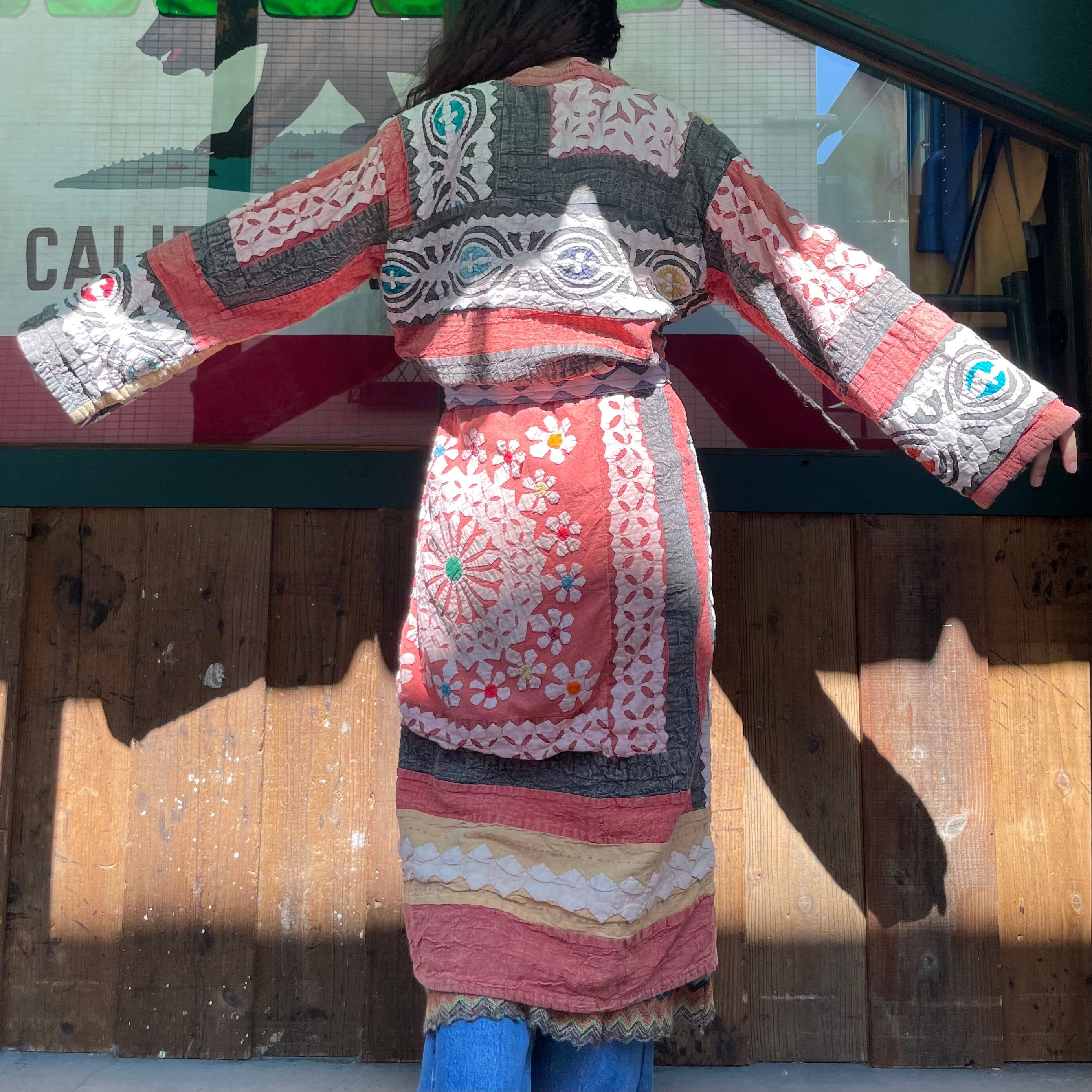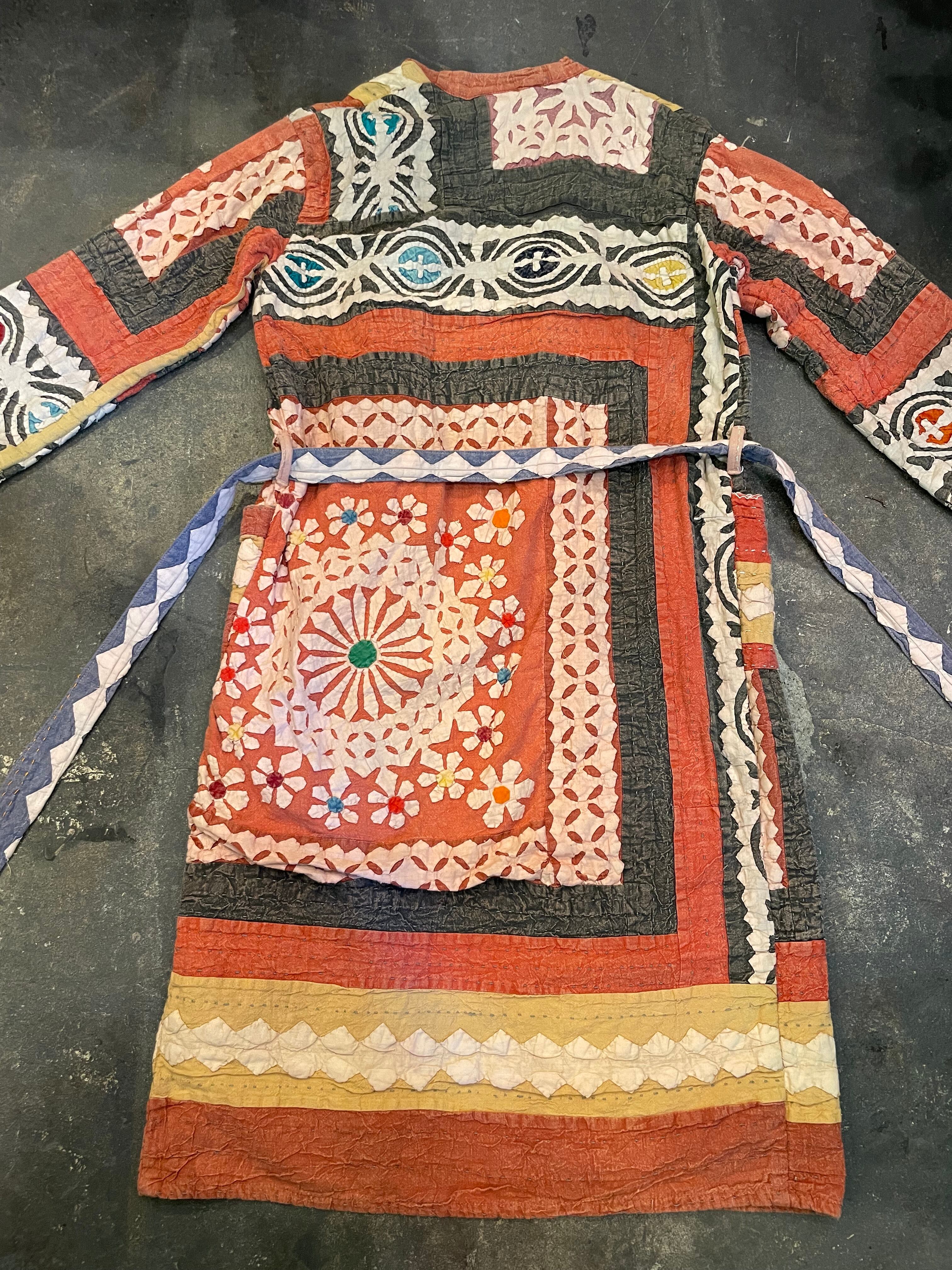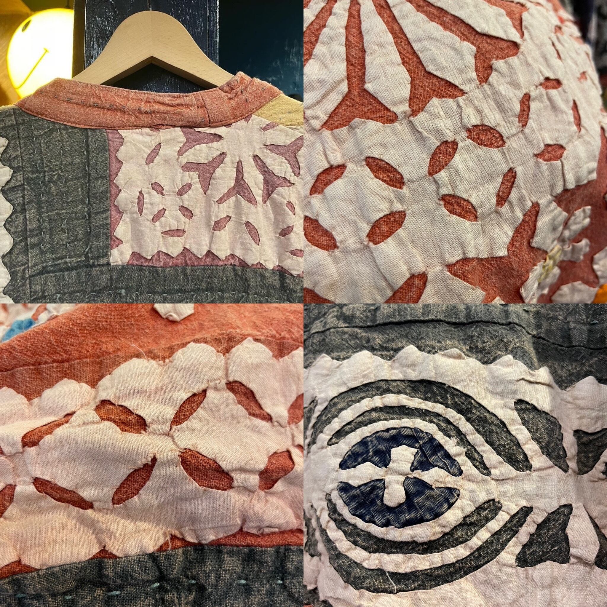 手作業でちくちくパッチワークされた感じもとても素敵ですし、そのパッチワークの布をリメイクして作られたような感じで、ガウンそのものの存在感がありかっこいい一着だと思います。