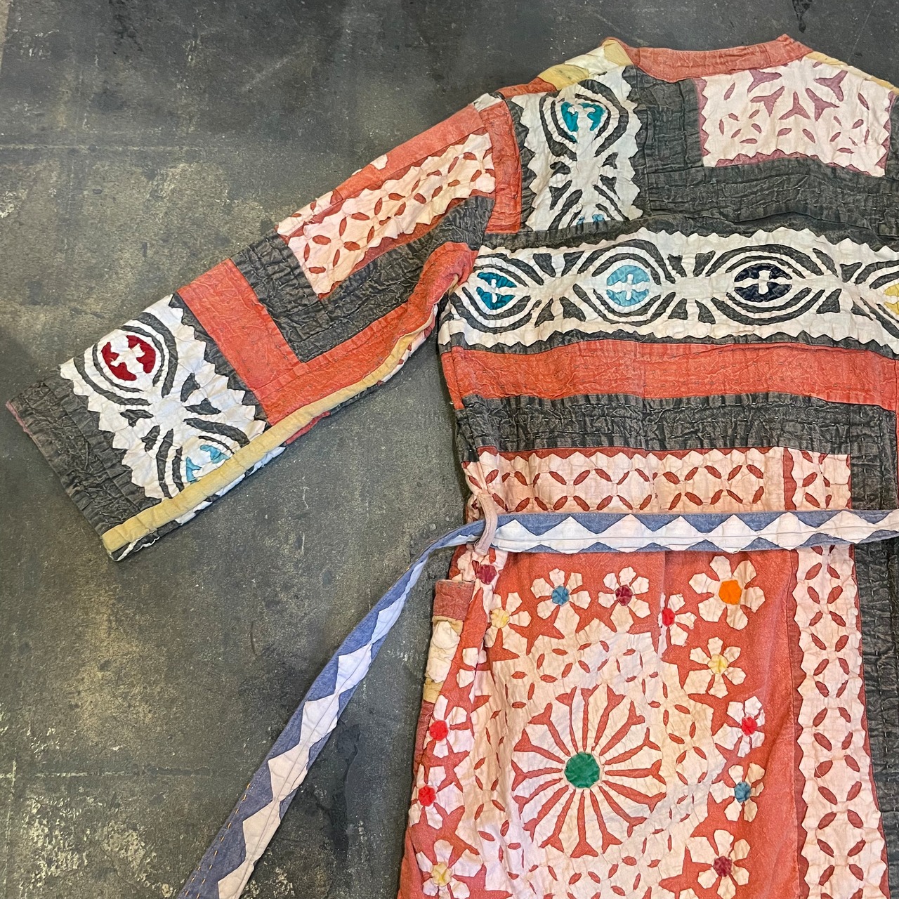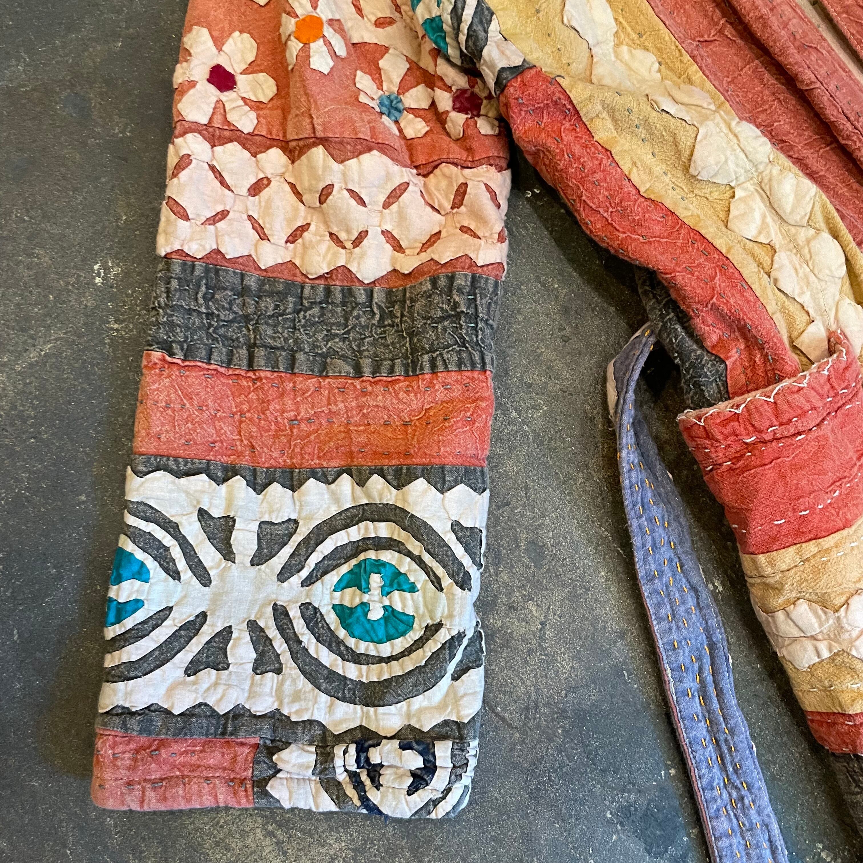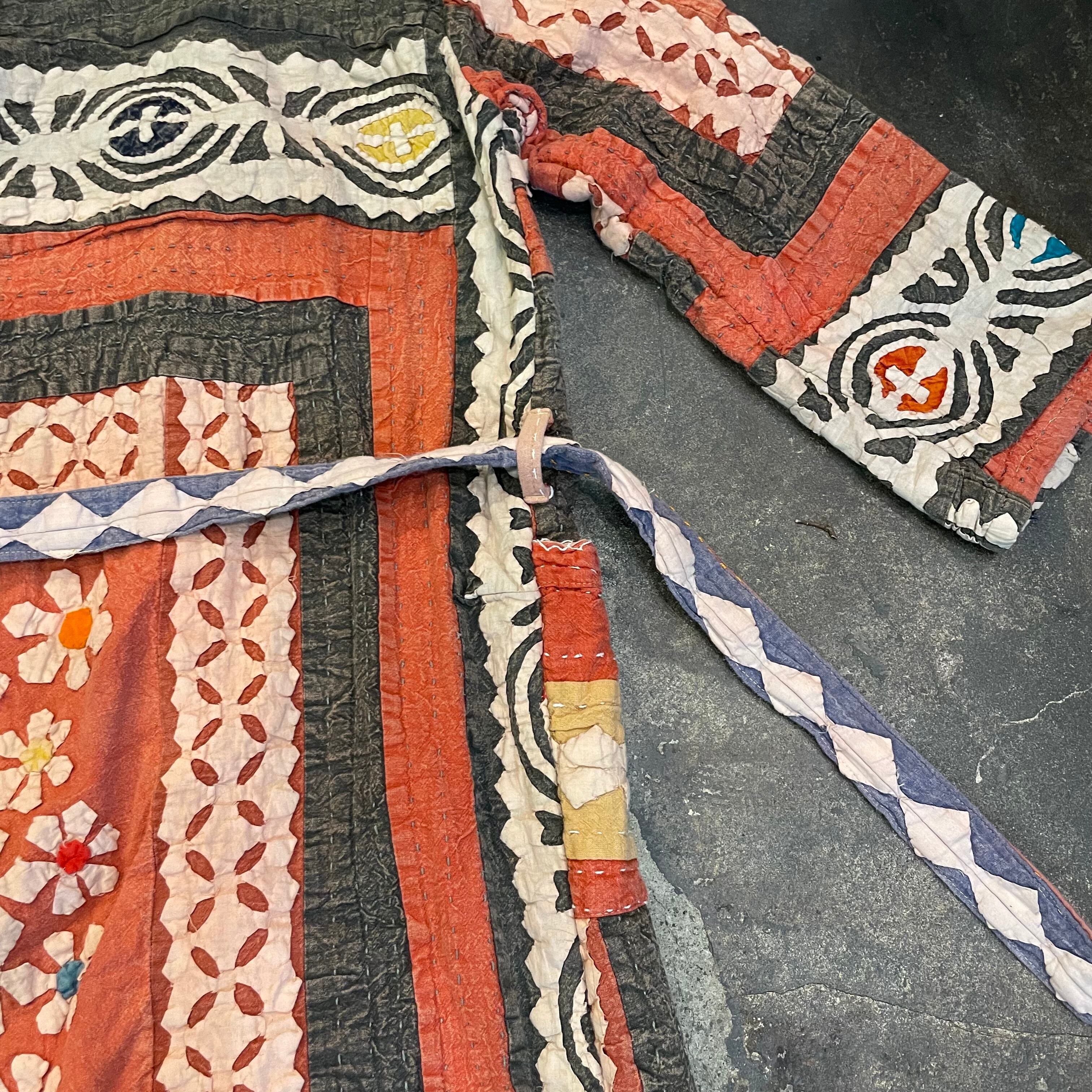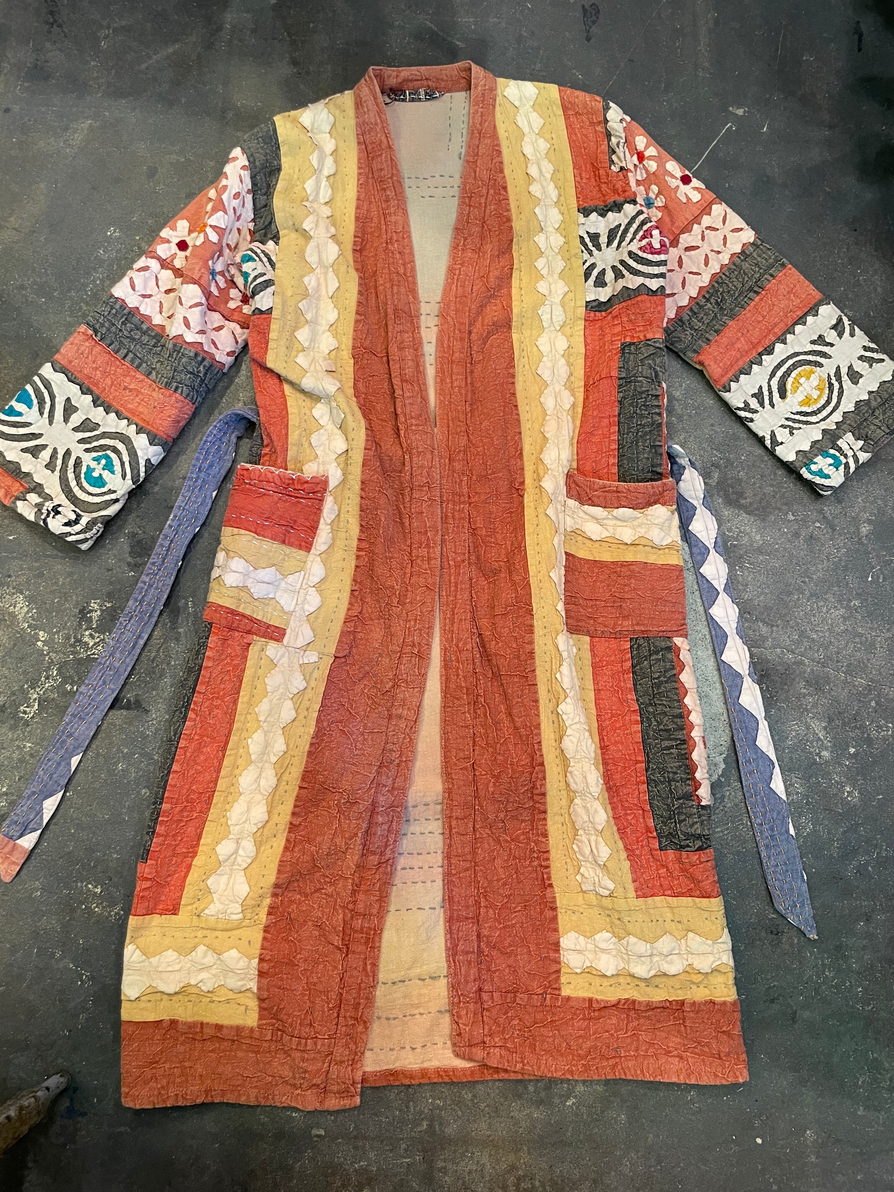 手作業でちくちくパッチワークされた感じもとても素敵ですし、そのパッチワークの布をリメイクして作られたような感じで、ガウンそのものの存在感がありかっこいい一着だと思います。