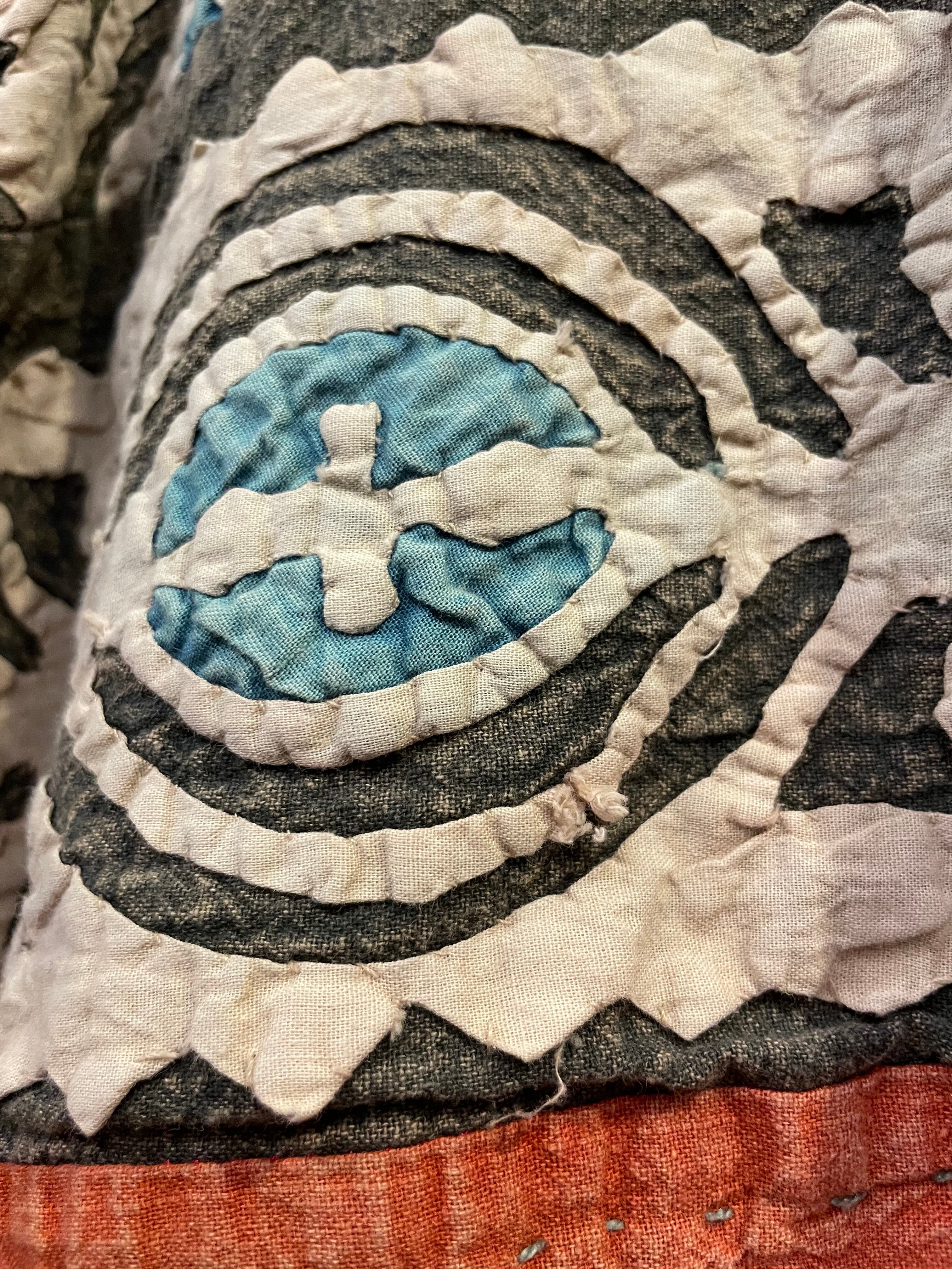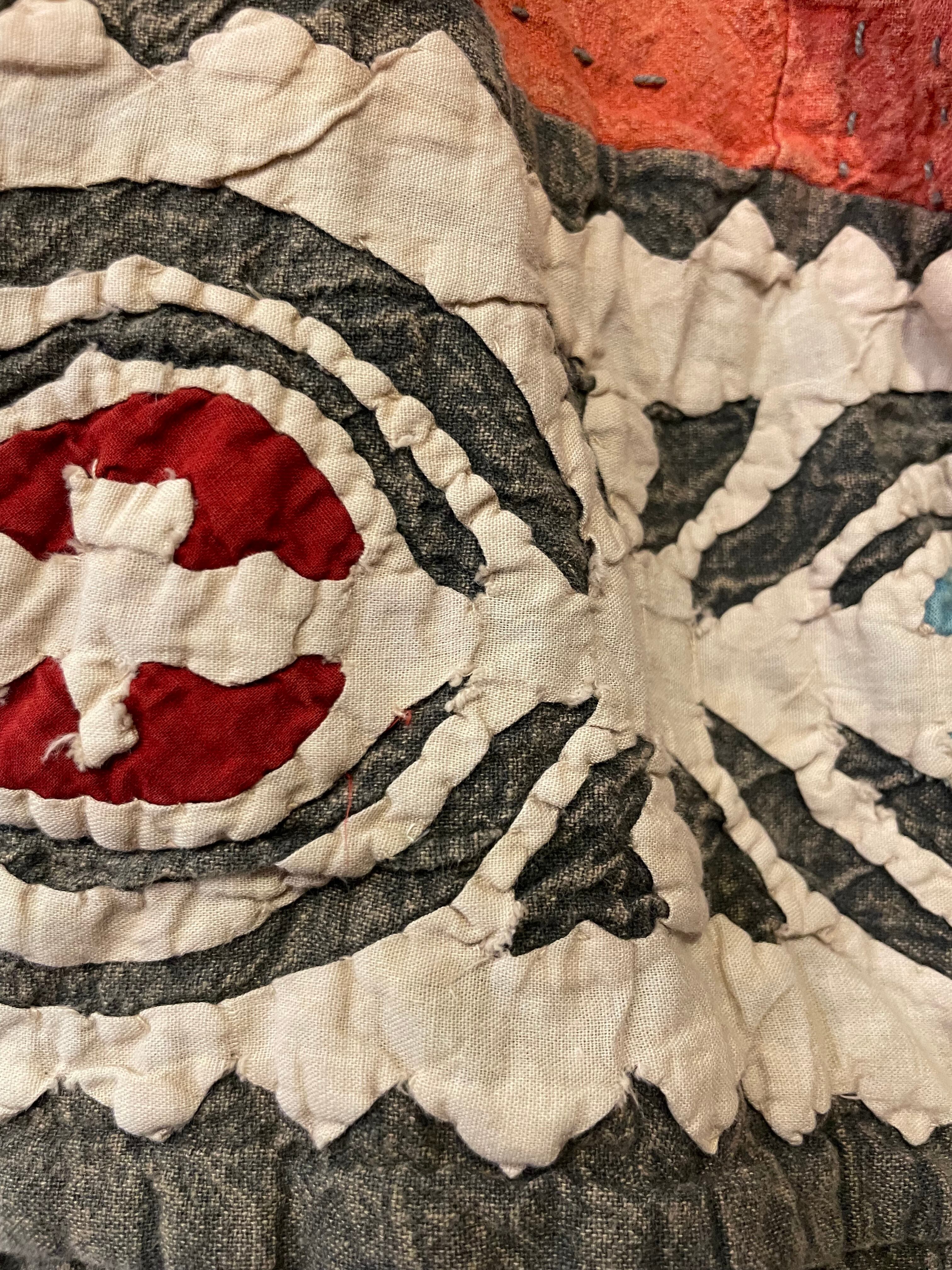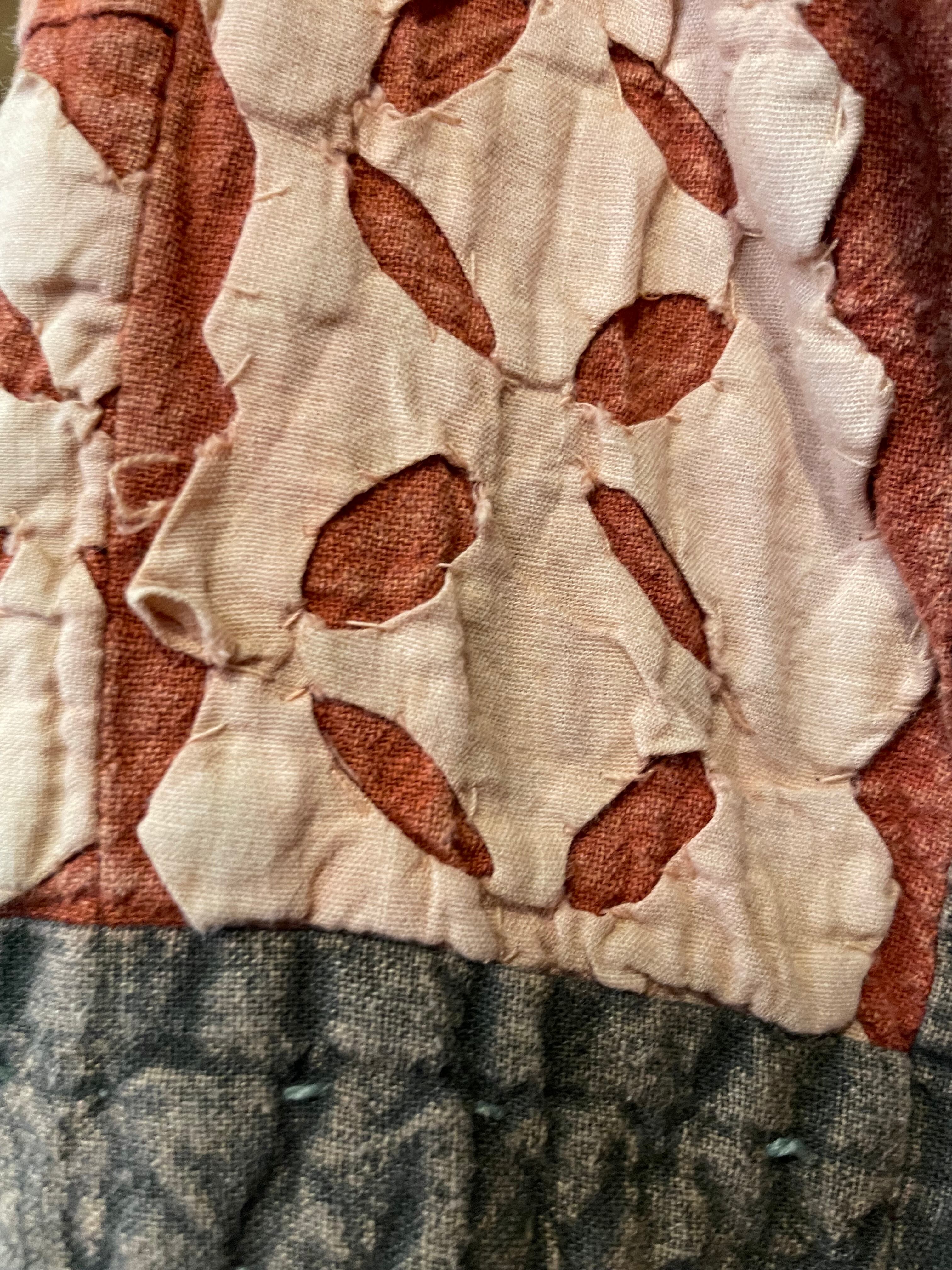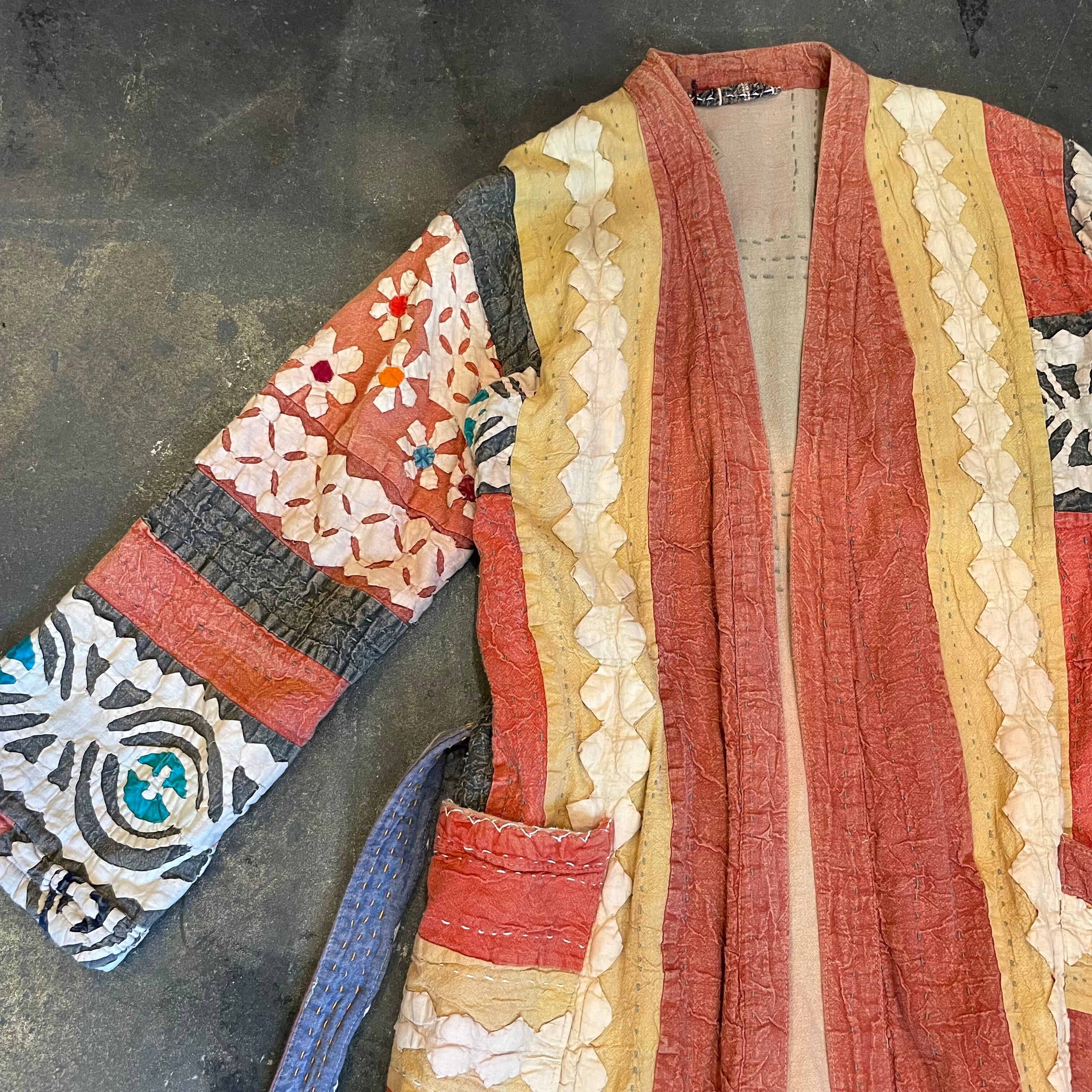 手作業でちくちくパッチワークされた感じもとても素敵ですし、そのパッチワークの布をリメイクして作られたような感じで、ガウンそのものの存在感がありかっこいい一着だと思います。