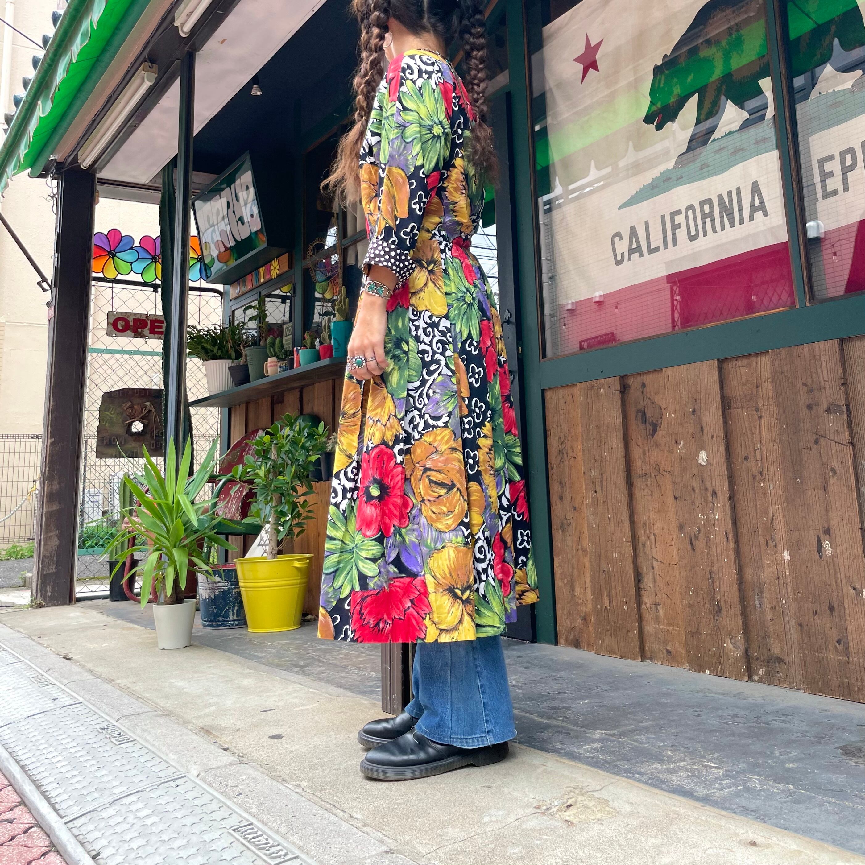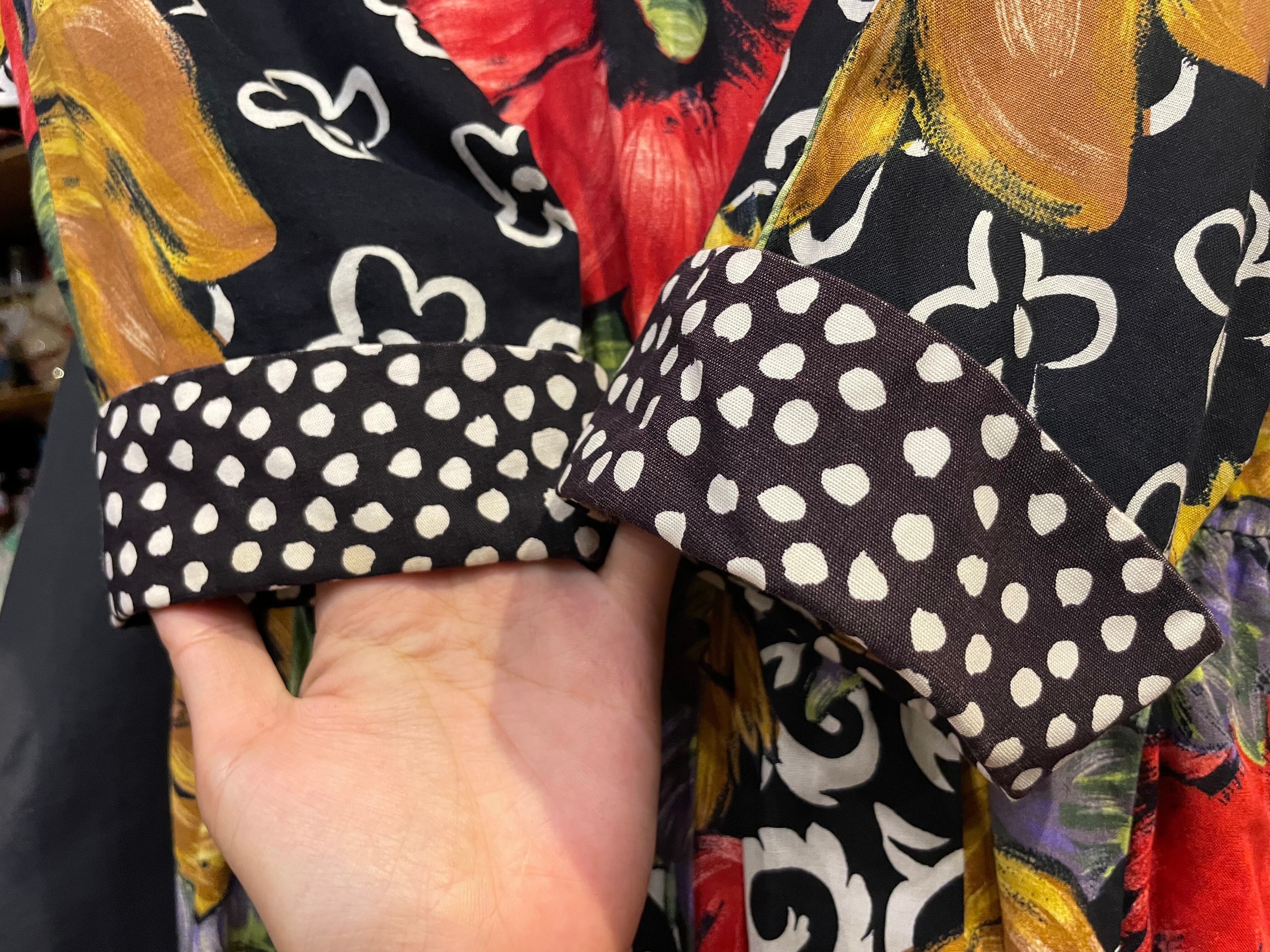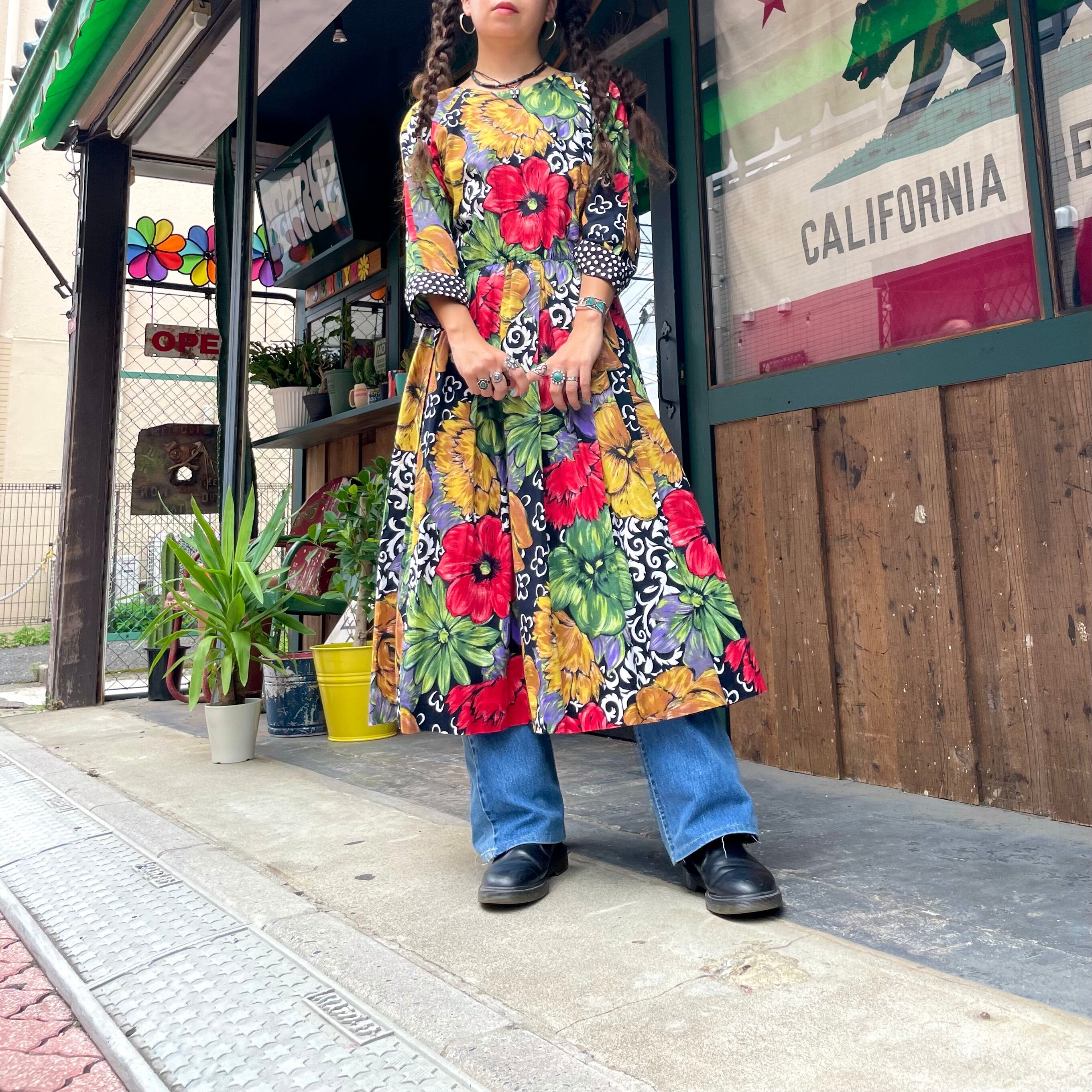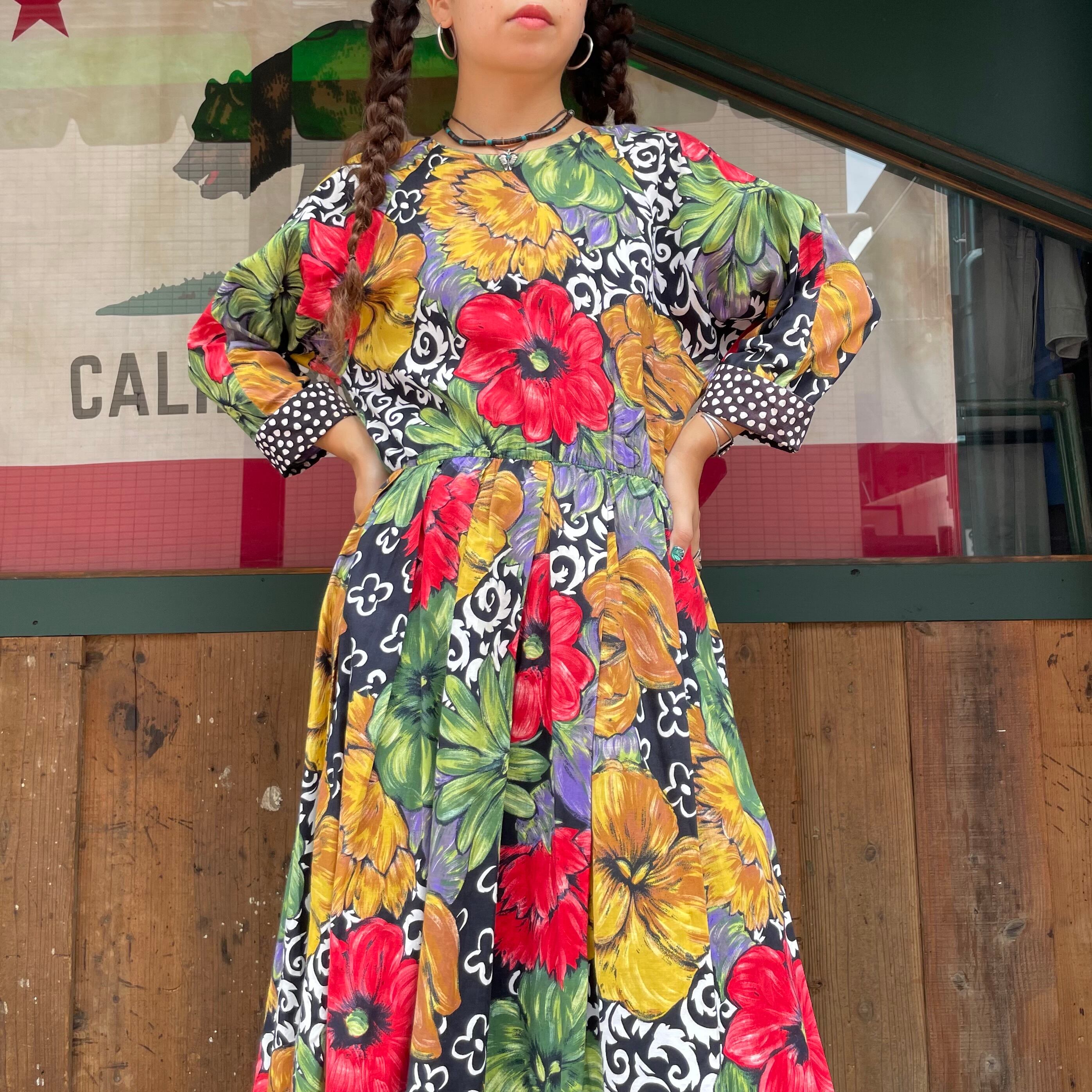 色付きのリアルな花柄と白黒のゆるい花柄と、ドットなど色んな柄の合わせ技がかわいい、80年代ごろのワンピースです。