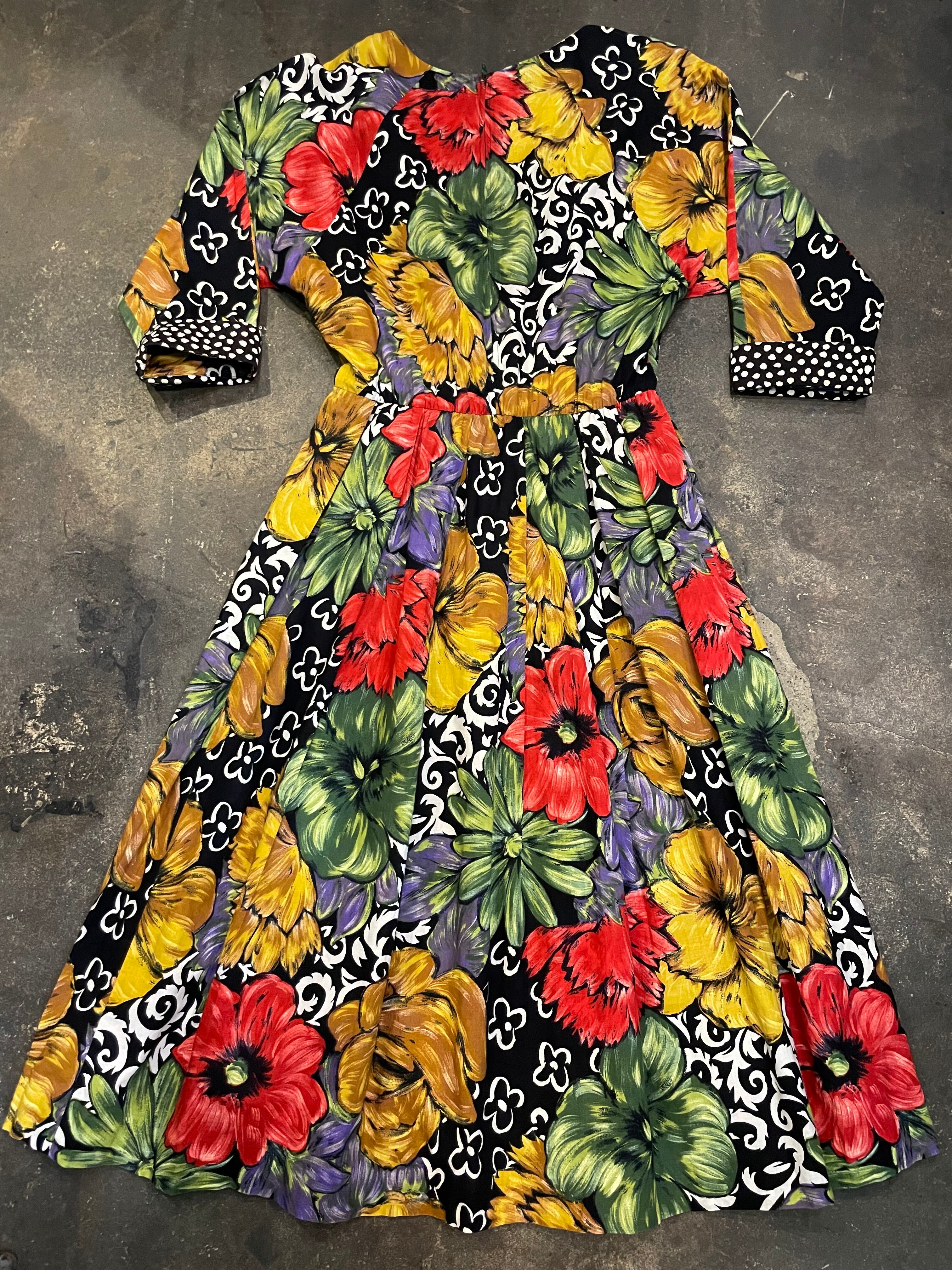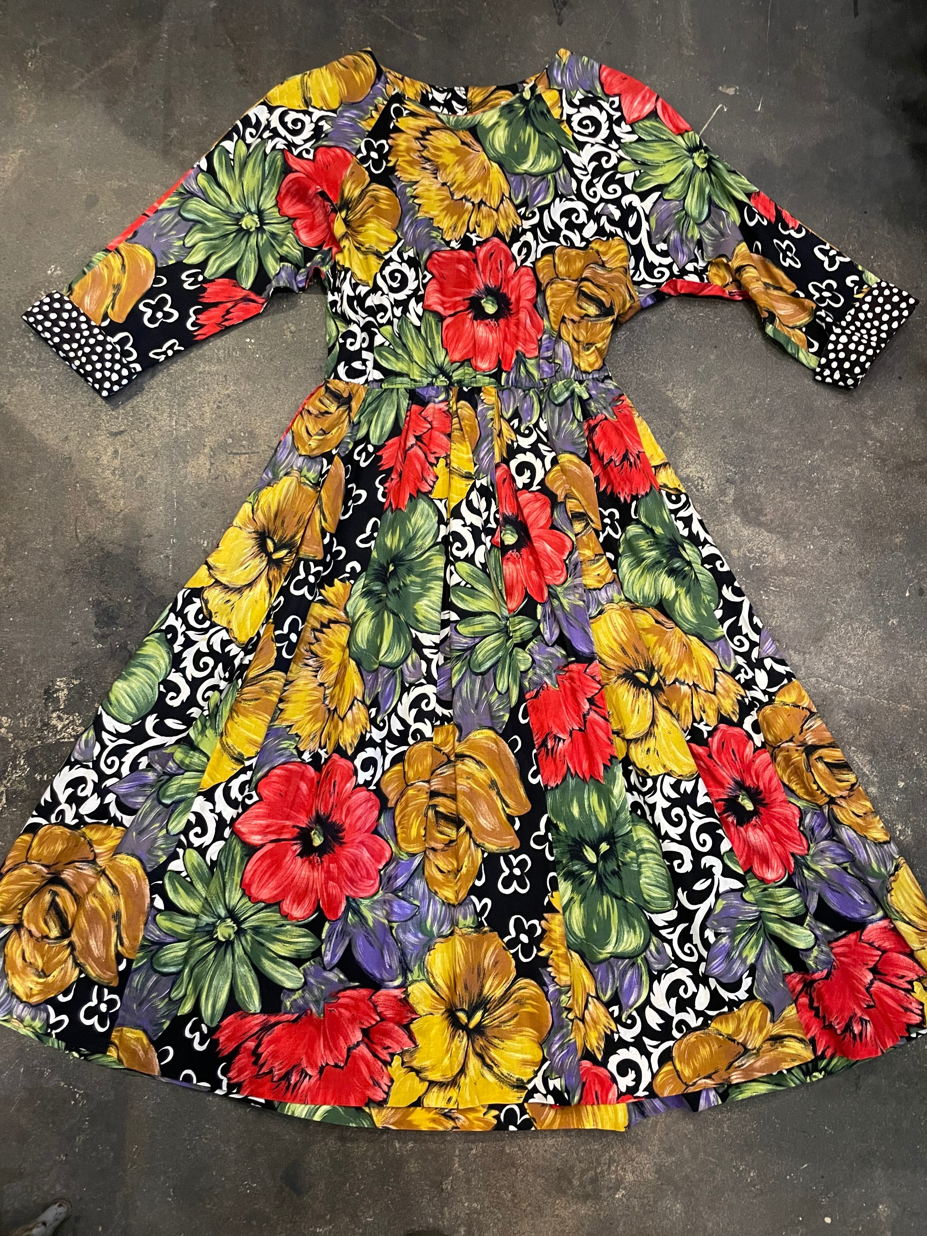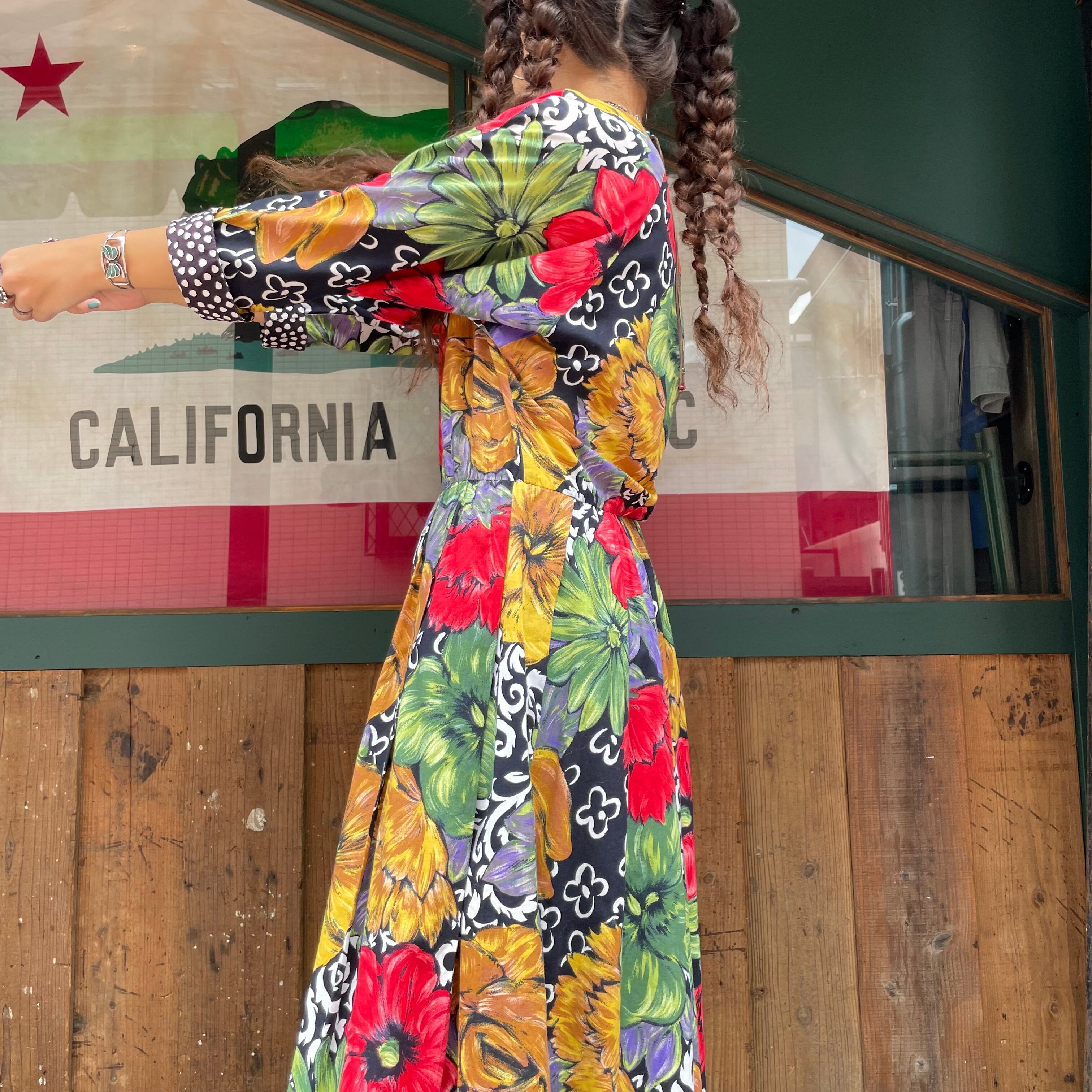色付きのリアルな花柄と白黒のゆるい花柄と、ドットなど色んな柄の合わせ技がかわいい、80年代ごろのワンピースです。