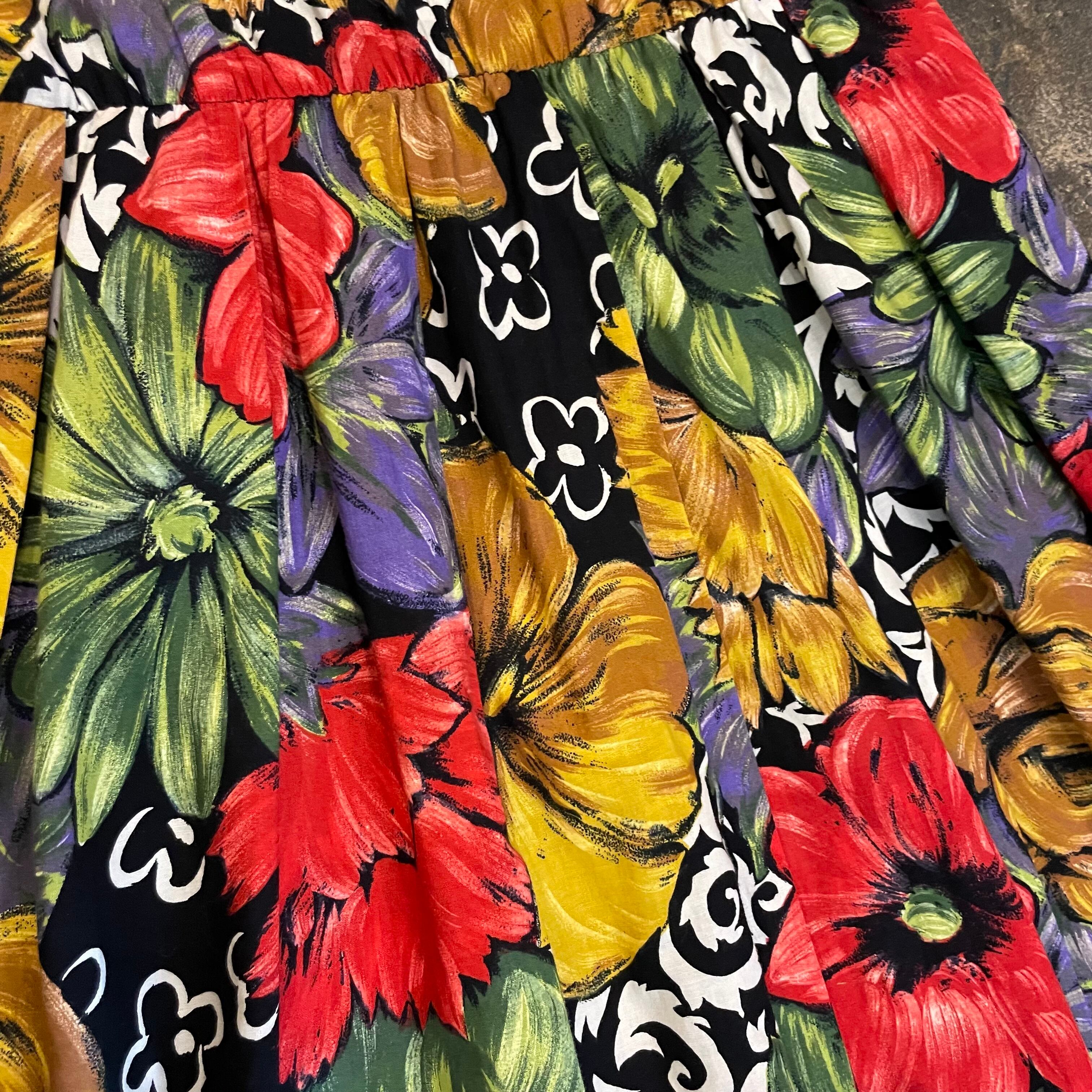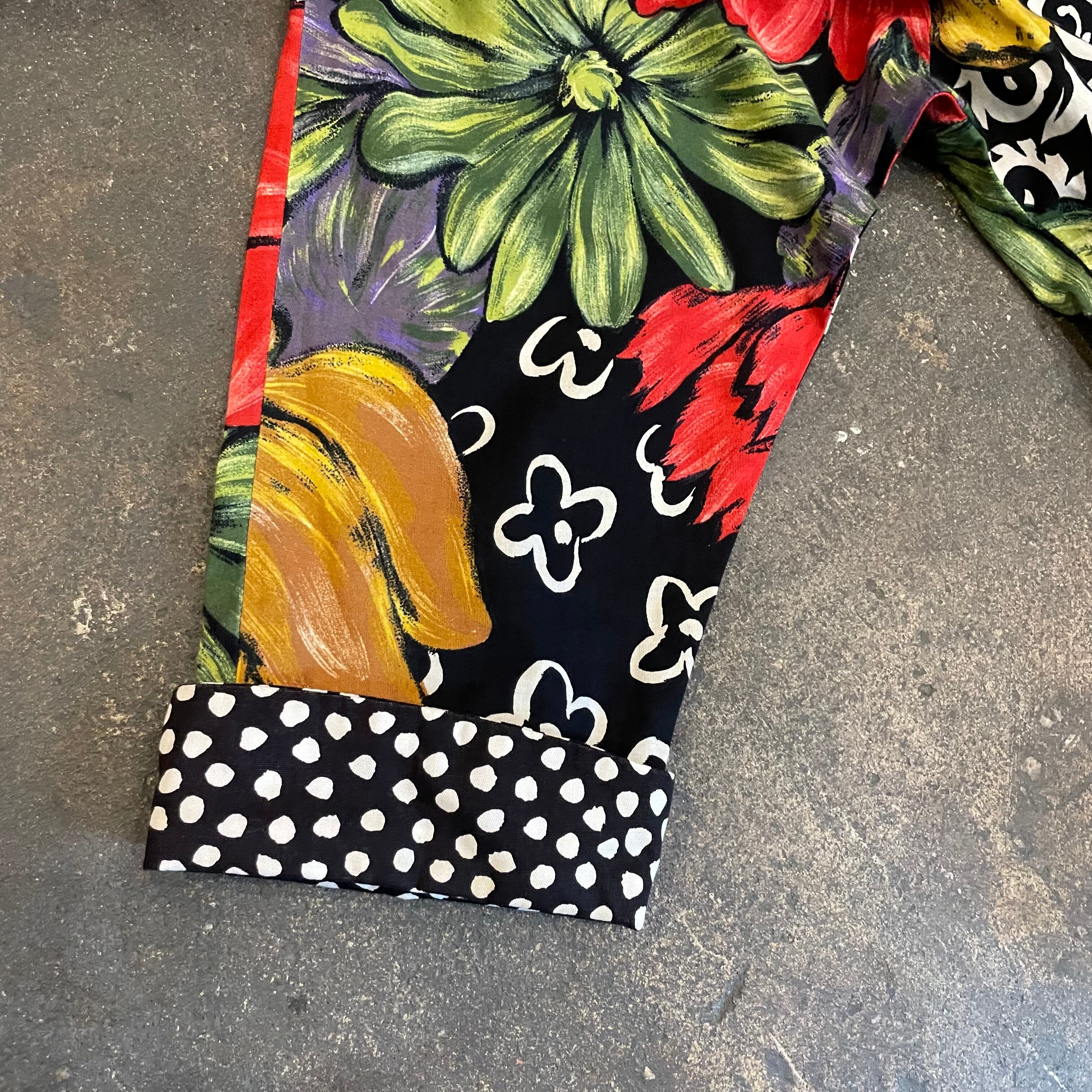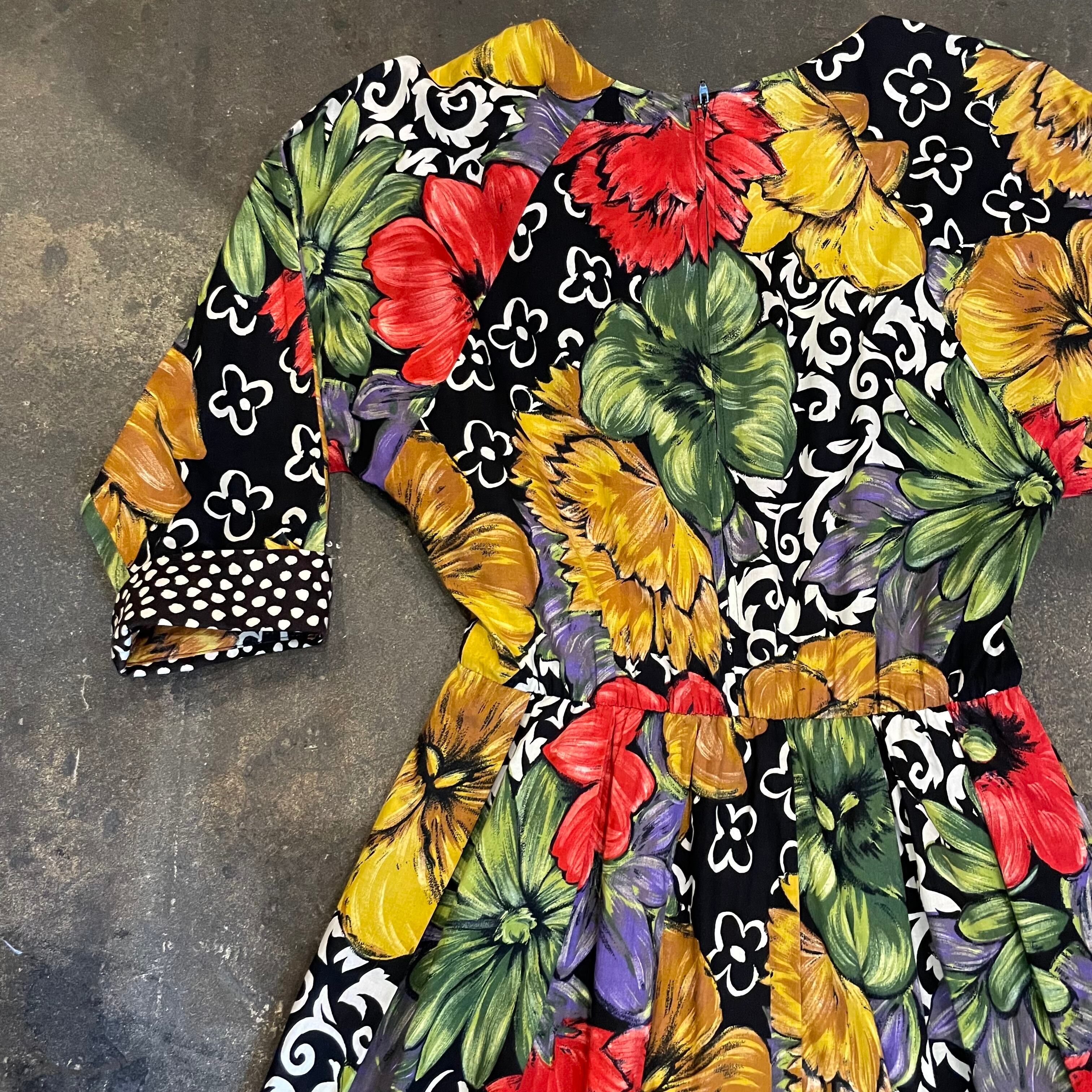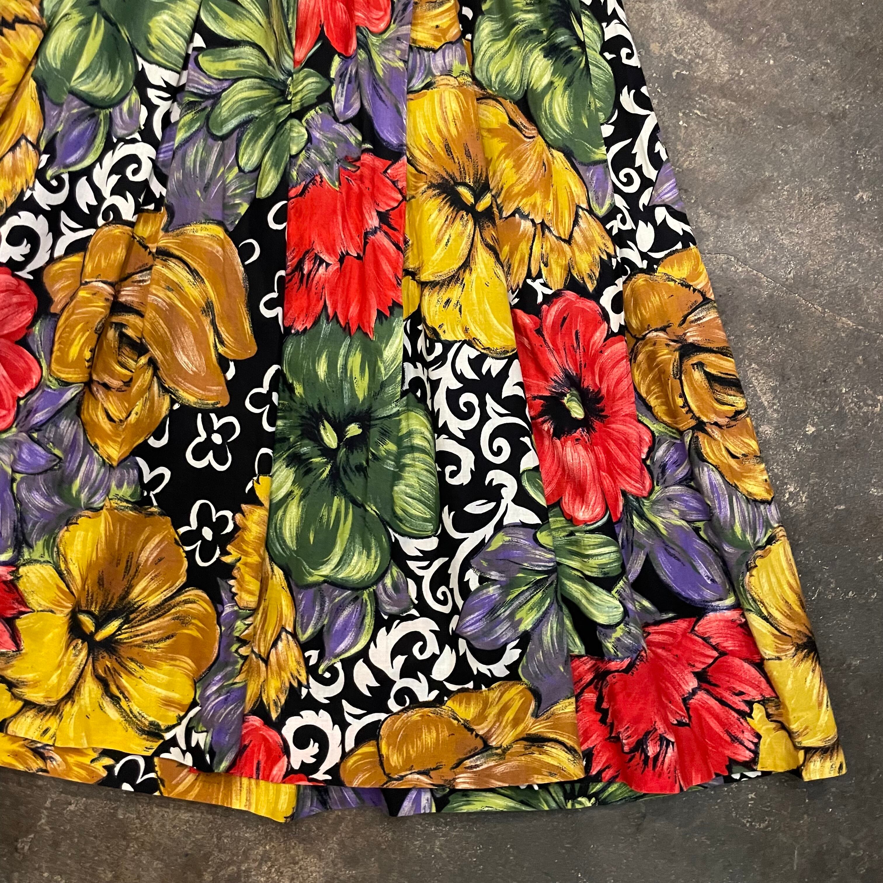 色付きのリアルな花柄と白黒のゆるい花柄と、ドットなど色んな柄の合わせ技がかわいい、80年代ごろのワンピースです。