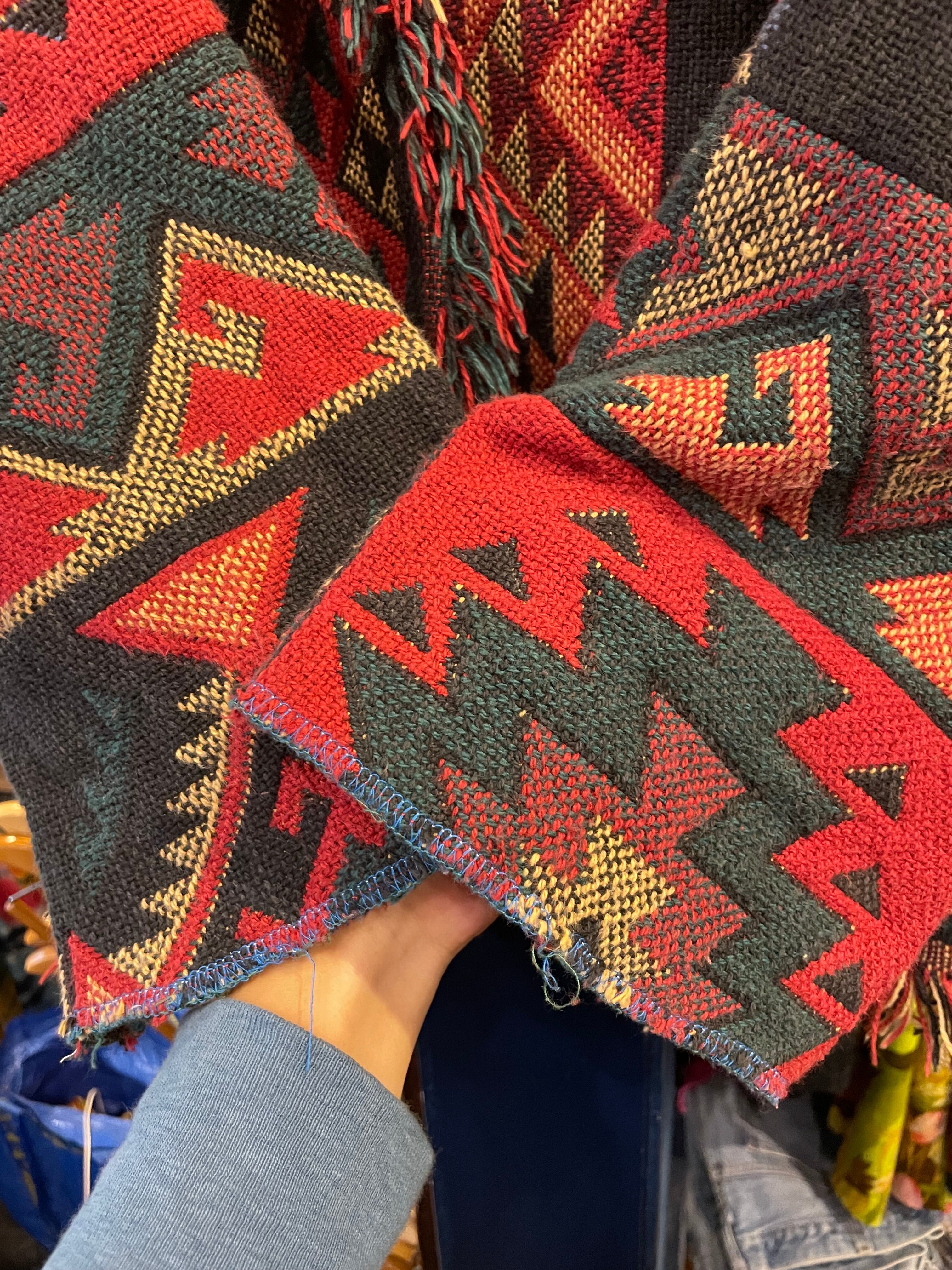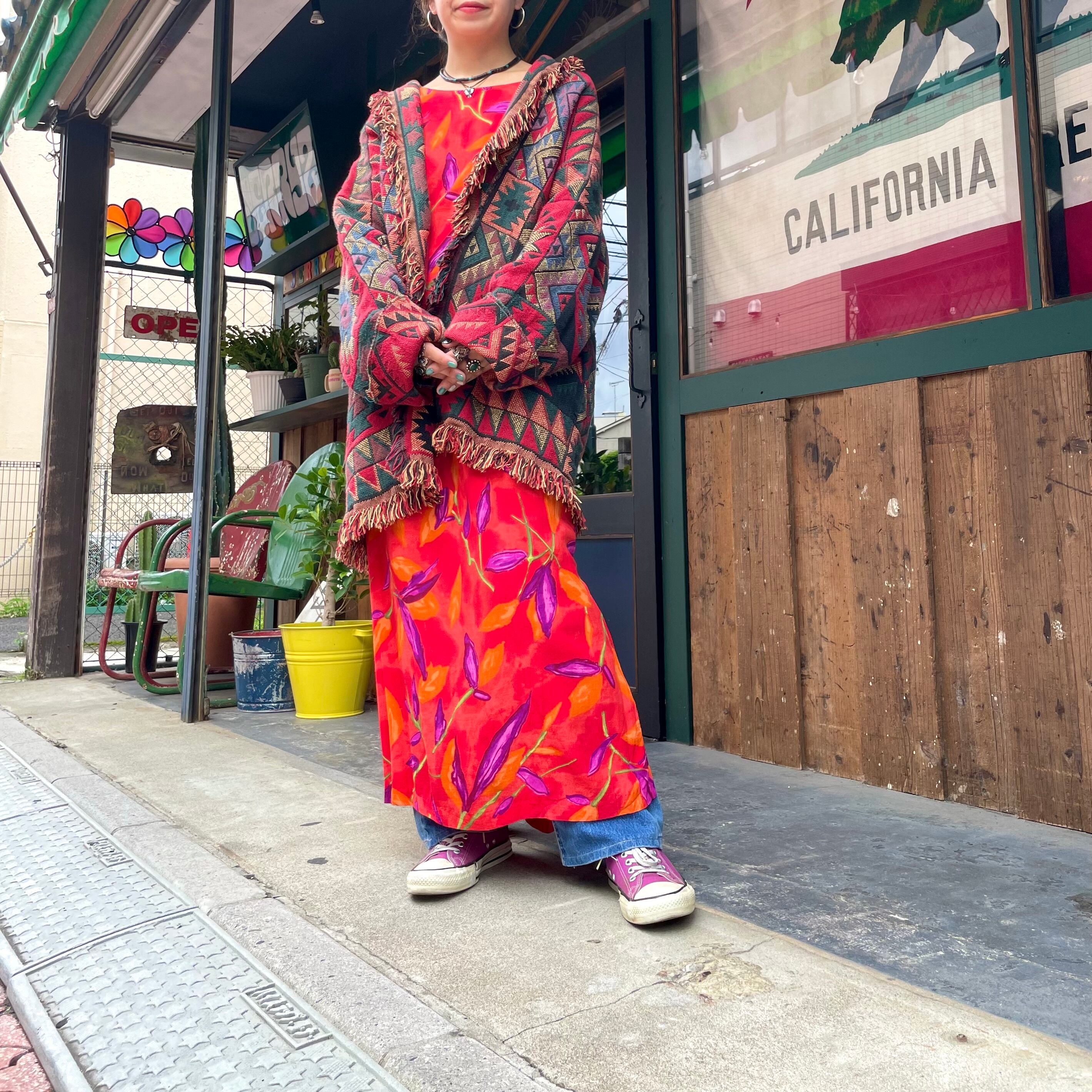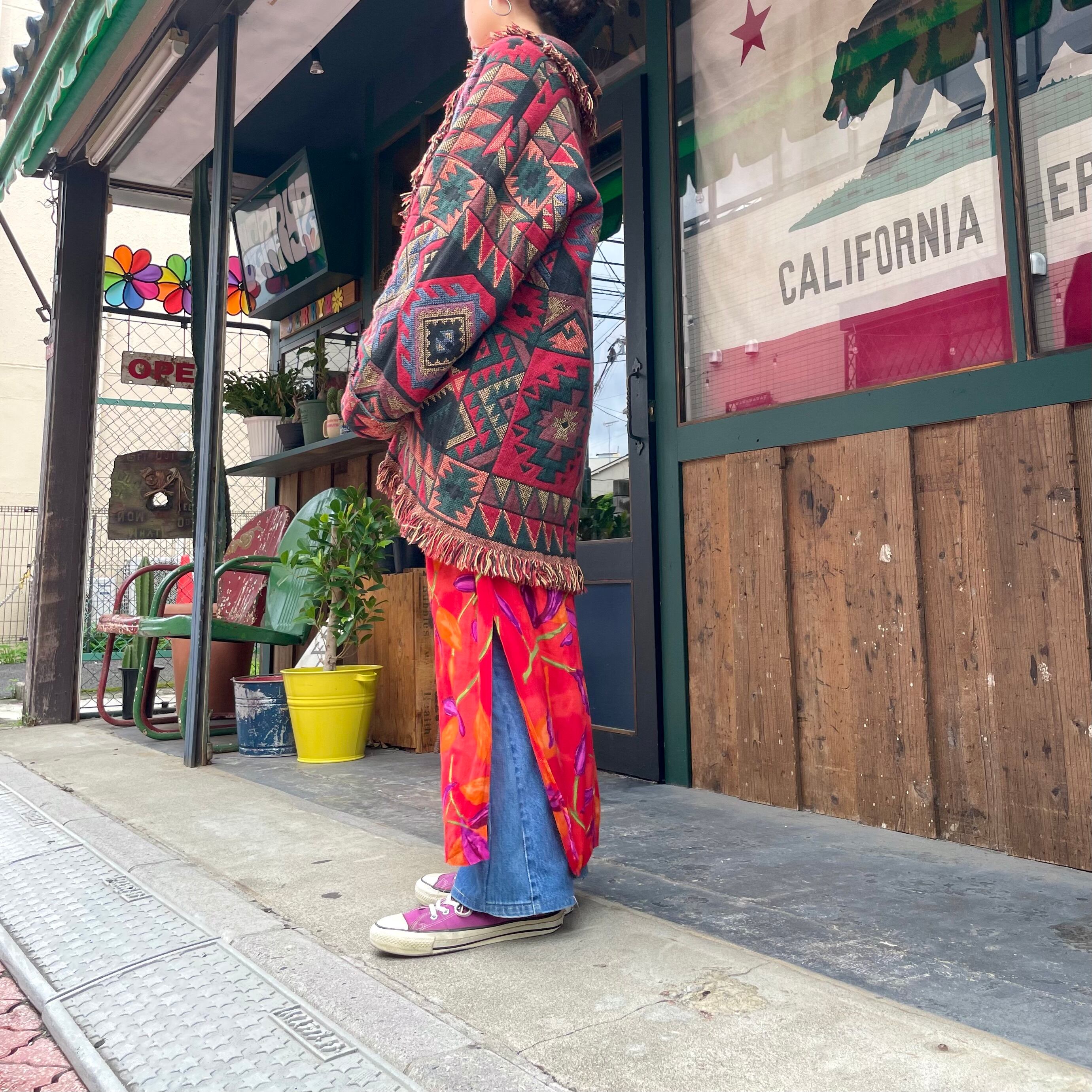 ゆったり大きめなサイズ感で襟ぐり〜裾はフリンジになっていてジプシーな雰囲気のある一着です。