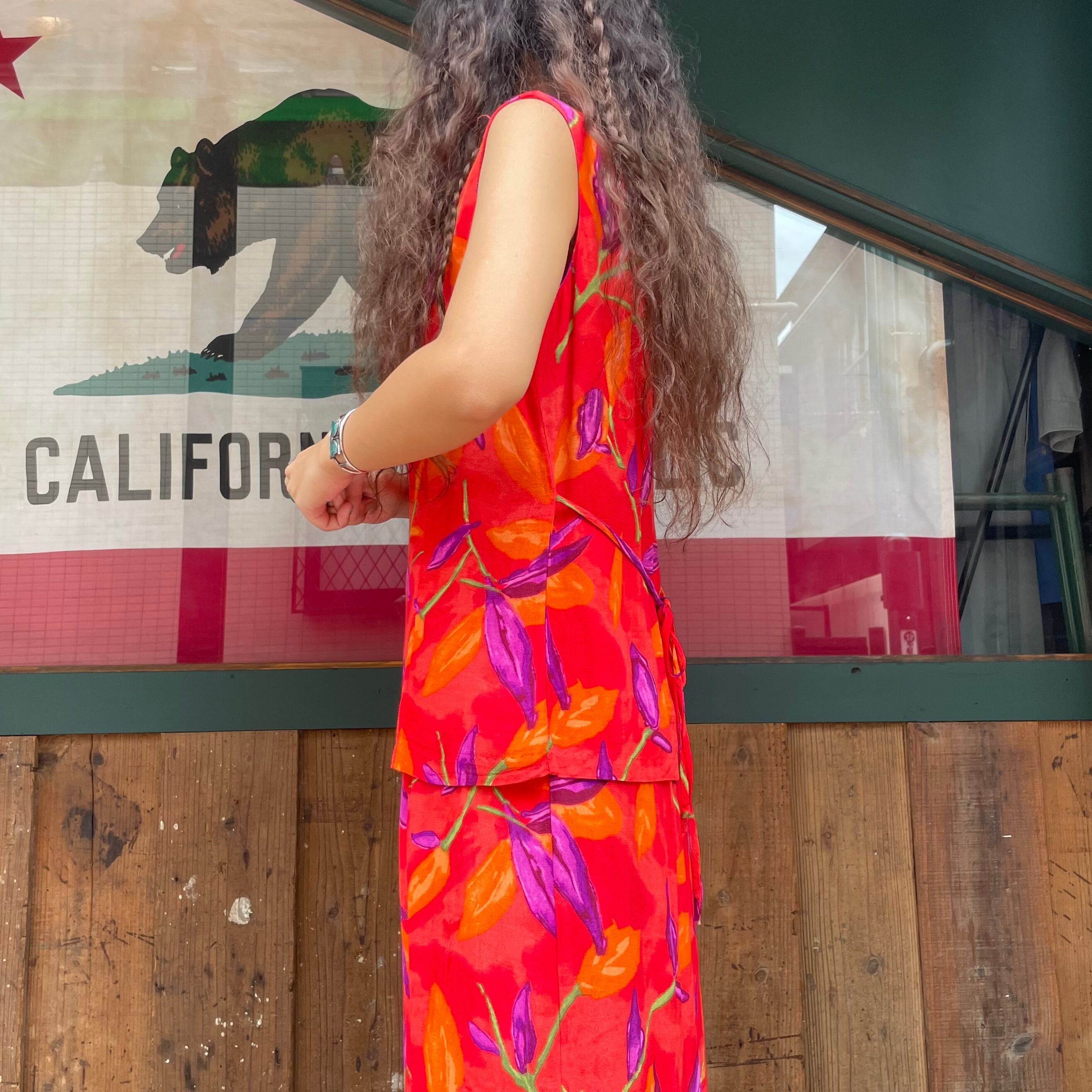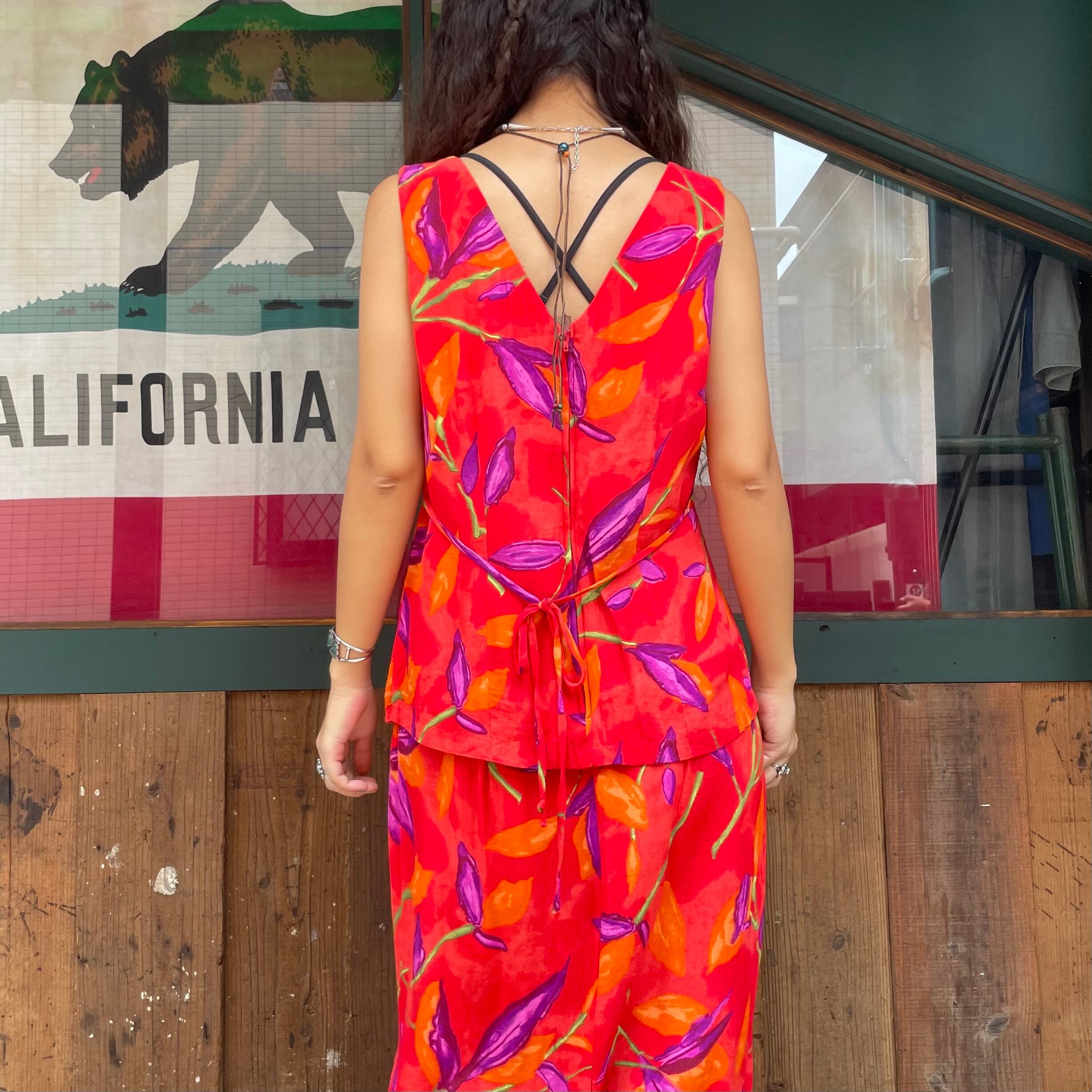 セットアップ風なデザインになっていて、背中が程よく広めに開いていて大人っぽいデザインです。花柄もシュッと落ち着いた雰囲気ですね。