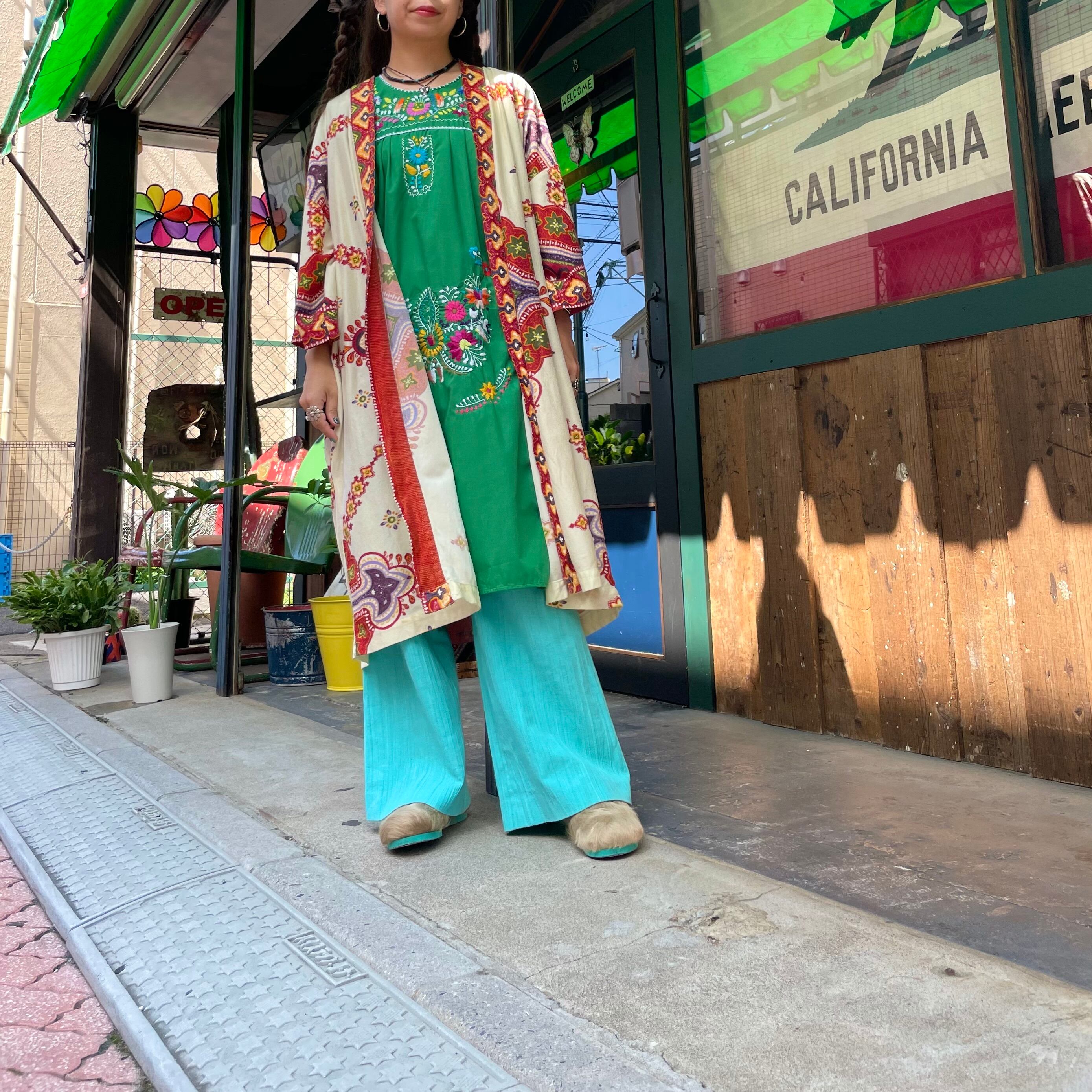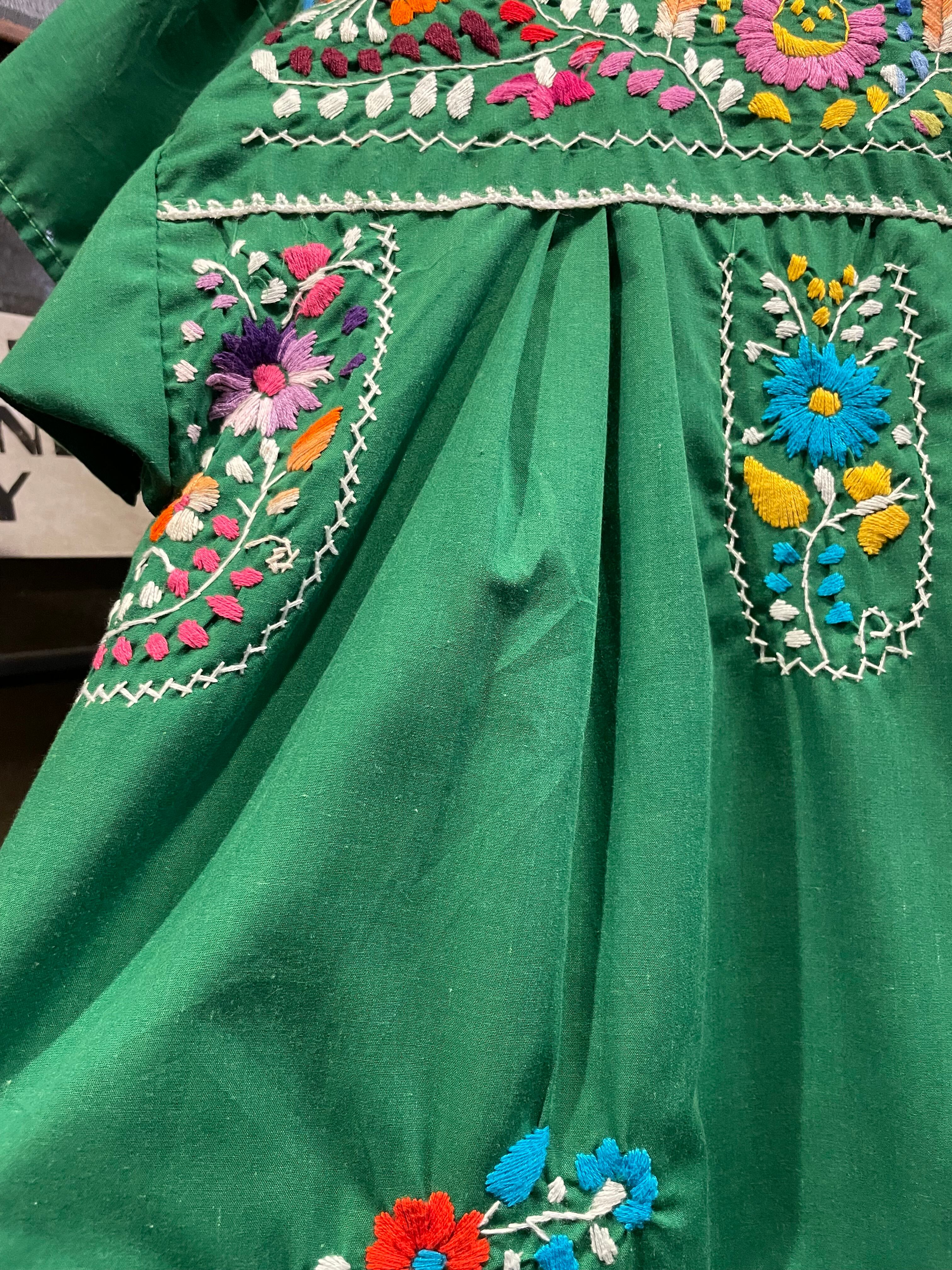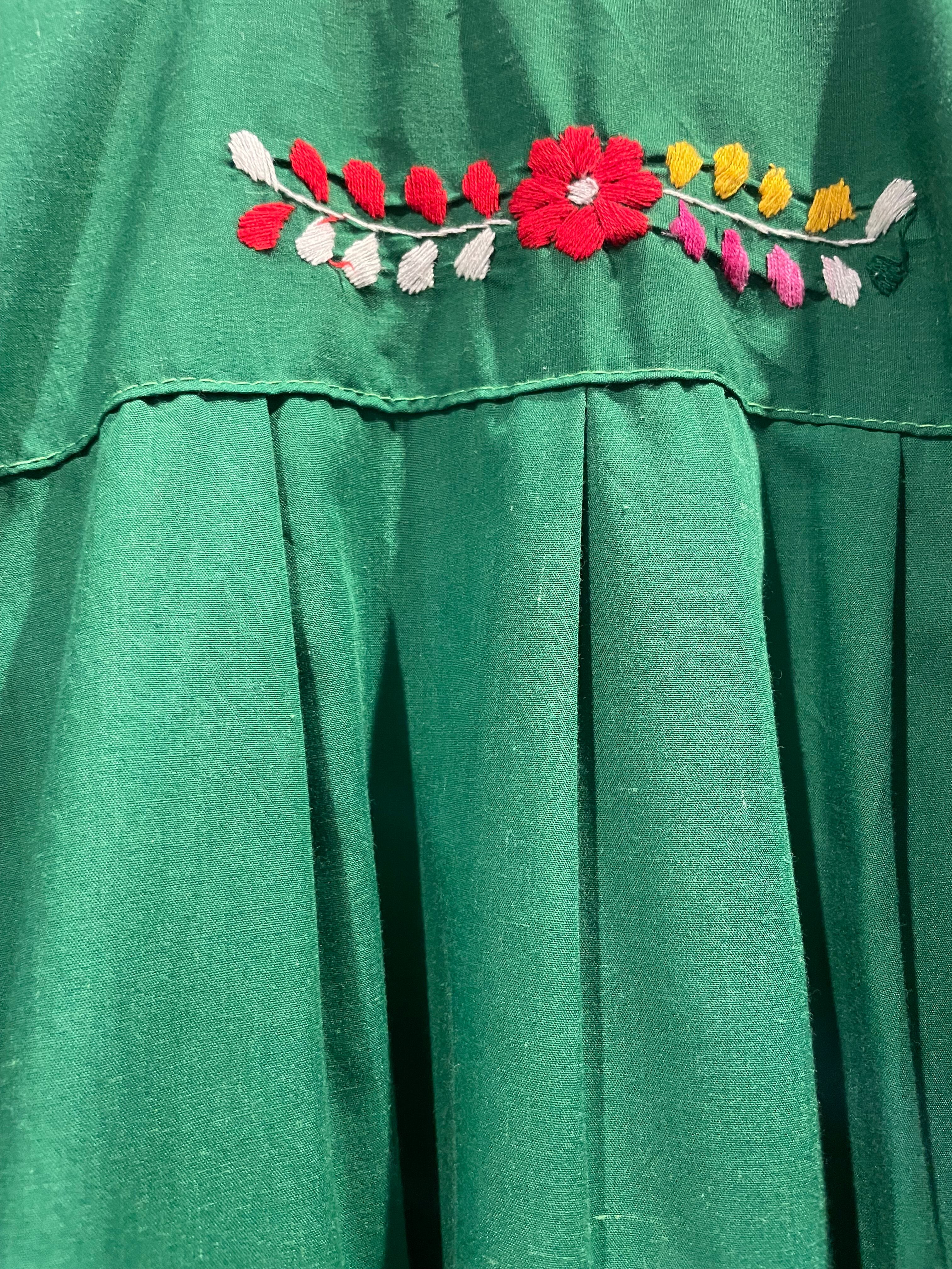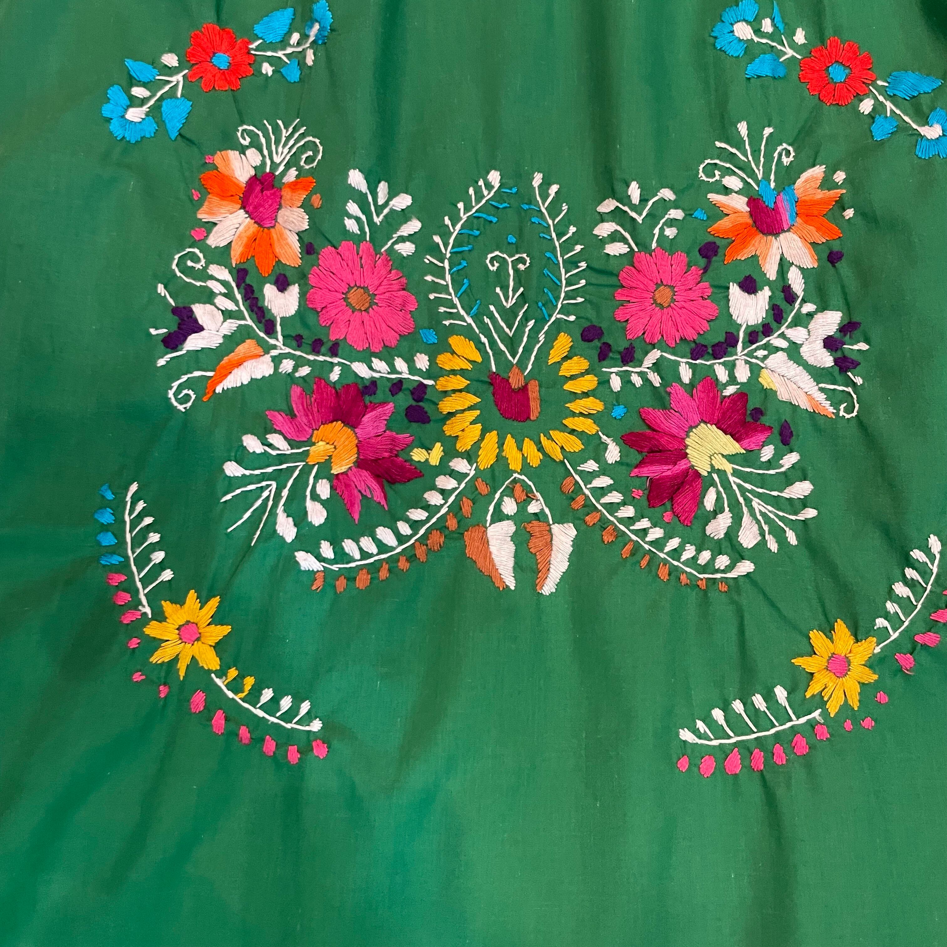 鮮やかなグリーンベースにカラフルな刺繍が映えてとても素敵な一枚です。