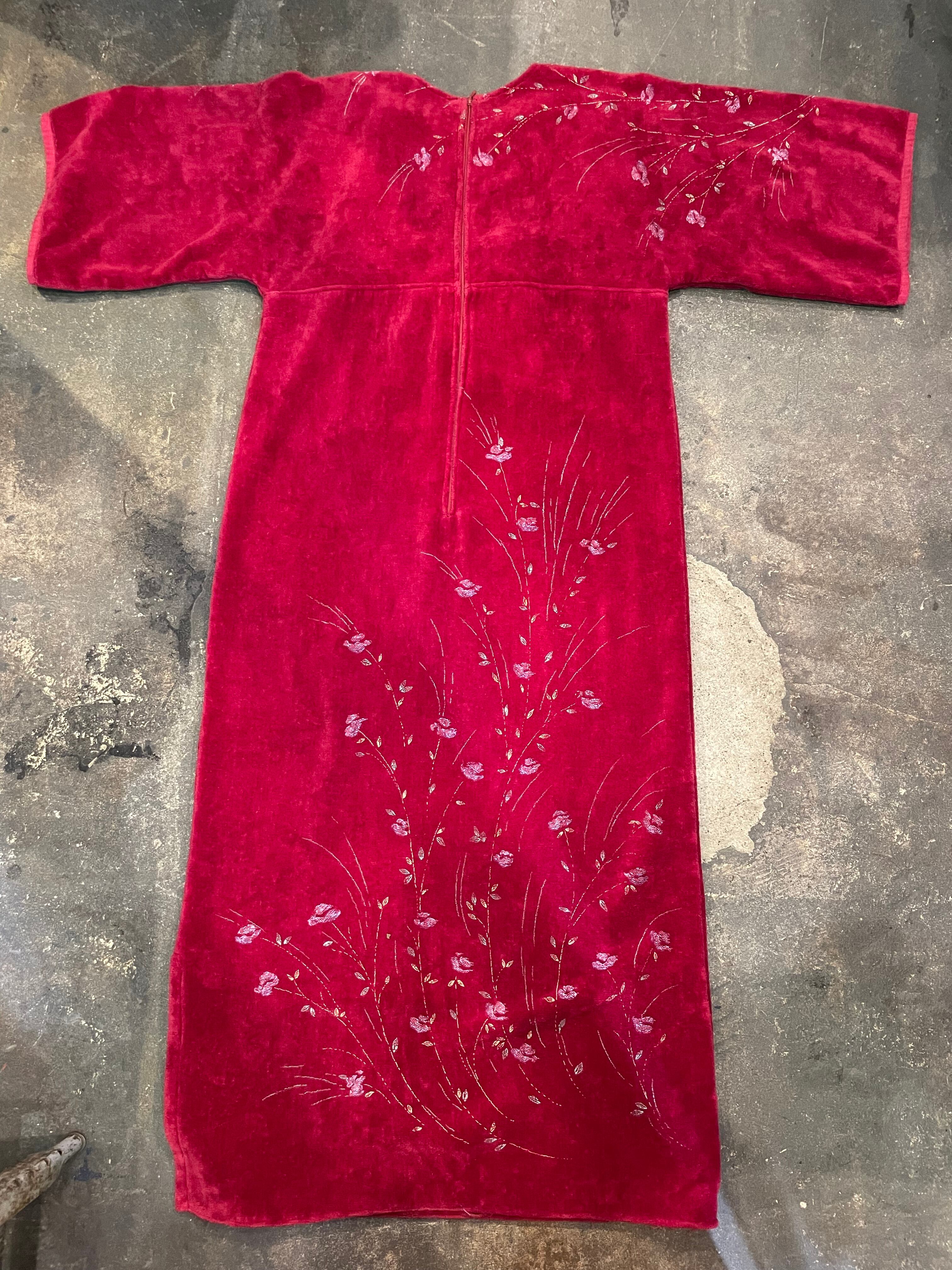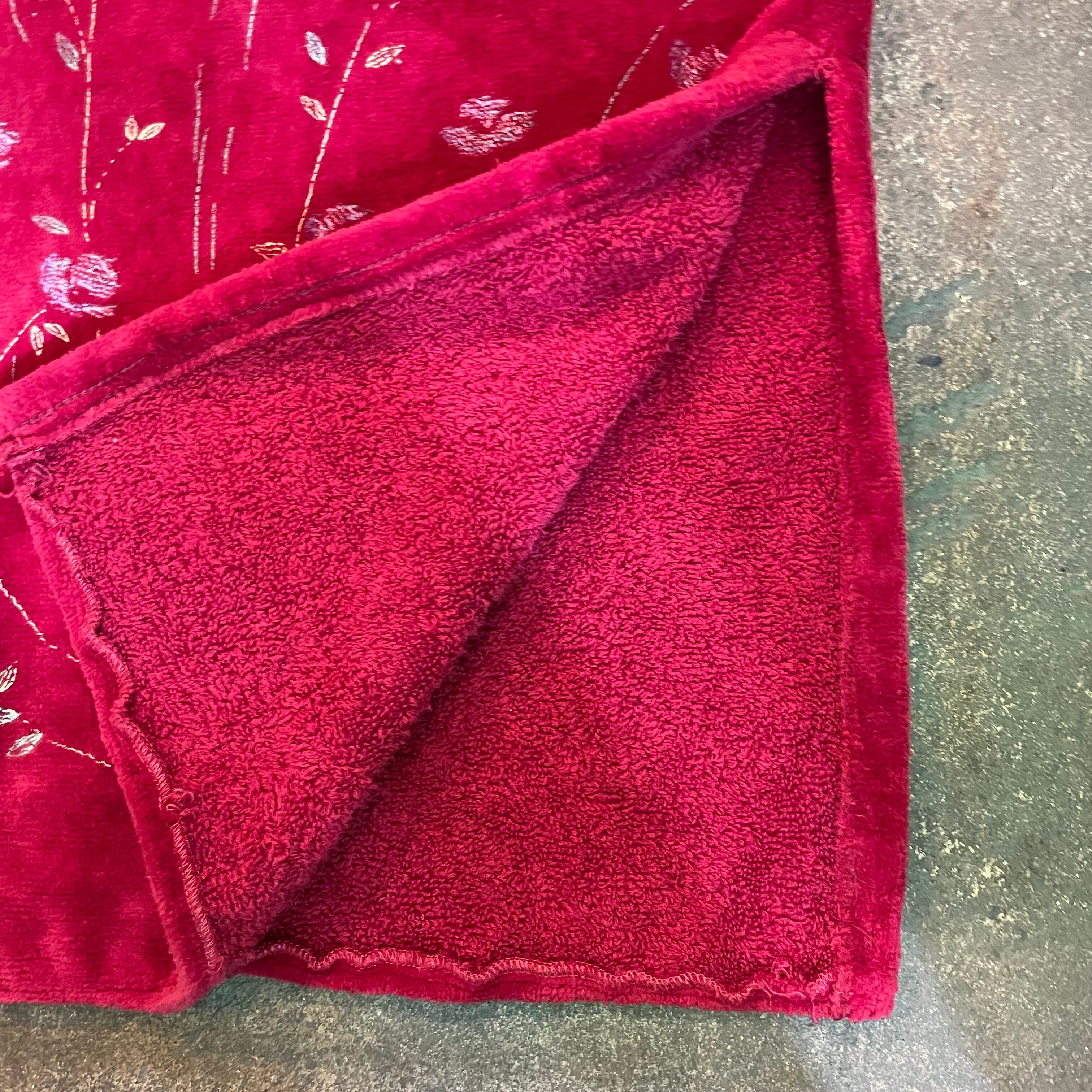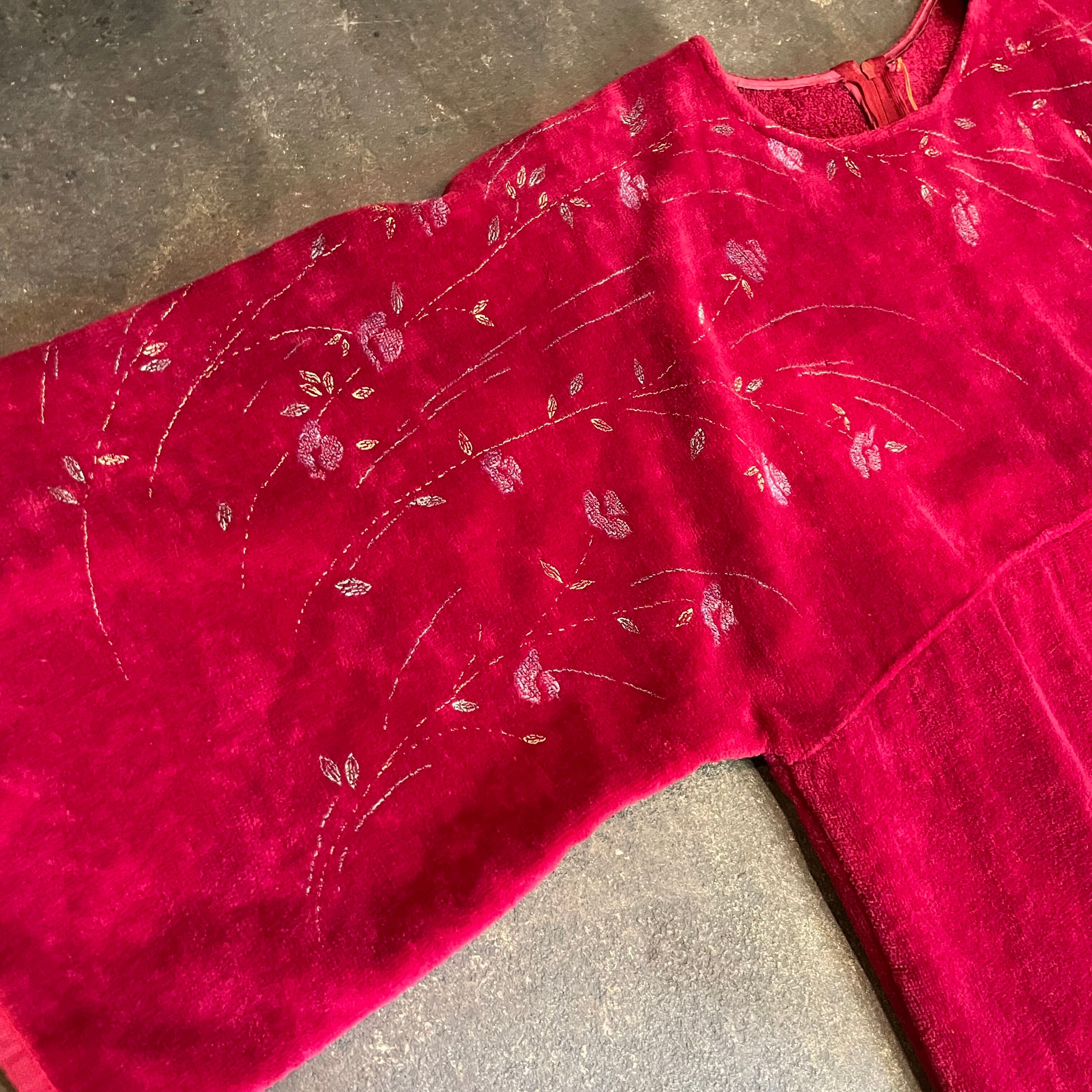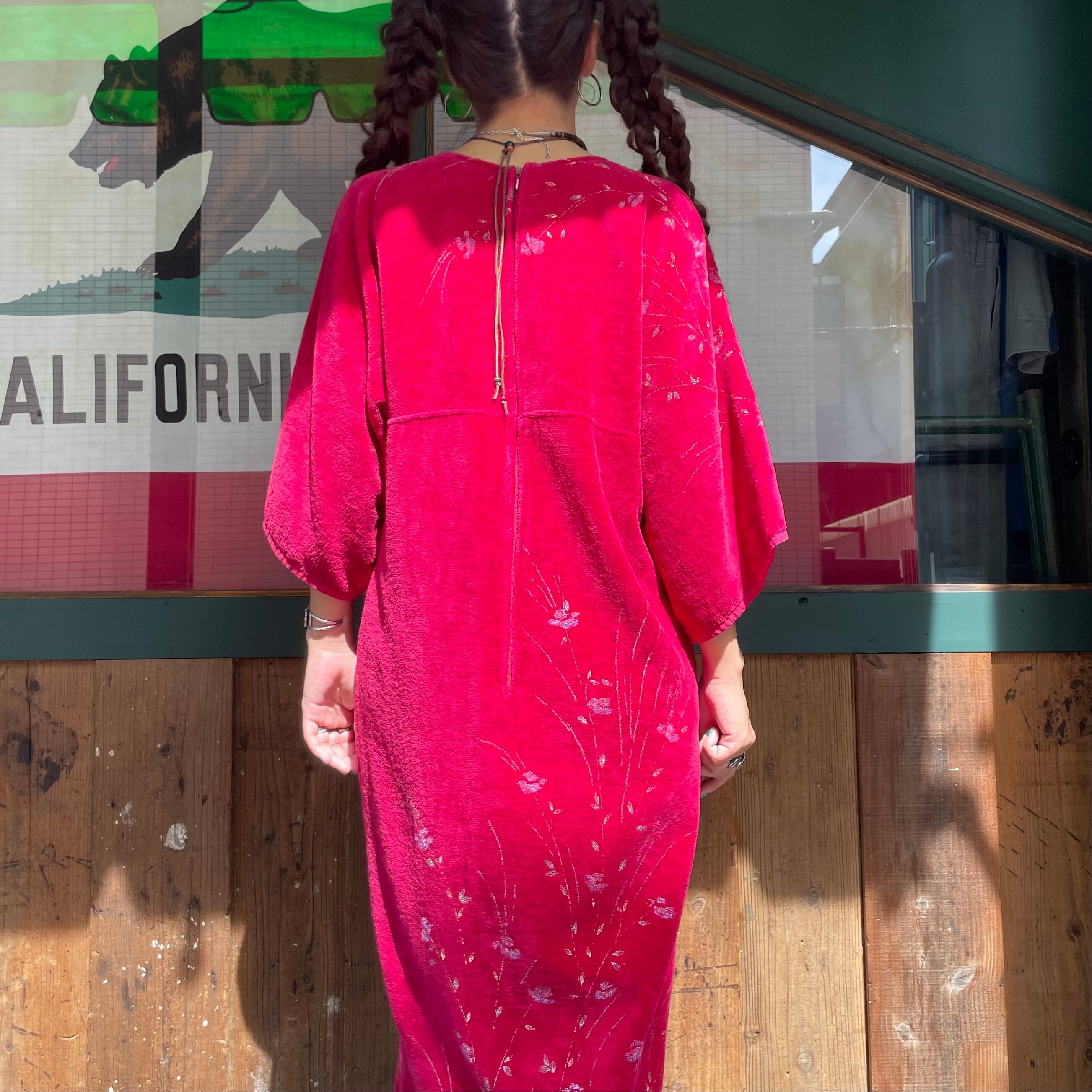 ワインレッドな色に落ち着いた花柄がとても大人っぽい印象ですね。着てみるとしっかり厚手のふんわりしたタオルに包まれているような安心感があり、気持ち良い着心地です。