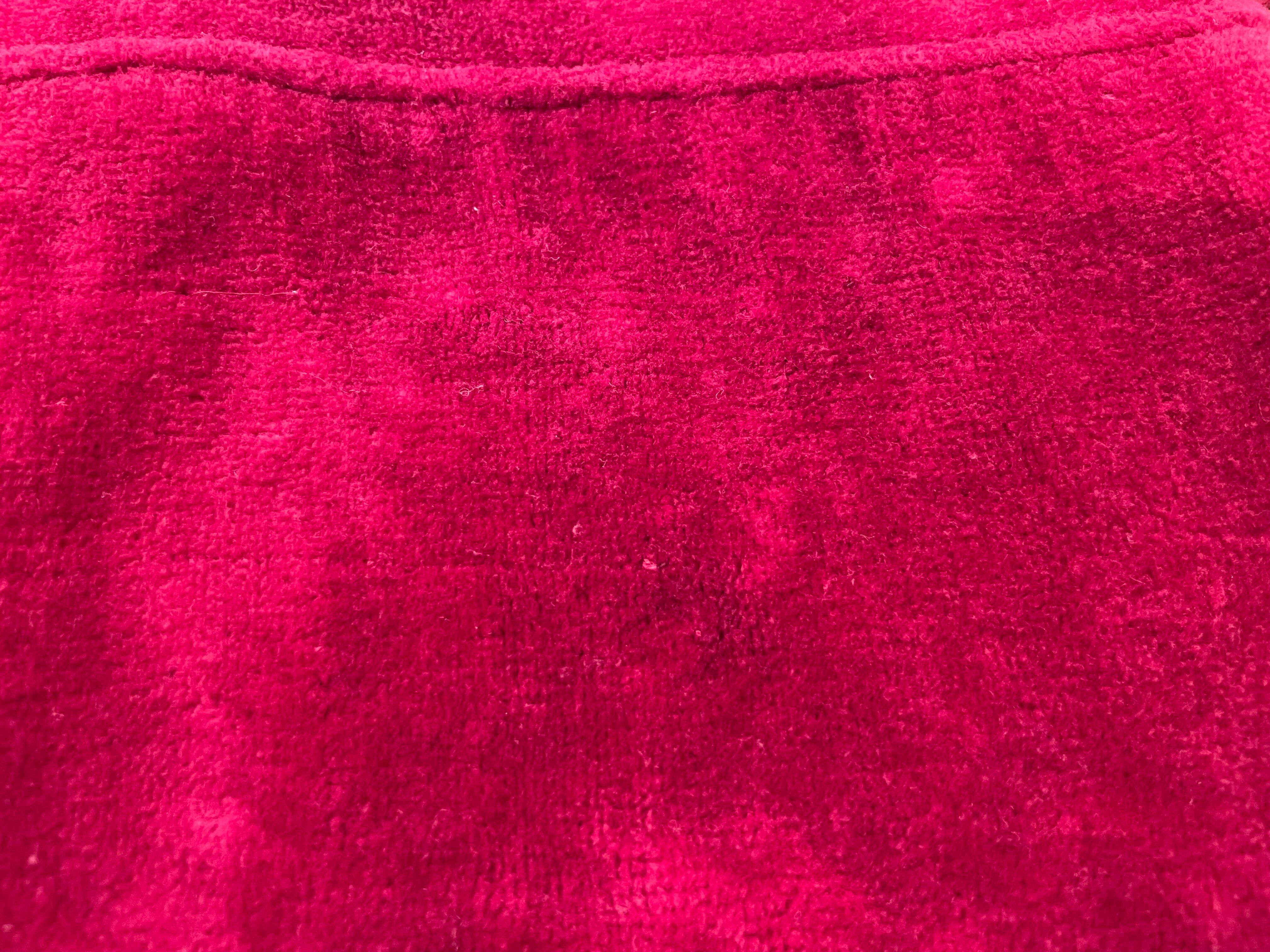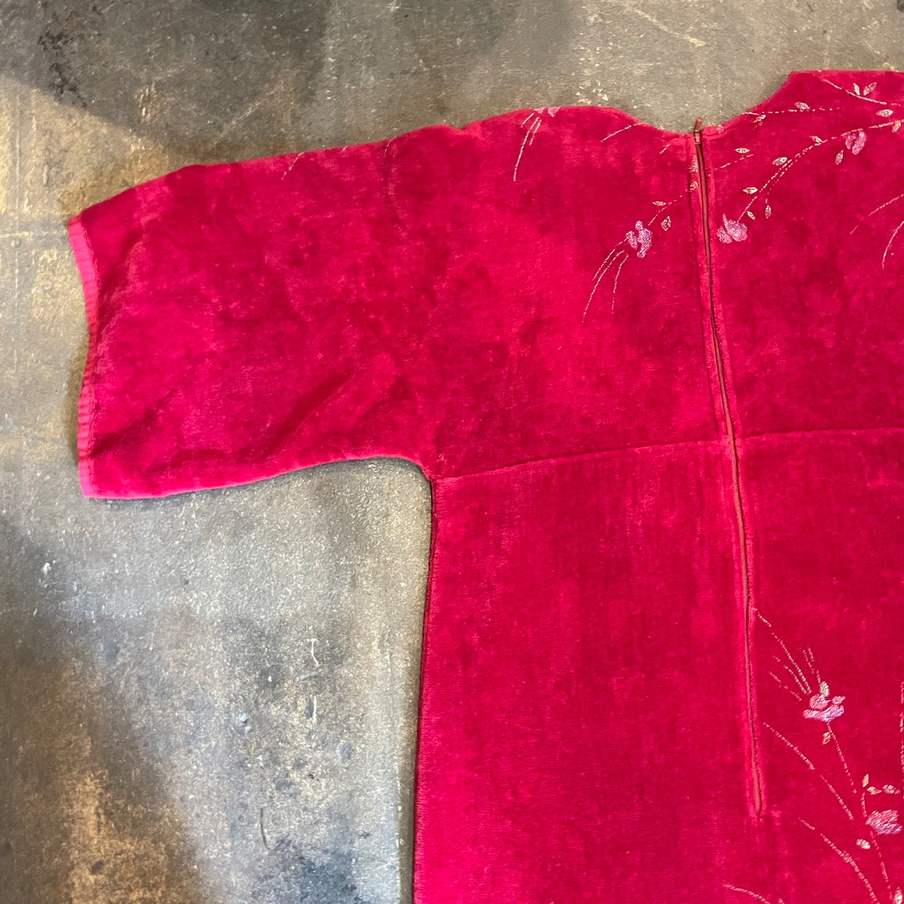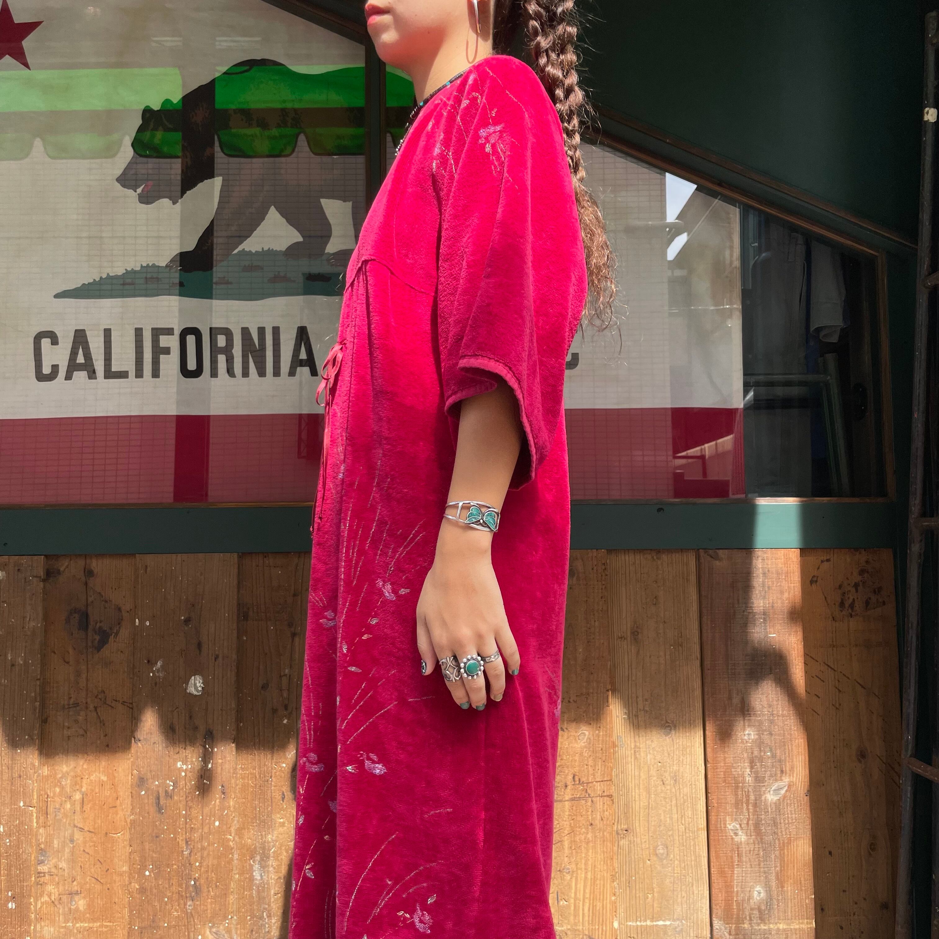 ワインレッドな色に落ち着いた花柄がとても大人っぽい印象ですね。着てみるとしっかり厚手のふんわりしたタオルに包まれているような安心感があり、気持ち良い着心地です。