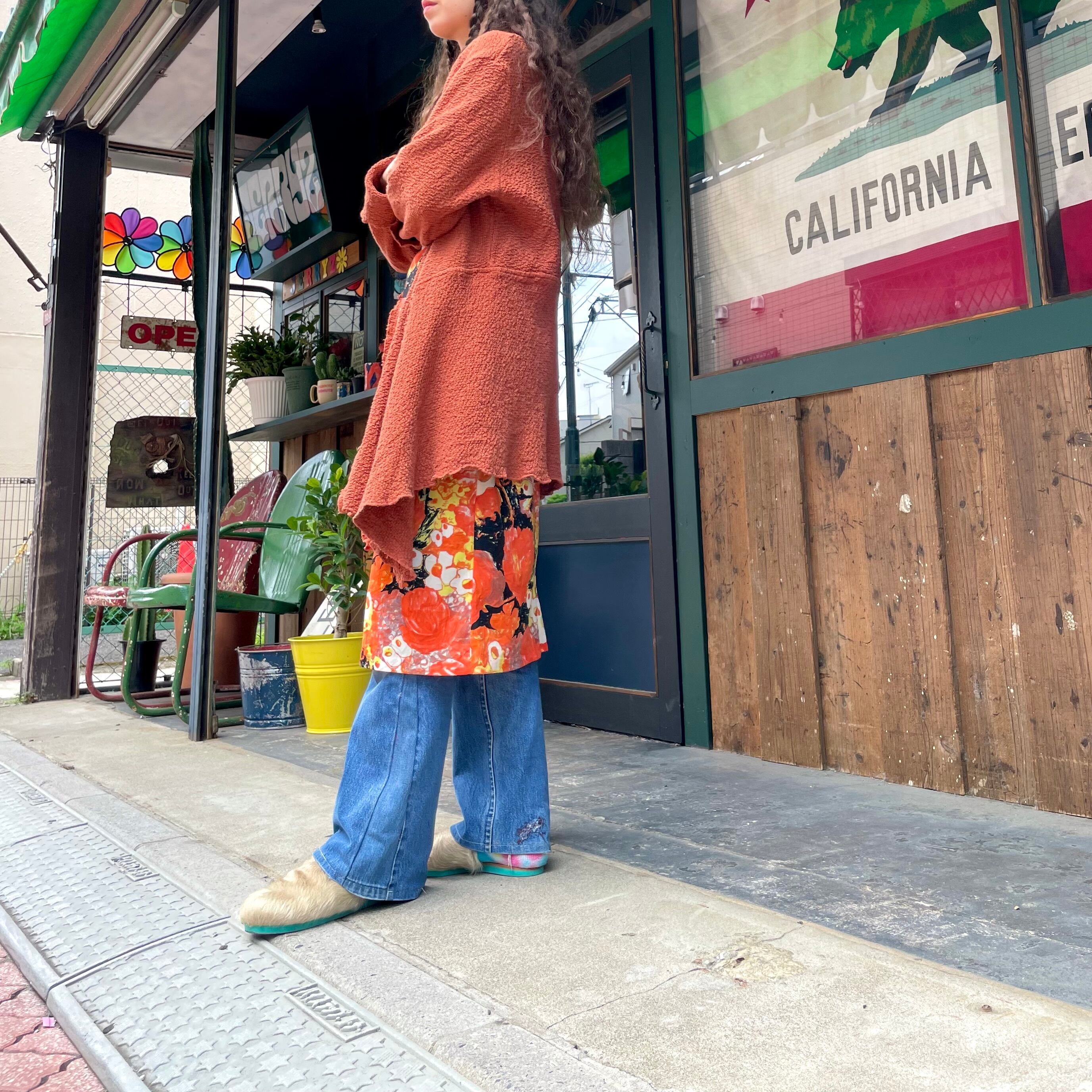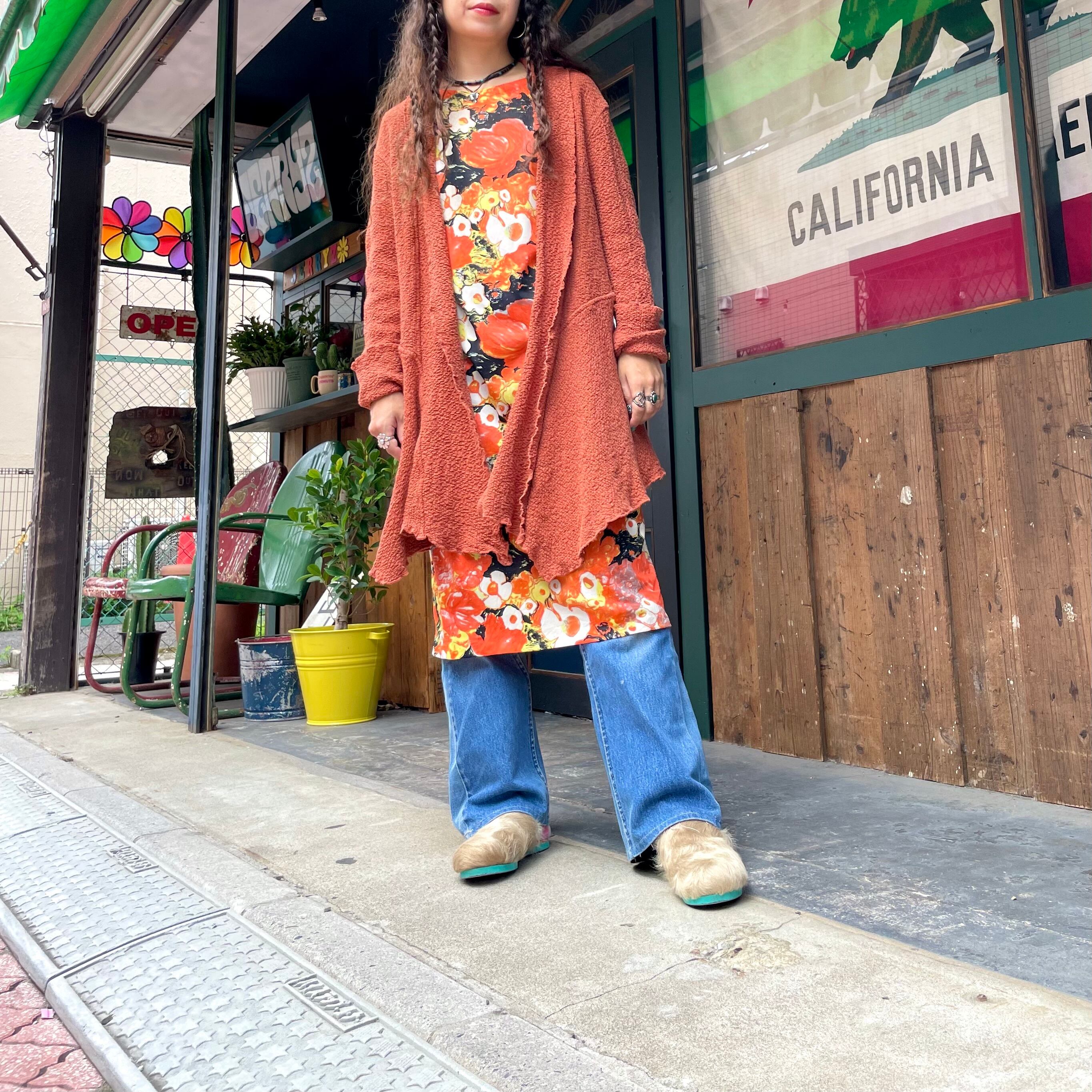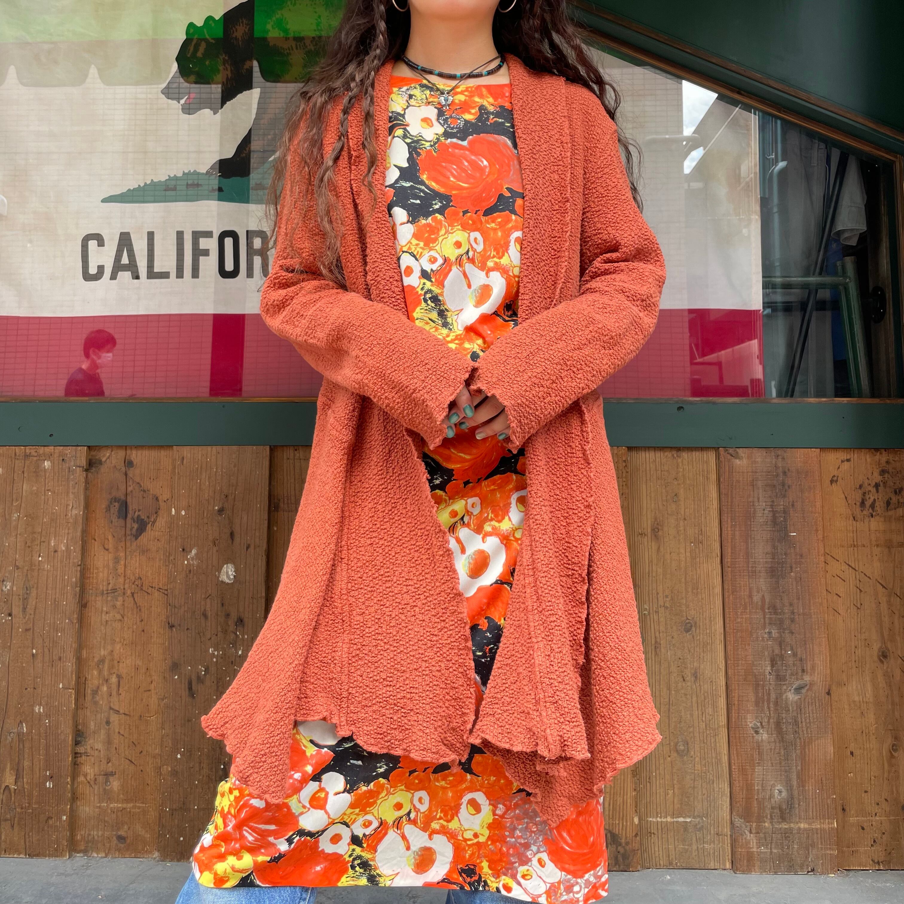 明るい茶色のような暗めのオレンジのような色味と、前裾がヒラヒラっとするパターンがかわいいガウンです。