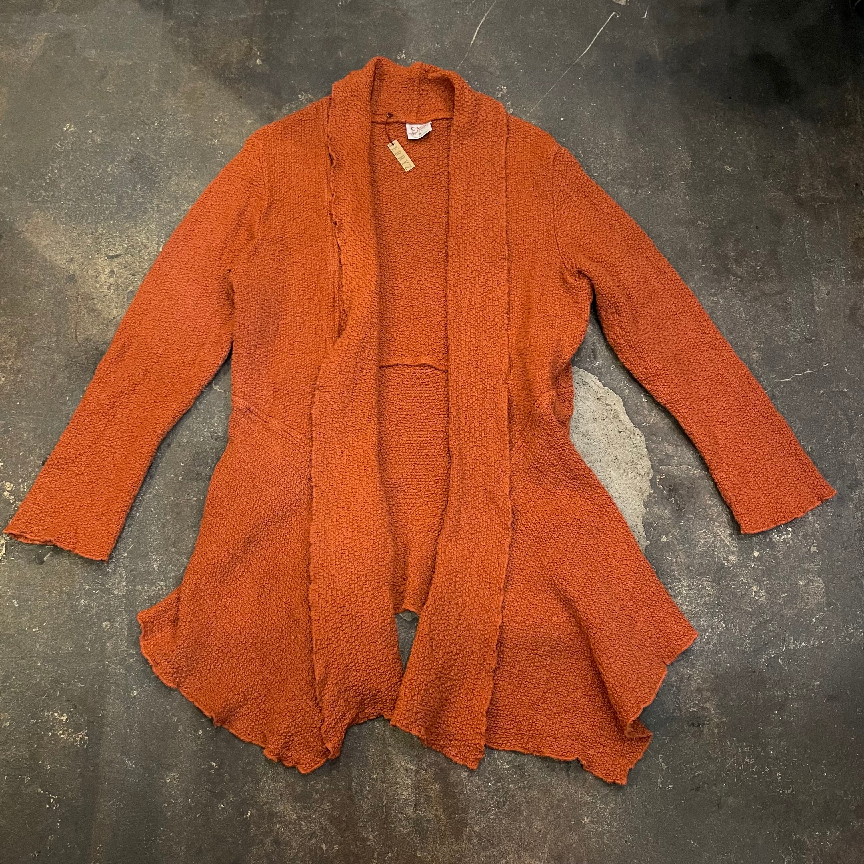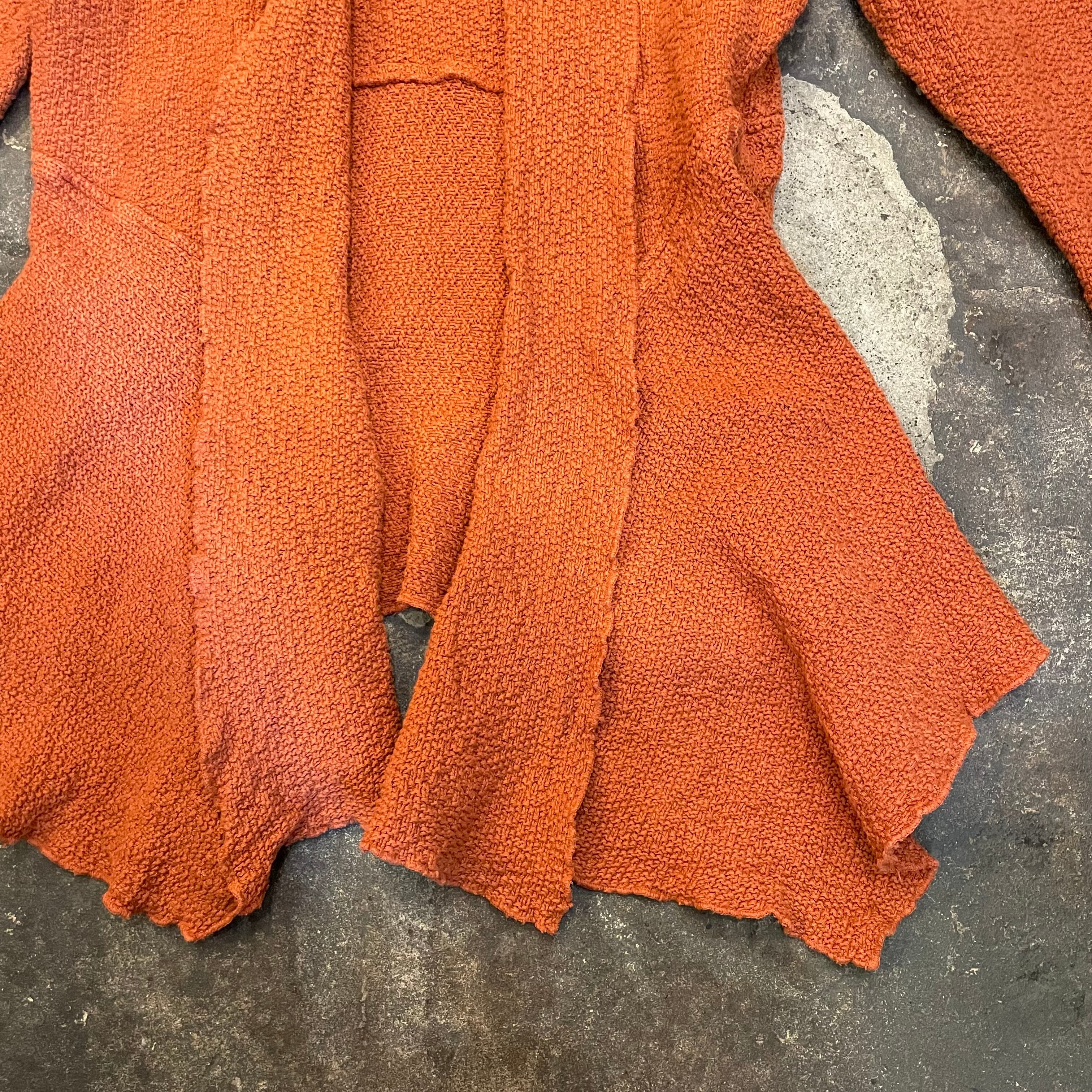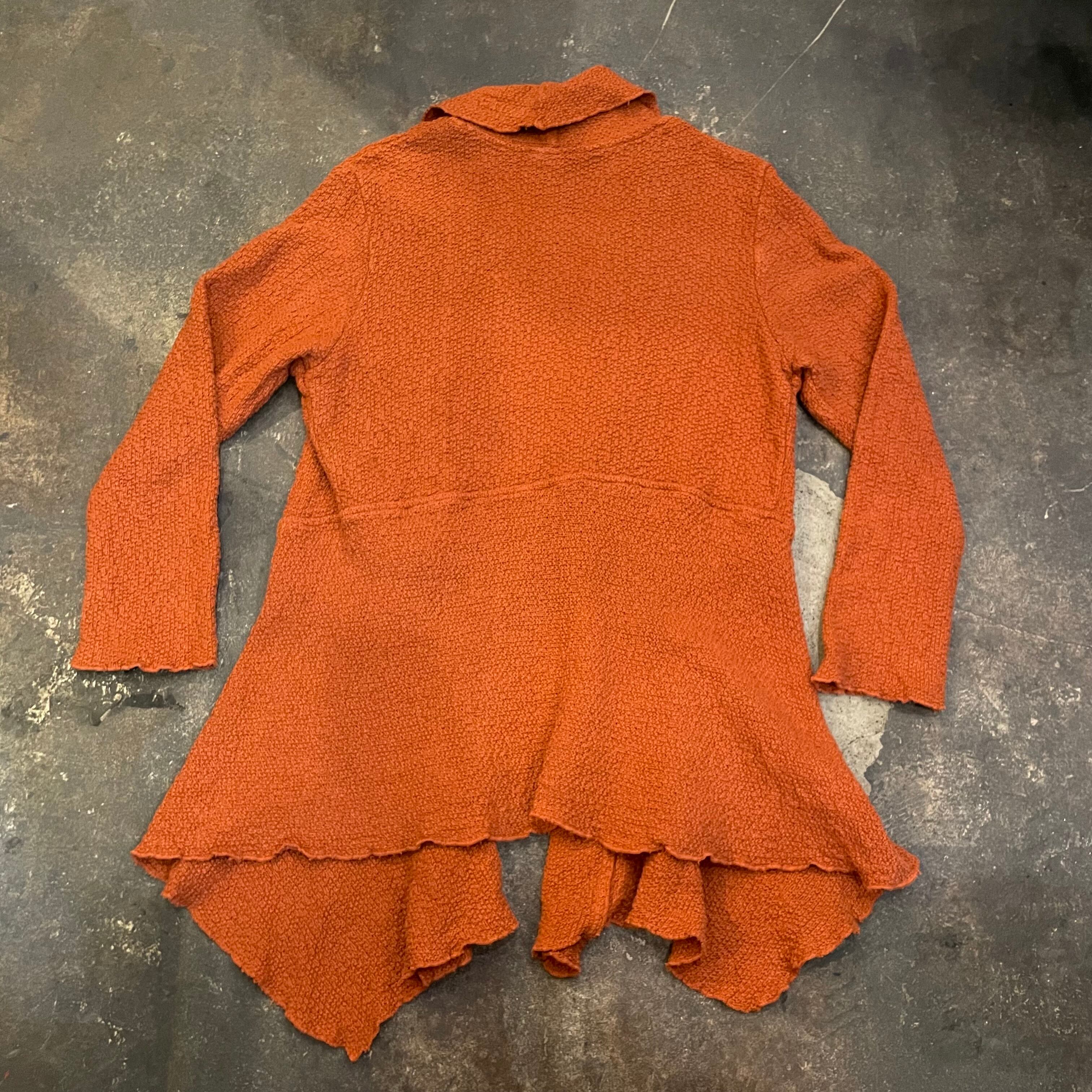 明るい茶色のような暗めのオレンジのような色味と、前裾がヒラヒラっとするパターンがかわいいガウンです。