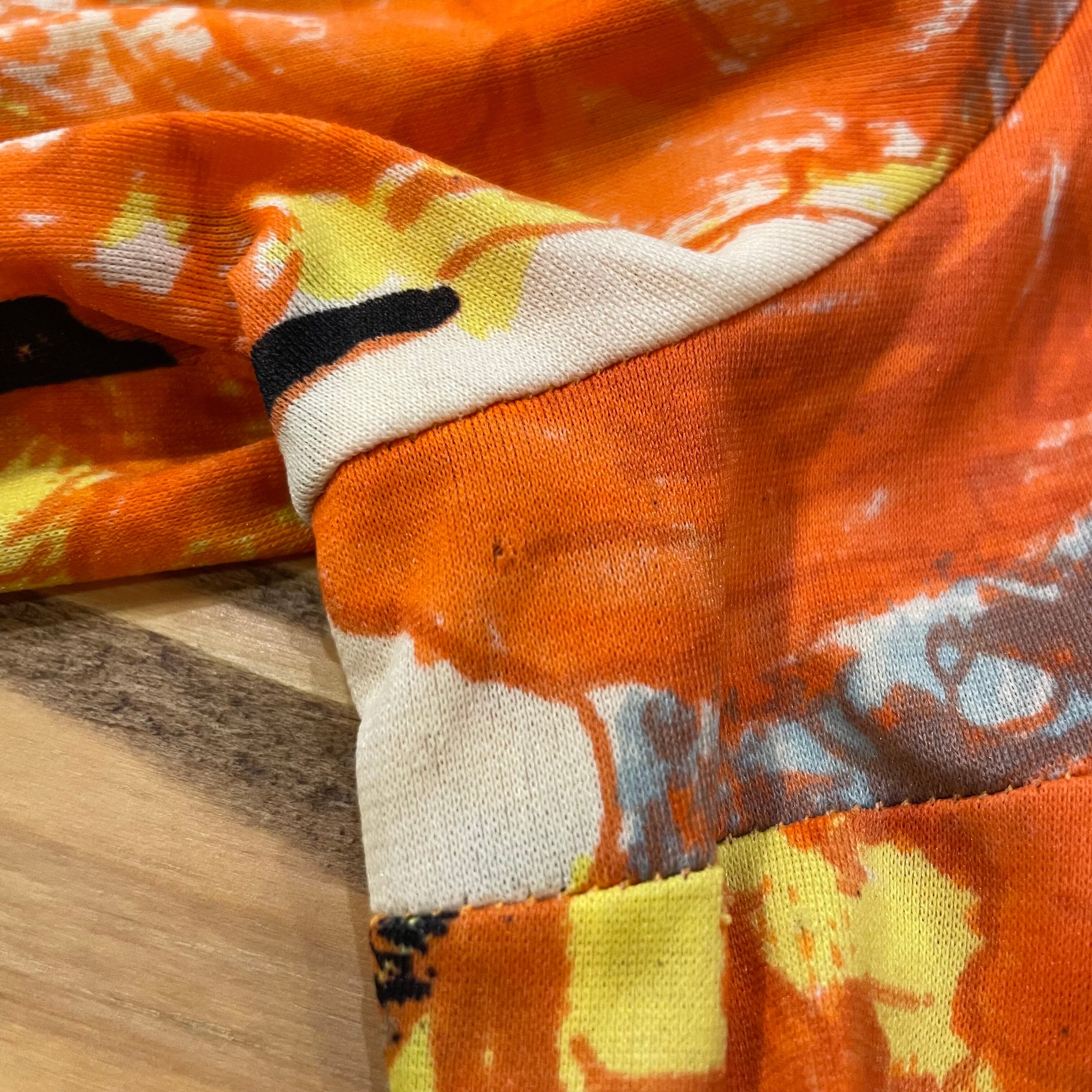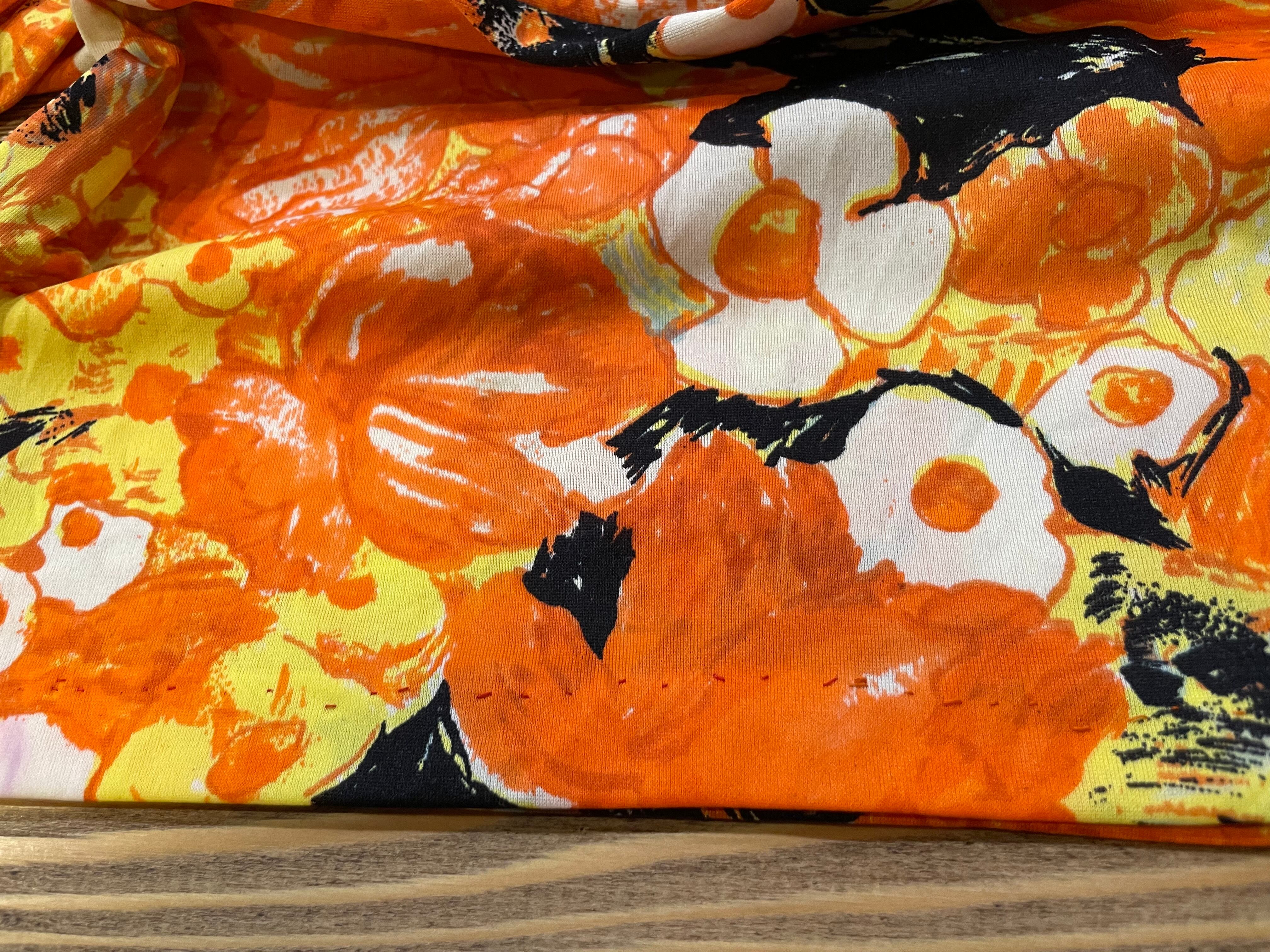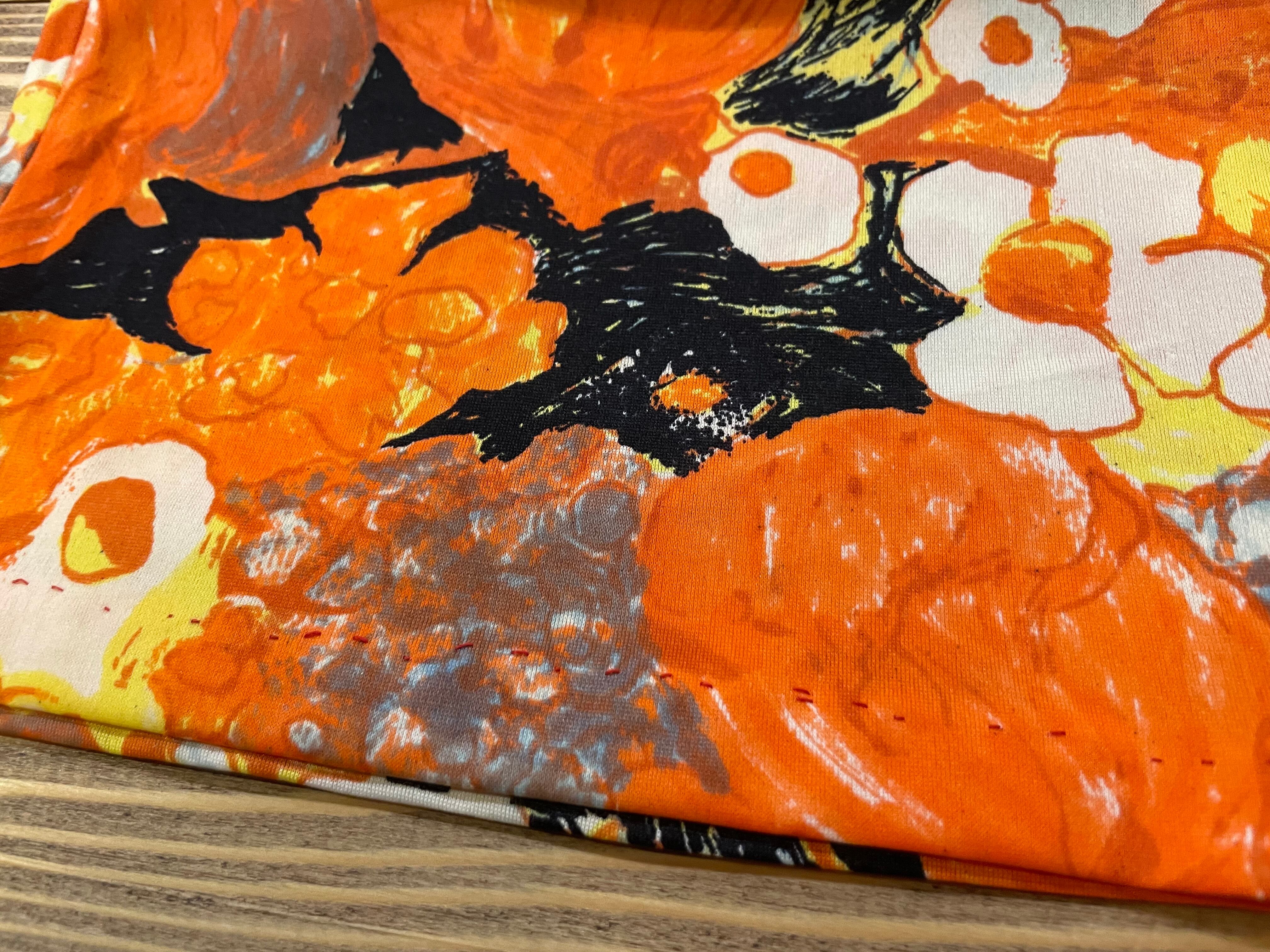 とても薄くて軽く、伸縮性があり楽ちんな一枚です。六部丈くらいの袖も広がらずスッキリしたシルエットも大人っぽい雰囲気で、柄とのバランスが良いですね!