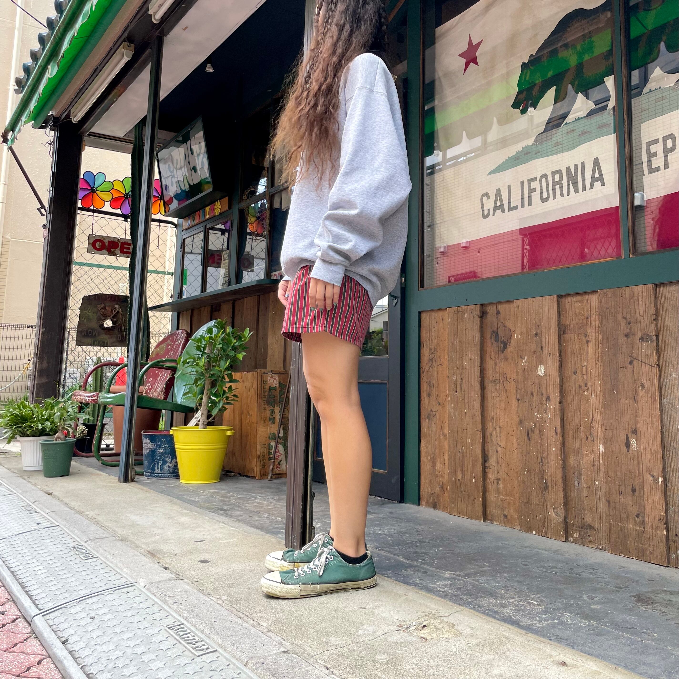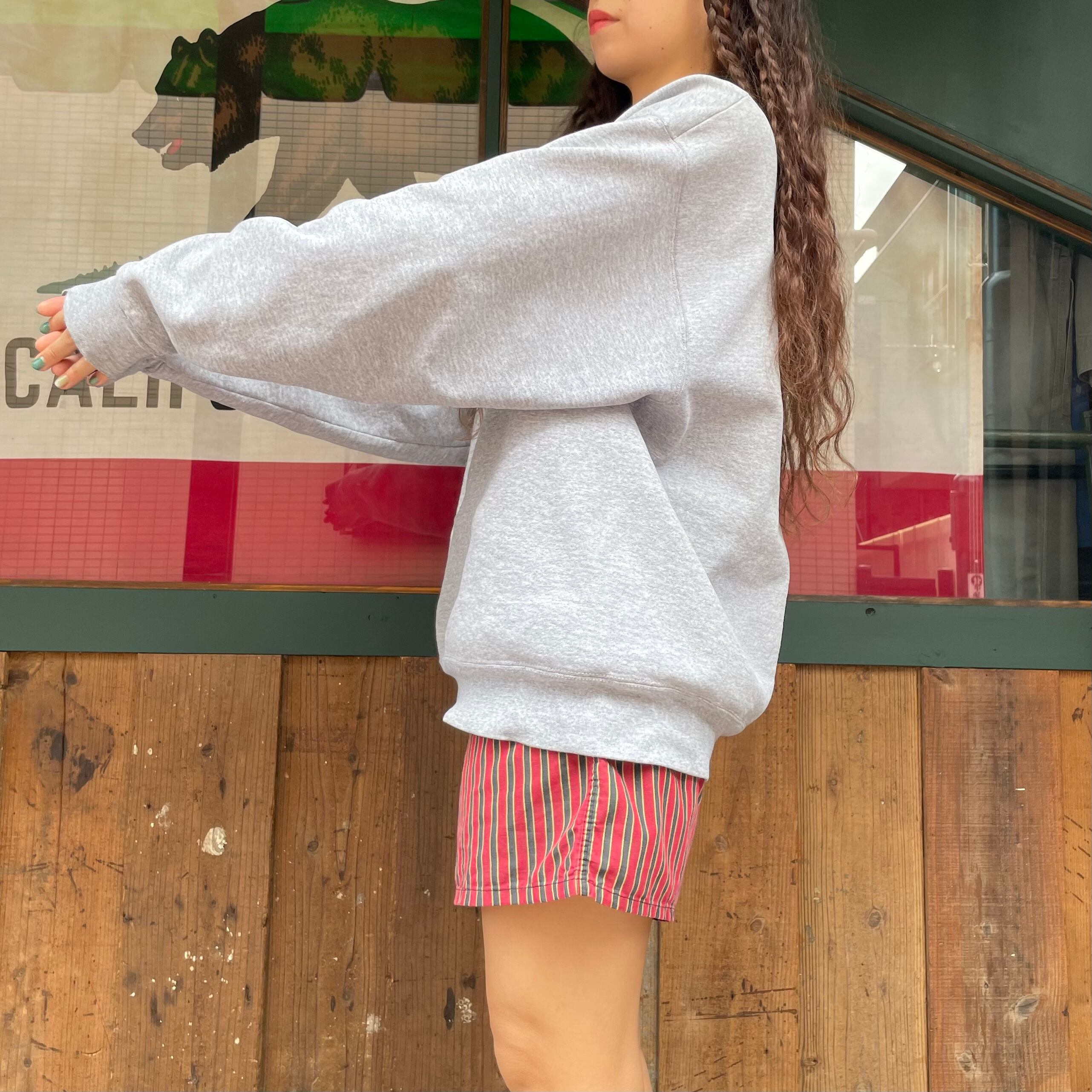 グレーのスウェットは何にでも合わせやすいですし、かなり使える一枚かと思います。真っ赤なパンツやスカートでキャップをかぶったり、ポップなコーディネートも良いですね!