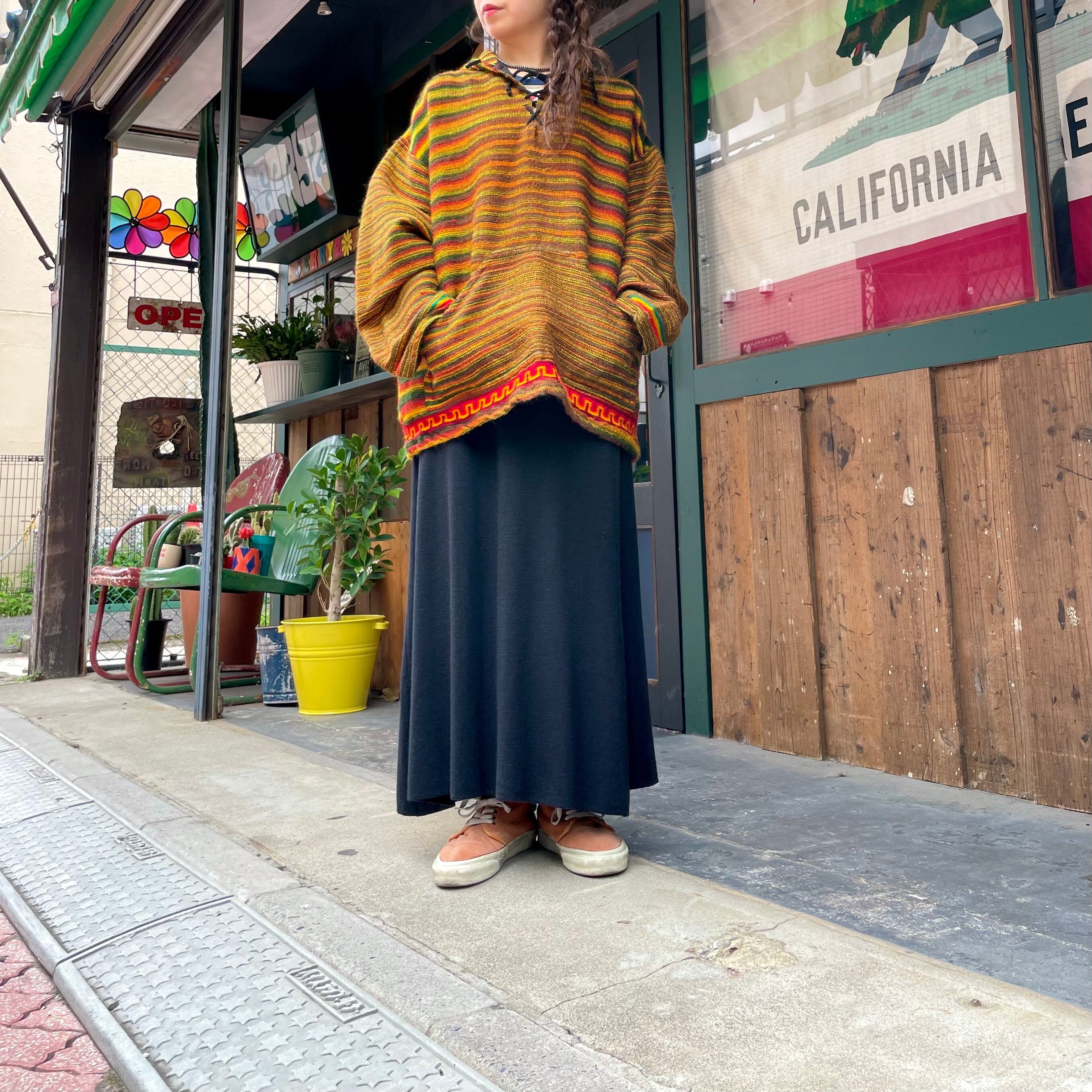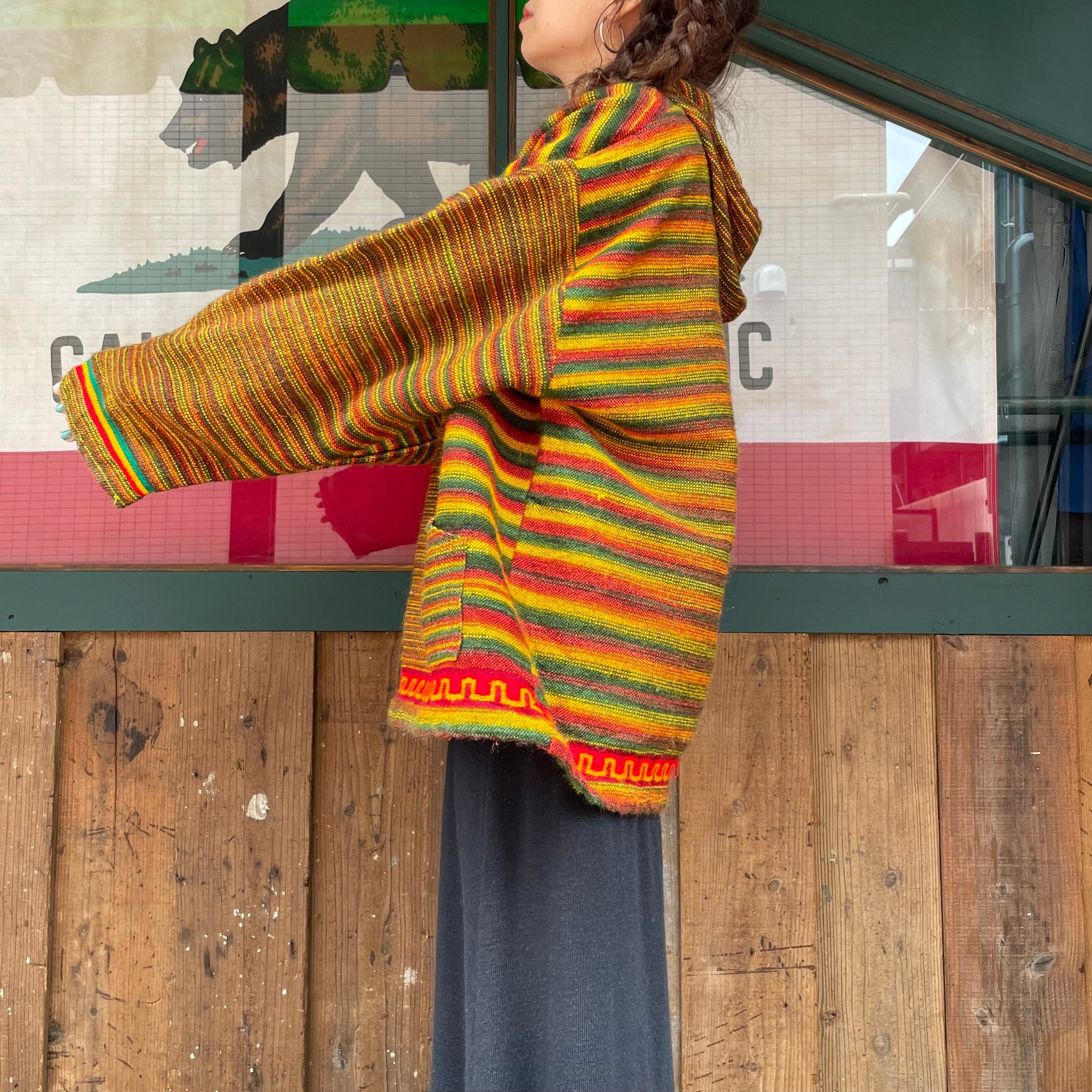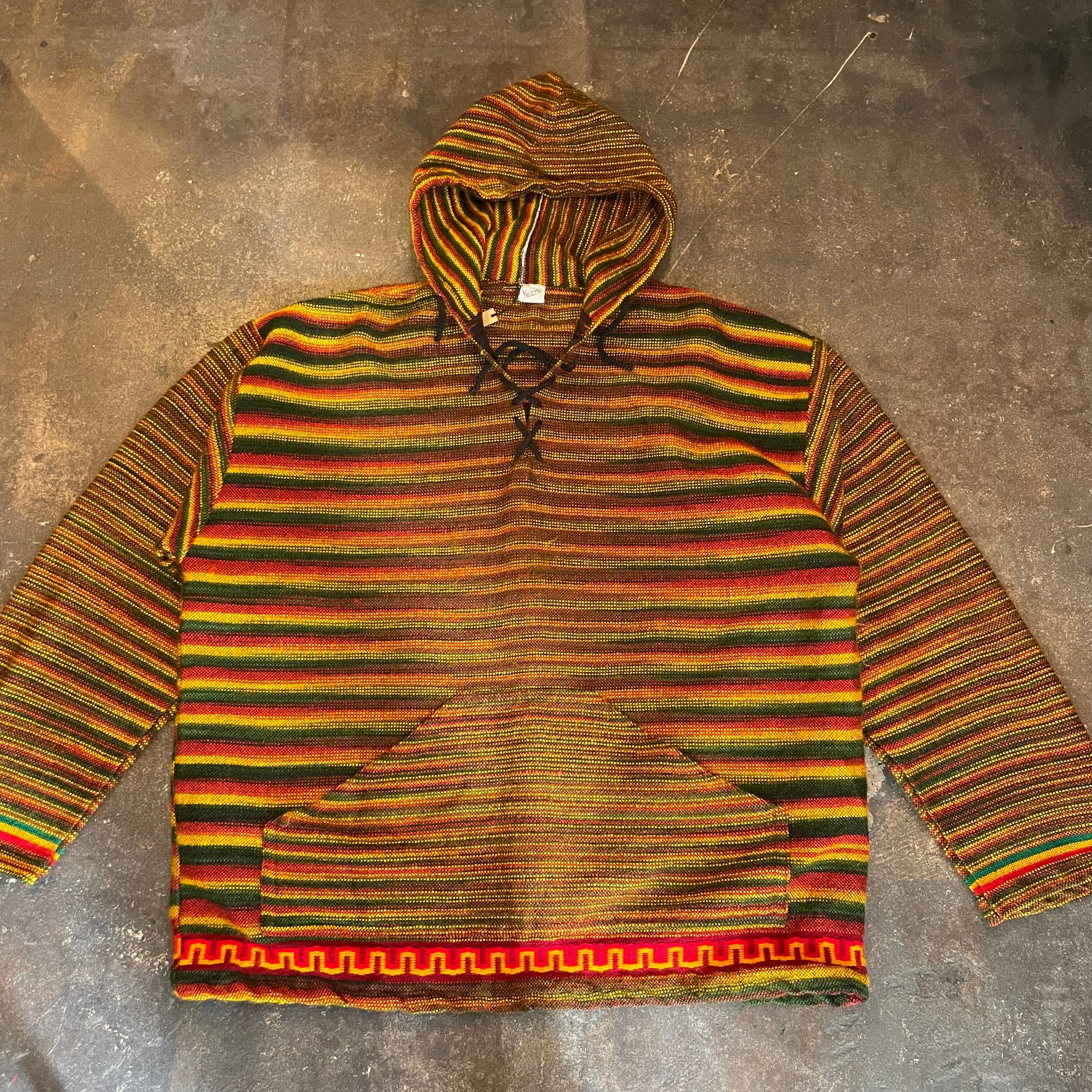 メキシカンパーカーのような雰囲気のあるアクリル素材のパーカーです。ラスタカラーですが、こってりラスタ感は無く気軽に着ていただけると思います。