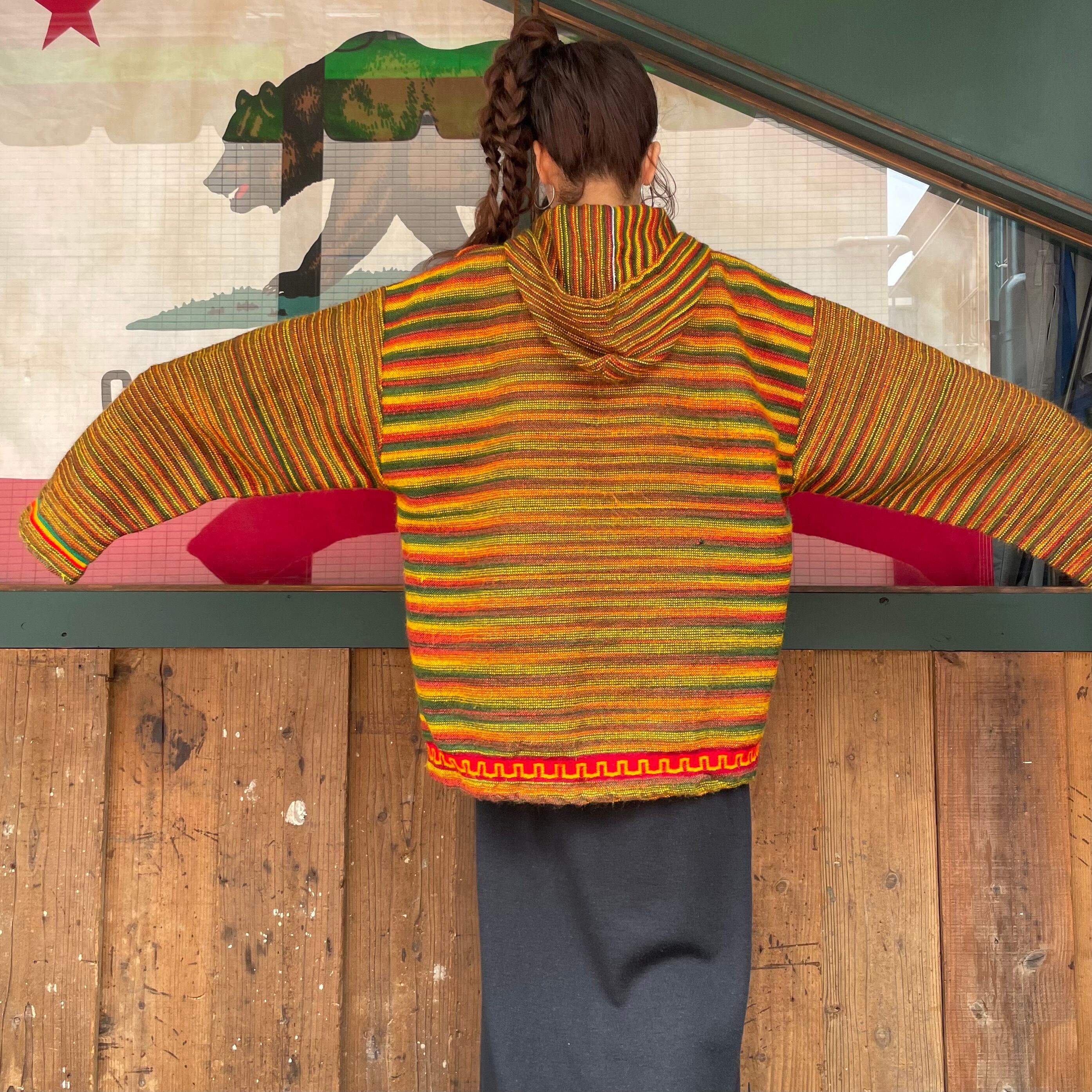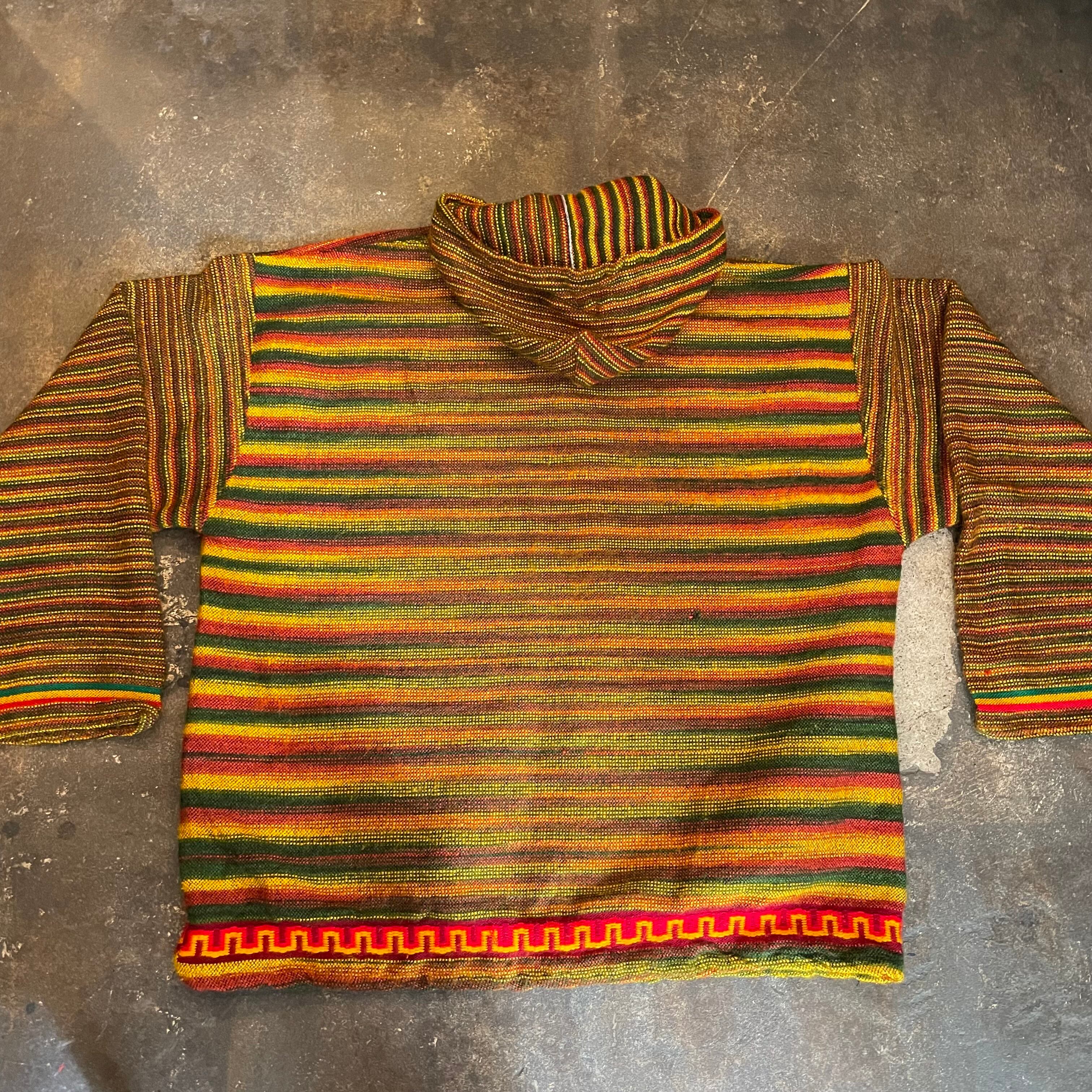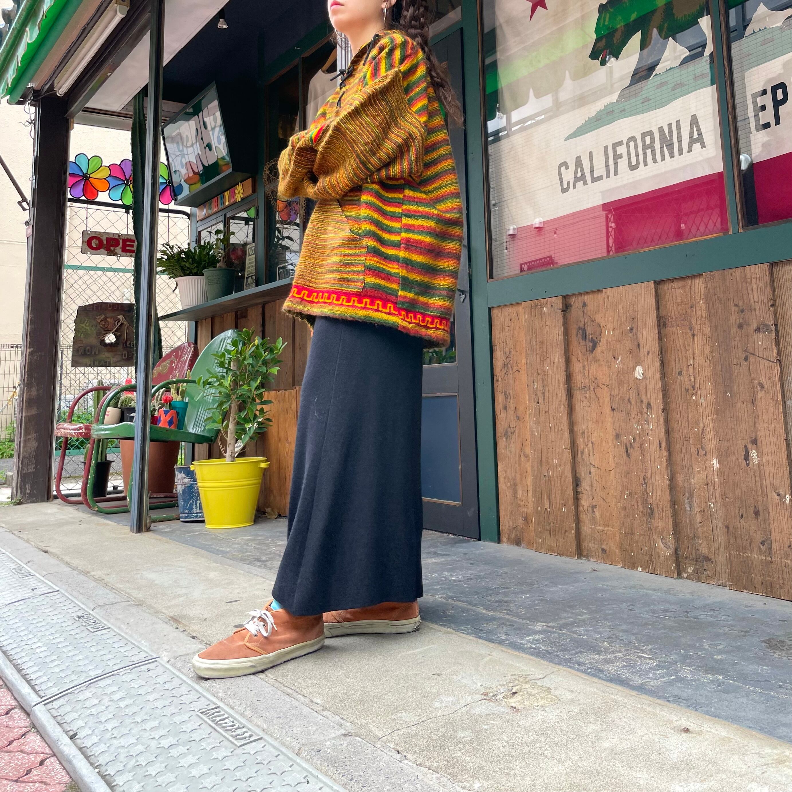 メキシカンパーカーのような雰囲気のあるアクリル素材のパーカーです。ラスタカラーですが、こってりラスタ感は無く気軽に着ていただけると思います。