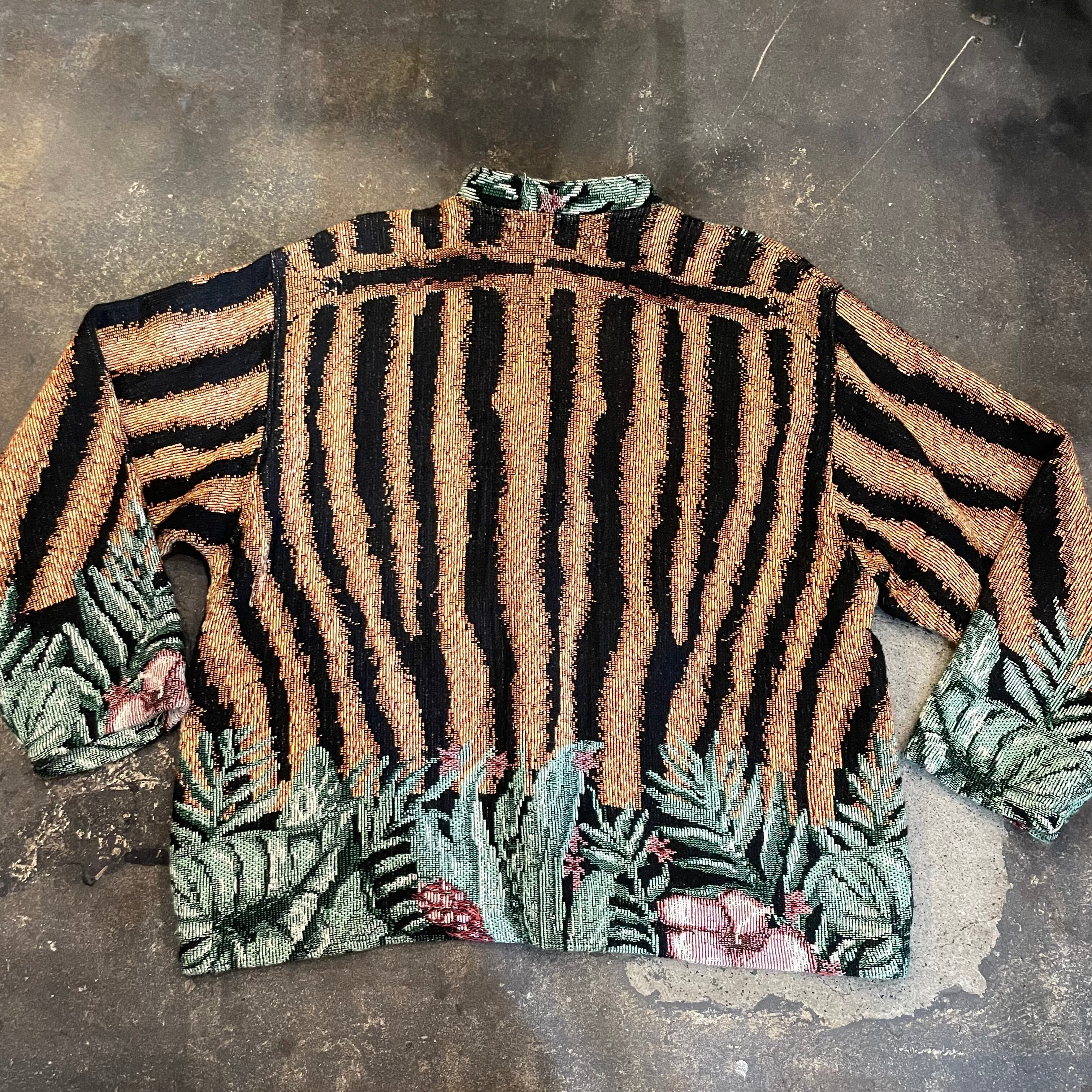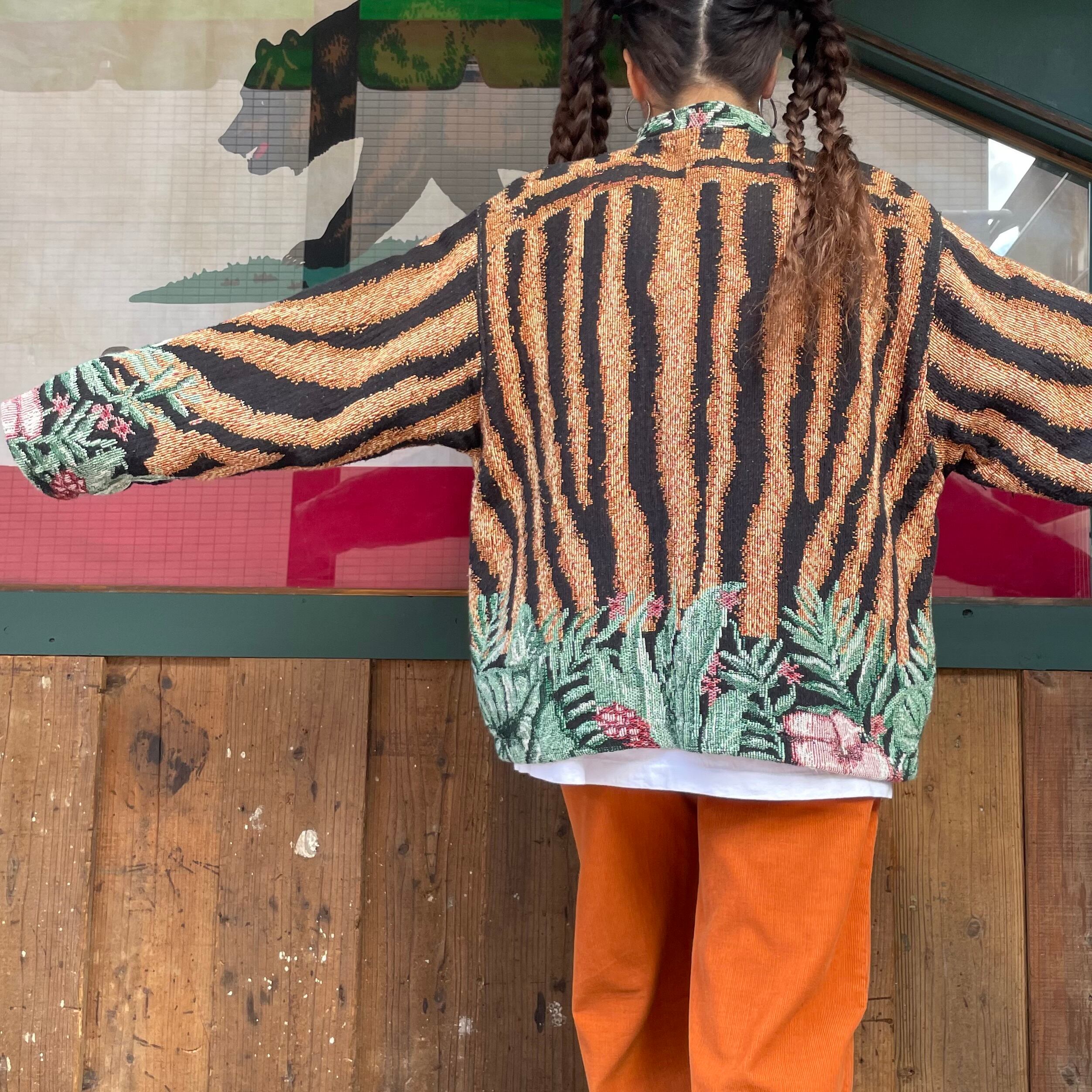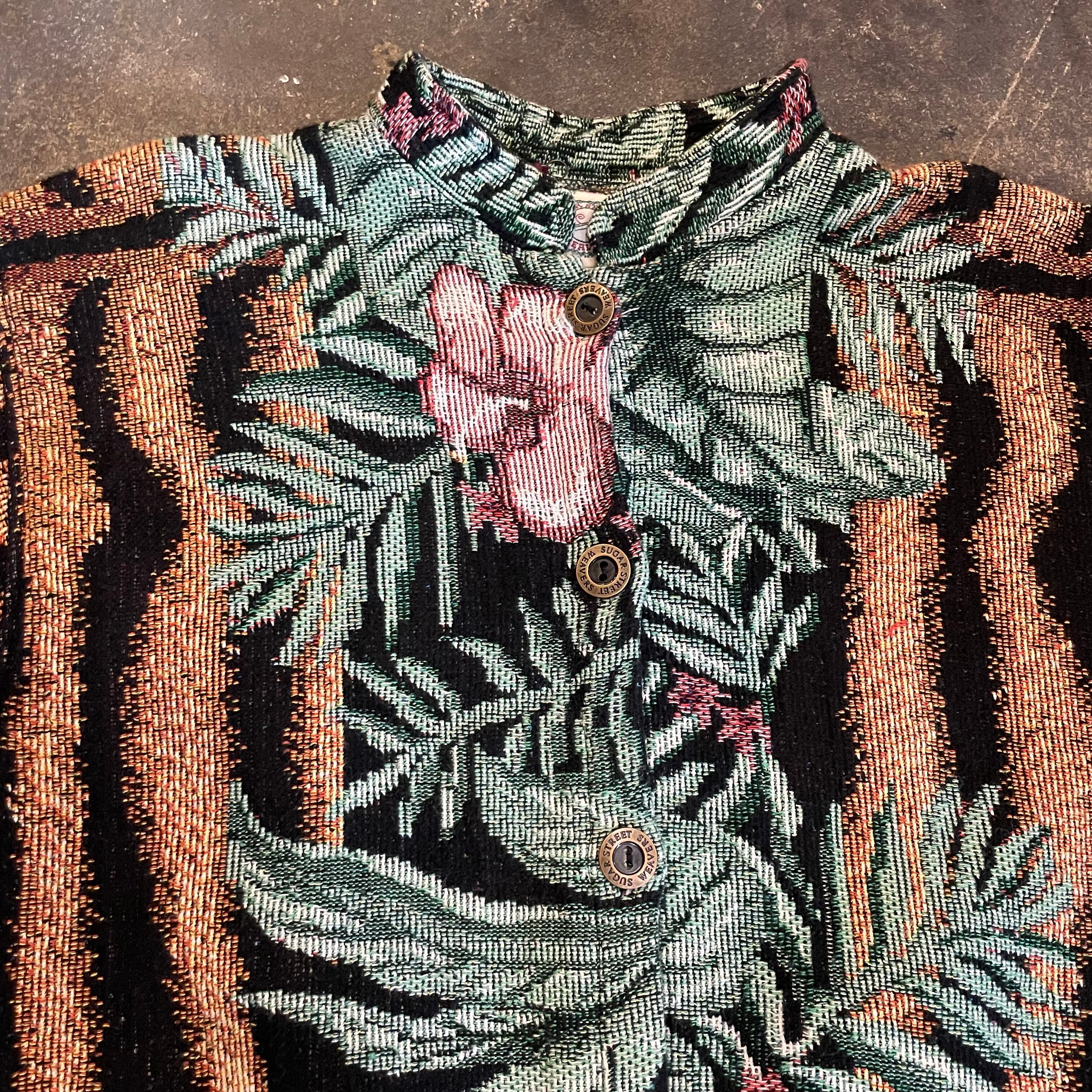 ハイビスカスや南国っぽい雰囲気の柄がかわいいゴブラン織のジャケットです。