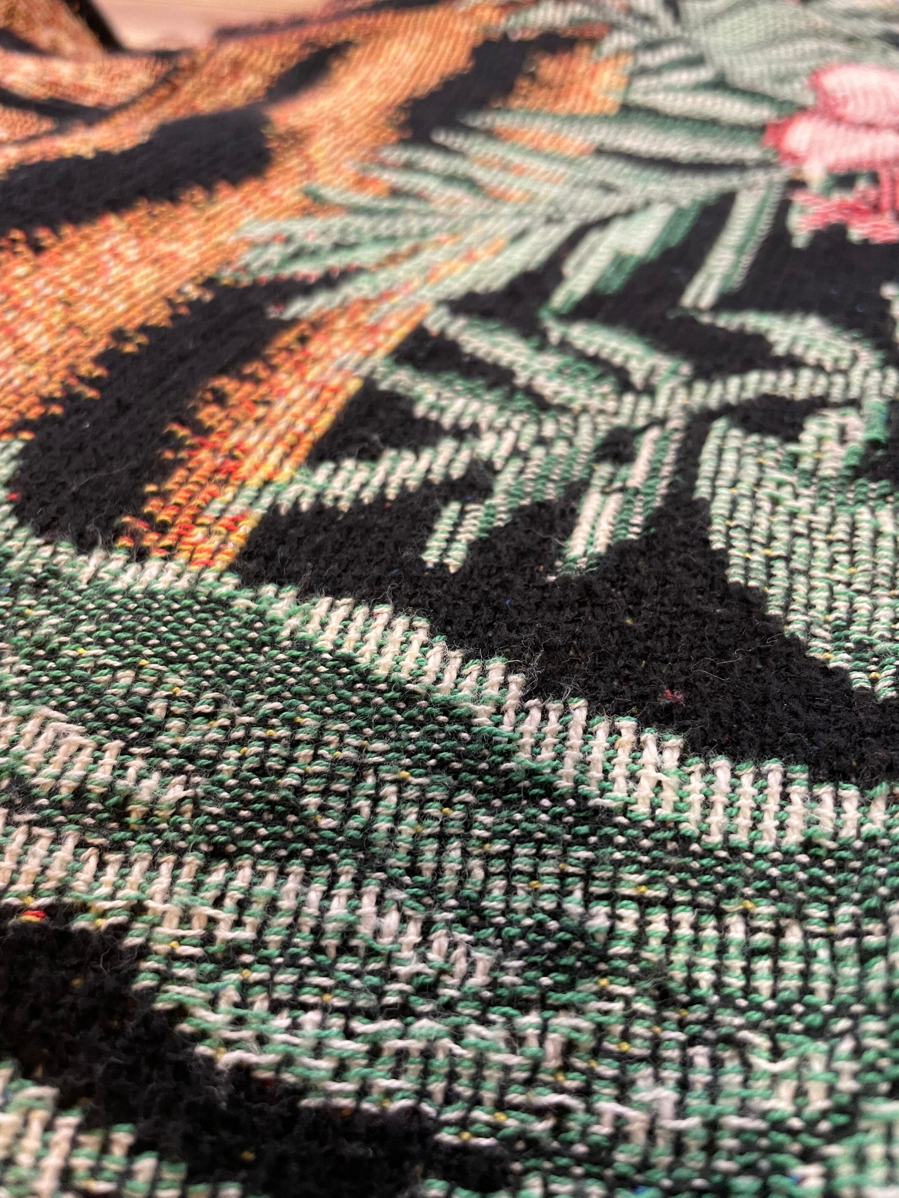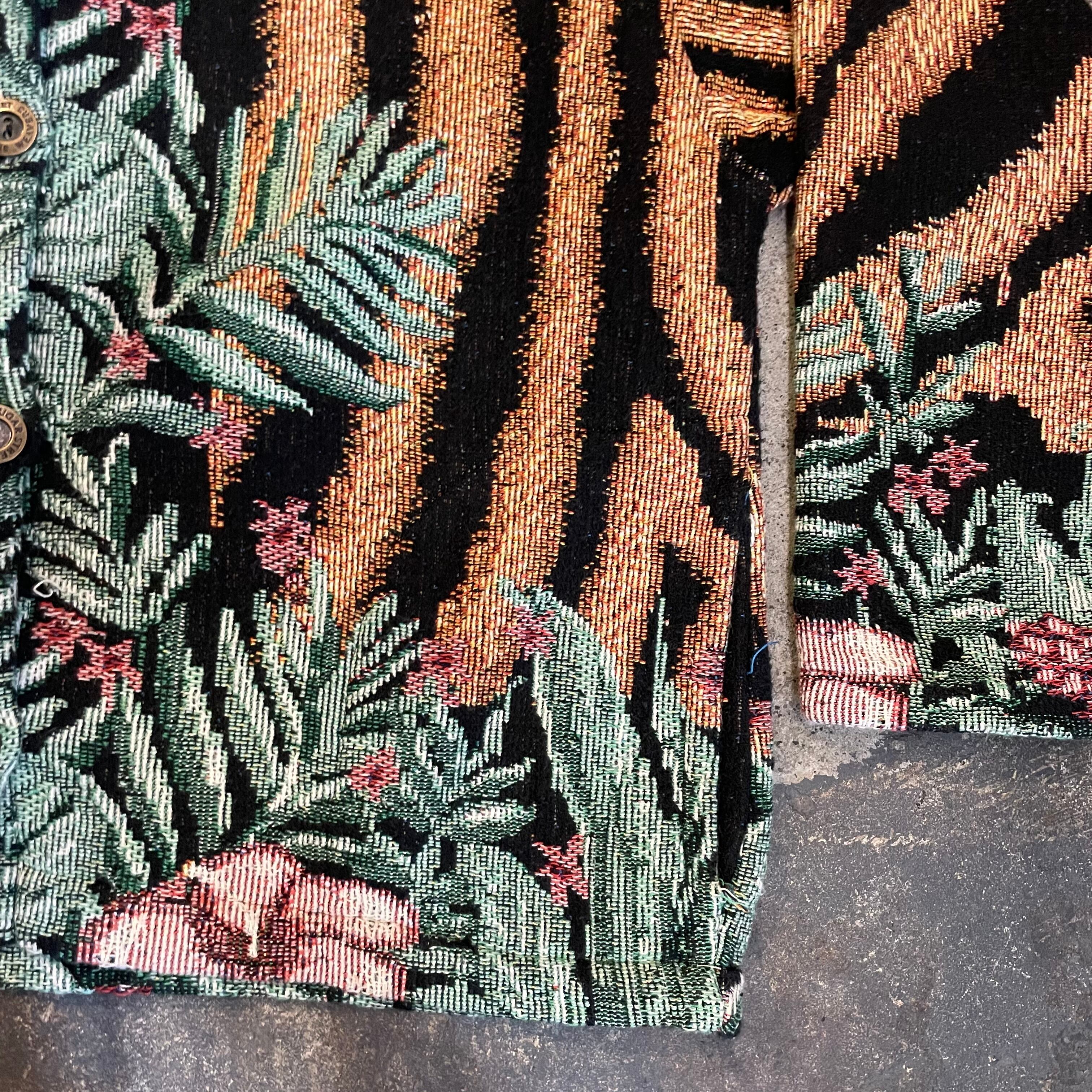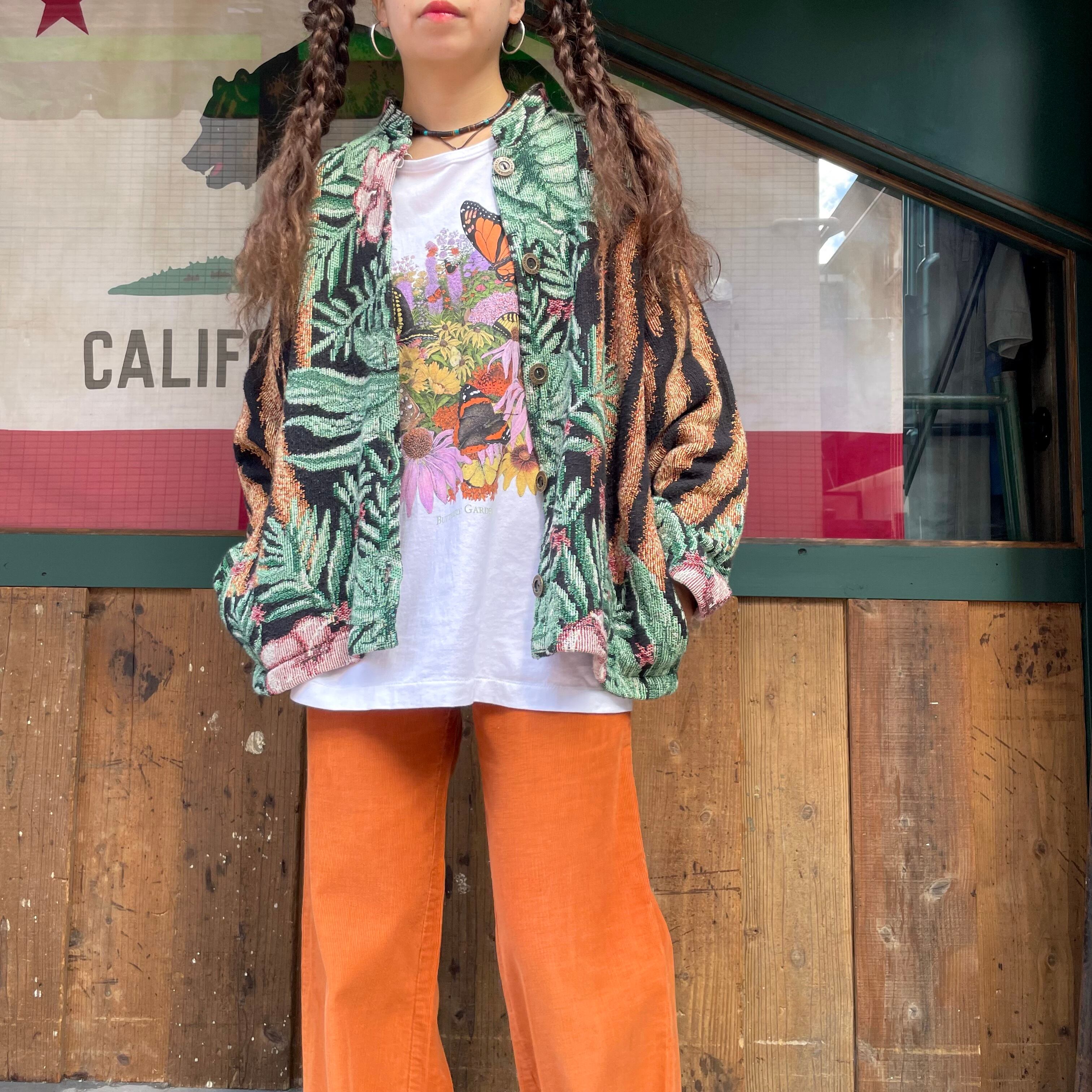 ハイビスカスや南国っぽい雰囲気の柄がかわいいゴブラン織のジャケットです。