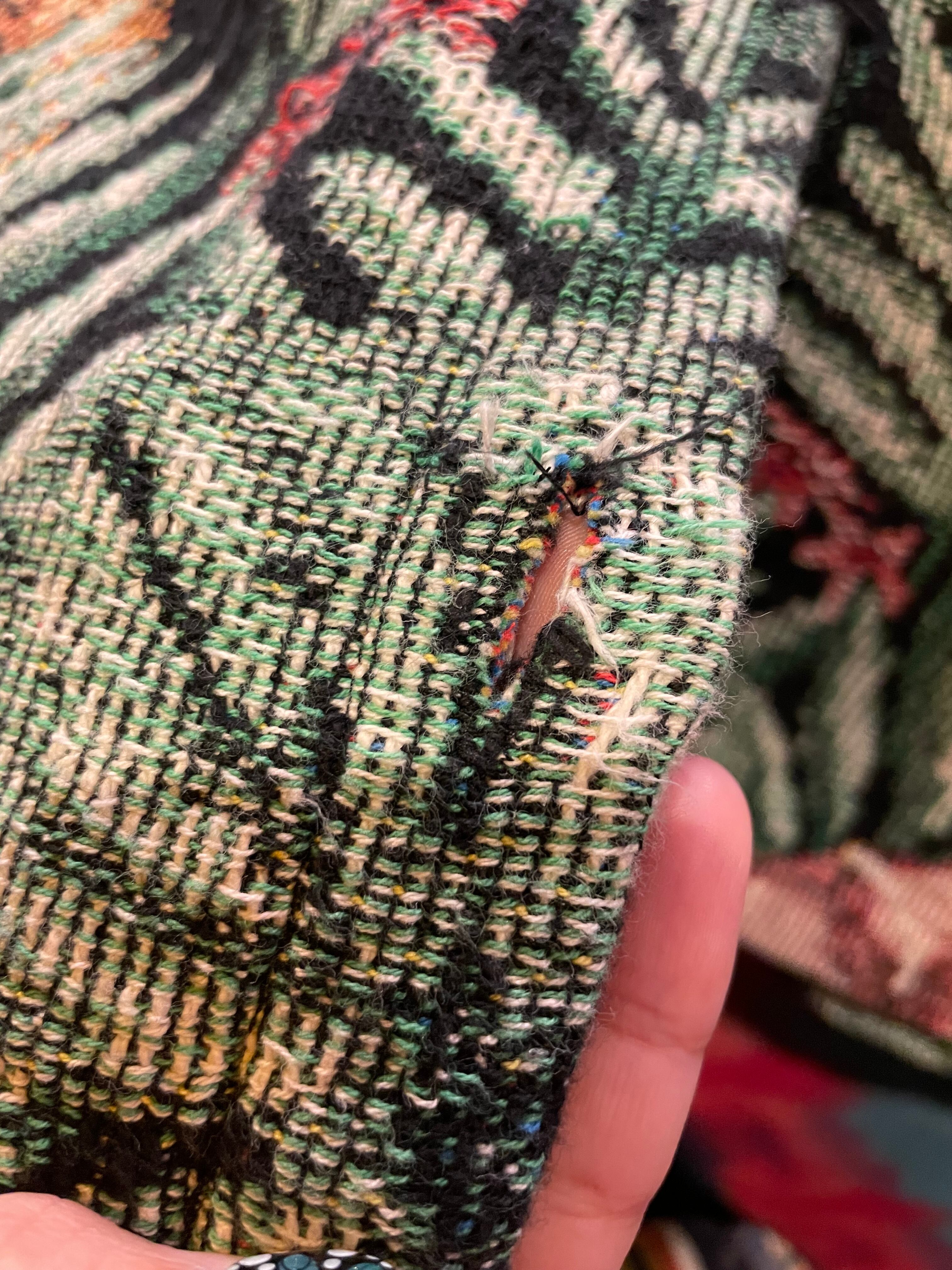 全体的な毛羽立ちやボタンホール付近のダメージ等使用感のある商品です。