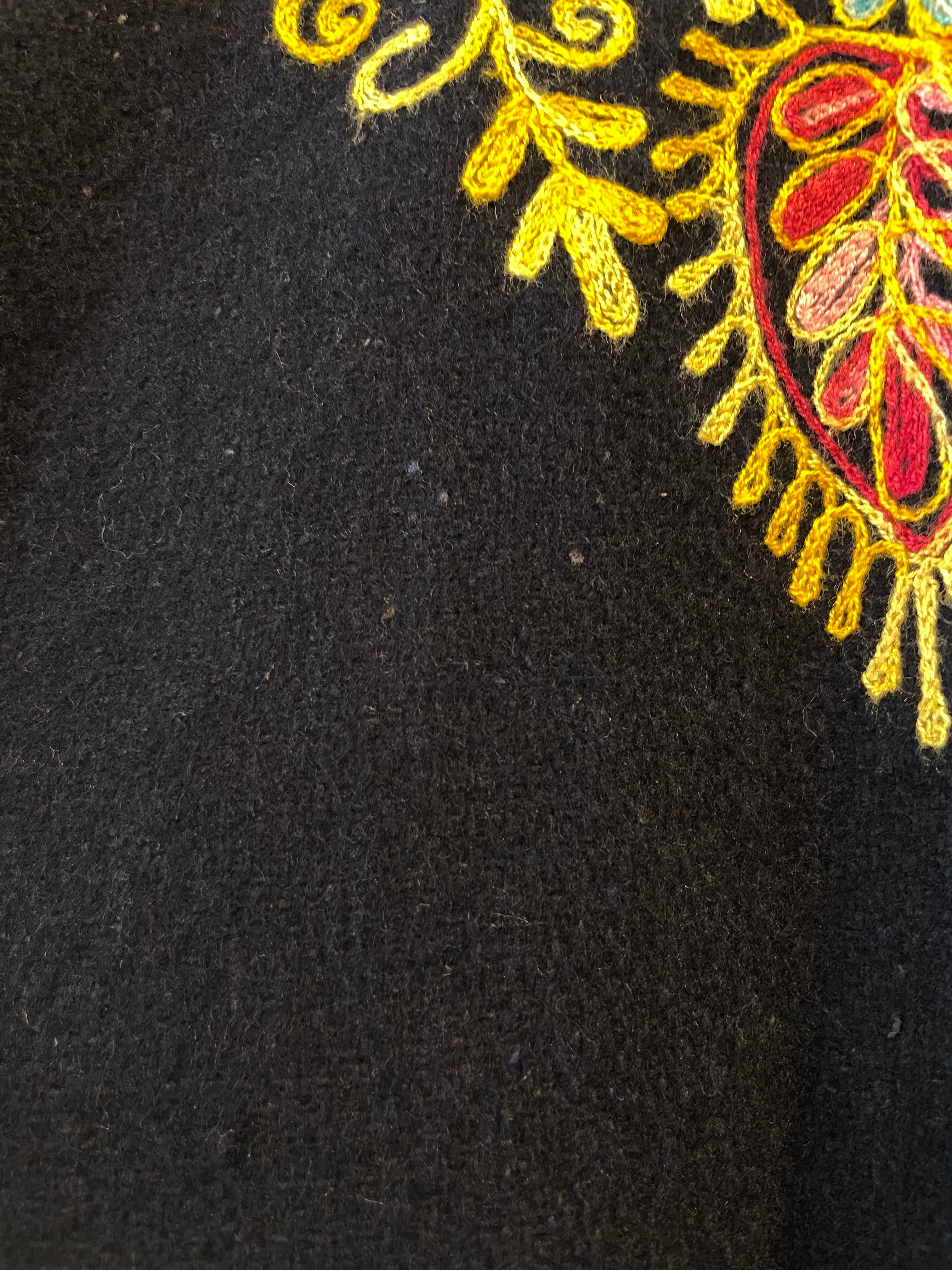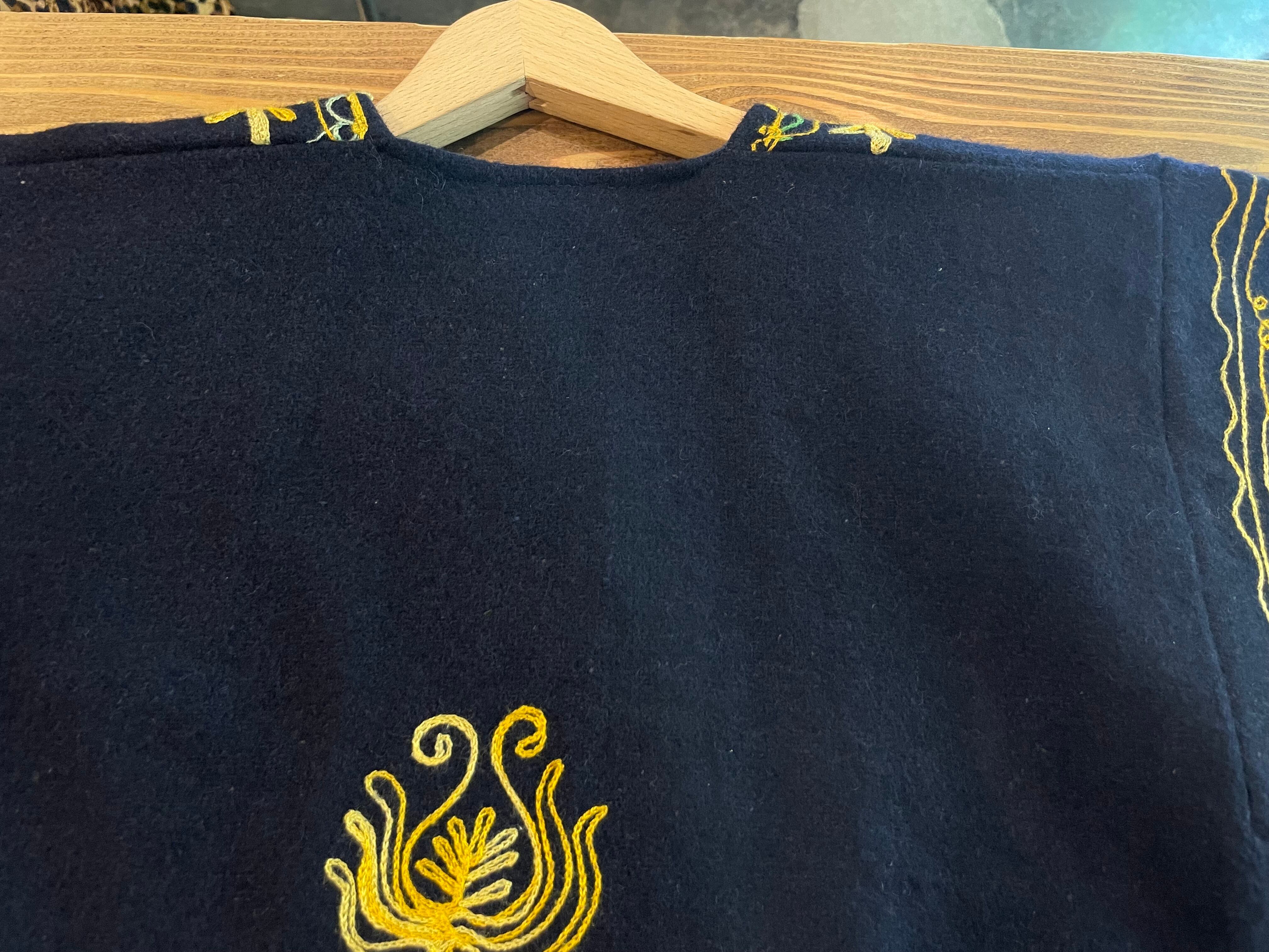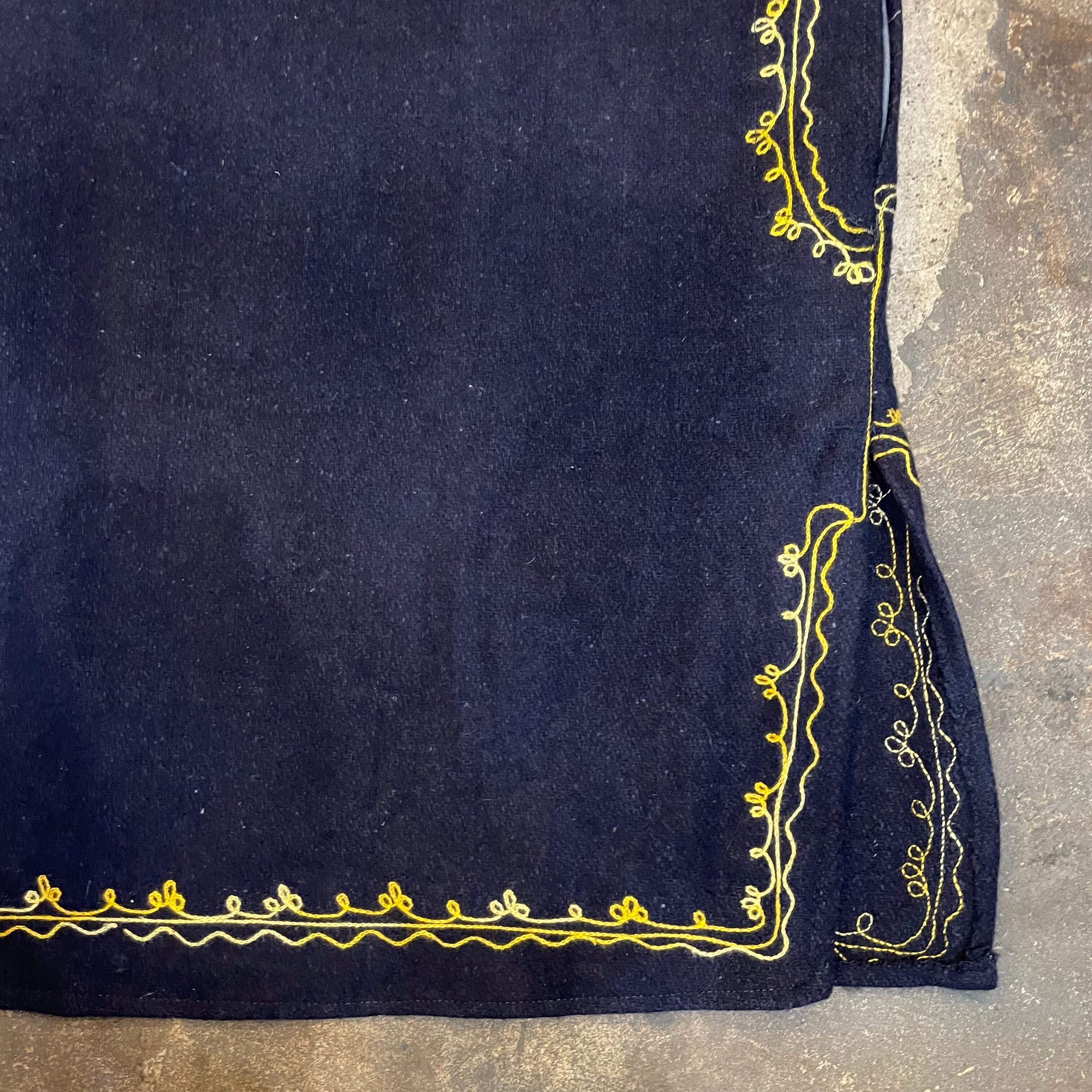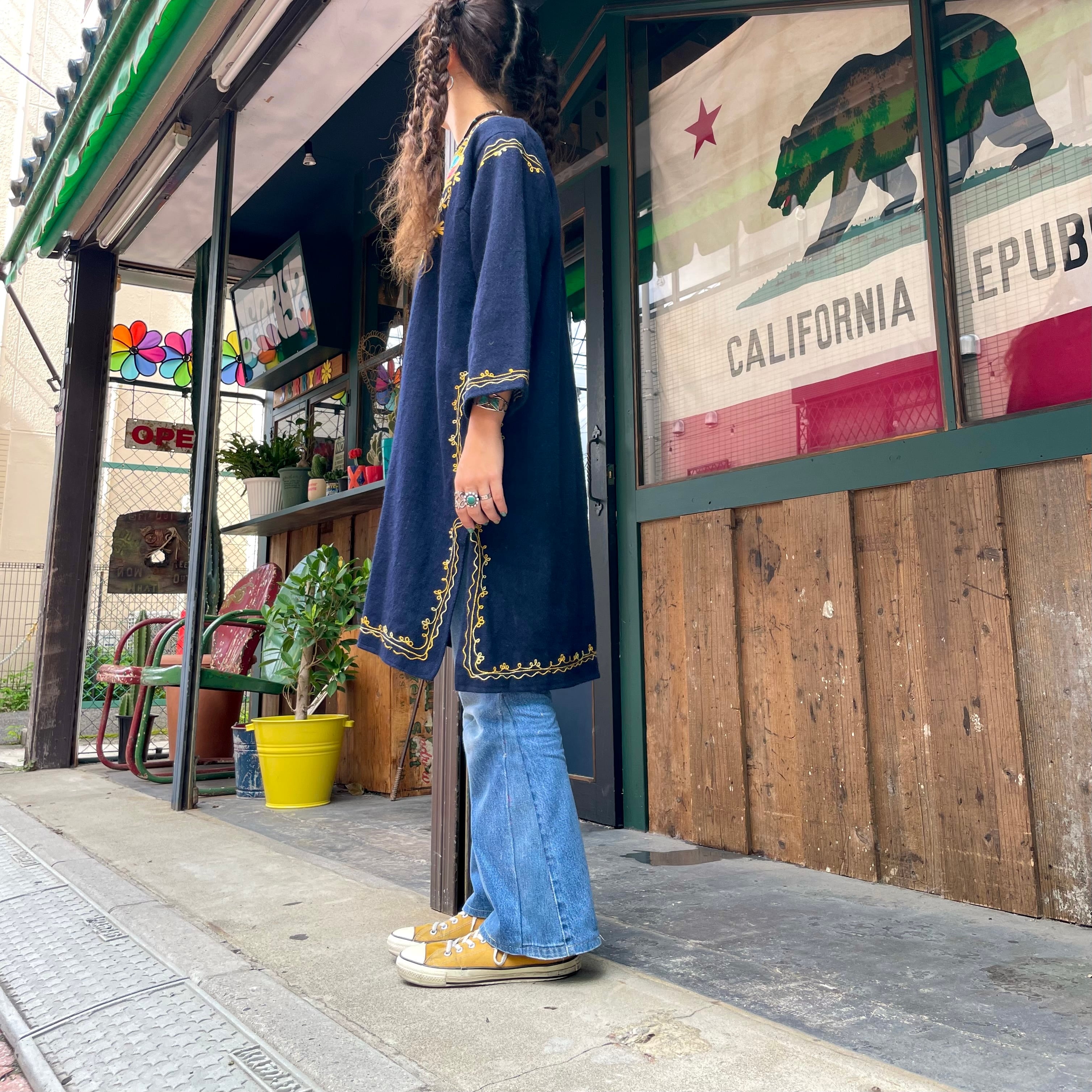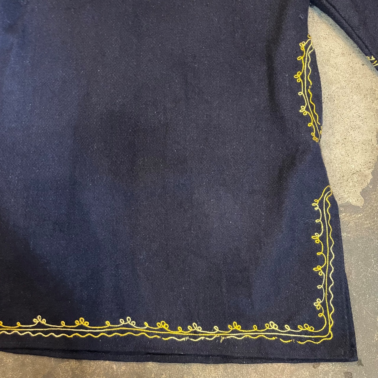 おそらくウール素材でしっかり厚みがあります。両サイドにポケットもあり、サイドのスリットやその周りの刺繍、背中にも刺繍があり細部まで素敵な一枚です。