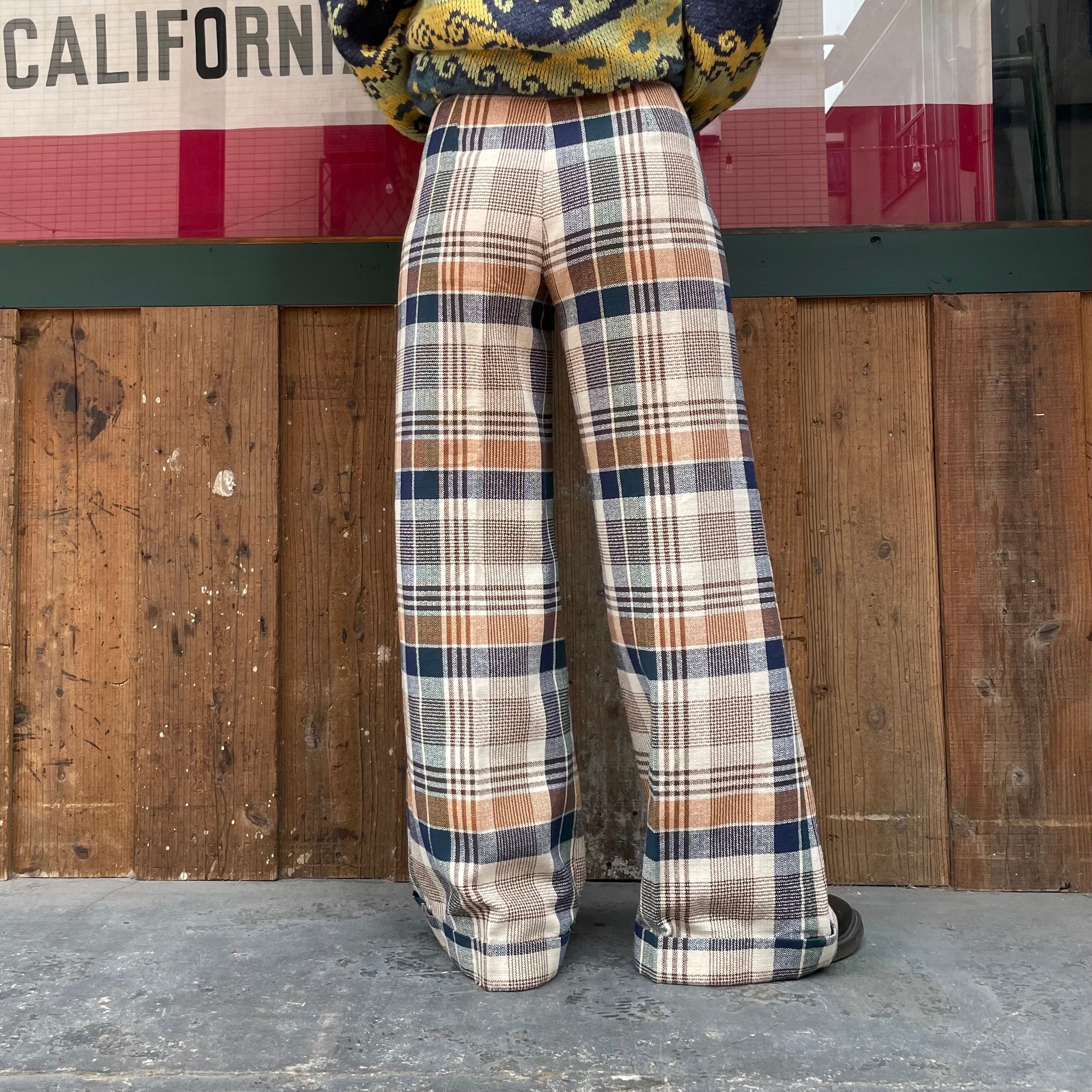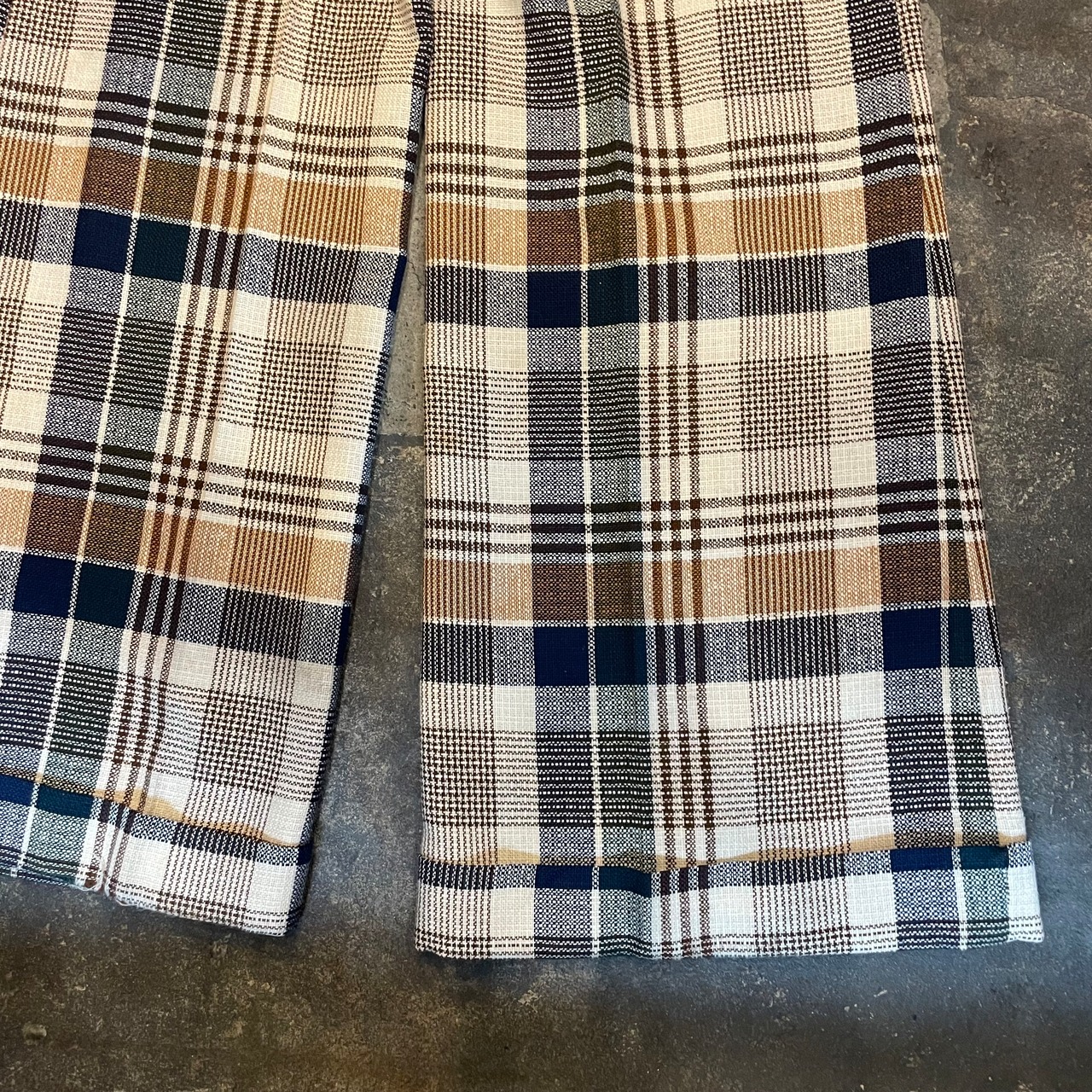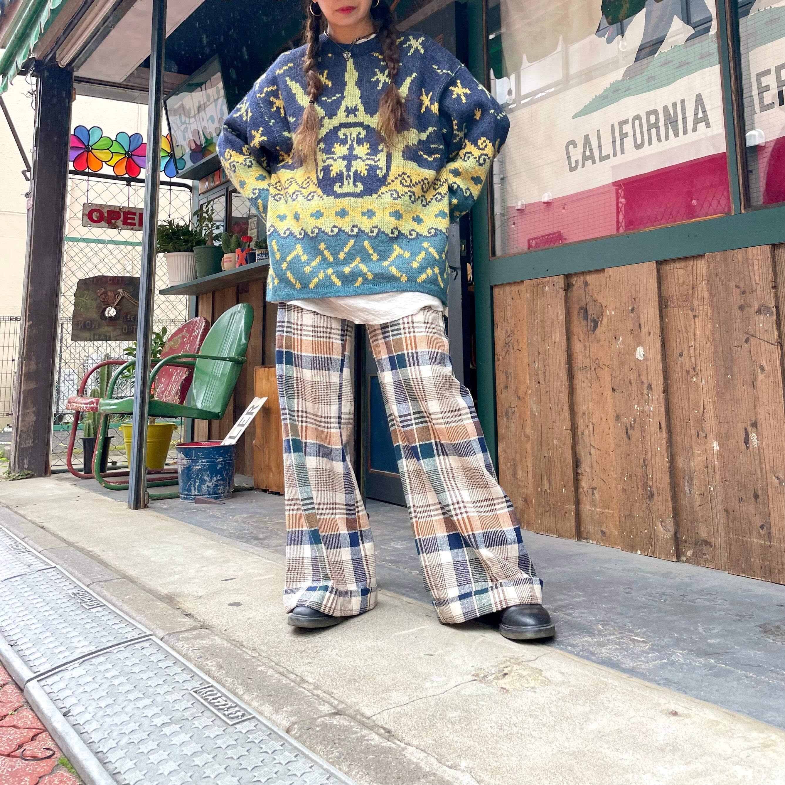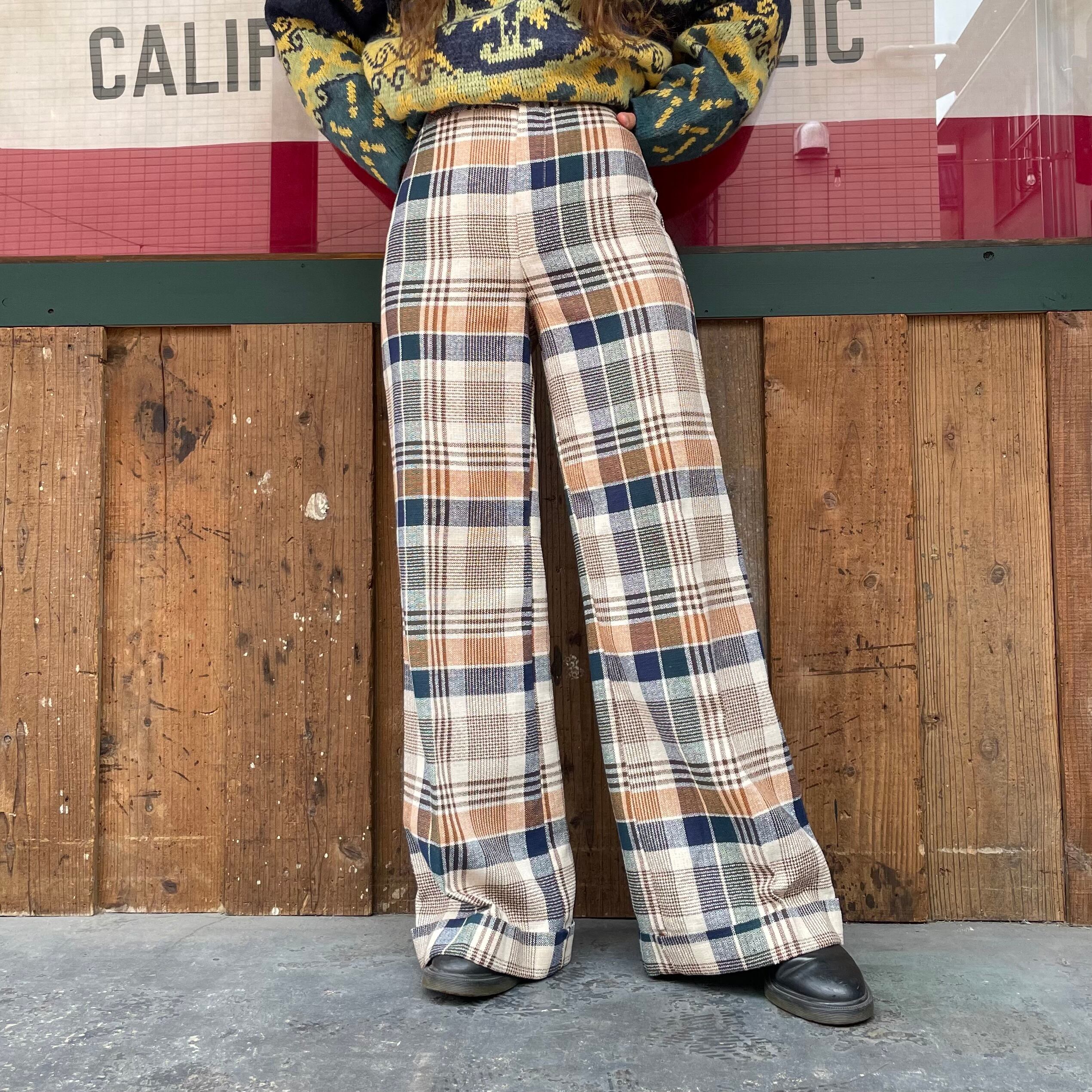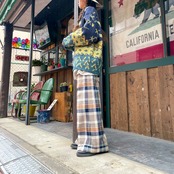 シルエットがとてもかっこいいバギーパンツです。落ち着いた色味のチェック柄で主張しすぎず、合わせやすい一枚です。